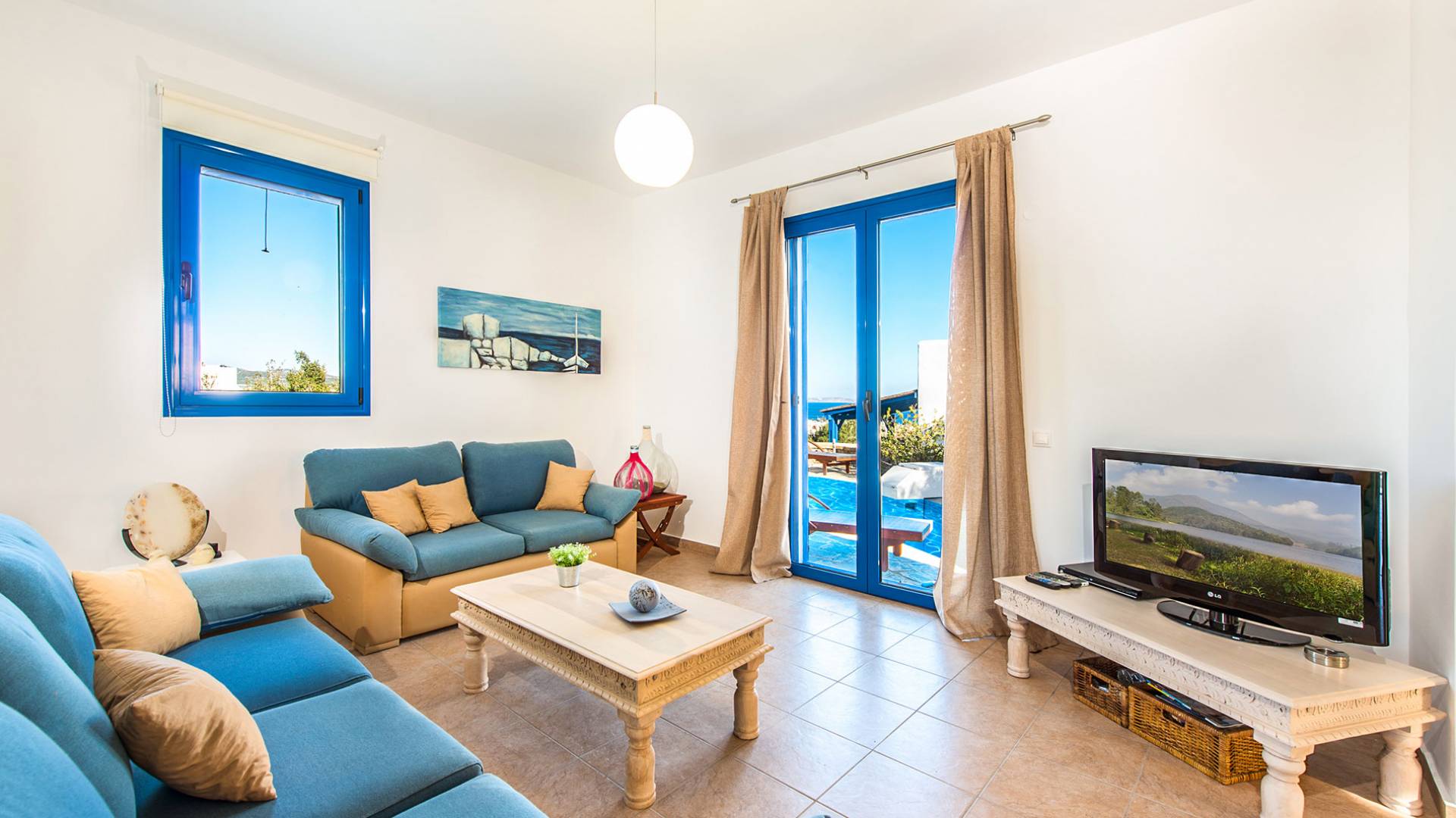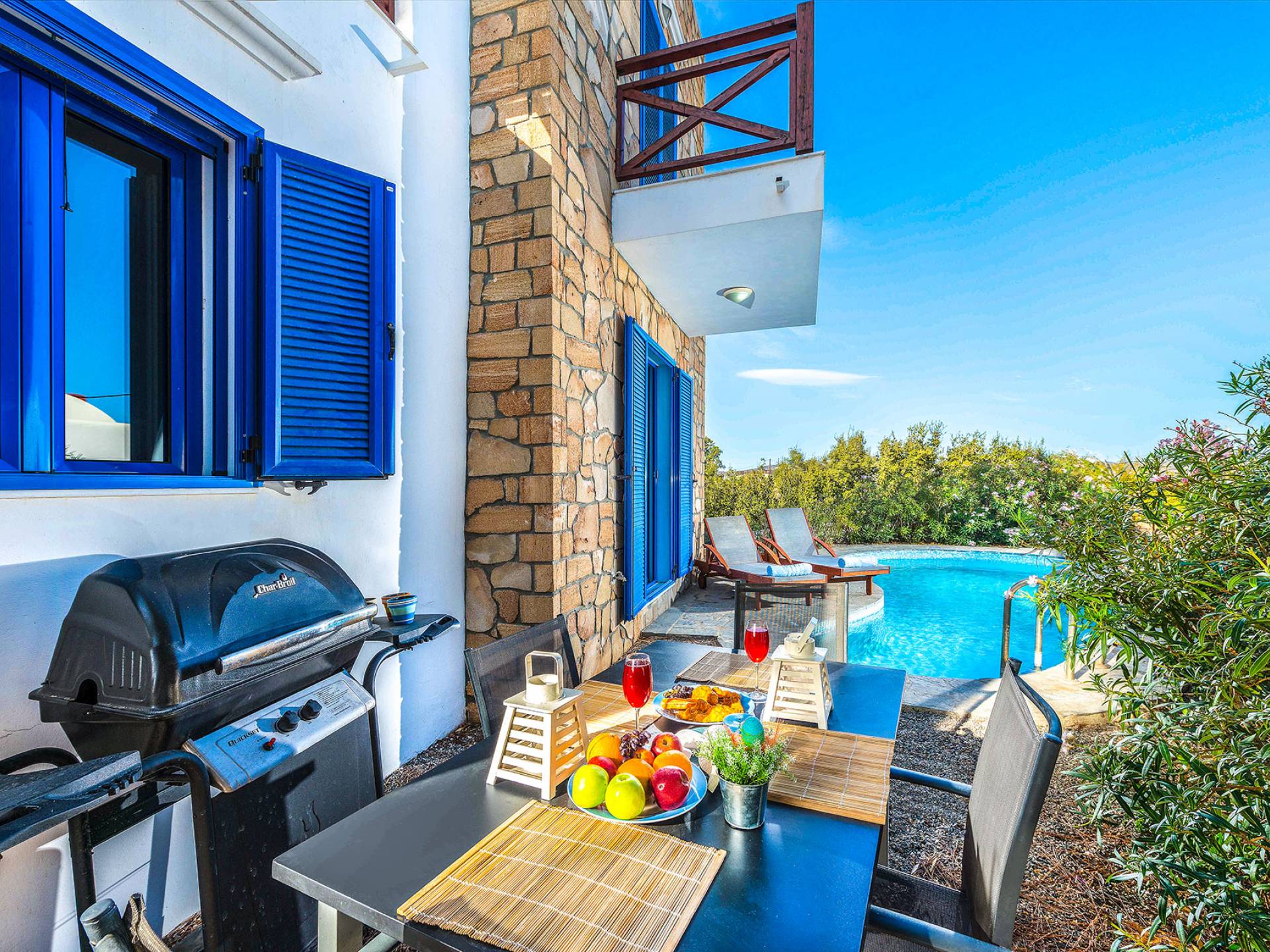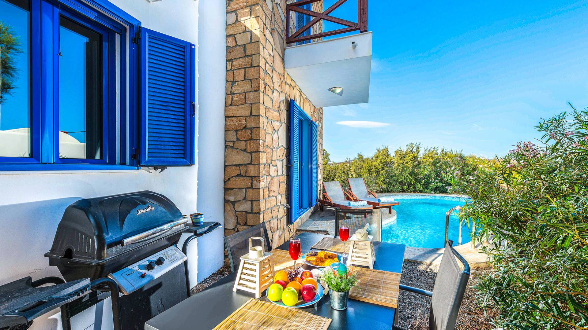 Гостиная выходит на веранду, где гости могут найти бассейн с шезлонгами и зонтиками, а также на меблированную террасу, которая идеально подходит для вечернего барбекю под звездным летним небом Родоса.