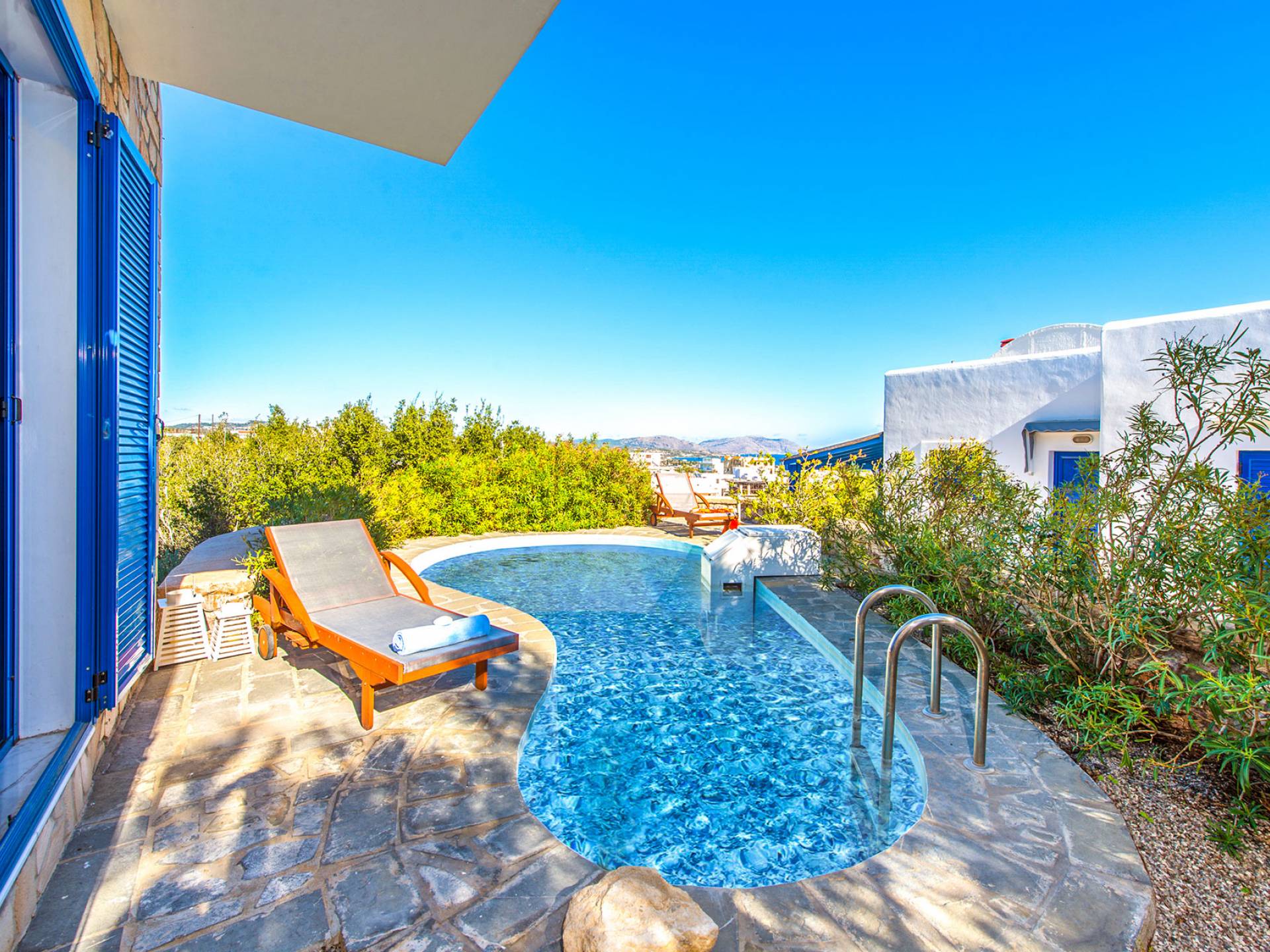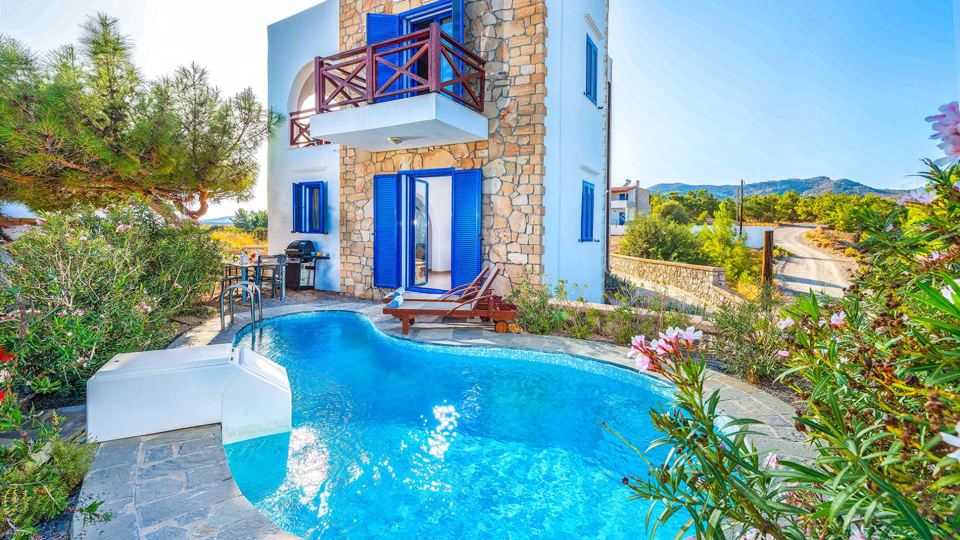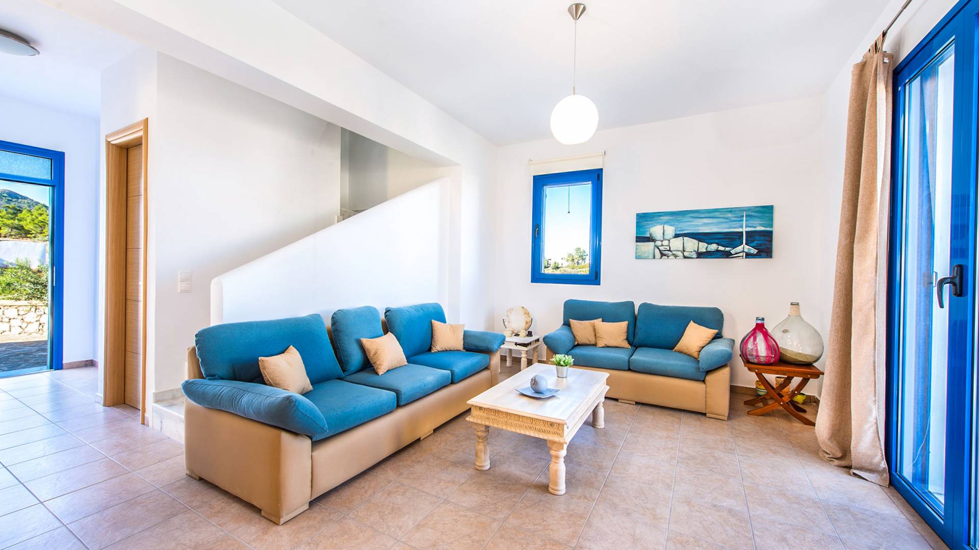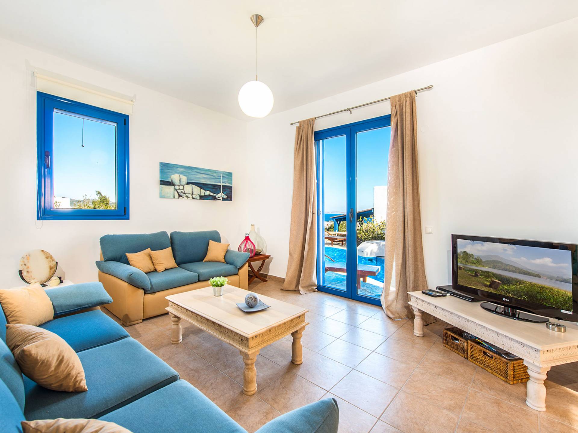 Гостиная выходит на веранду, где гости могут найти бассейн с шезлонгами и зонтиками, а также на меблированную террасу, которая идеально подходит для вечернего барбекю под звездным летним небом Родоса.