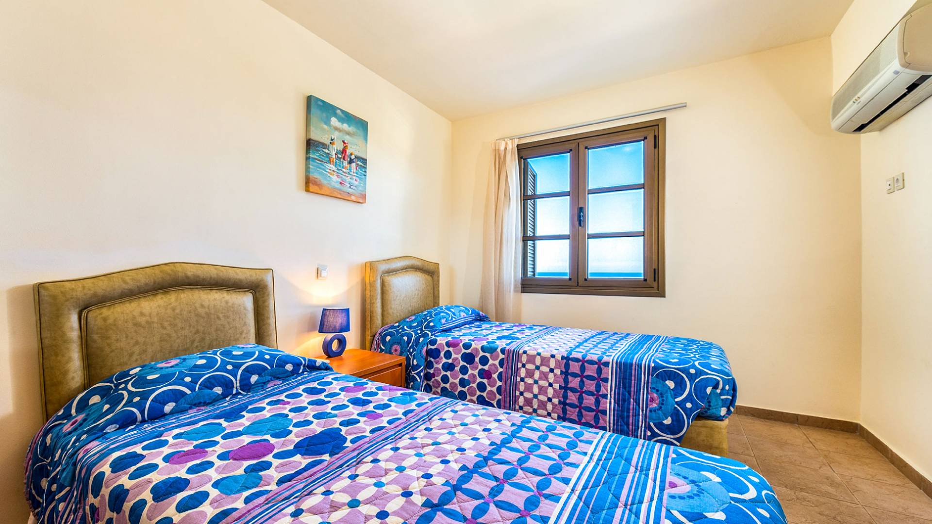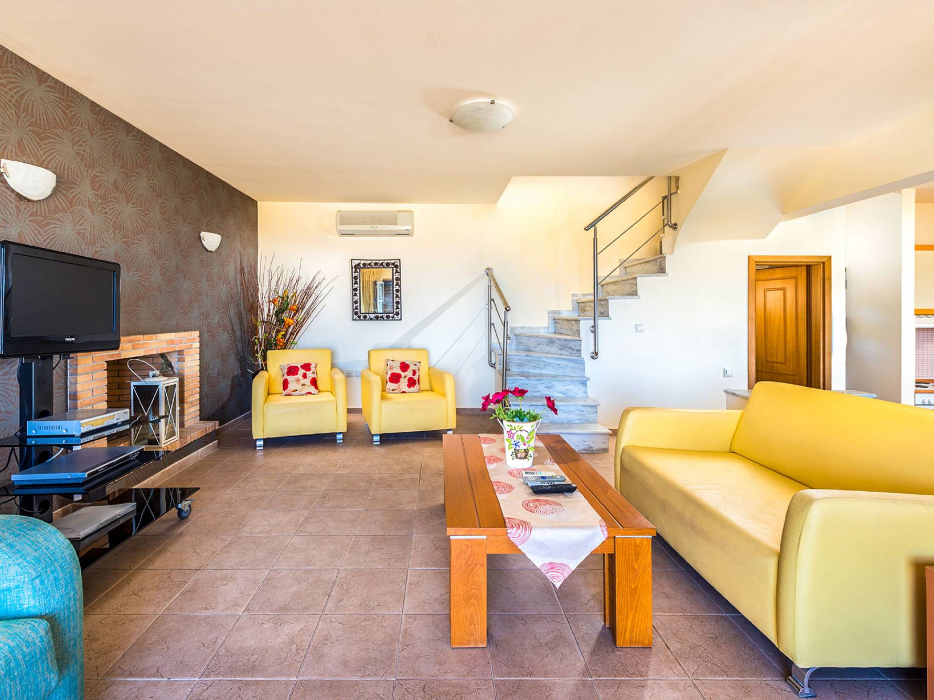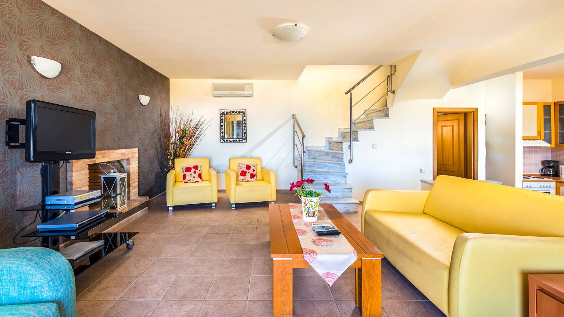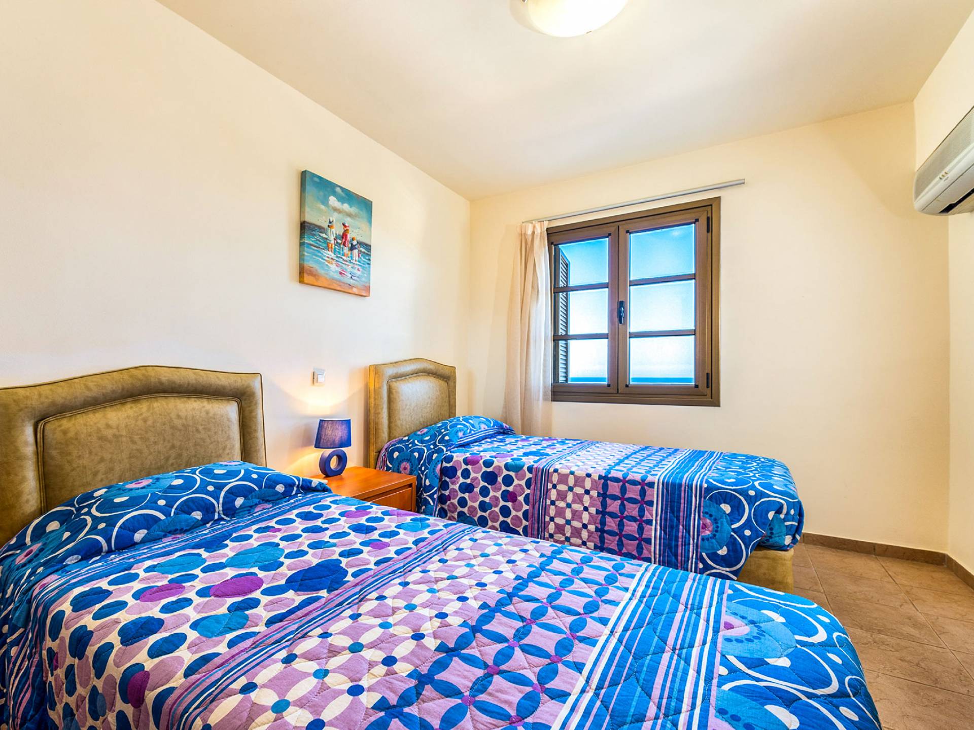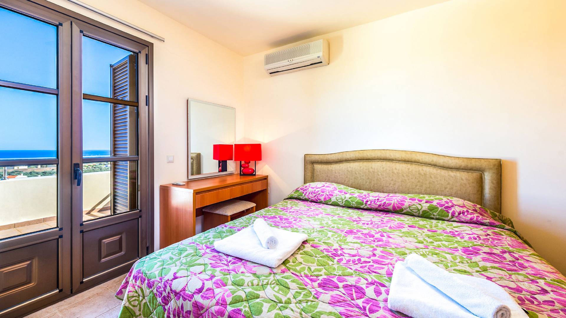 Aegean Blue Villa Rhodes имеет два этажа с двумя спальнями, одна с двуспальной кроватью и балконом, а другая с двумя односпальными кроватями. Существует одна ванная комната на первом этаже и туалет на первом этаже. На первом этаже также находится со вкусом оформленная уютная гостиная, отделанная итальянской кожей, с камином, телевизором с плоским экраном со спутниковыми каналами и DVD-плеером. Также имеется полностью оборудованная кухня.