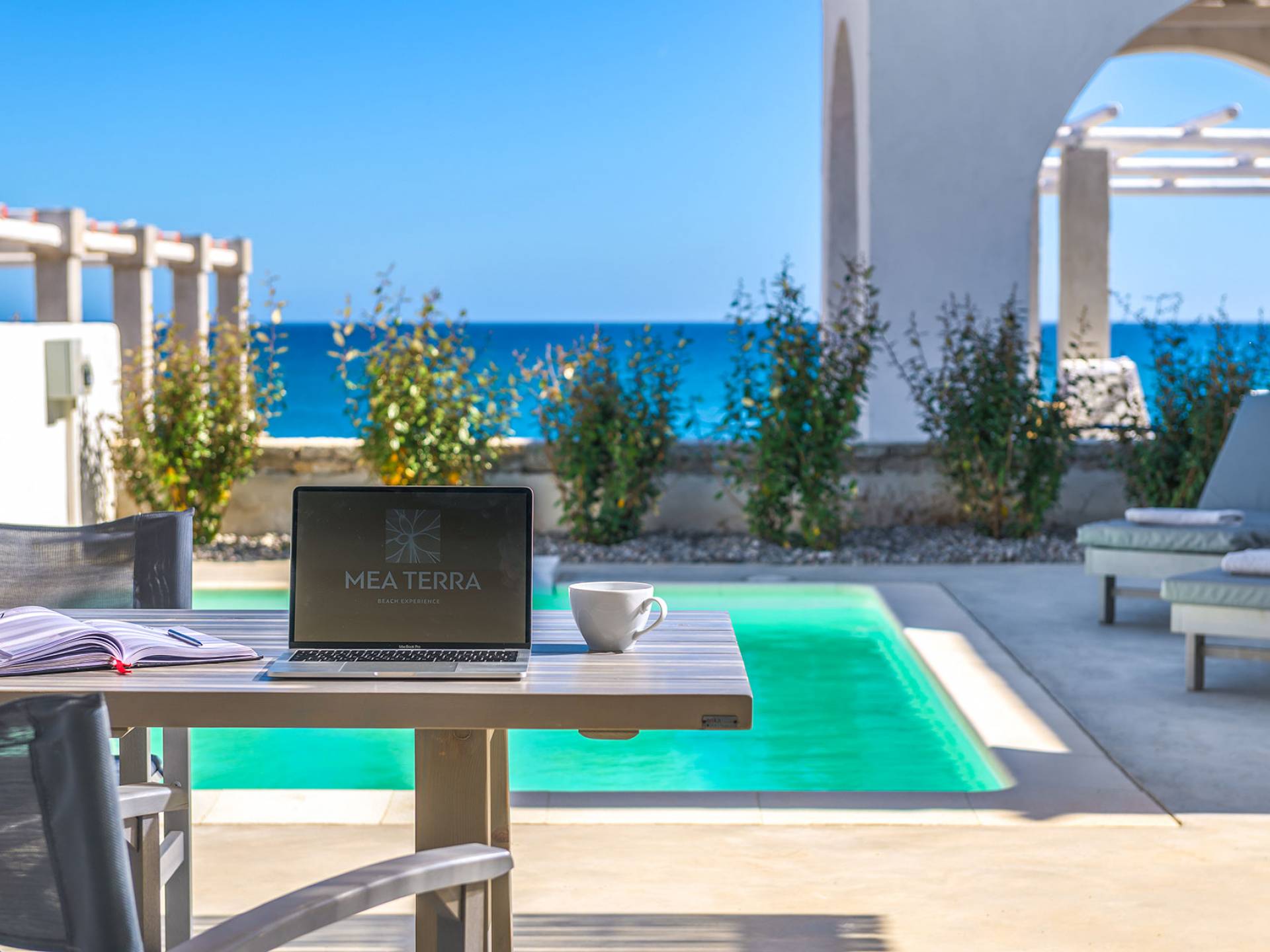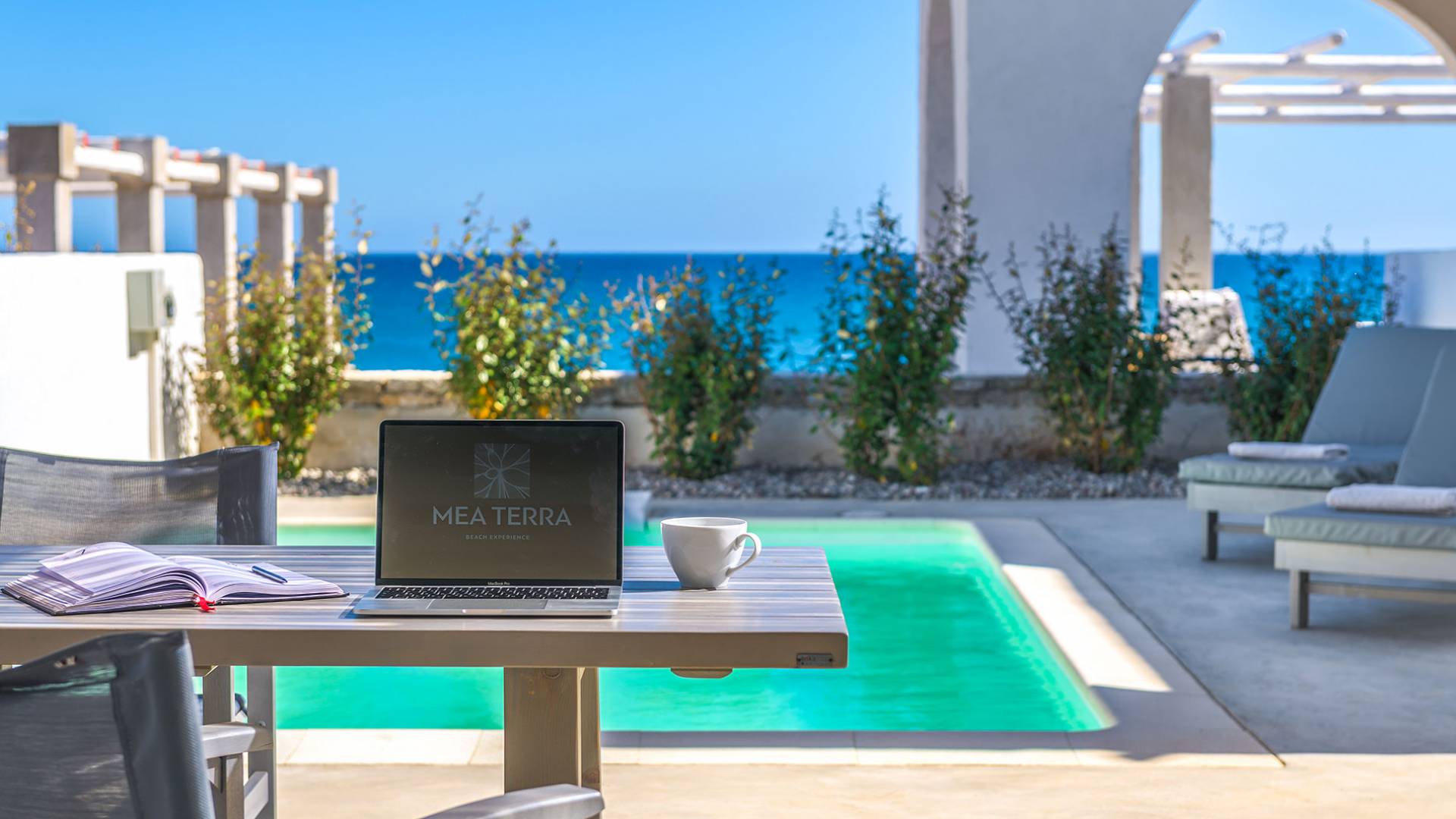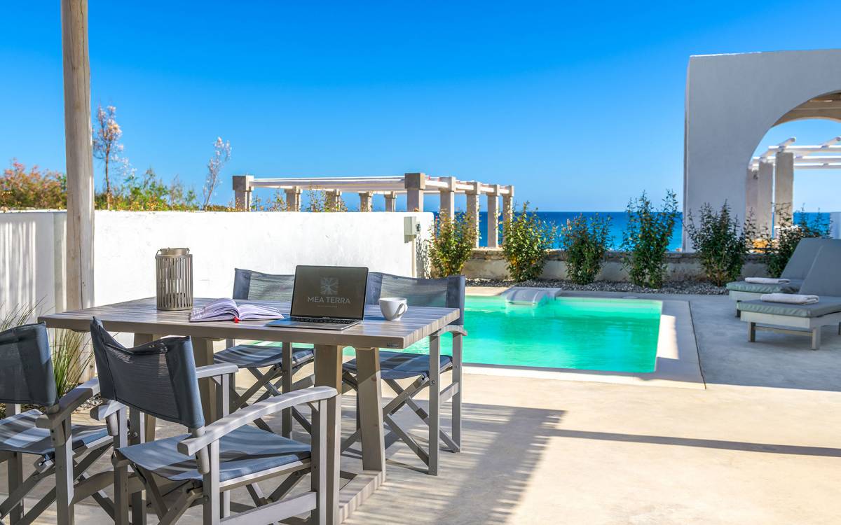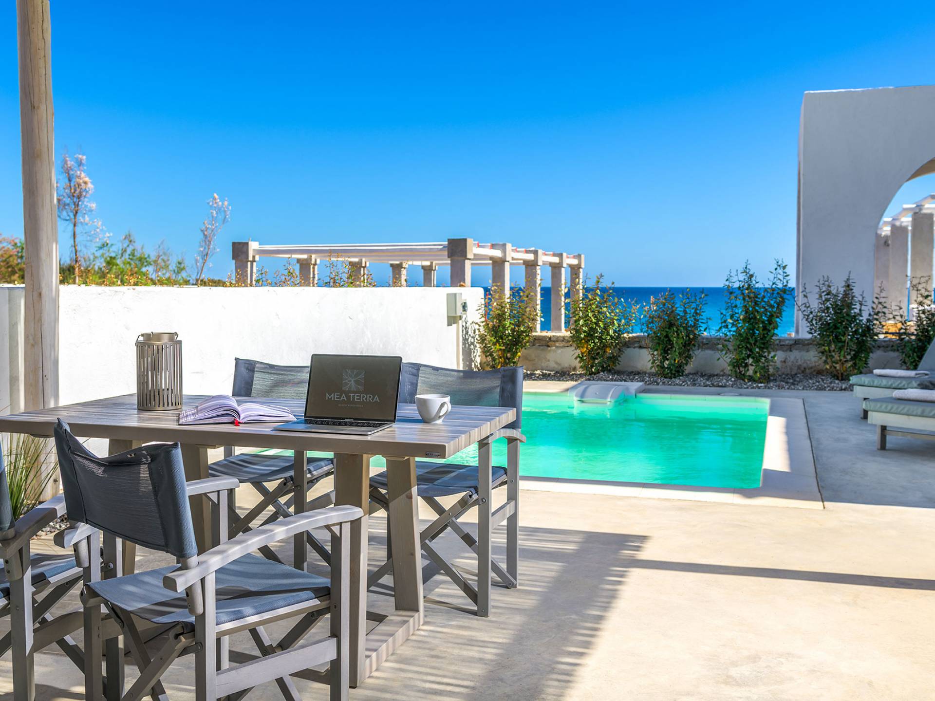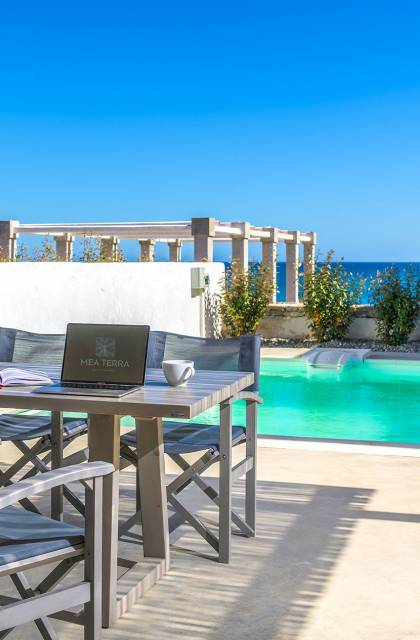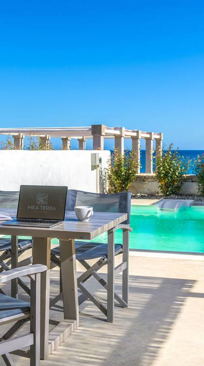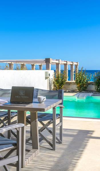 Виллы Mea Terra — это роскошный комплекс вилл, состоящий из двух вилл, Виллы Эсфир и Виллы Терос. Вилла Esthir и вилла Theros с видом на Эгейское море предлагают одинаковый вкус элегантности и стиля, в то время как каждый дом поддерживает индивидуальную атмосферу в зависимости от различных элементов декора. Во всех спальнях есть предметы роскоши, такие как тонкое постельное белье, полотенца и натуральные туалетно-косметические принадлежности.
