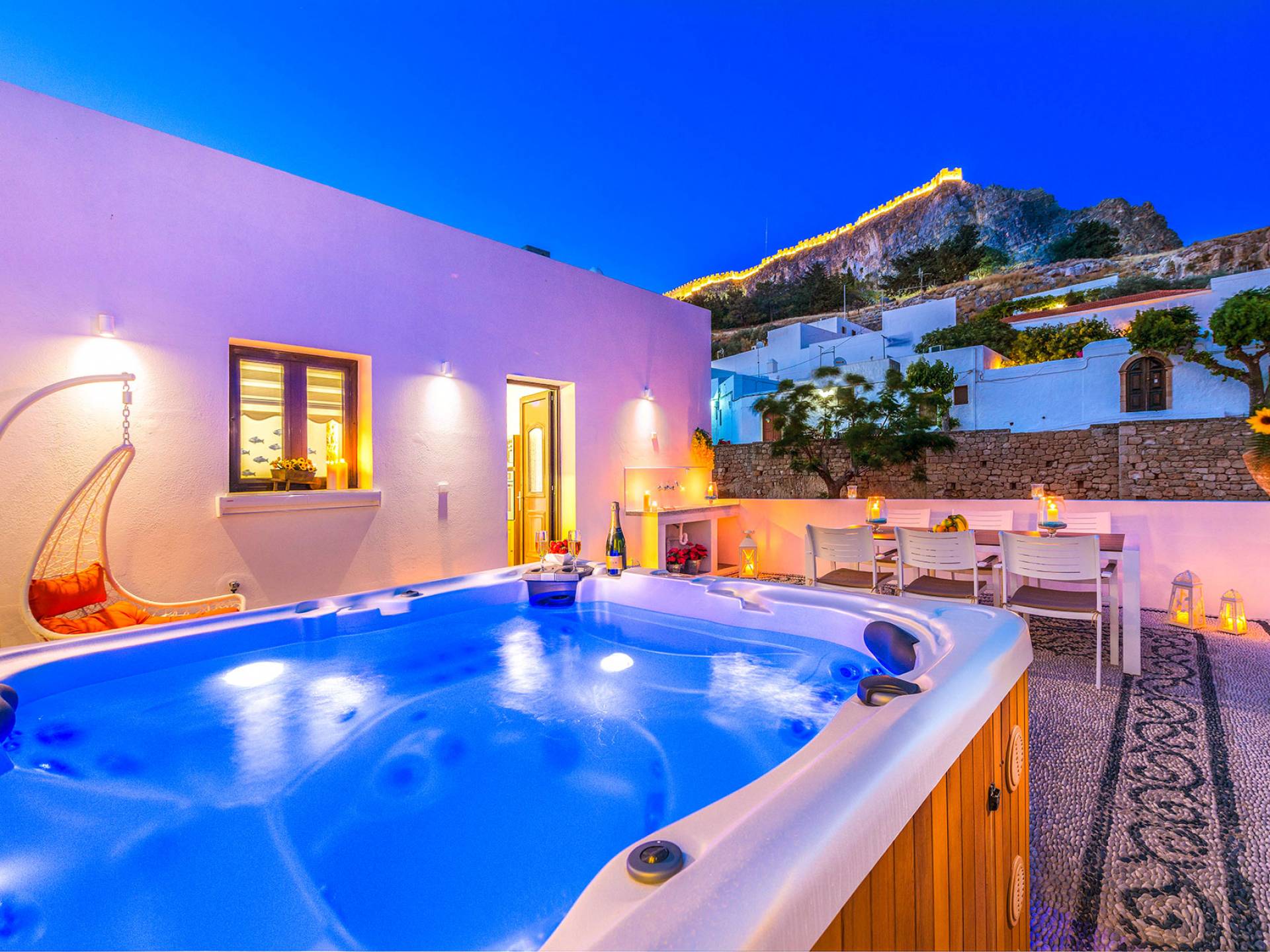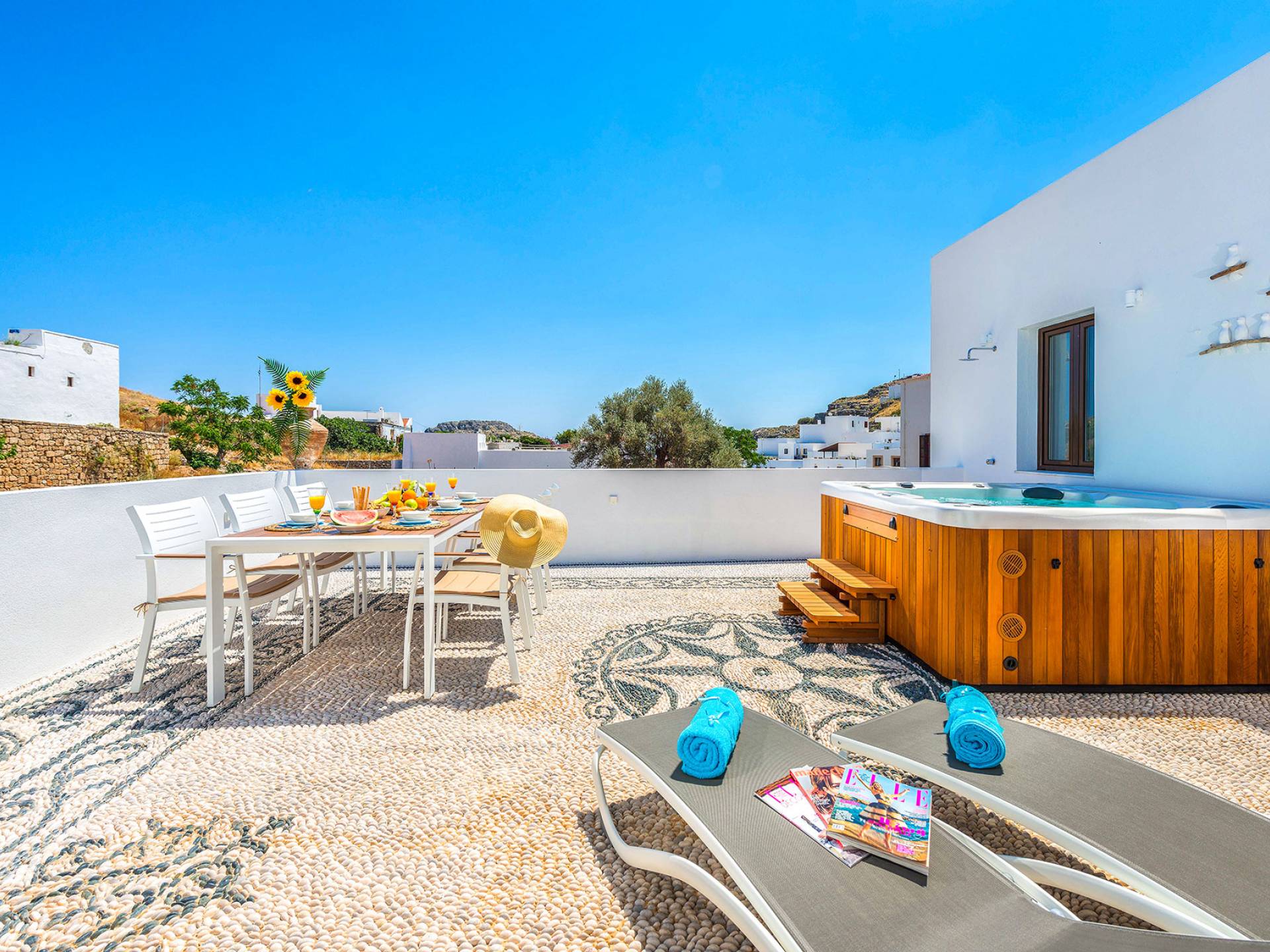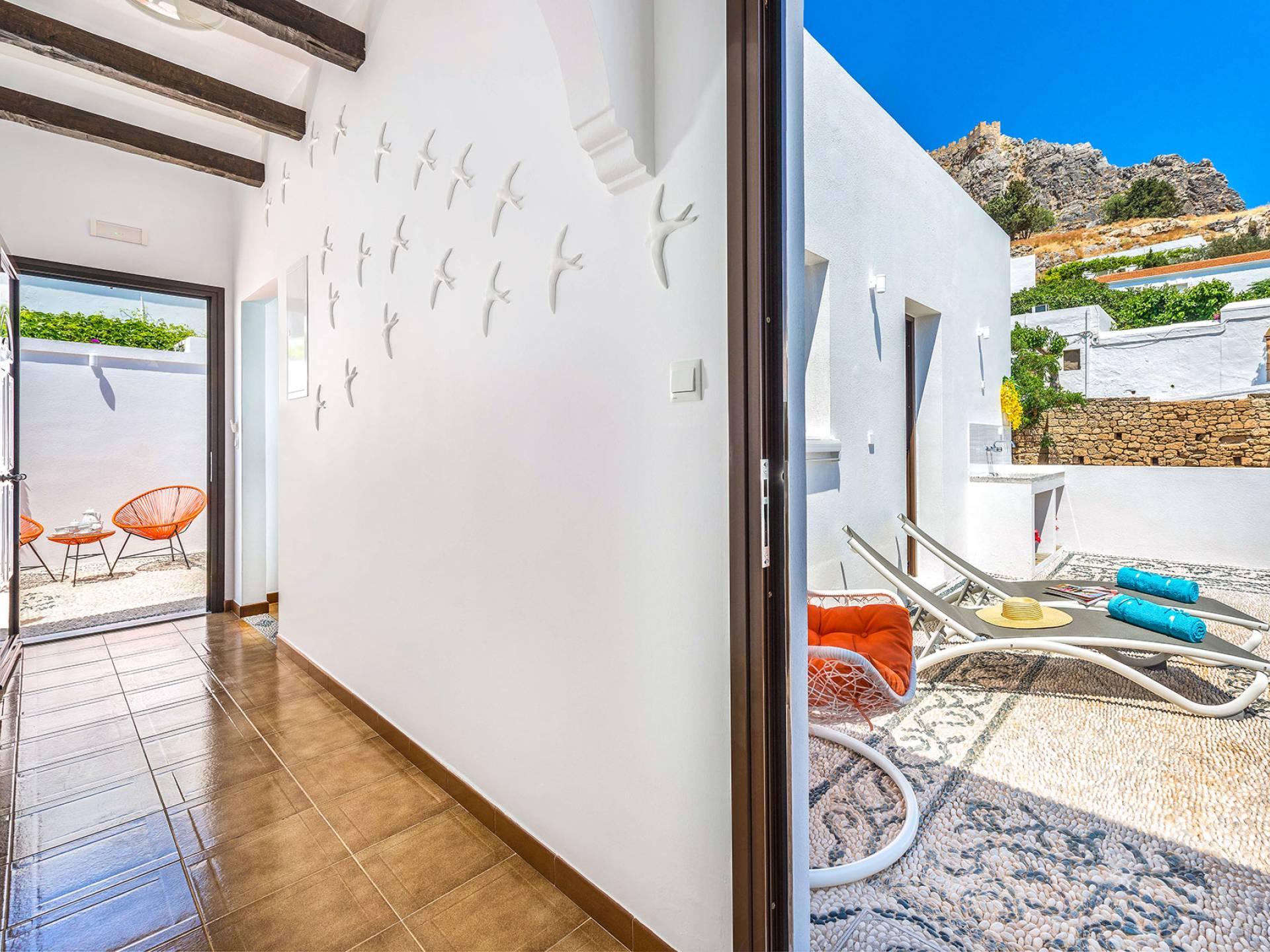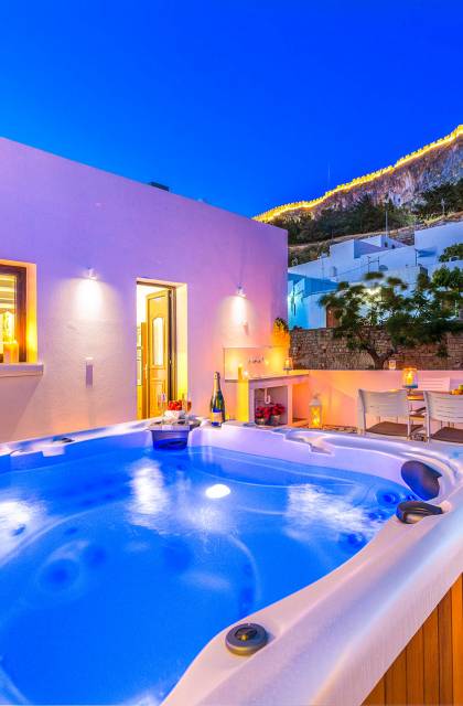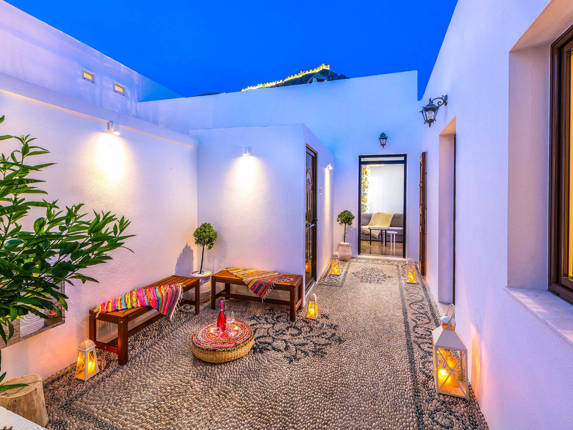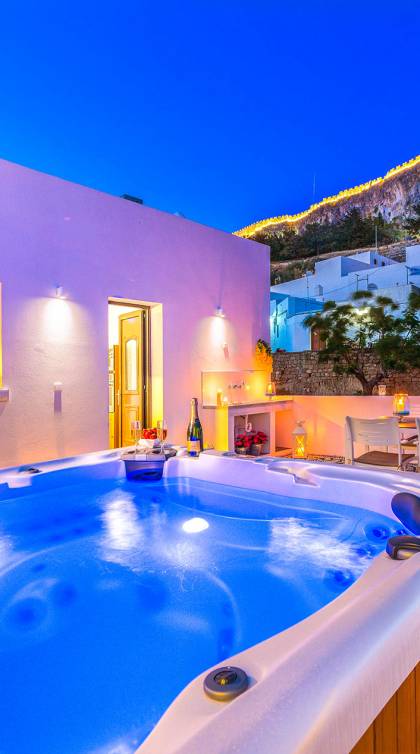 Прямо за этим окном вы можете найти большой, самый уединенный и в то же время самый спокойный солнечный двор под открытым небом с большой открытой гидромассажной ванной, а также отдохнуть на шезлонгах или пообедать на открытом воздухе рядом с древним амфитеатром Линдоса, с великолепный вид на популярную скалу Акрополя Линдоса и рядом с площадью Святого Стефана! Ночью приглушенный свет дает вам романтическую и в то же время очень умиротворяющую атмосферу расслабления и спокойствия у гидромассажной ванны и под чудесным Акрополем Линдоса.