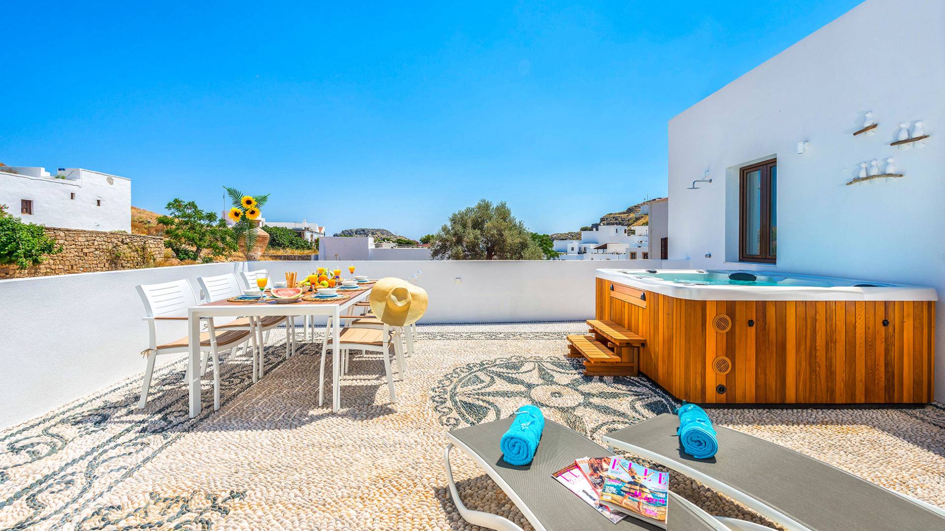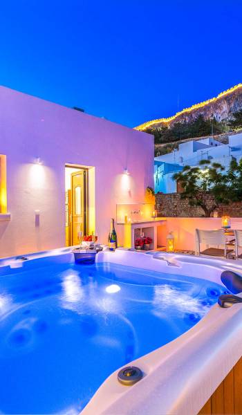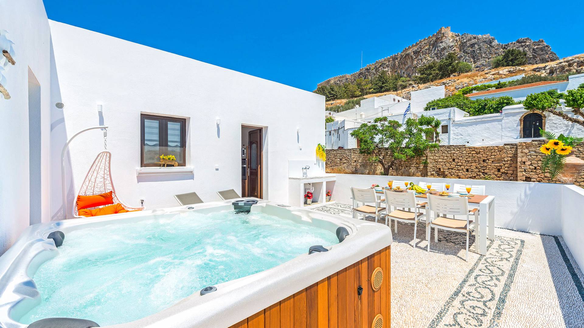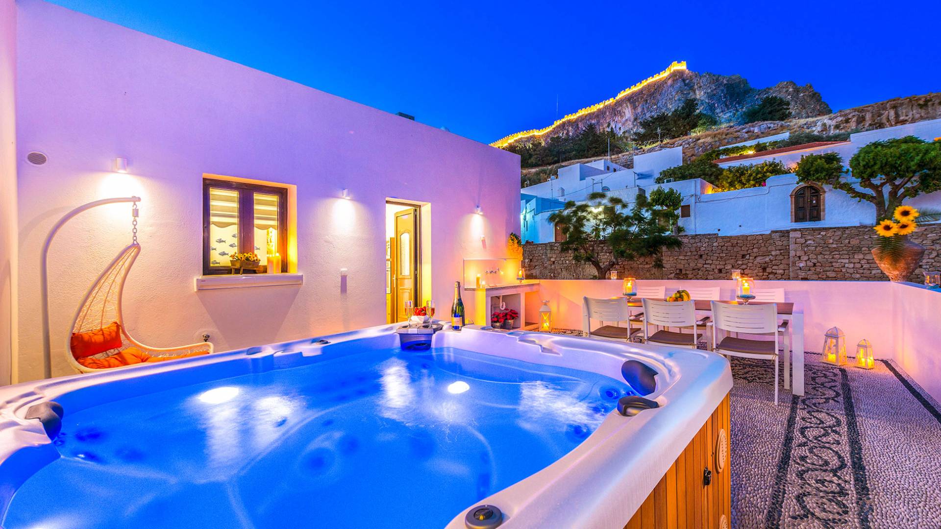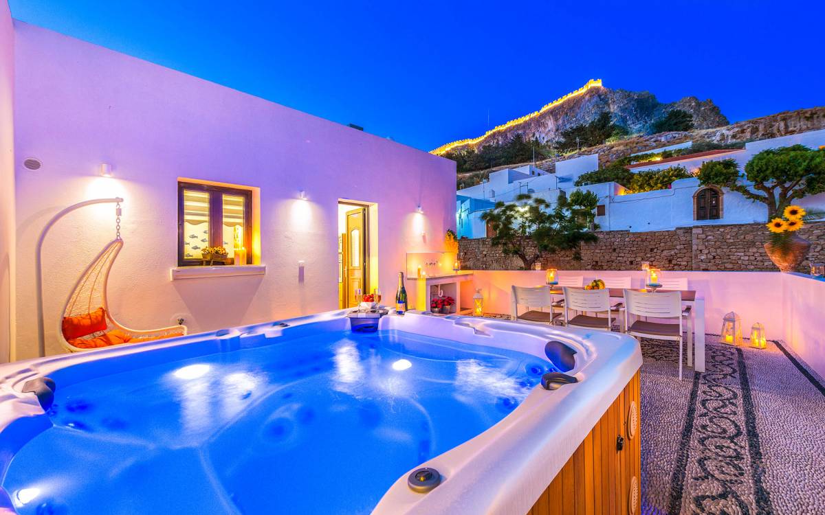 Прямо за этим окном вы можете найти большой, самый уединенный и в то же время самый спокойный солнечный двор под открытым небом с большой открытой гидромассажной ванной, а также отдохнуть на шезлонгах или пообедать на открытом воздухе рядом с древним амфитеатром Линдоса, с великолепный вид на популярную скалу Акрополя Линдоса и рядом с площадью Святого Стефана! Ночью приглушенный свет дает вам романтическую и в то же время очень умиротворяющую атмосферу расслабления и спокойствия у гидромассажной ванны и под чудесным Акрополем Линдоса.