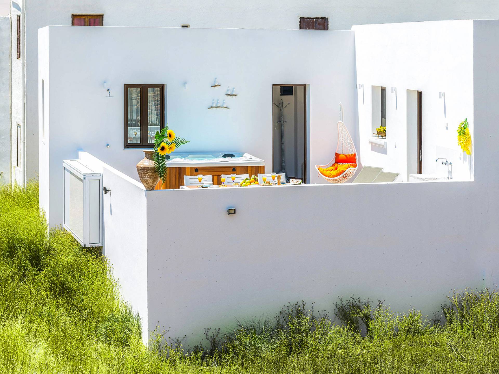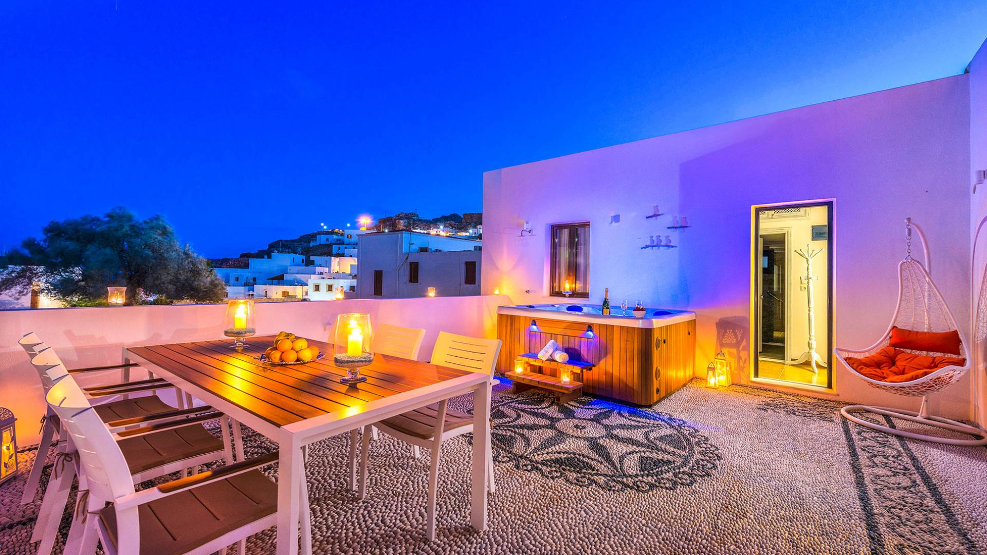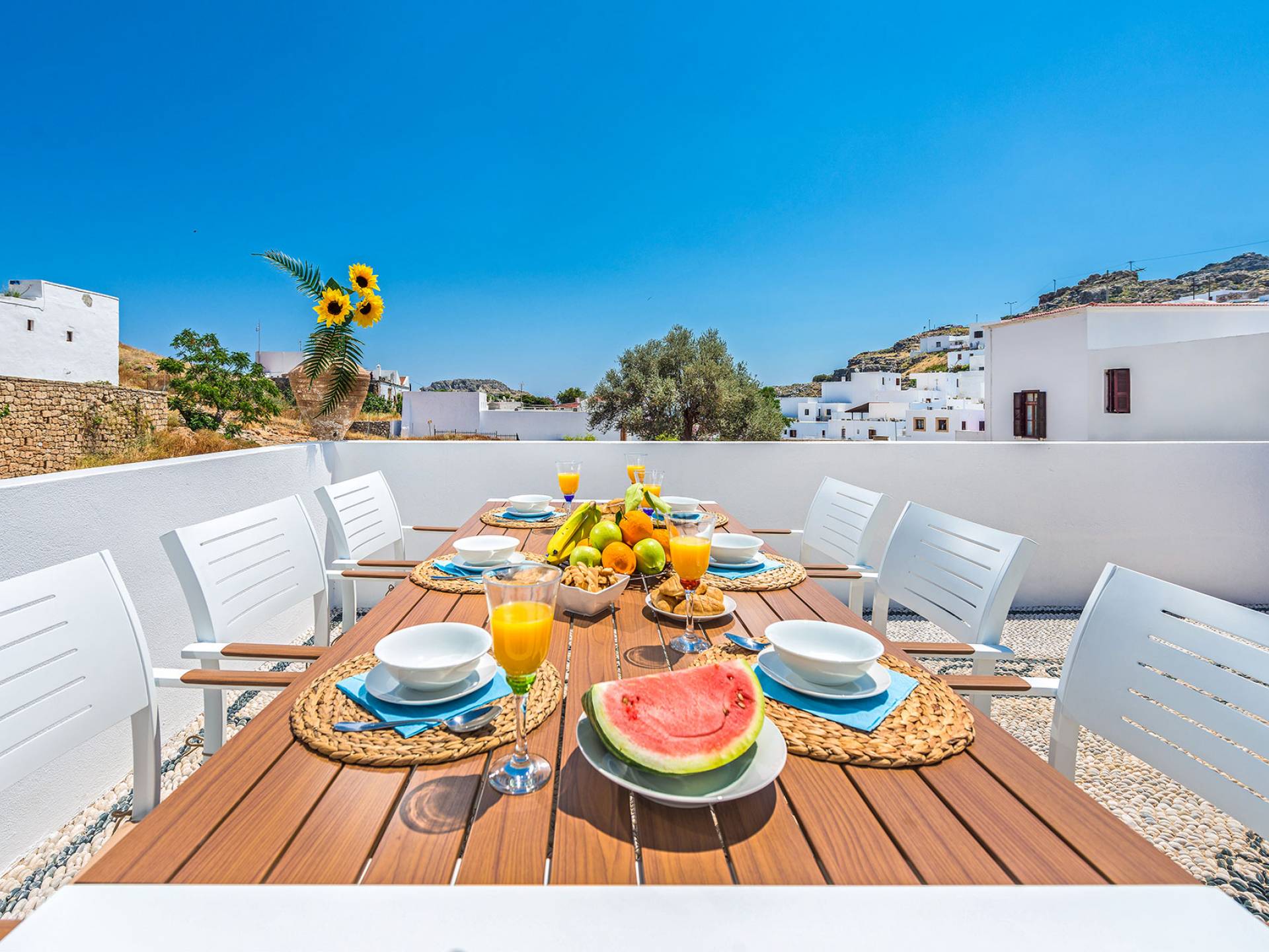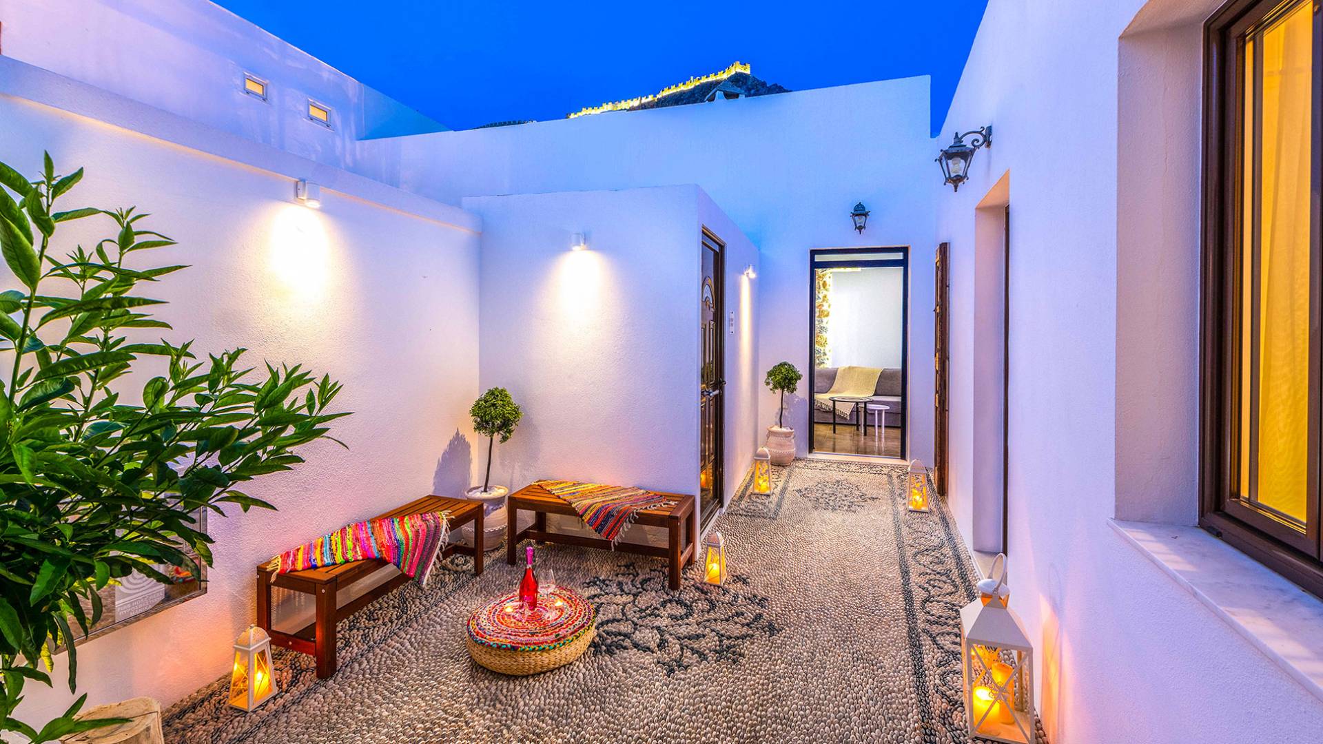 Прямо за этим окном вы можете найти большой, самый уединенный и в то же время самый спокойный солнечный двор под открытым небом с большой открытой гидромассажной ванной, а также отдохнуть на шезлонгах или пообедать на открытом воздухе рядом с древним амфитеатром Линдоса, с великолепный вид на популярную скалу Акрополя Линдоса и рядом с площадью Святого Стефана! Ночью приглушенный свет дает вам романтическую и в то же время очень умиротворяющую атмосферу расслабления и спокойствия у гидромассажной ванны и под чудесным Акрополем Линдоса.