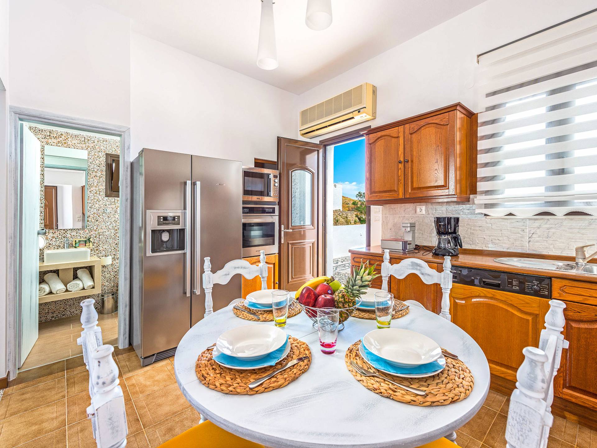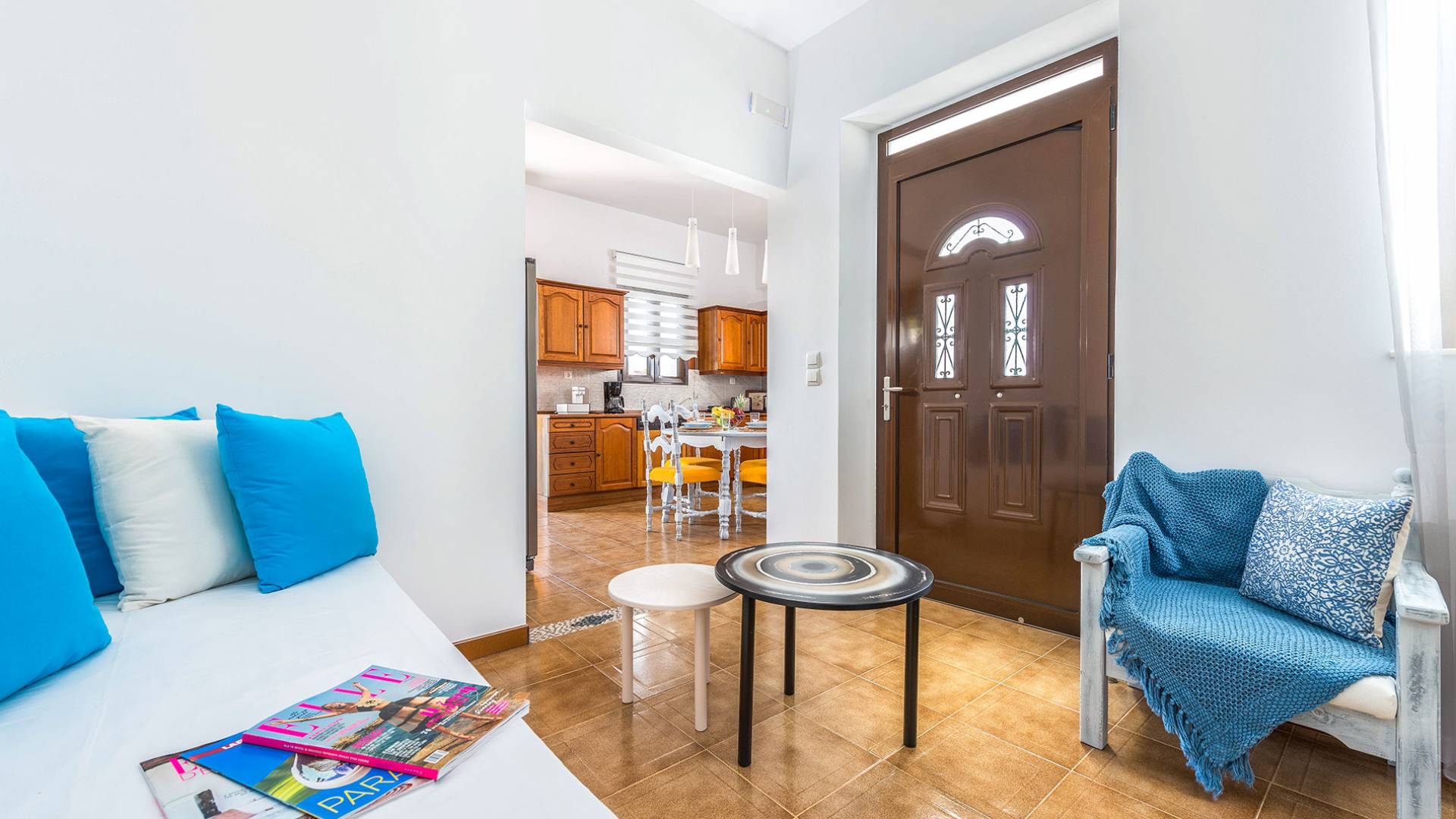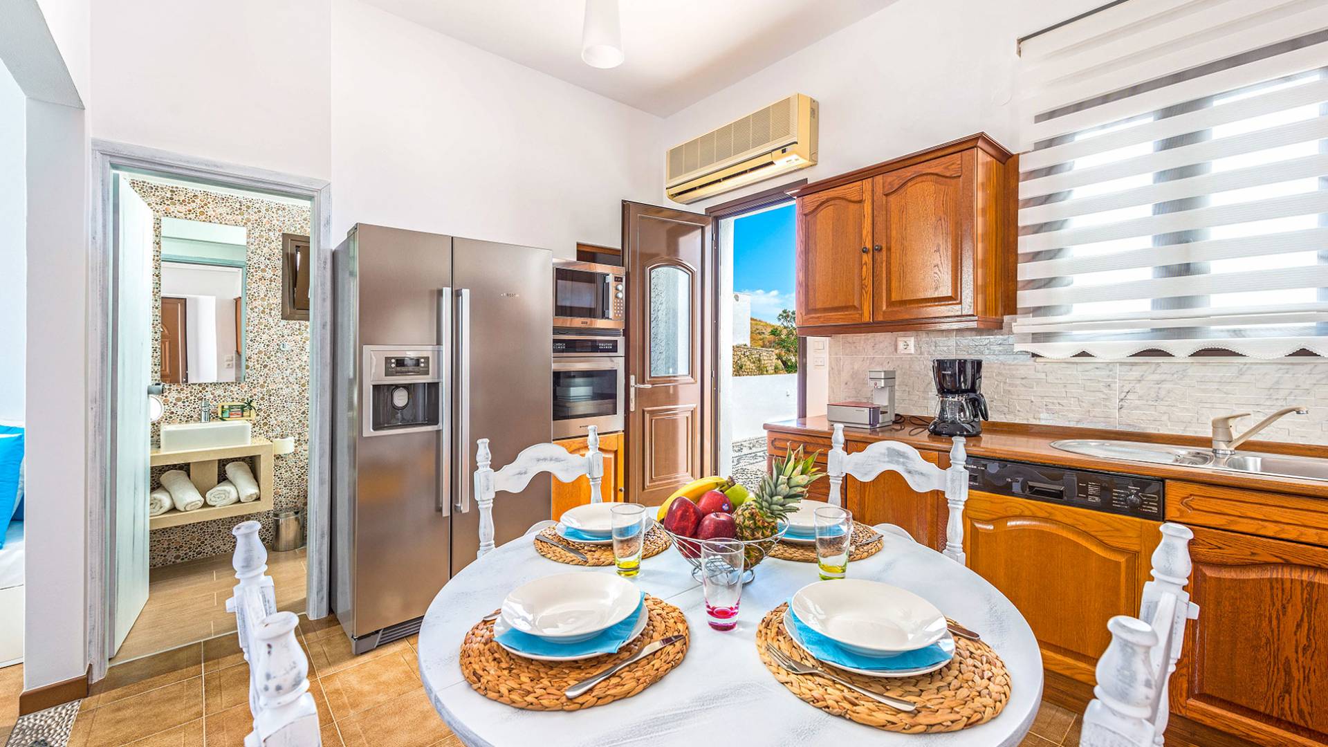 При входе через главный внешний вход гость может ощутить элементы традиций Линдоса. Небольшой, но уютный передний двор дает вам возможность взглянуть на историю Линдоса с небольшим галечным полом, где гость может посидеть и расслабиться, наслаждаясь завтраком в леденящей атмосфере. Проходя через парадную дверь слева, вы попадаете в большую, полностью оборудованную кухню с современной и роскошной техникой, такой как кофемашина illy, посудомоечная машина Bosch, американский 2-дверный холодильник Bosch, стиральная машина, керамическая плита, микроволновая печь и духовка. и т. д.