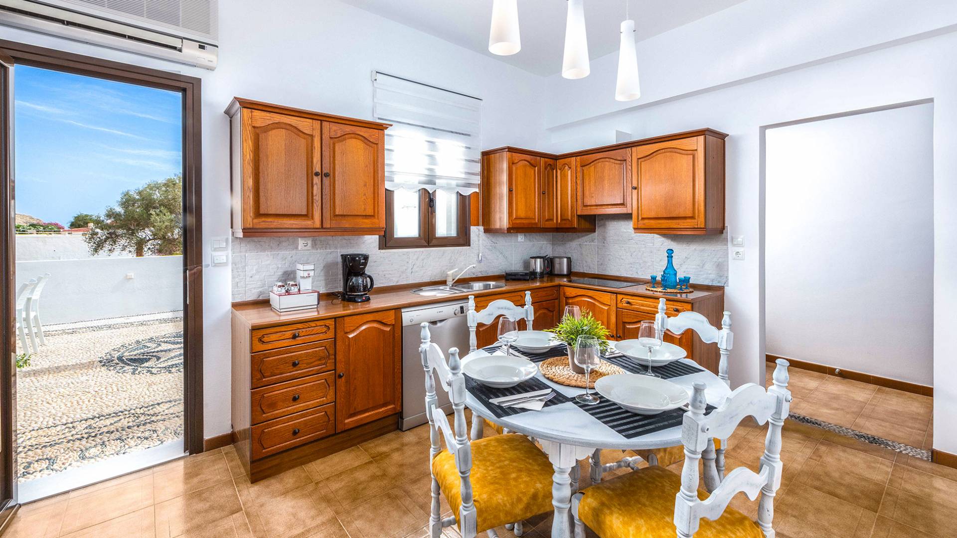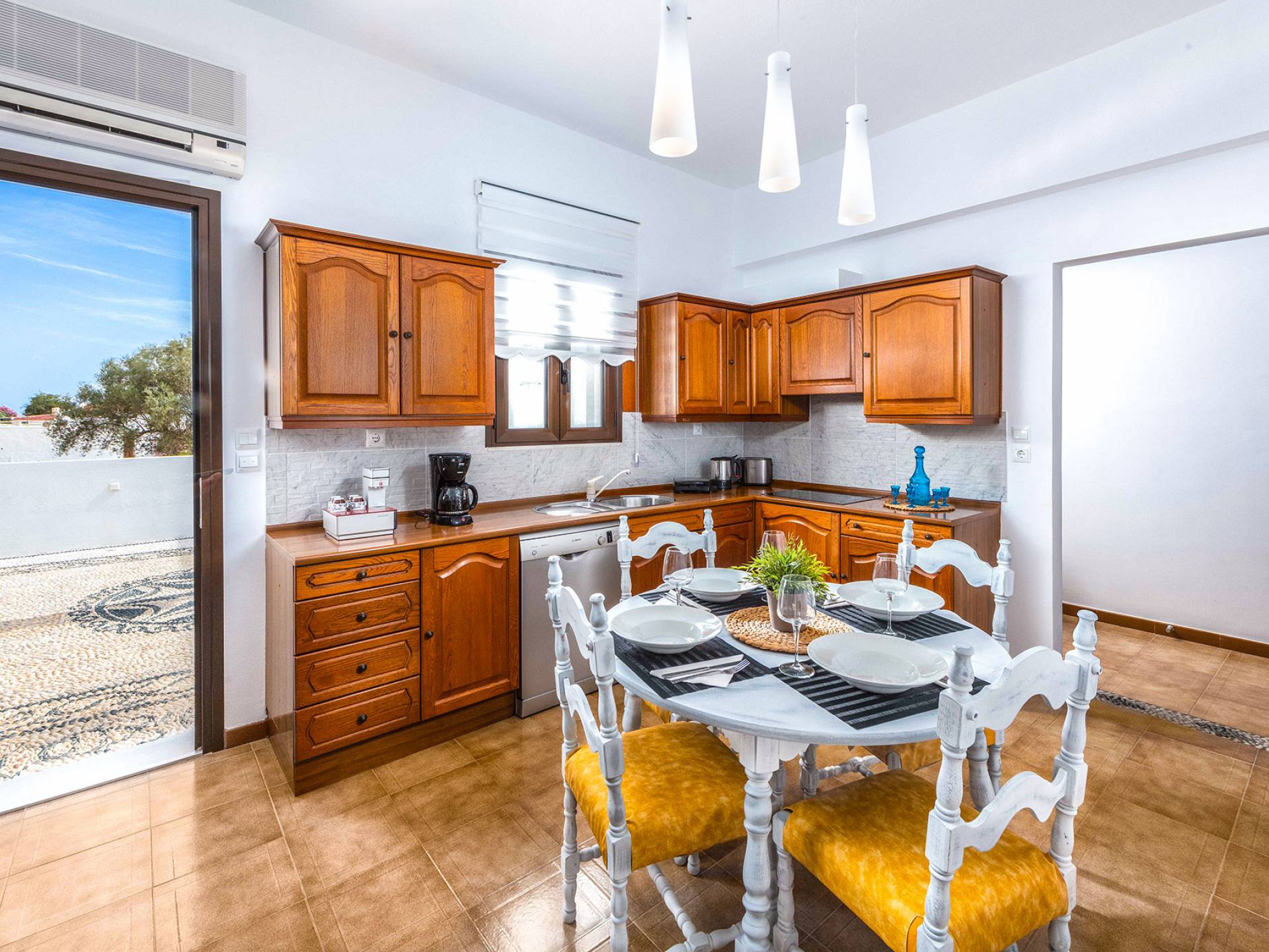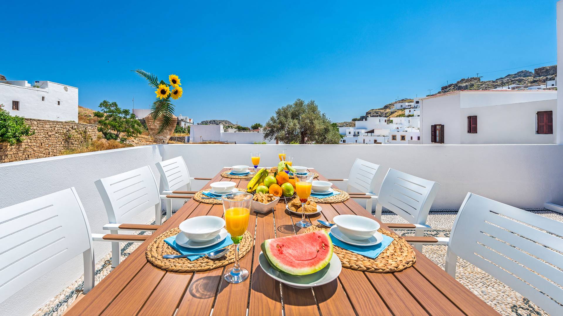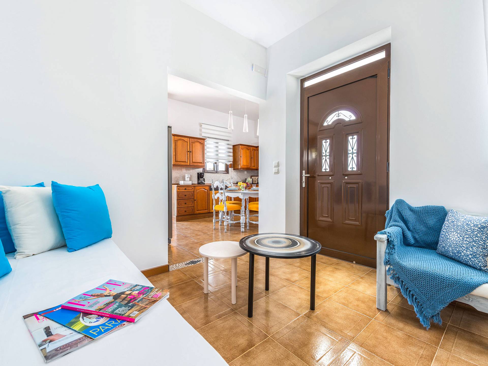 При входе через главный внешний вход гость может ощутить элементы традиций Линдоса. Небольшой, но уютный передний двор дает вам возможность взглянуть на историю Линдоса с небольшим галечным полом, где гость может посидеть и расслабиться, наслаждаясь завтраком в леденящей атмосфере. Проходя через парадную дверь слева, вы попадаете в большую, полностью оборудованную кухню с современной и роскошной техникой, такой как кофемашина illy, посудомоечная машина Bosch, американский 2-дверный холодильник Bosch, стиральная машина, керамическая плита, микроволновая печь и духовка. и т. д.