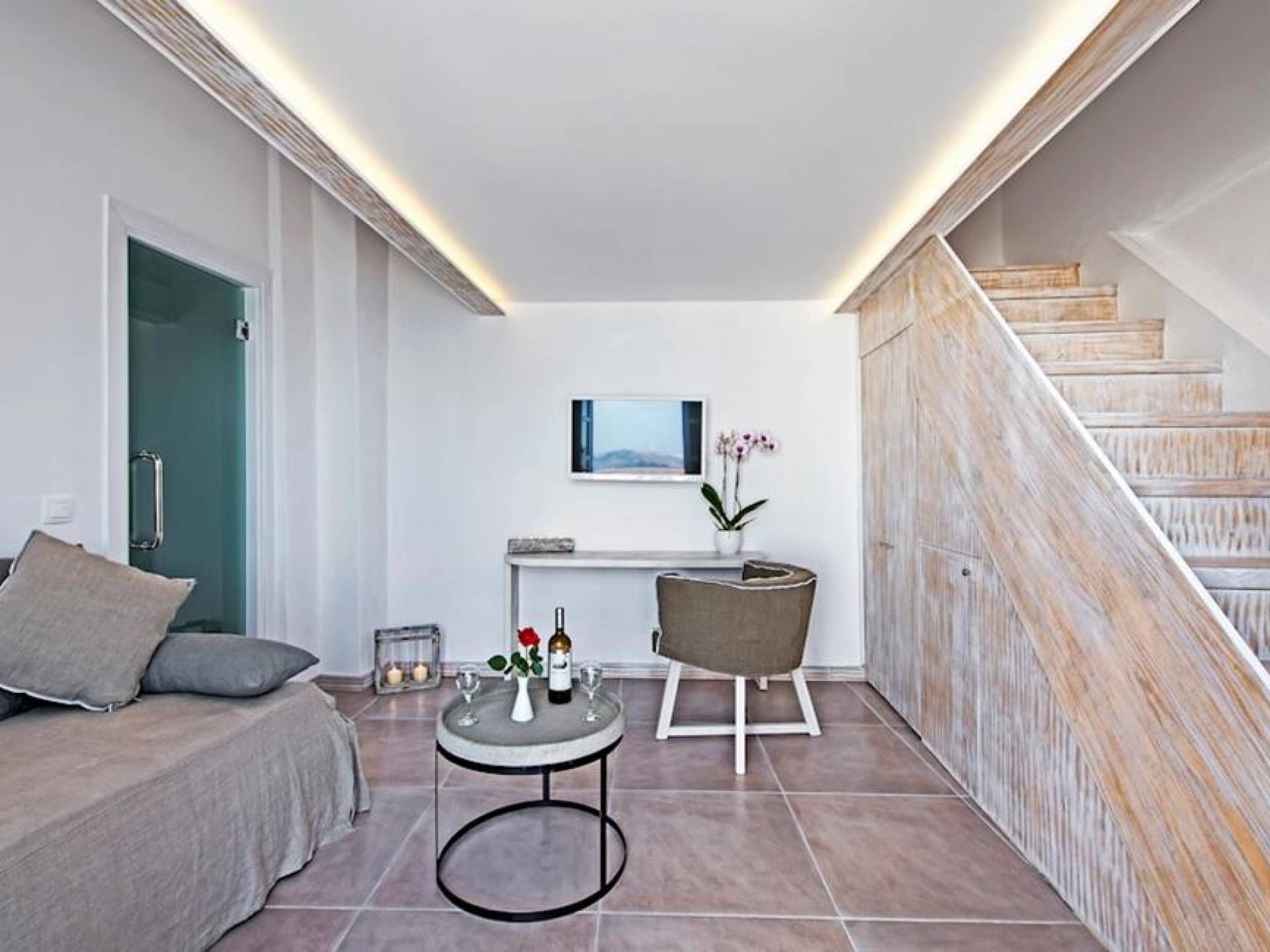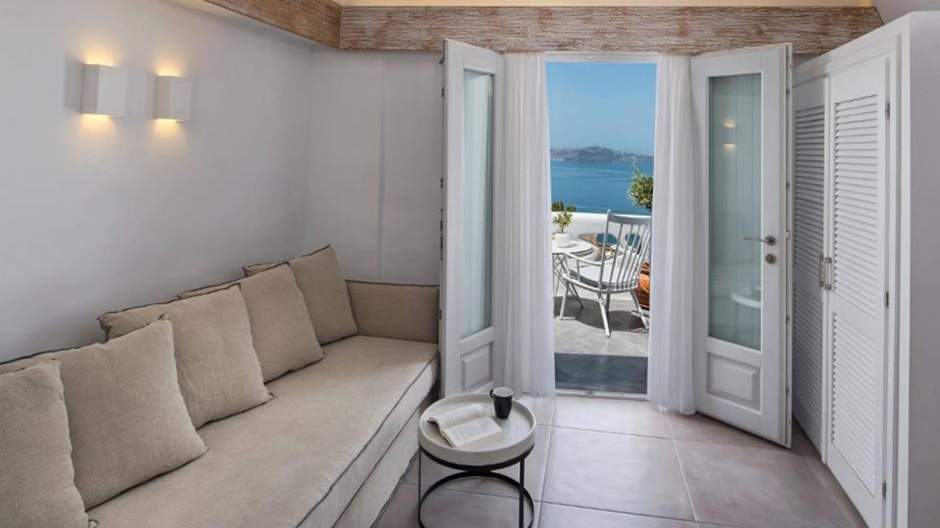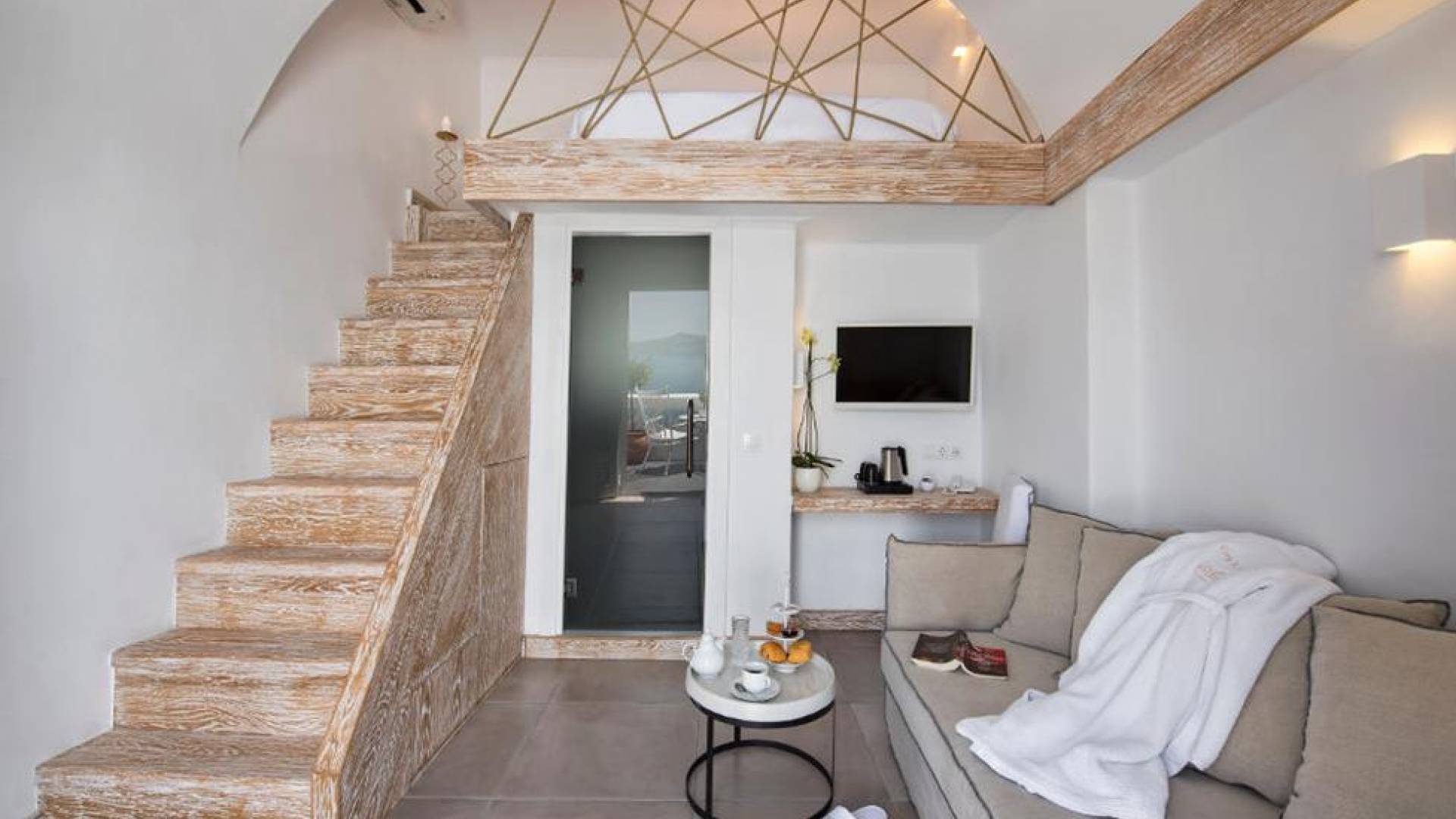 В люксе Athina Master Loft Suite могут разместиться до 3 человек. Он состоит из одной двуспальной кровати на чердаке, гостиной с односпальным диваном и собственного балкона с видом на море и вулкан.