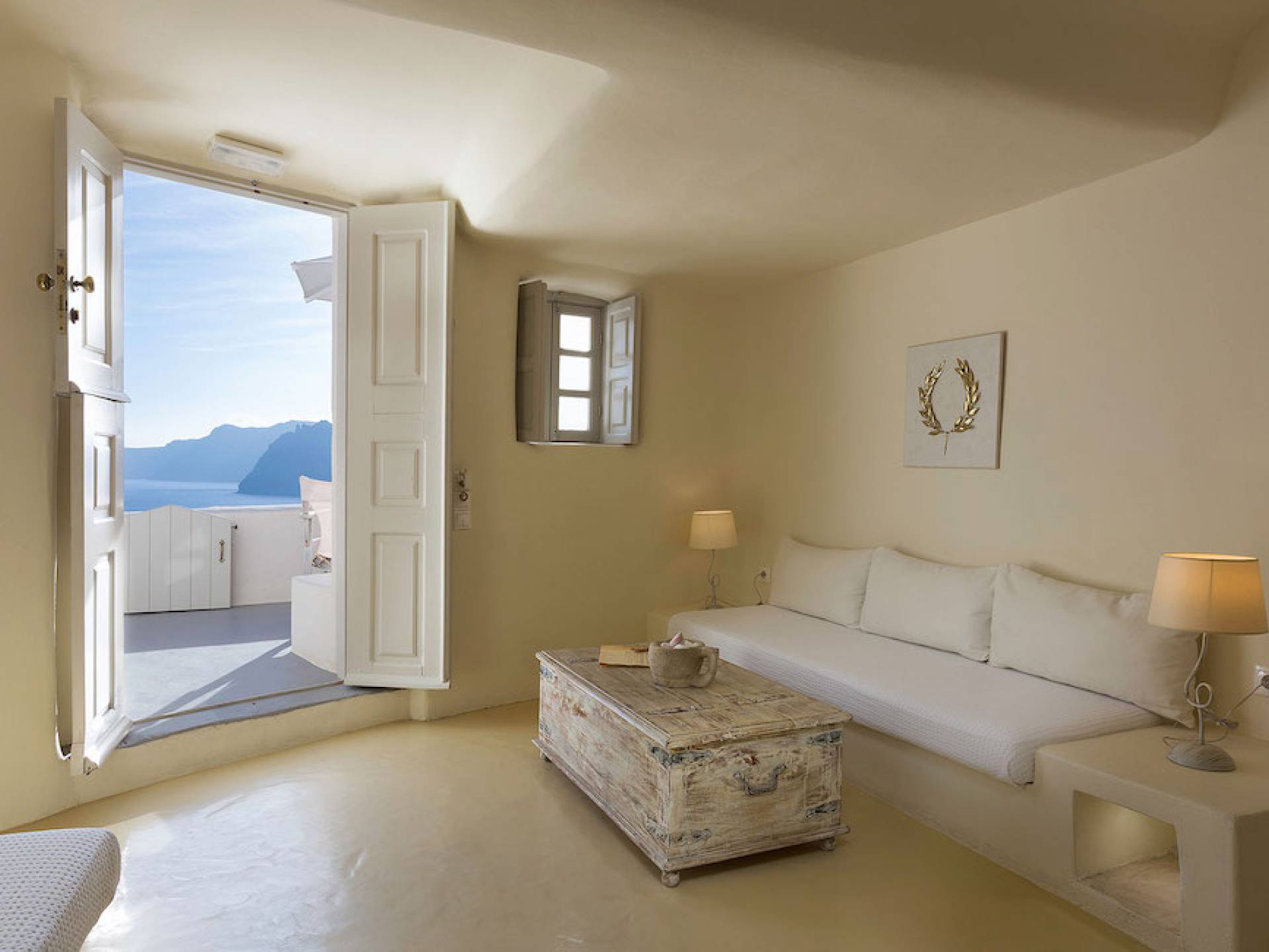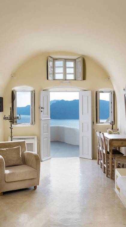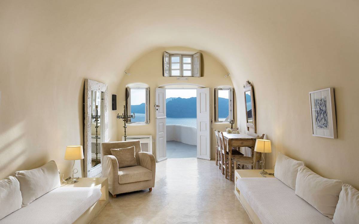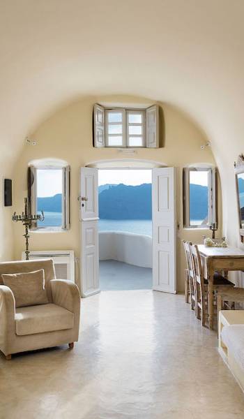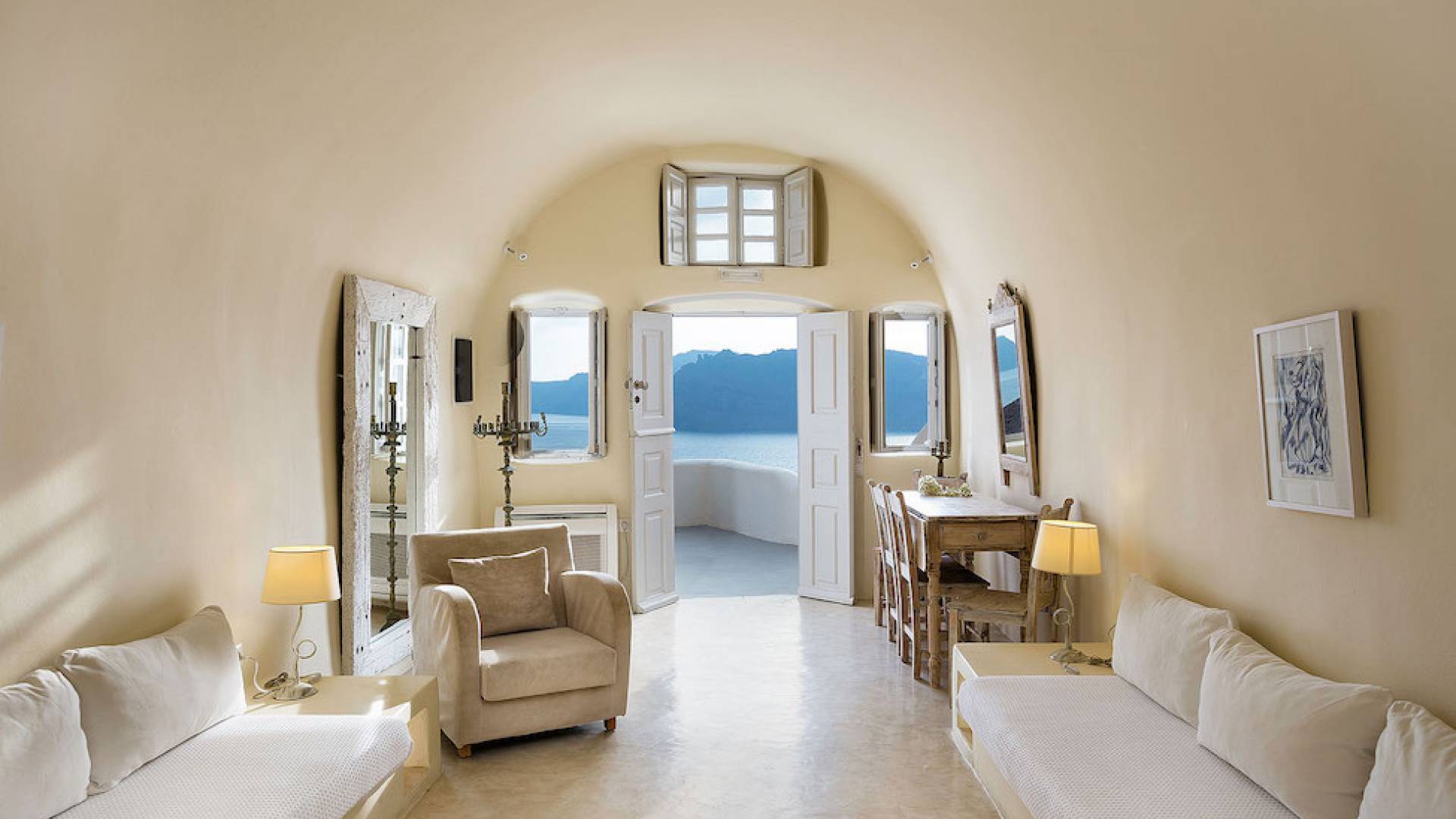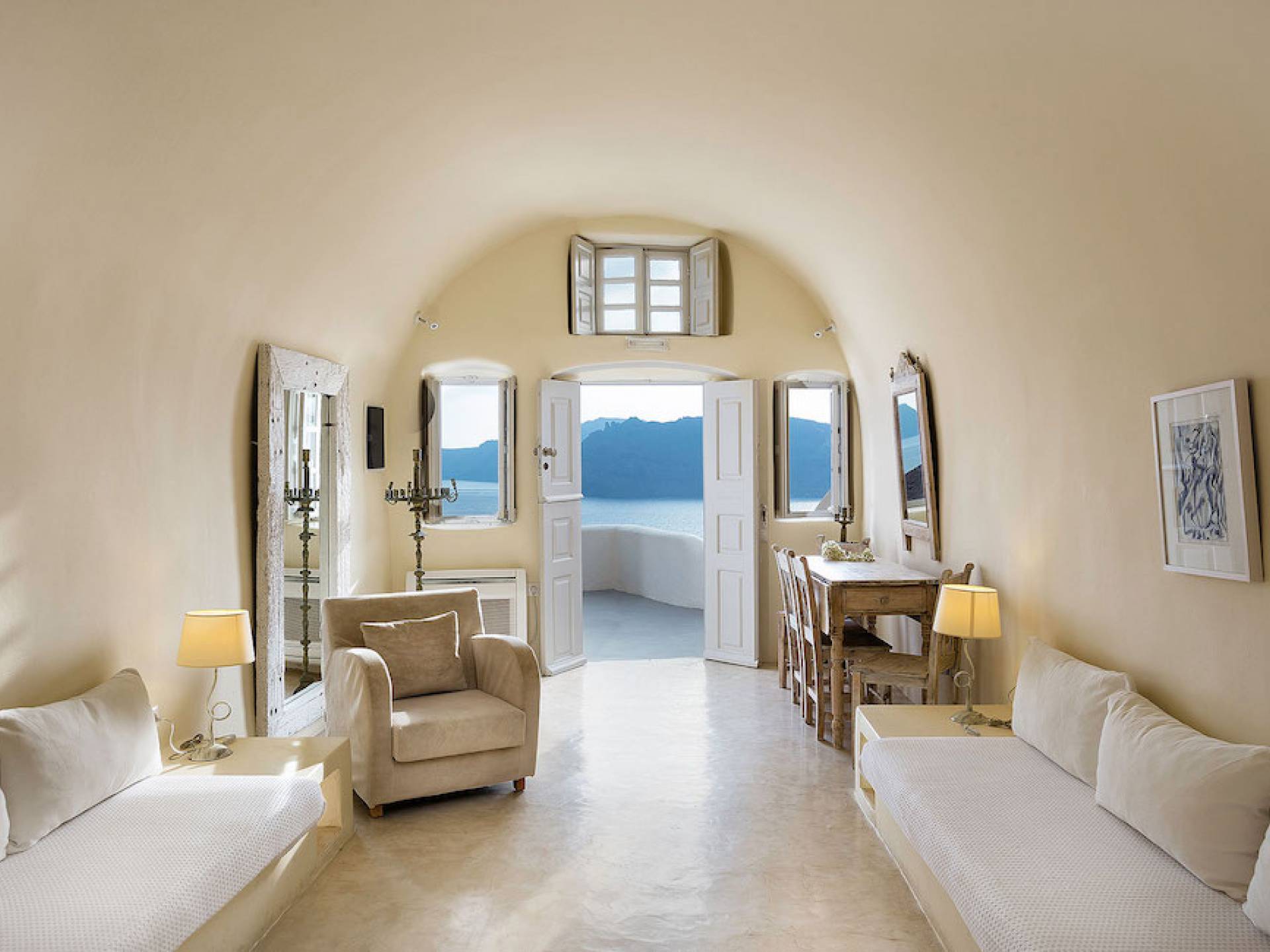 Отель Oia Mare Villas предлагает люксы в пещере с захватывающим видом на кальдеру и Эгейское море. Все апартаменты выполнены в строгом, но элегантном стиле острова.