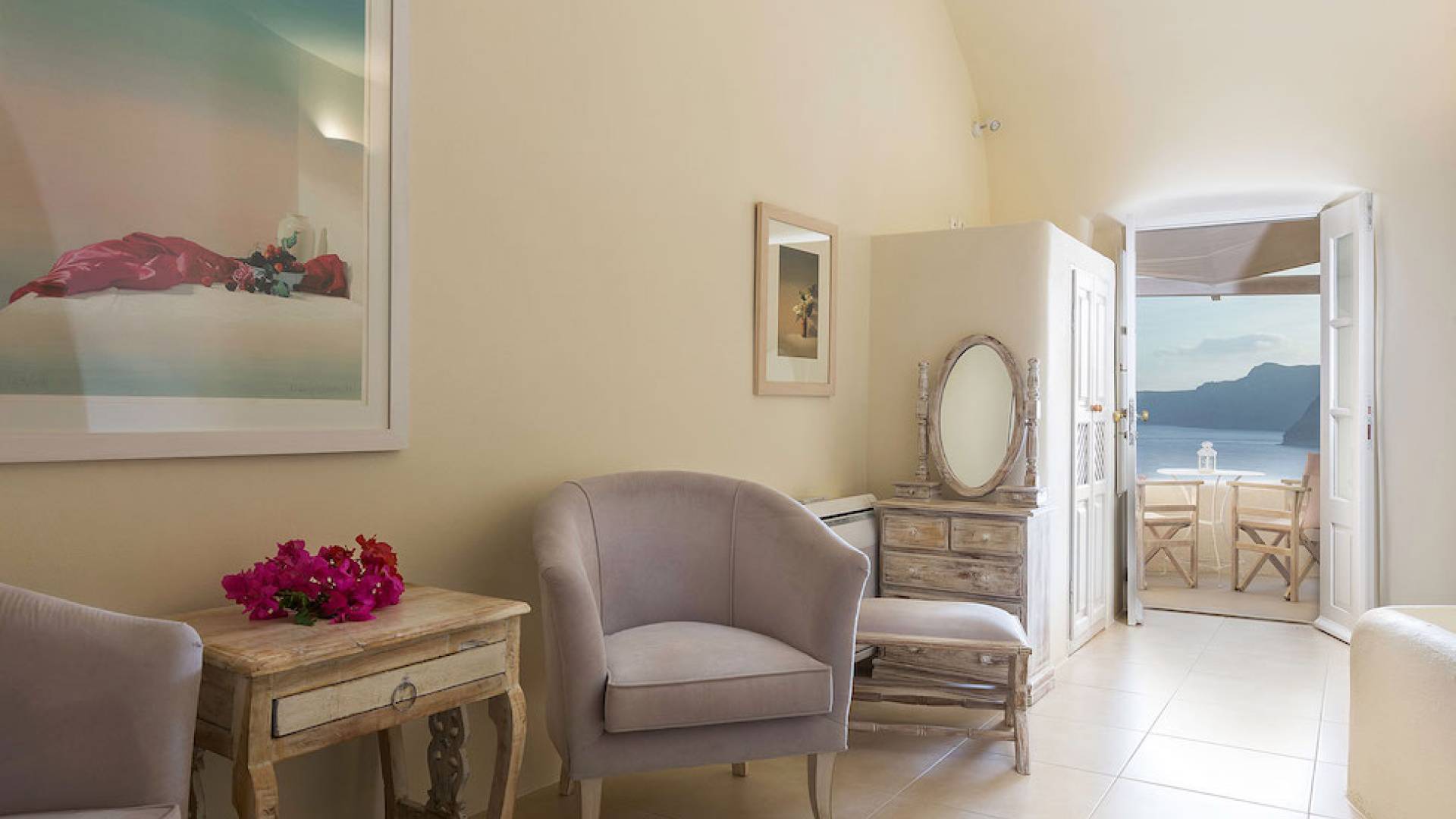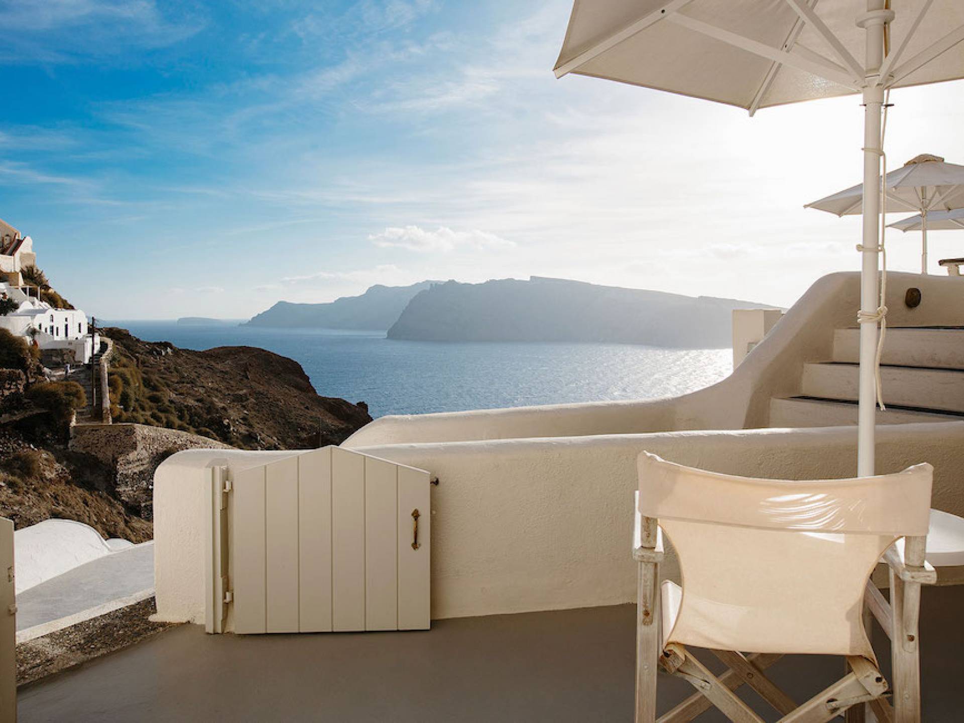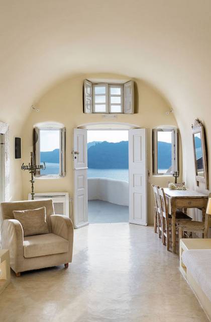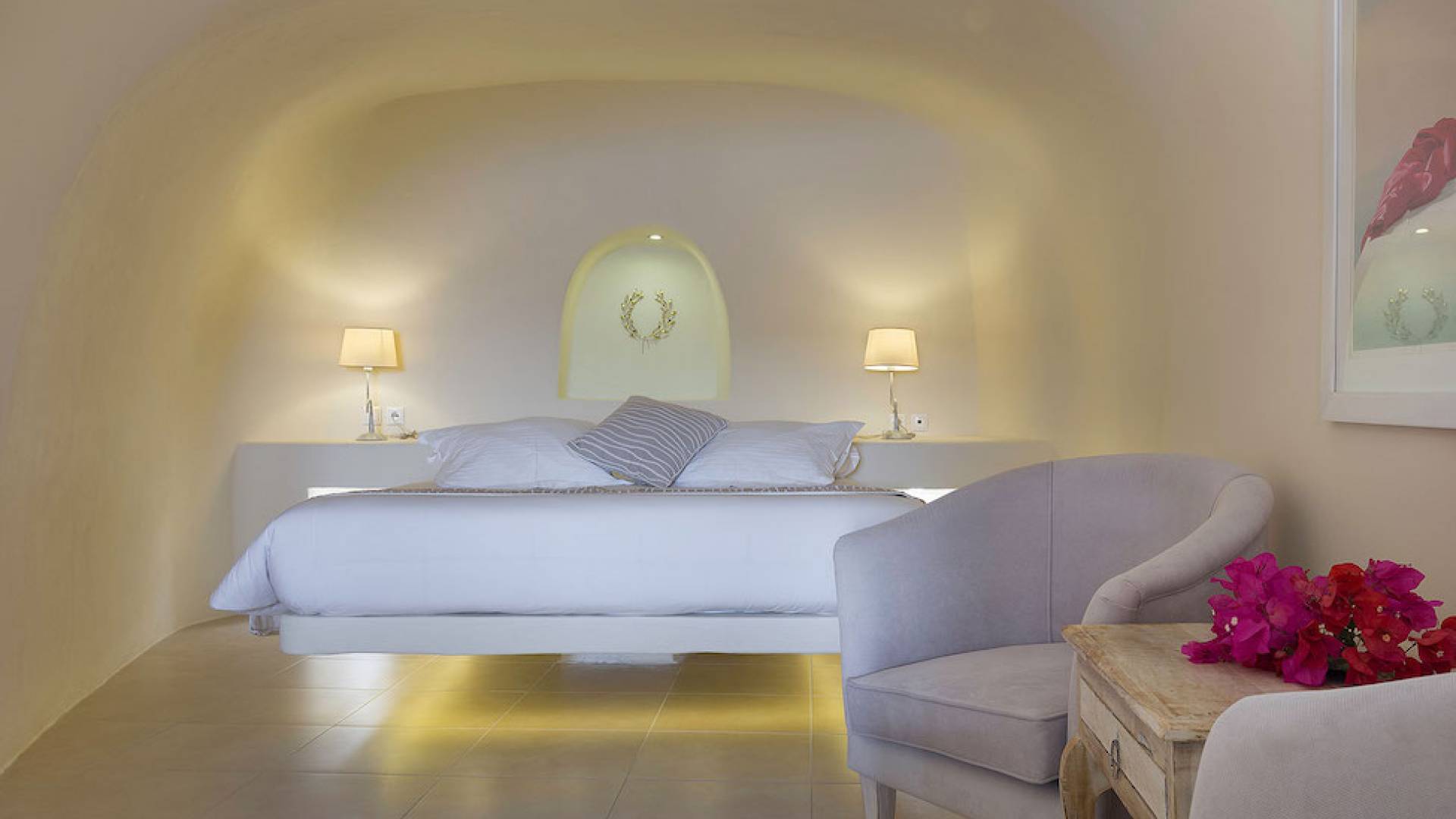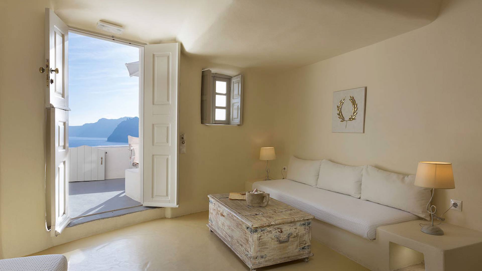 Отель Oia Mare Villas предлагает люксы в пещере с захватывающим видом на кальдеру и Эгейское море. Все апартаменты выполнены в строгом, но элегантном стиле острова.