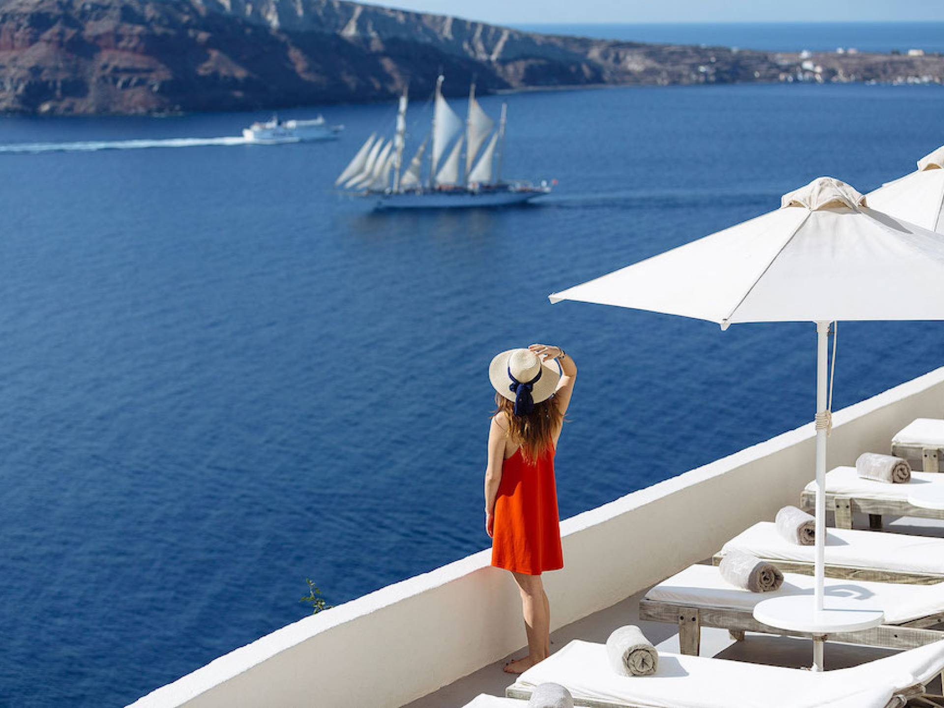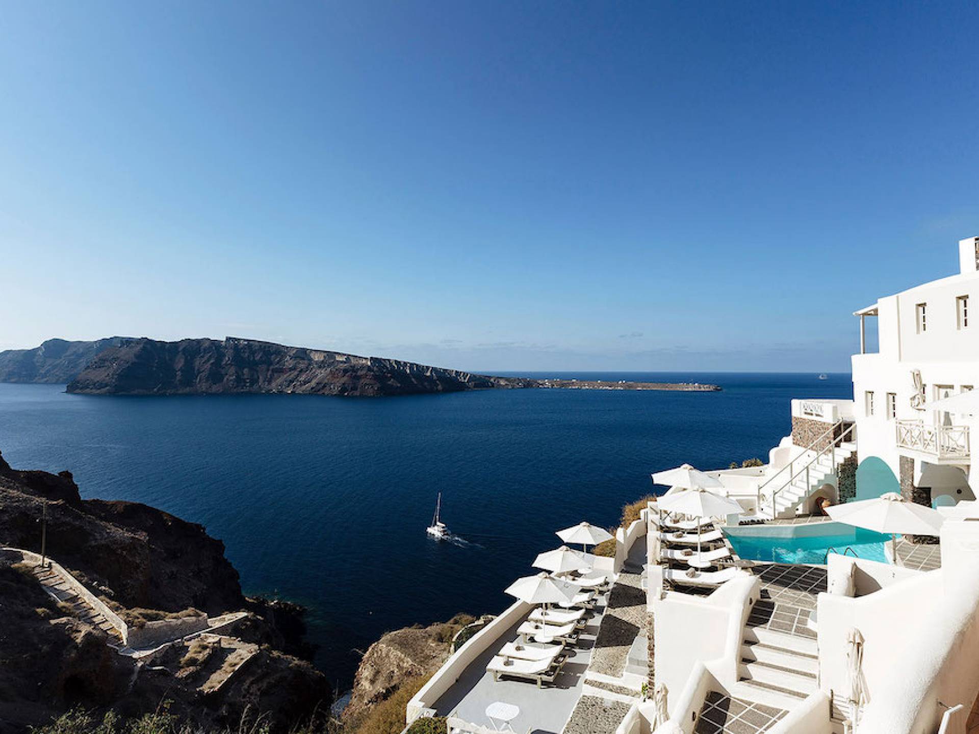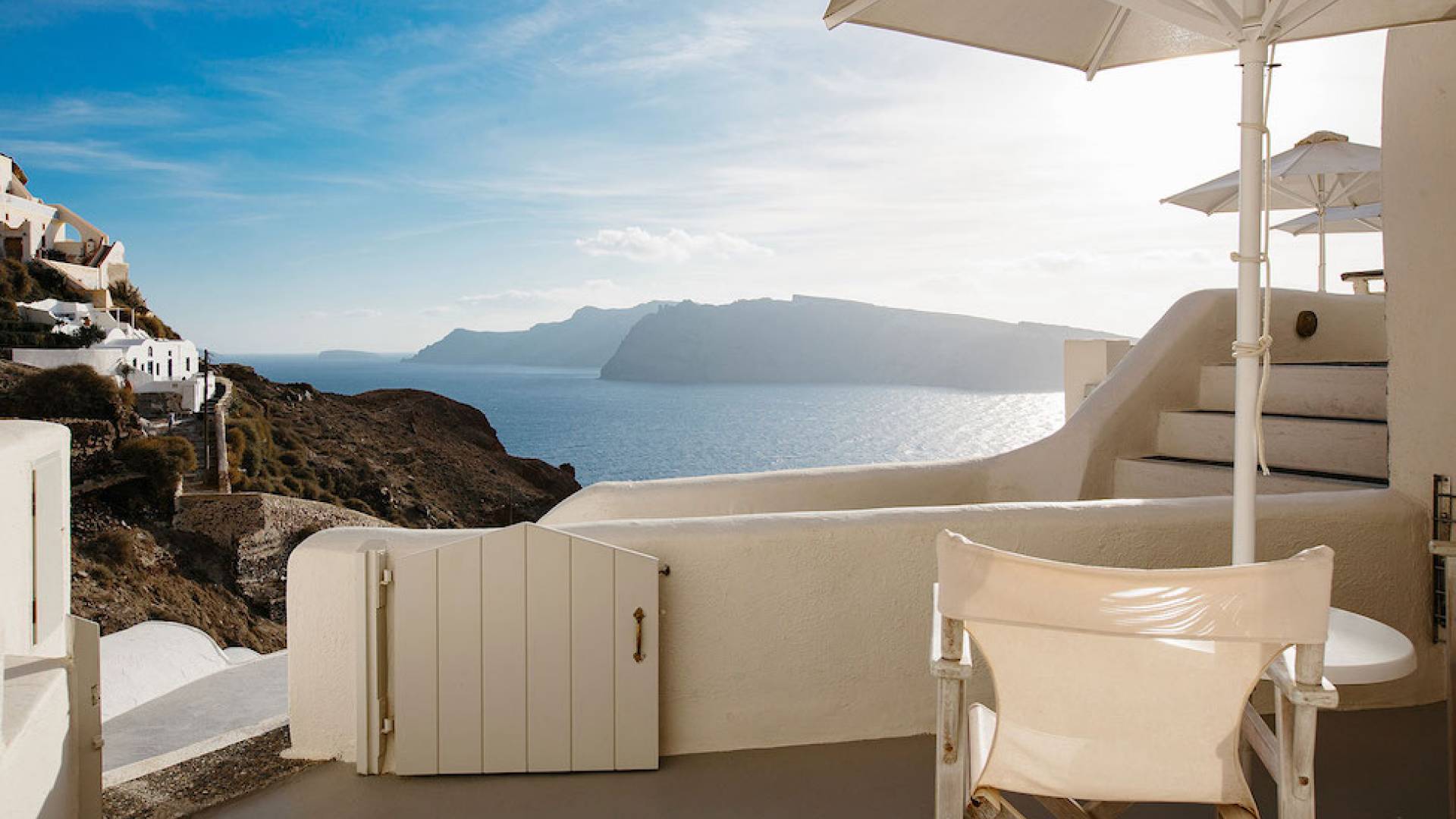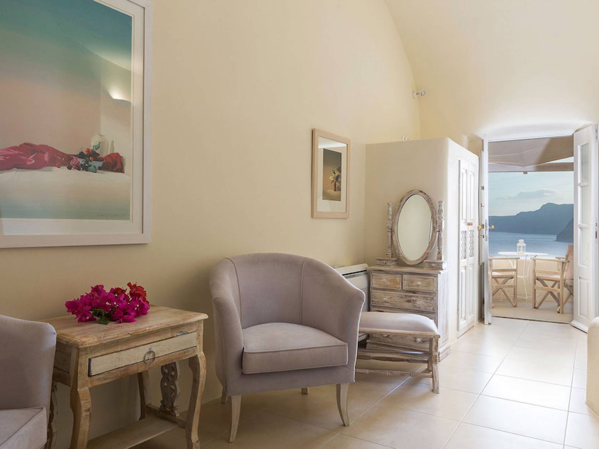 Отель Oia Mare Villas предлагает люксы в пещере с захватывающим видом на кальдеру и Эгейское море. Все апартаменты выполнены в строгом, но элегантном стиле острова.