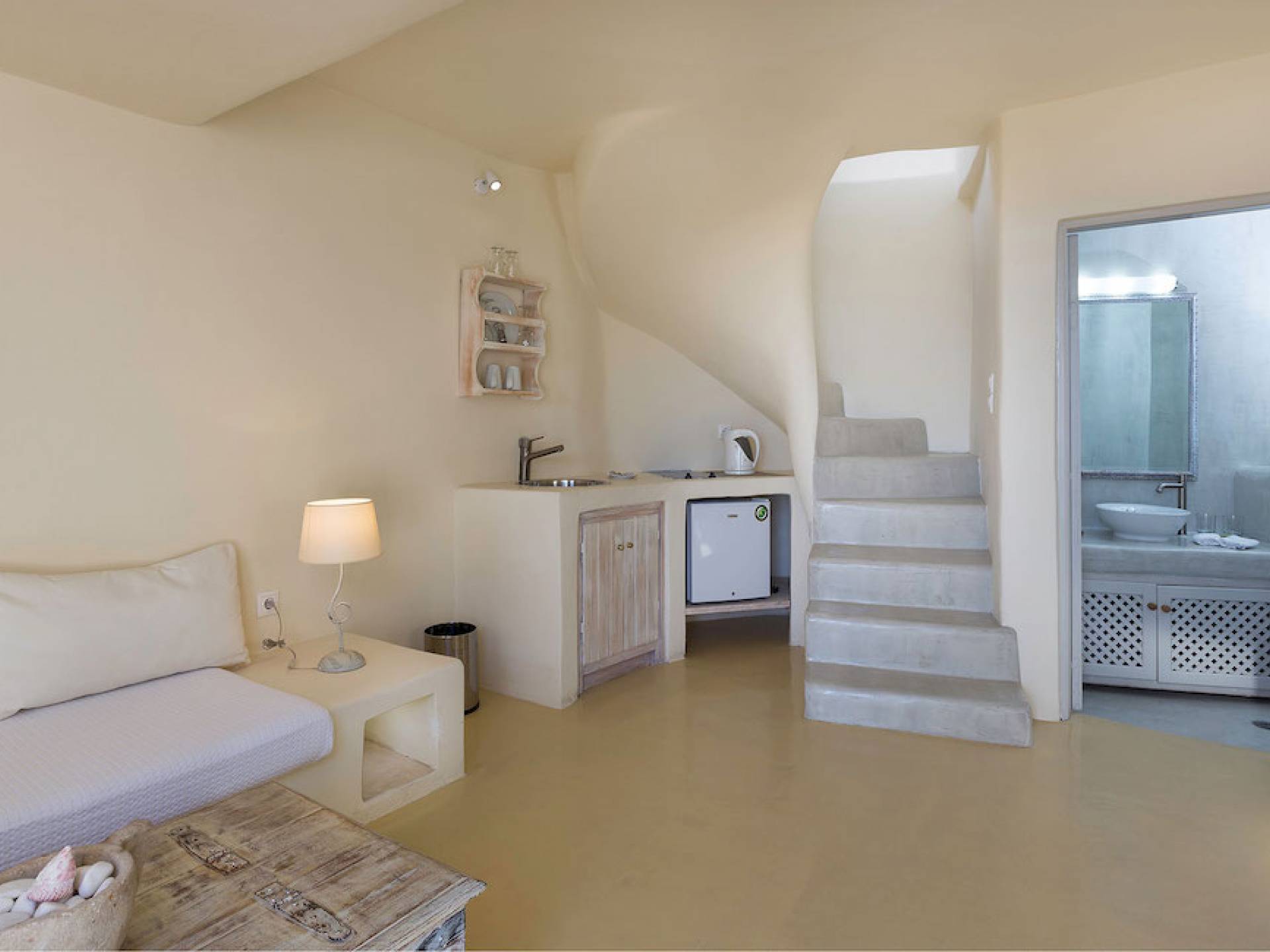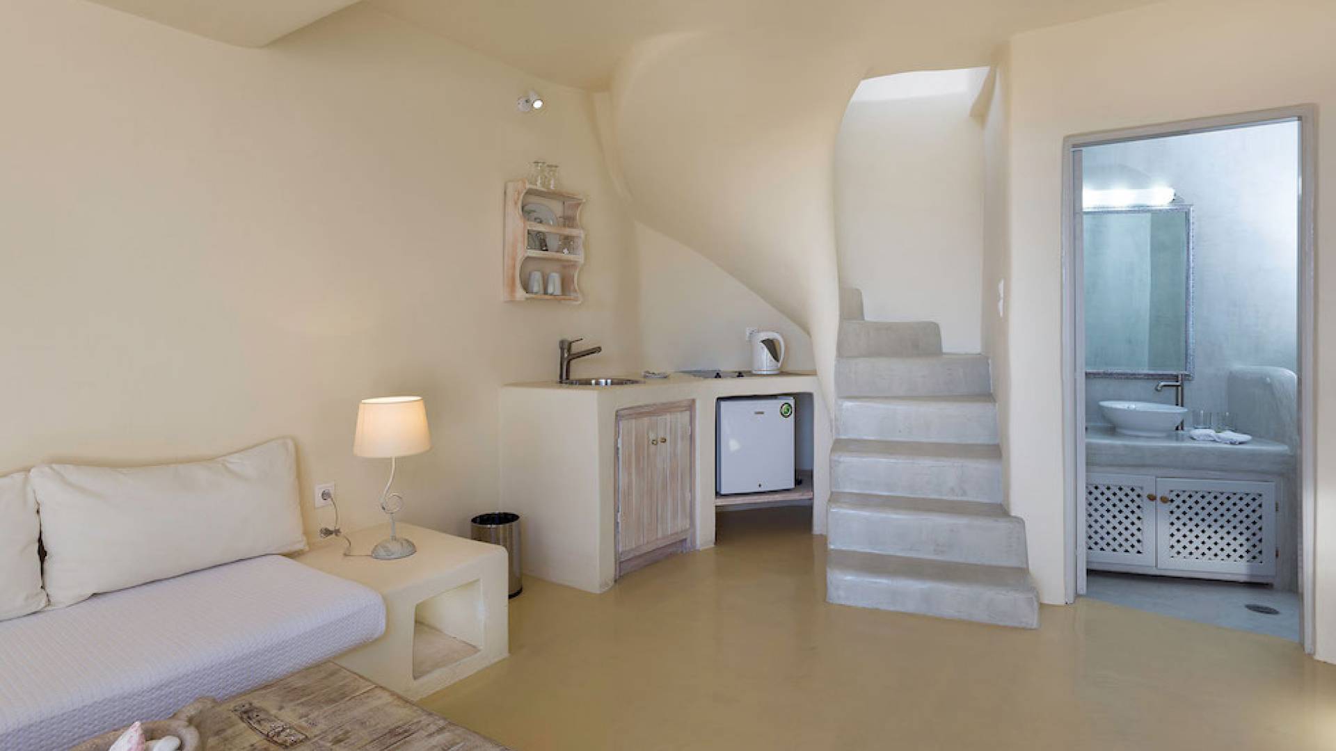 Традиционно оформленный люкс в кикладском стиле с кондиционером и собственным балконом с видом на кальдеру и Эгейское море. В нем есть гостиный уголок с телевизором с плоским экраном, спутниковое телевидение и обеденная зона.
