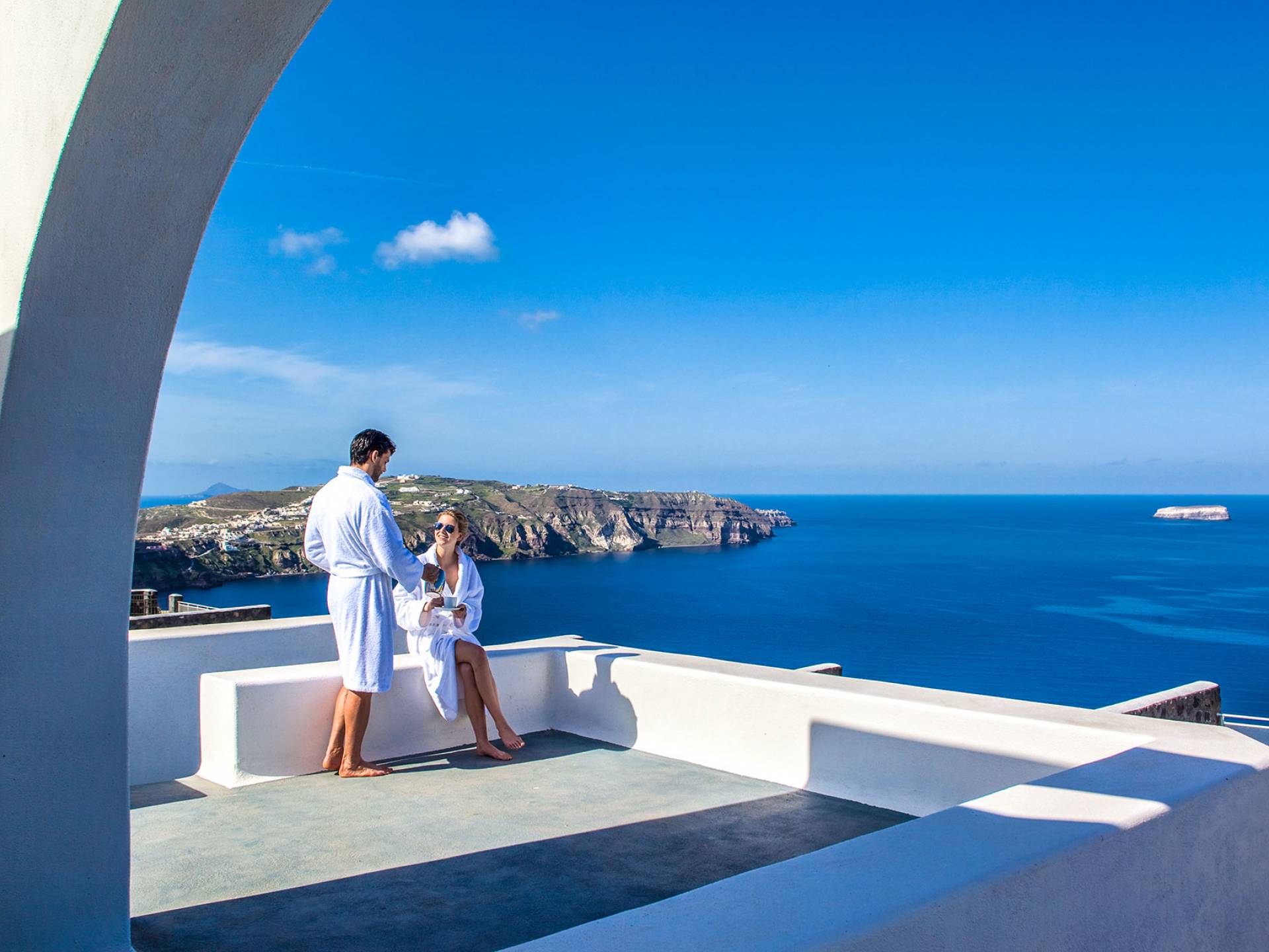 На виллах с 2 спальнями есть просторная гостиная (некоторые с камином), оборудованная телевизором с плоским экраном, кухня с обеденным столом и принадлежностями, две отдельные спальни с ЖК-телевизорами, хлопковое сатиновое постельное белье, пуховое одеяло из микрофибры, гусиный пух и подушки из полого волокна и две ванные комнаты, в одной из которых есть джакузи. Прекрасная веранда с захватывающим видом на знаменитую кальдеру оборудована удобной мебелью и шезлонгами на деревянной террасе частного бассейна виллы.