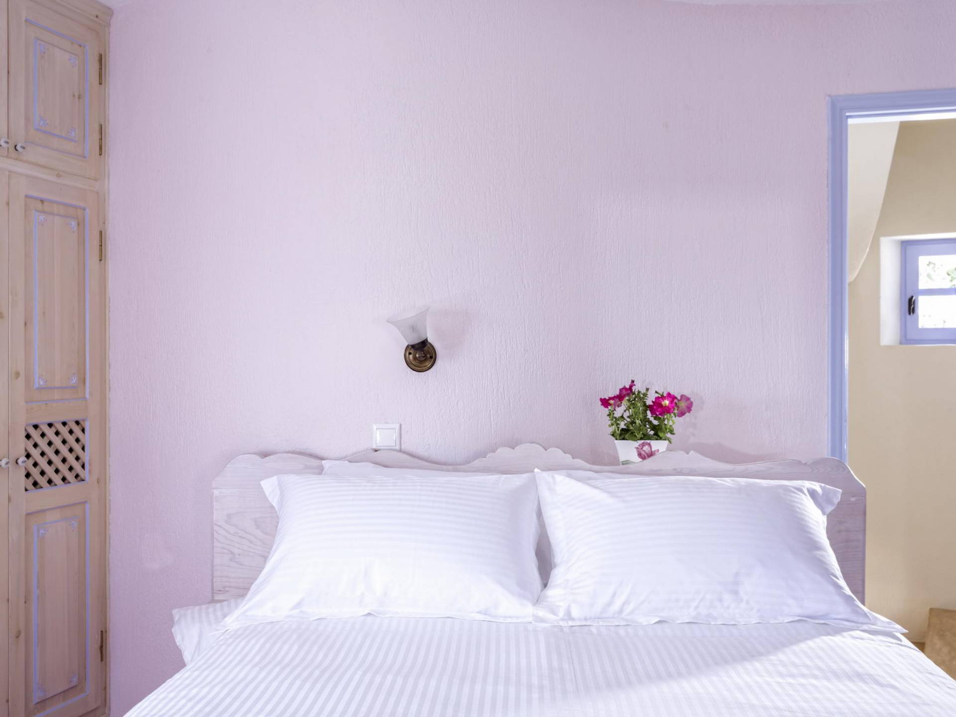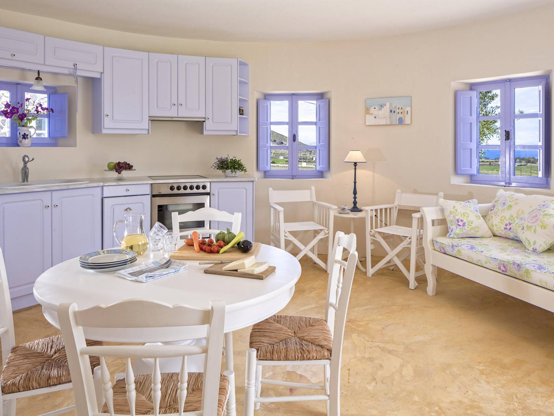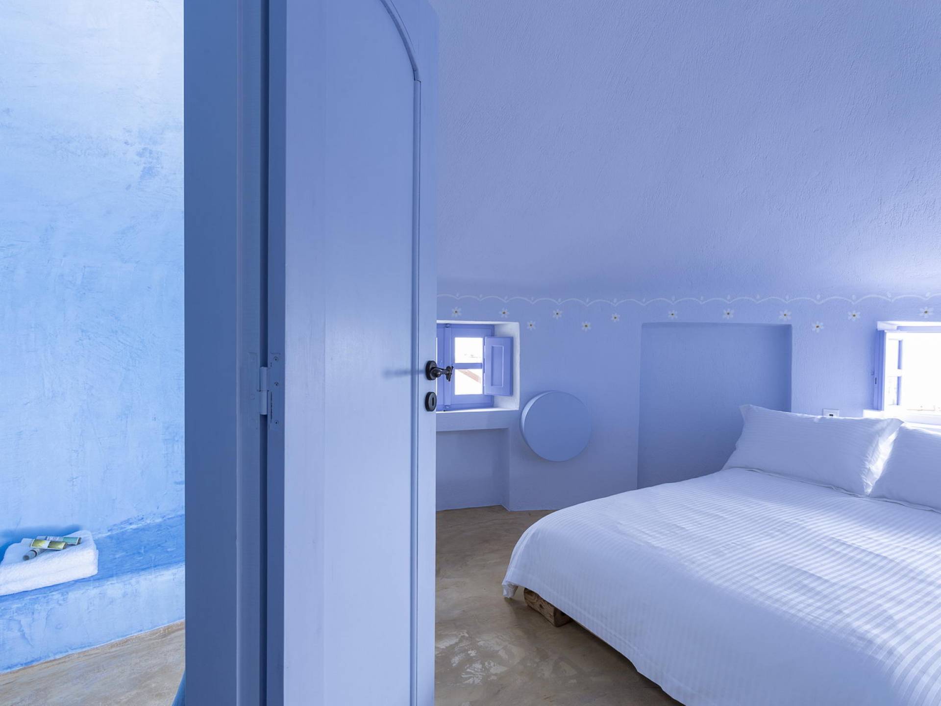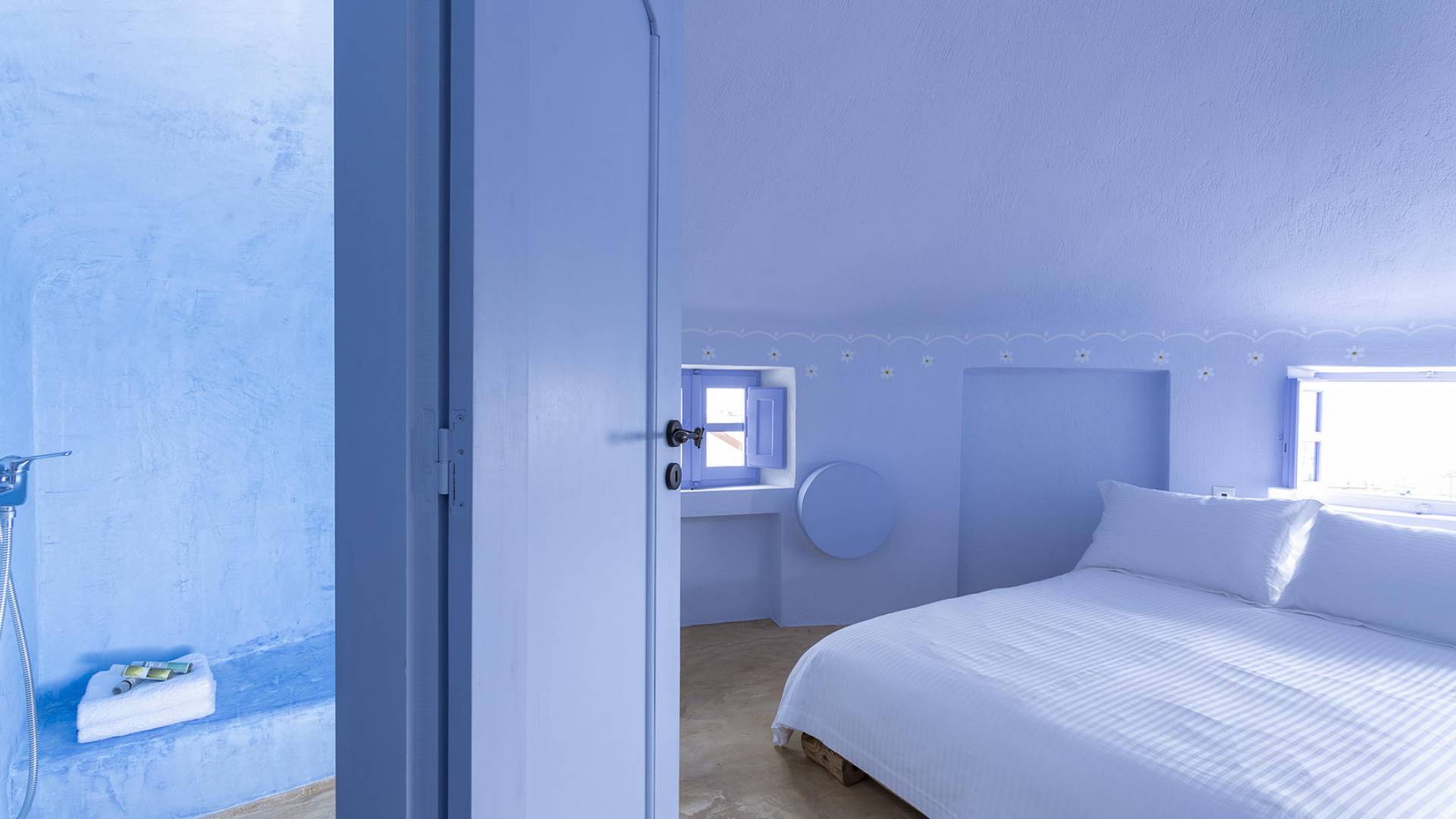 Первый этаж с небольшими светлыми окнами и панорамным видом на виноградники, море и бассейн состоит из гостиной, столовой и полностью оборудованной кухни. В спальне на втором этаже с романтической атмосферой есть встроенная двуспальная кровать и прекрасная ванная комната. Спальня на втором этаже представляет собой сказочную конусообразную комнату с ванной комнатой. В этом номере есть двуспальная кровать и односпальная кровать, которую можно использовать как диван.