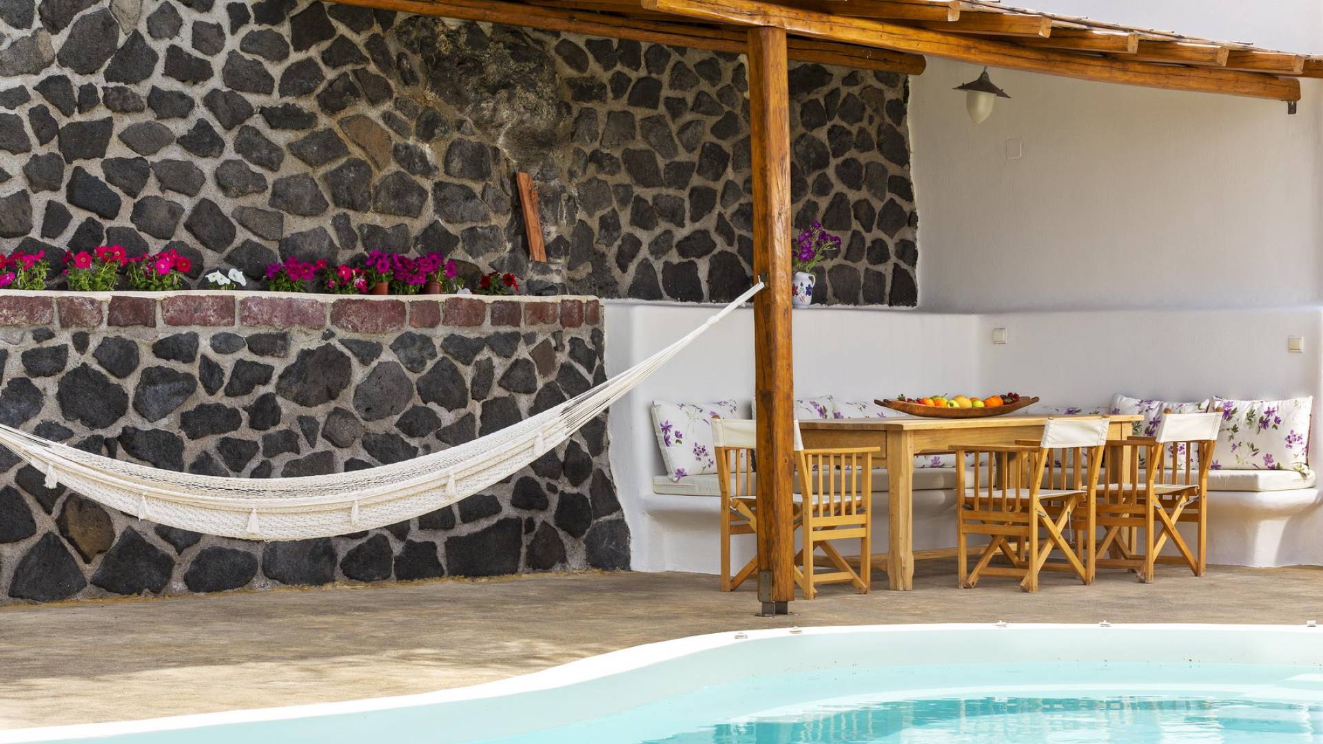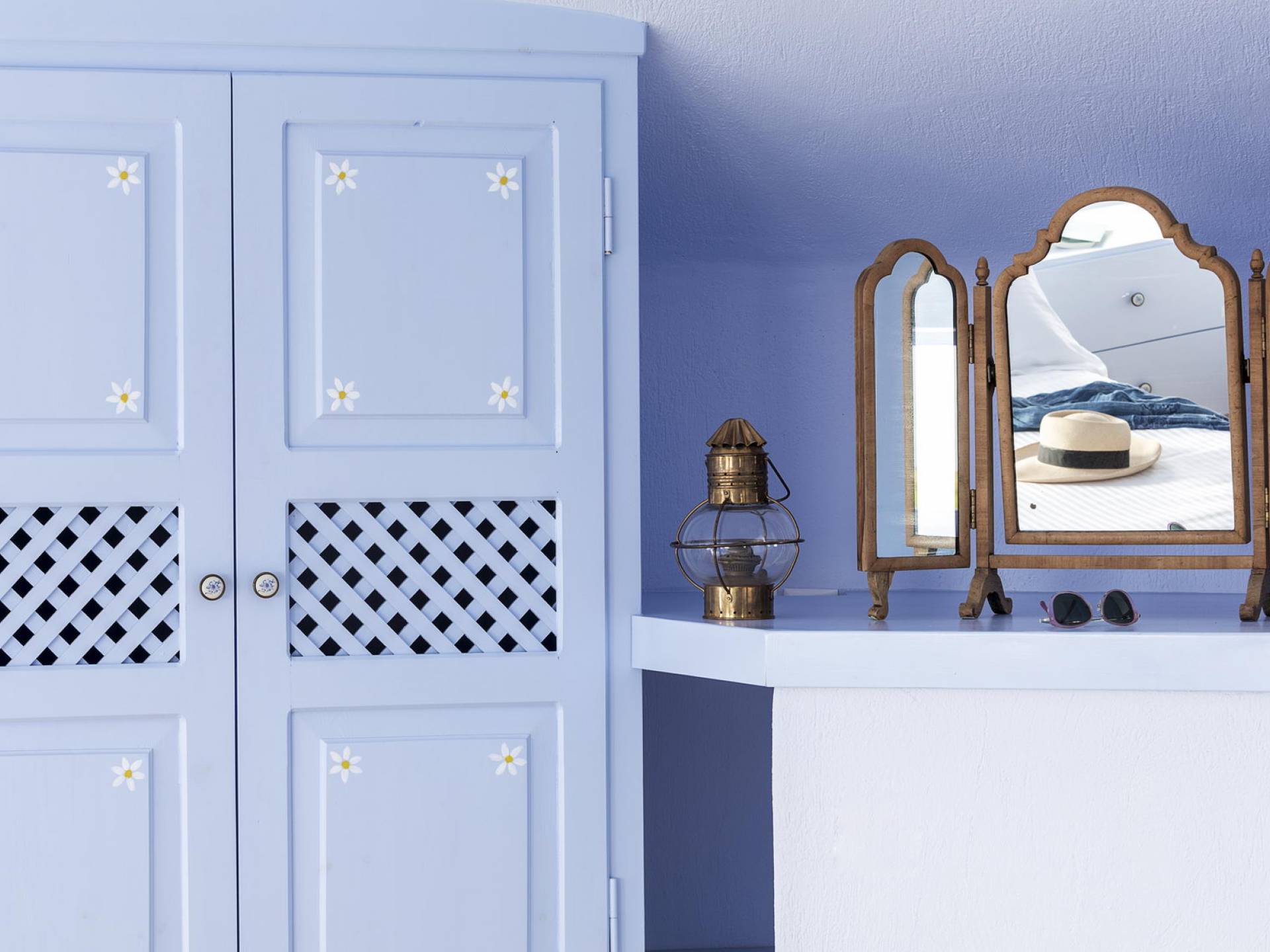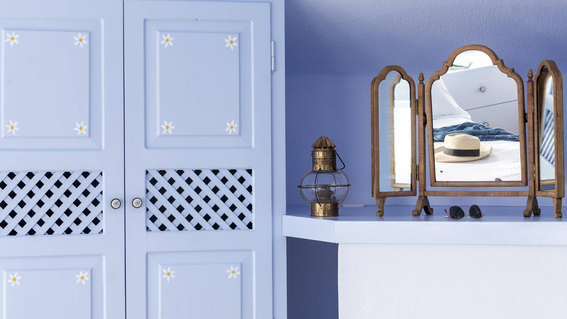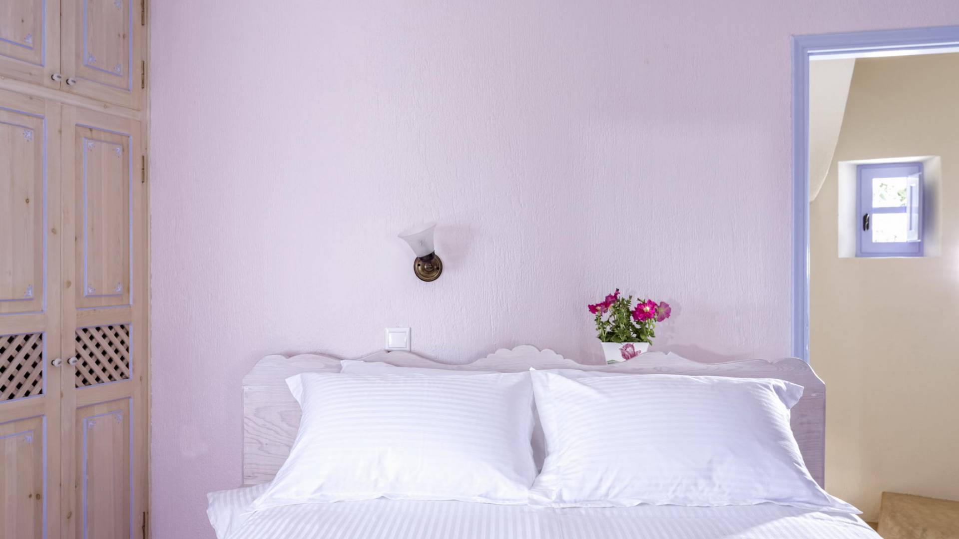 Первый этаж с небольшими светлыми окнами и панорамным видом на виноградники, море и бассейн состоит из гостиной, столовой и полностью оборудованной кухни. В спальне на втором этаже с романтической атмосферой есть встроенная двуспальная кровать и прекрасная ванная комната. Спальня на втором этаже представляет собой сказочную конусообразную комнату с ванной комнатой. В этом номере есть двуспальная кровать и односпальная кровать, которую можно использовать как диван.