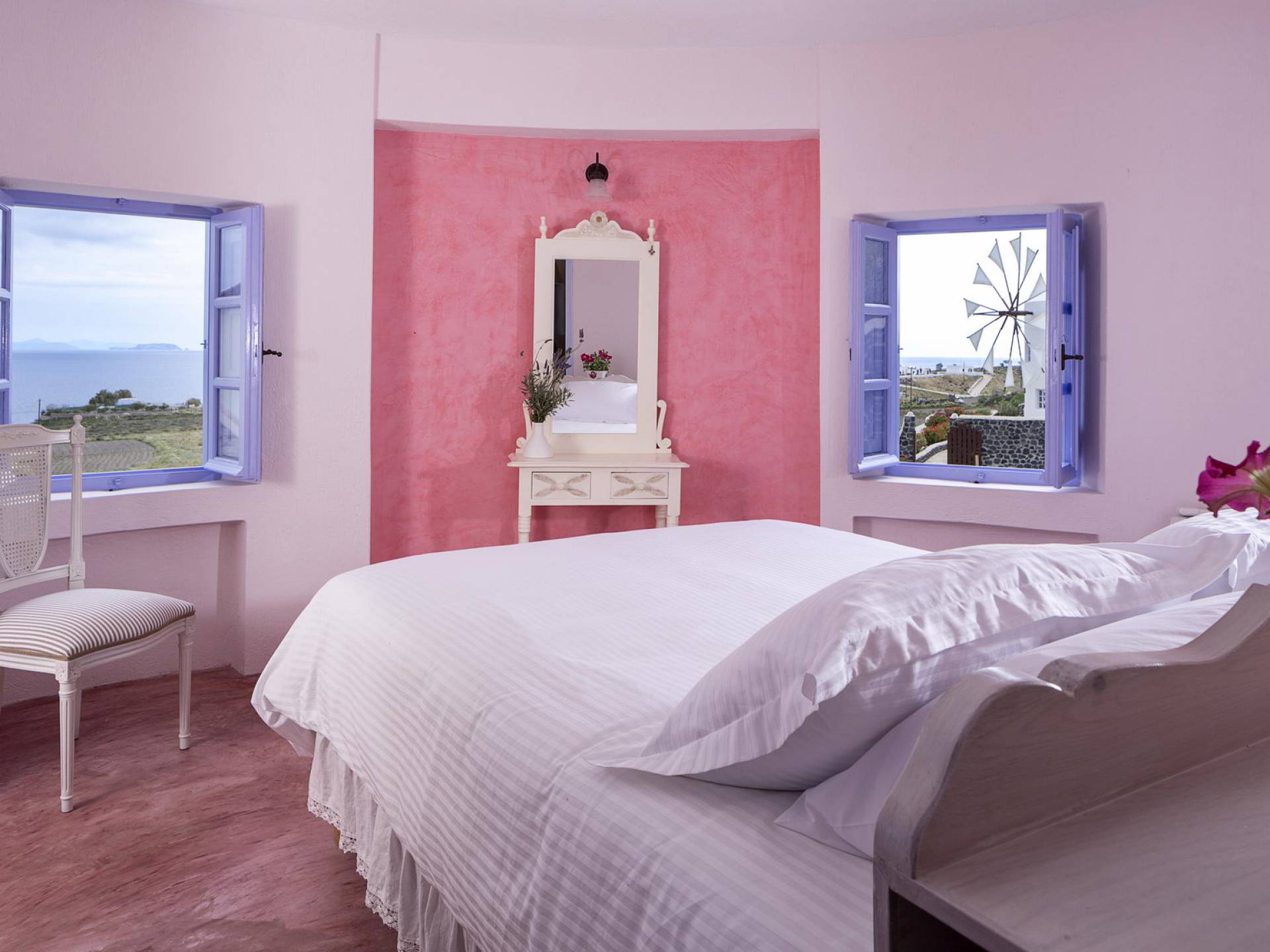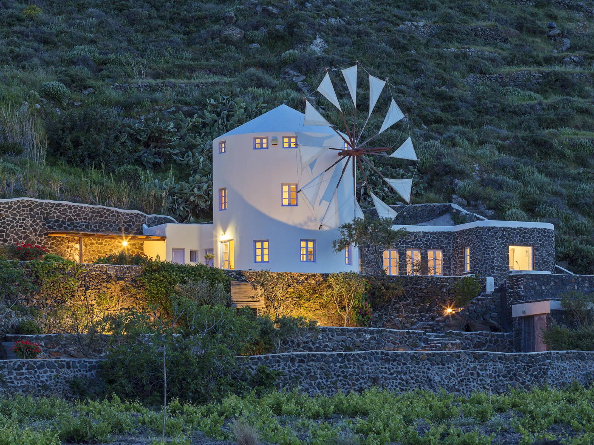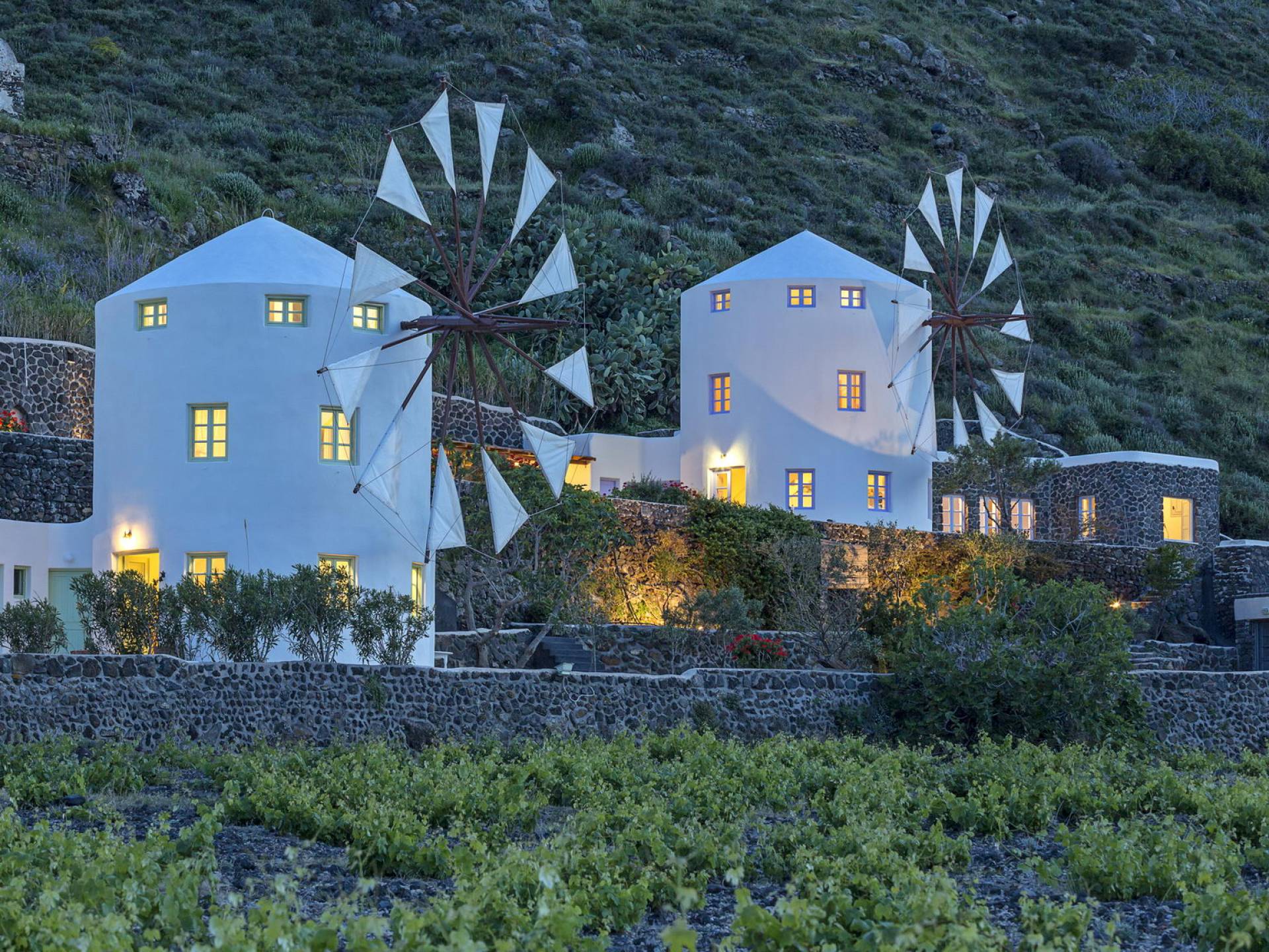 Santorini Windmill Villas - это комплекс из трех недавно построенных подобных роскошных ветряных мельниц, расположенный на прекрасном острове Санторини. Уникальное уединенное расположение вилл предлагает панорамный вид на Эгейское море и отражения восхода солнца на поверхности моря, которые видны даже из вашей кровати.