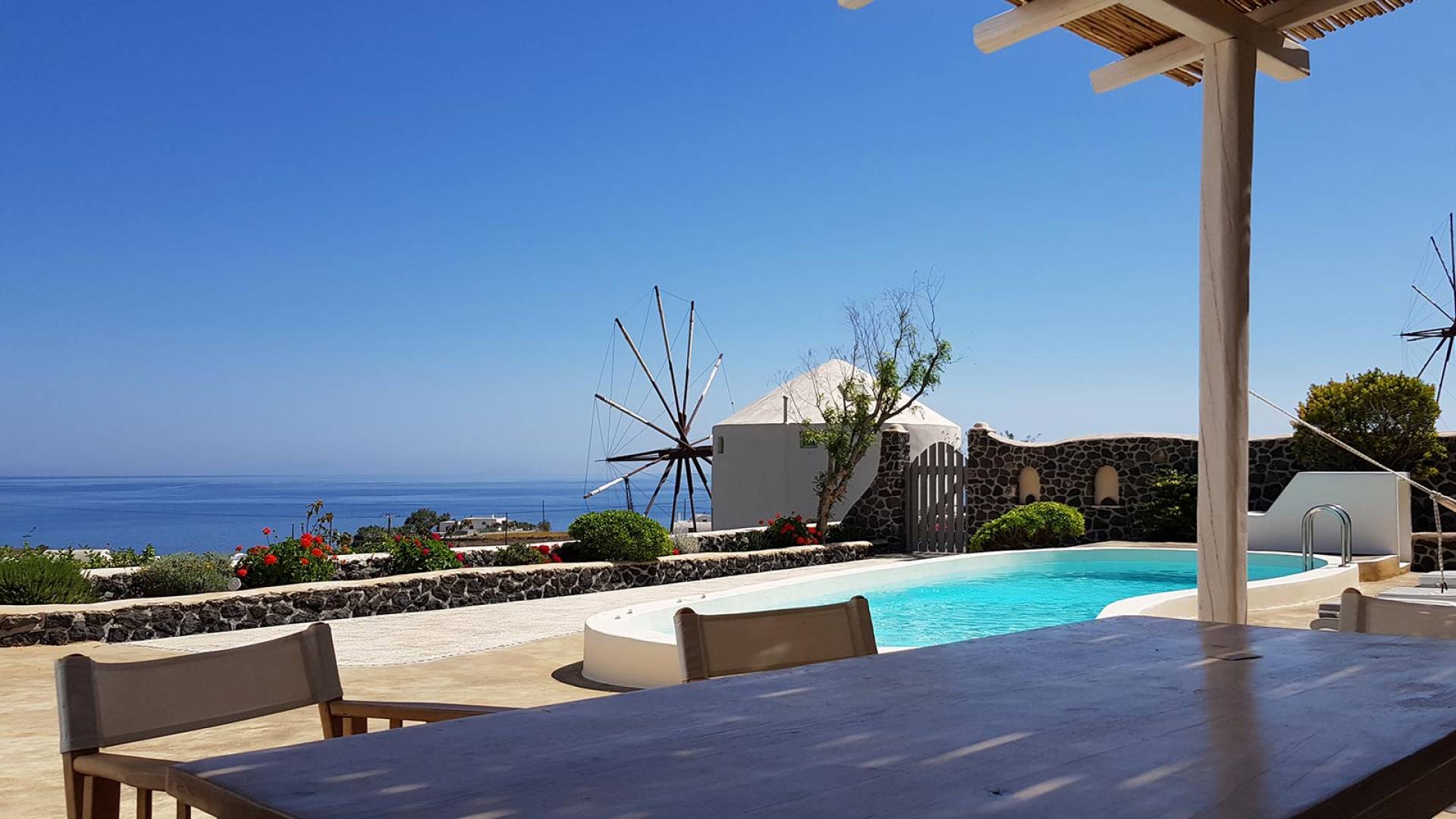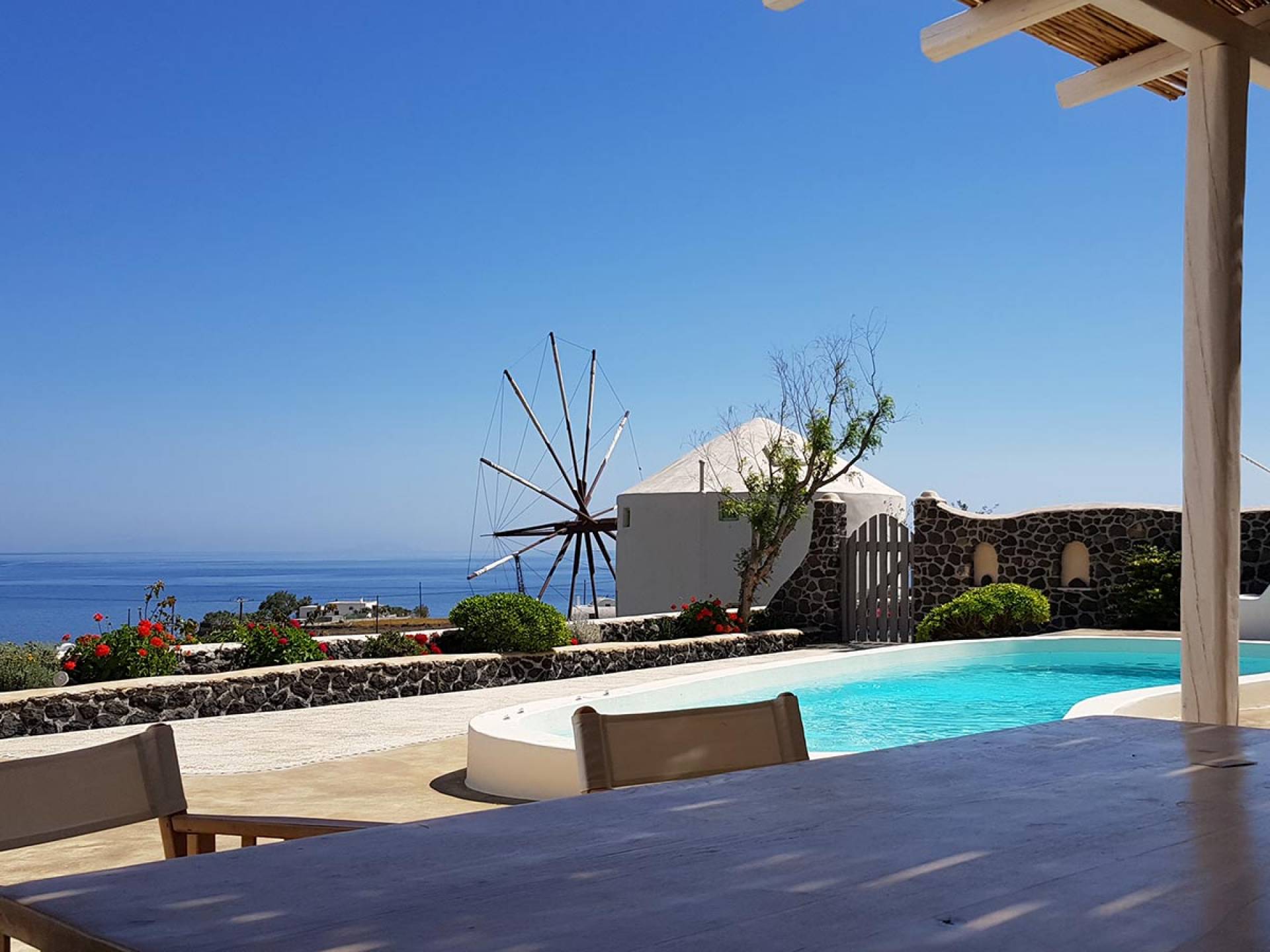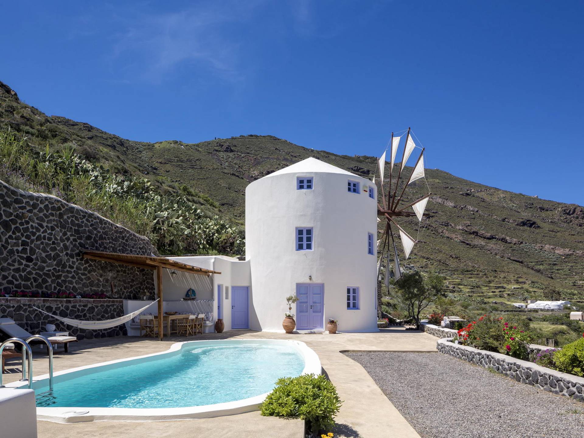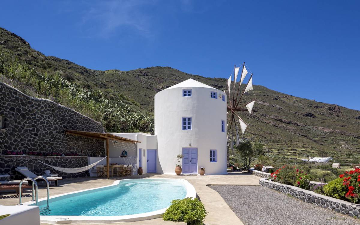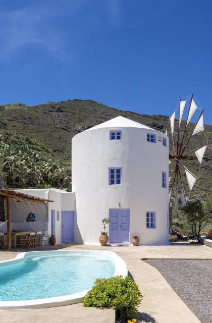 Каждая вилла Santorini Windmill полностью независима, оборудована собственным бассейном, джакузи, террасой, цветником, отдельным входом и местом для парковки. Он может вместить до 5 человек и является идеальным курортом для молодоженов, семейных пар, а также совершенно безопасным для семей с детьми.