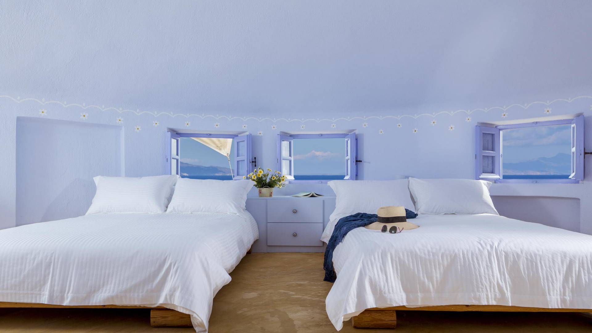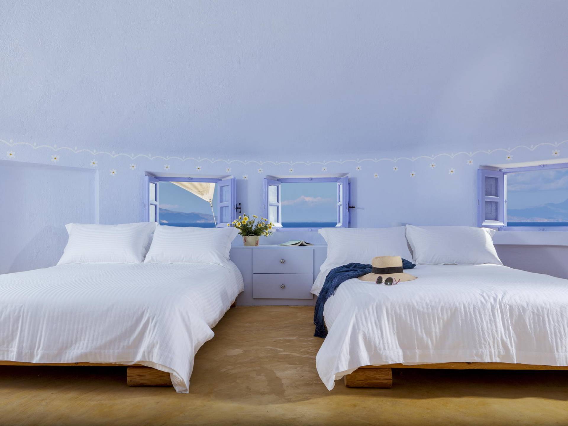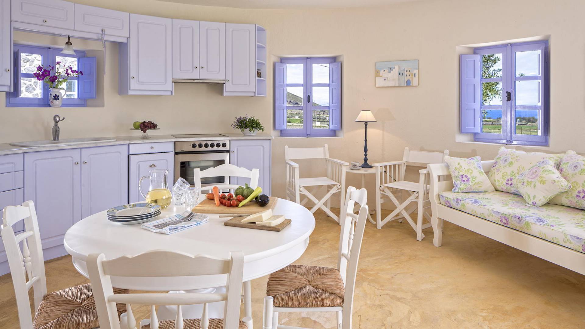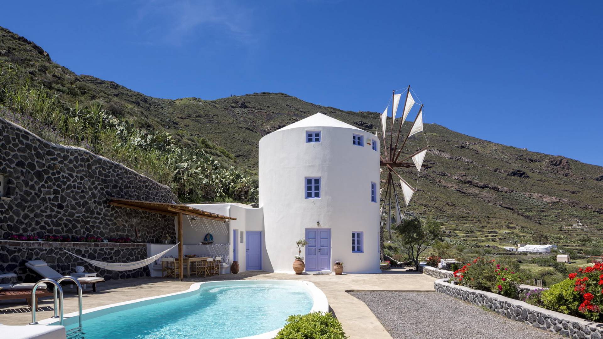 Каждая вилла Santorini Windmill полностью независима, оборудована собственным бассейном, джакузи, террасой, цветником, отдельным входом и местом для парковки. Он может вместить до 5 человек и является идеальным курортом для молодоженов, семейных пар, а также совершенно безопасным для семей с детьми.