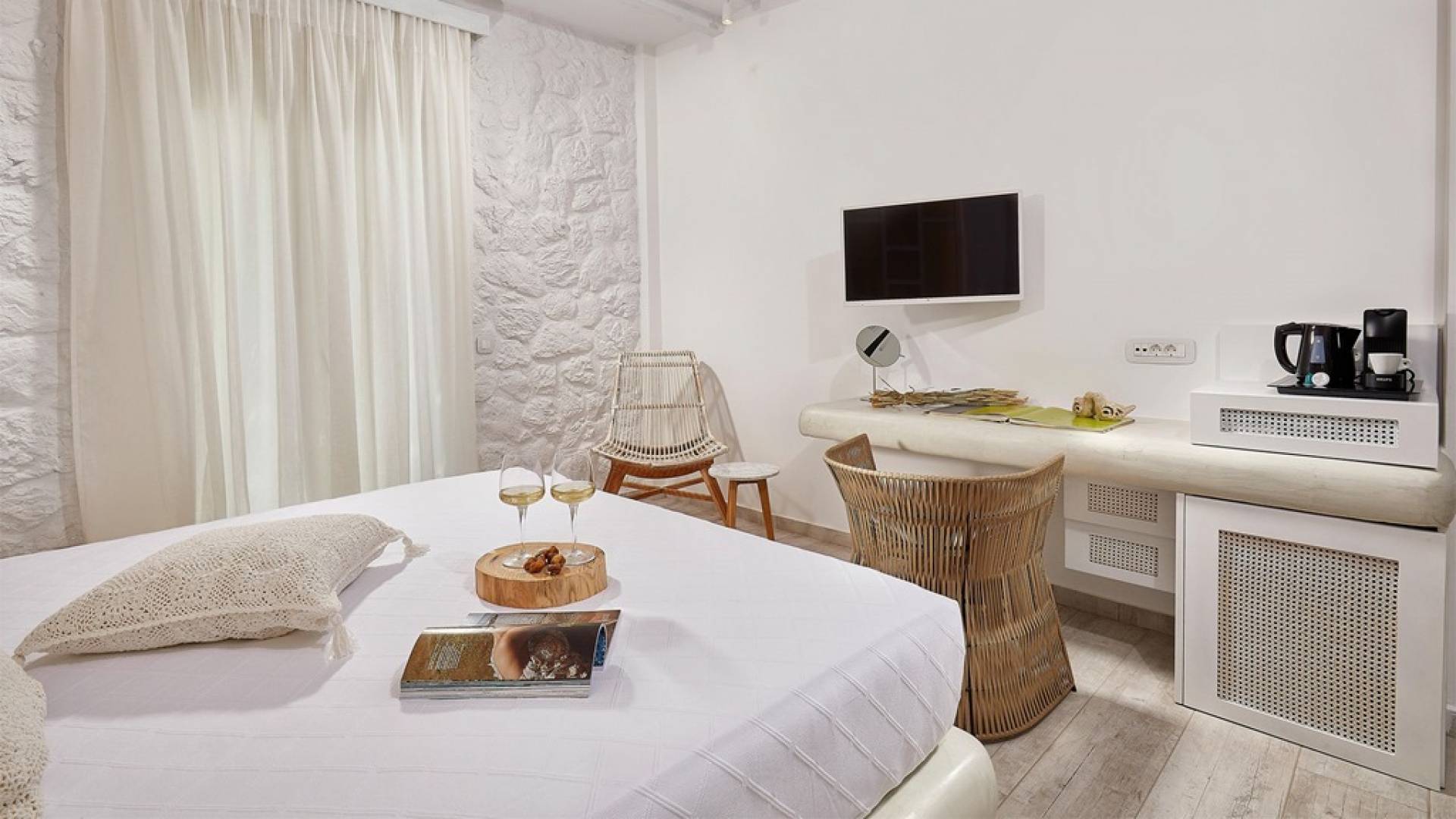Premium Suite в Petri Suites Santorini - это роскошный люкс с 1 спальней и видом на море в аренду. Премиум люкс с видом на море в Petri Suites вызовет у вас энтузиазм! С балкона открывается волшебный вид на море. Он станет вашим любимым местом для отдыха, особенно во время заката, когда небо украшено множеством цветов, а море отражает великолепие уходящего солнца.