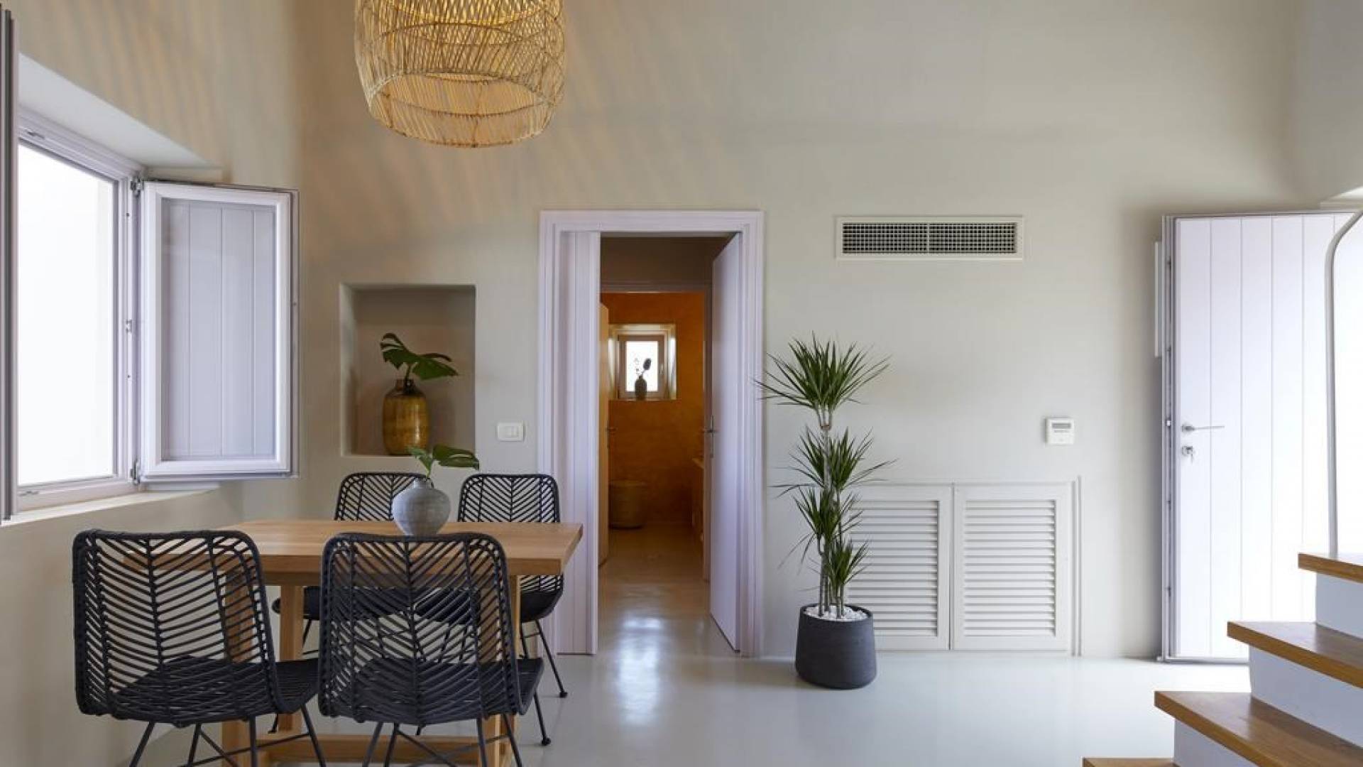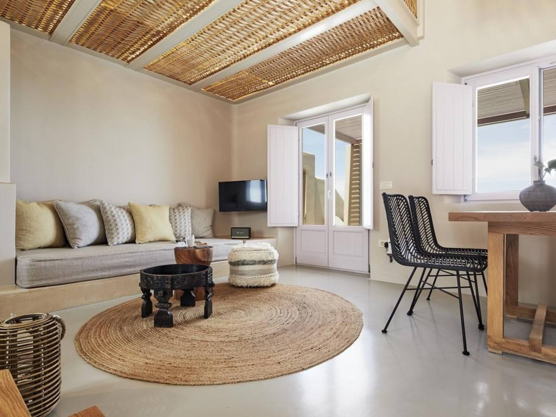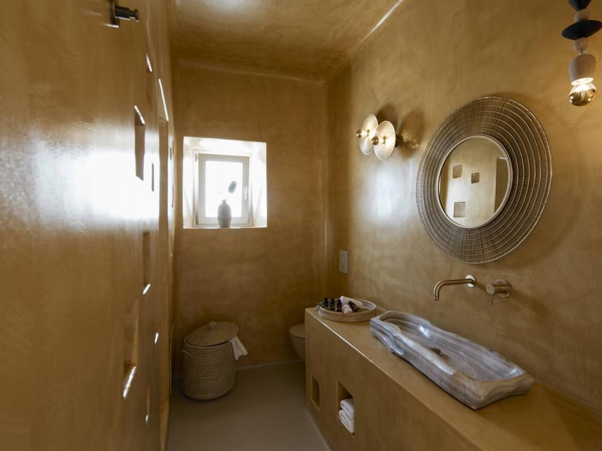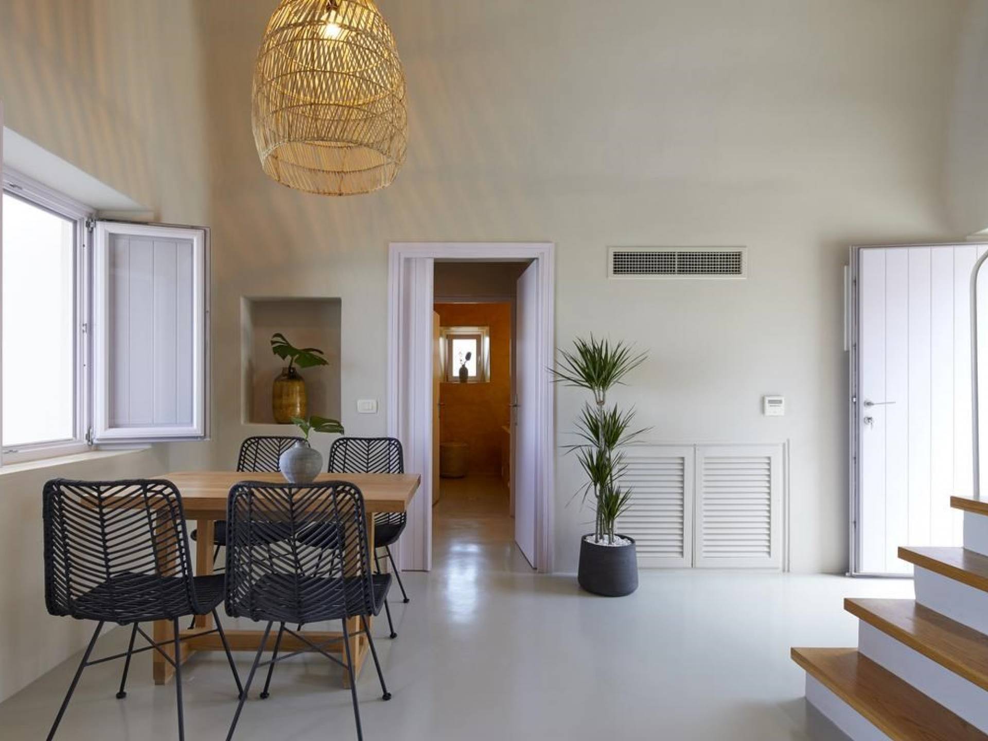 Северные виллы спроектированы почти одинаково, с той же неотразимой атмосферой, но каждая со своим неповторимым характером; разные цветовые палитры, разные концепции и, конечно же, уникальные шедевры местных и зарубежных художников, каждый со своим особенным вкусом, интегрированный в декор и повседневные функции вилл. Это истинное воплощение санторинианского жилья, возвышенное новое предложение жизни в элегантной простоте, погруженное в сенсационное путешествие движения, формы и цвета; погружен в искусство.