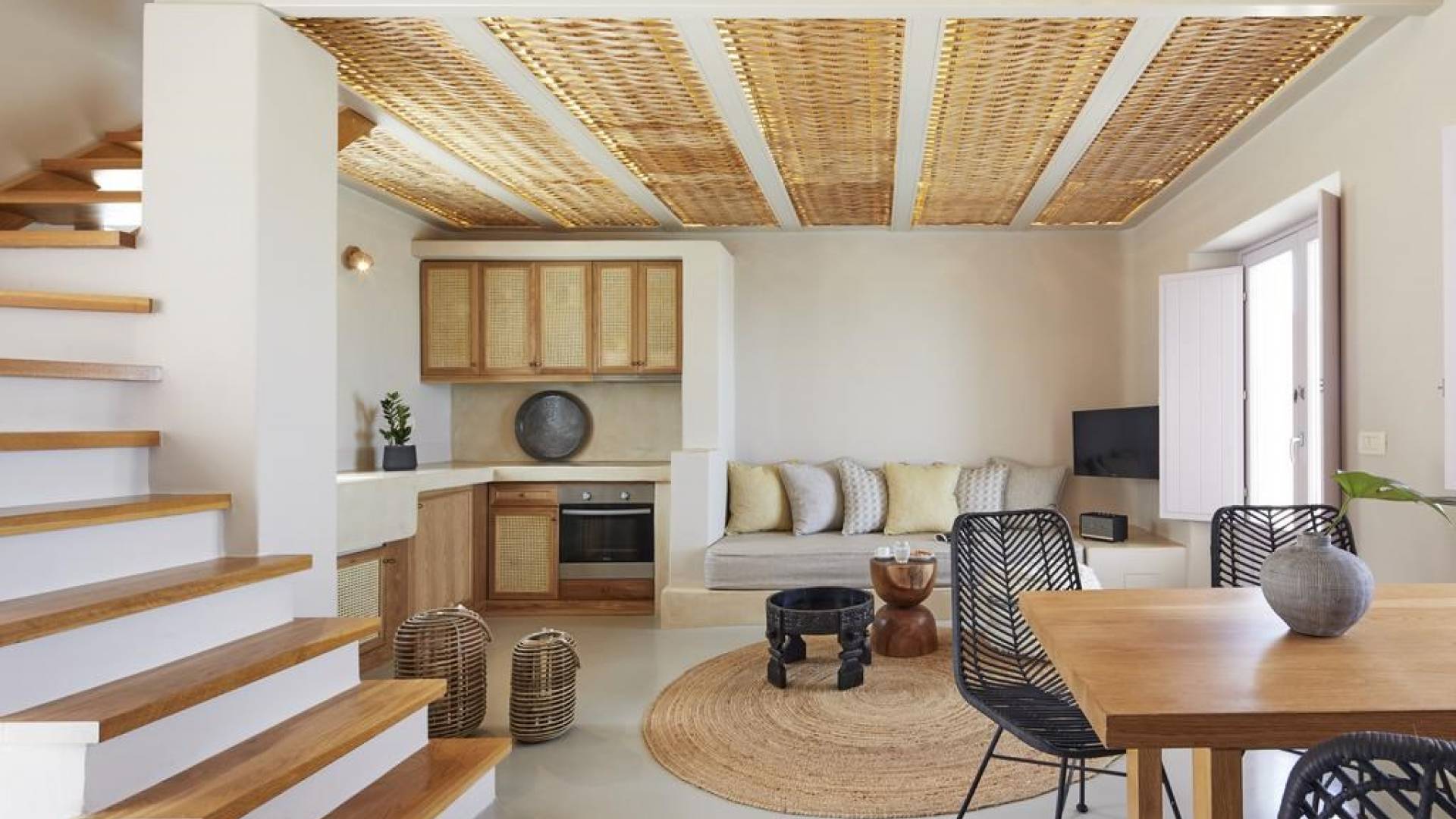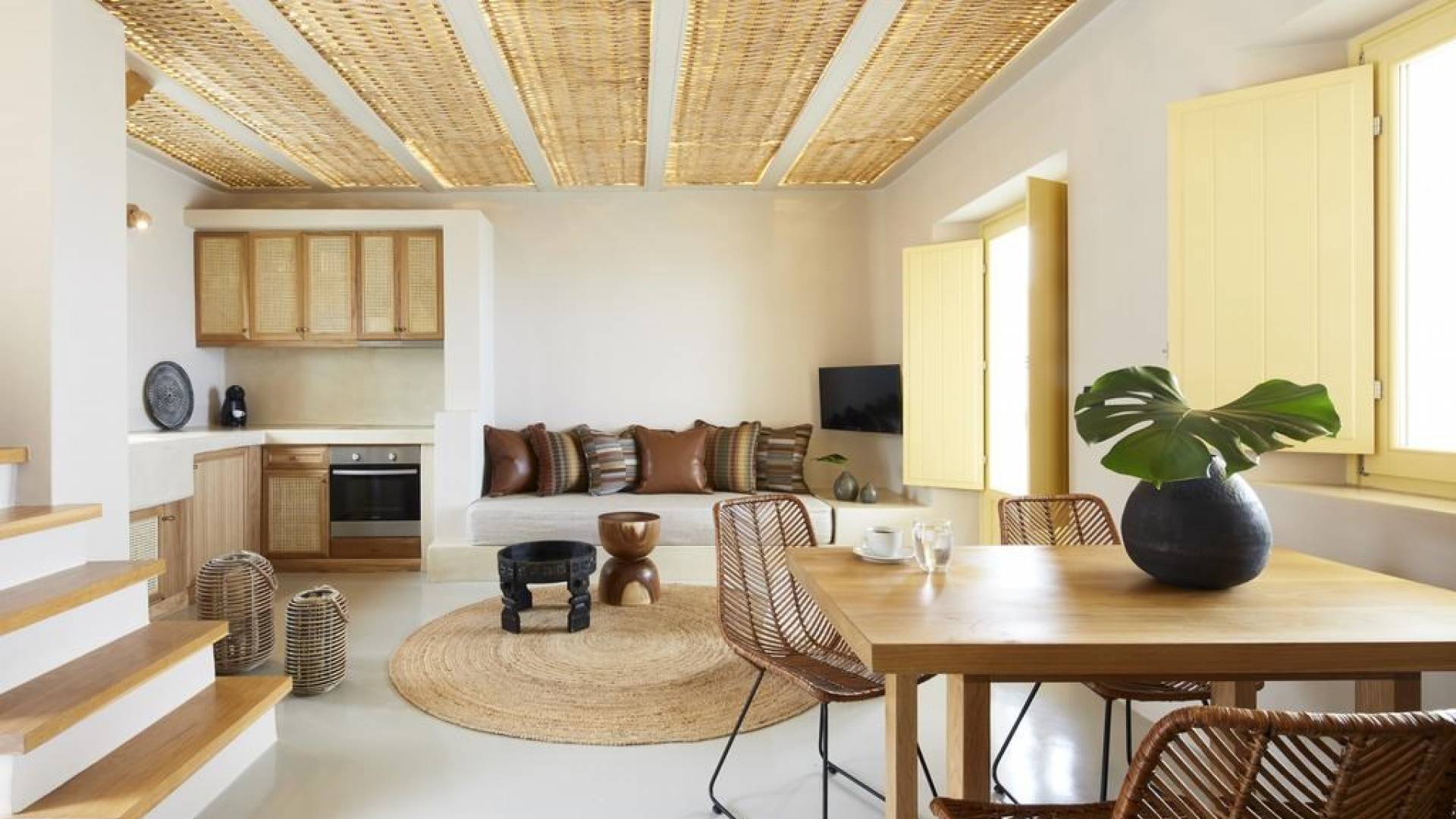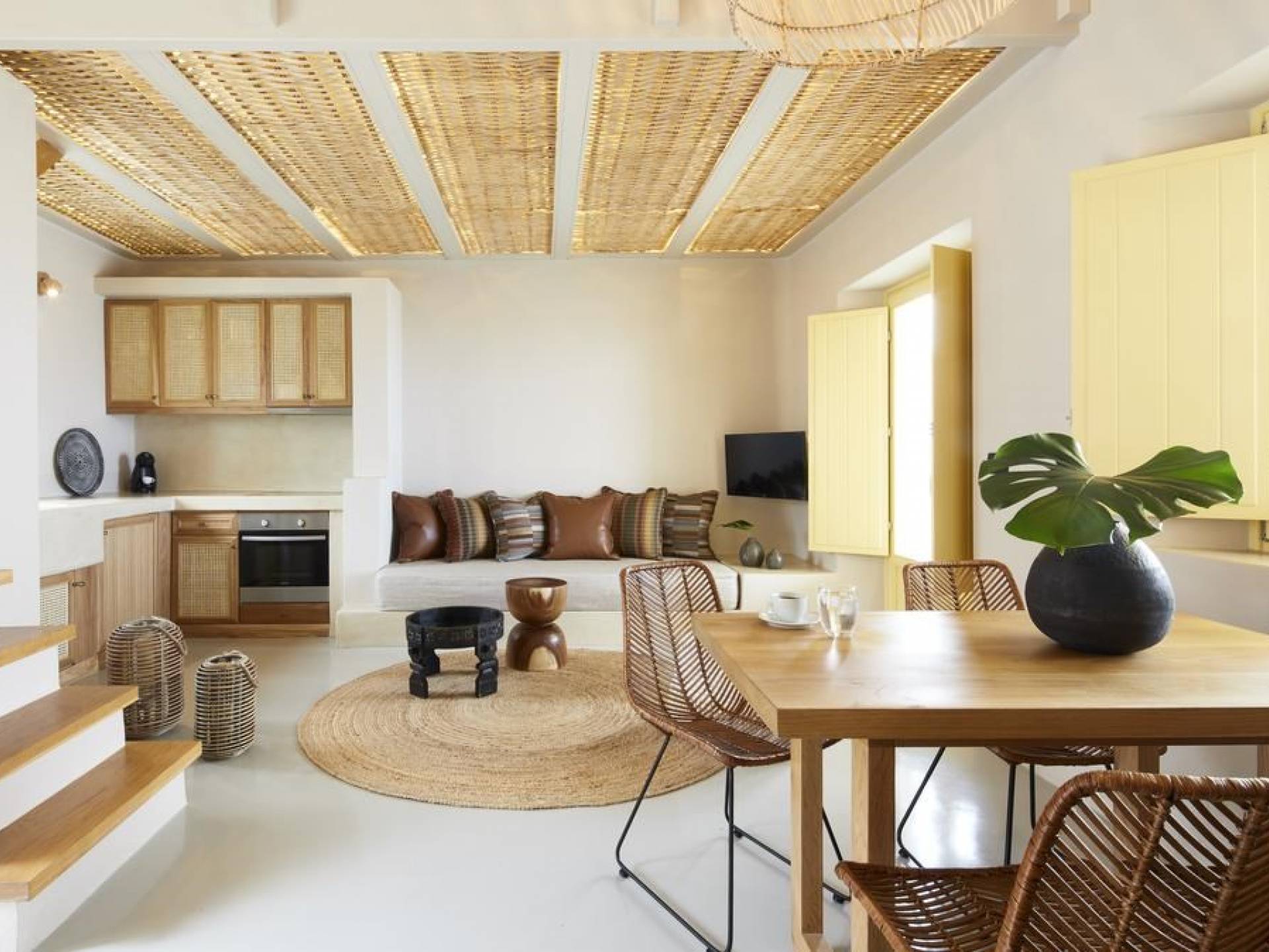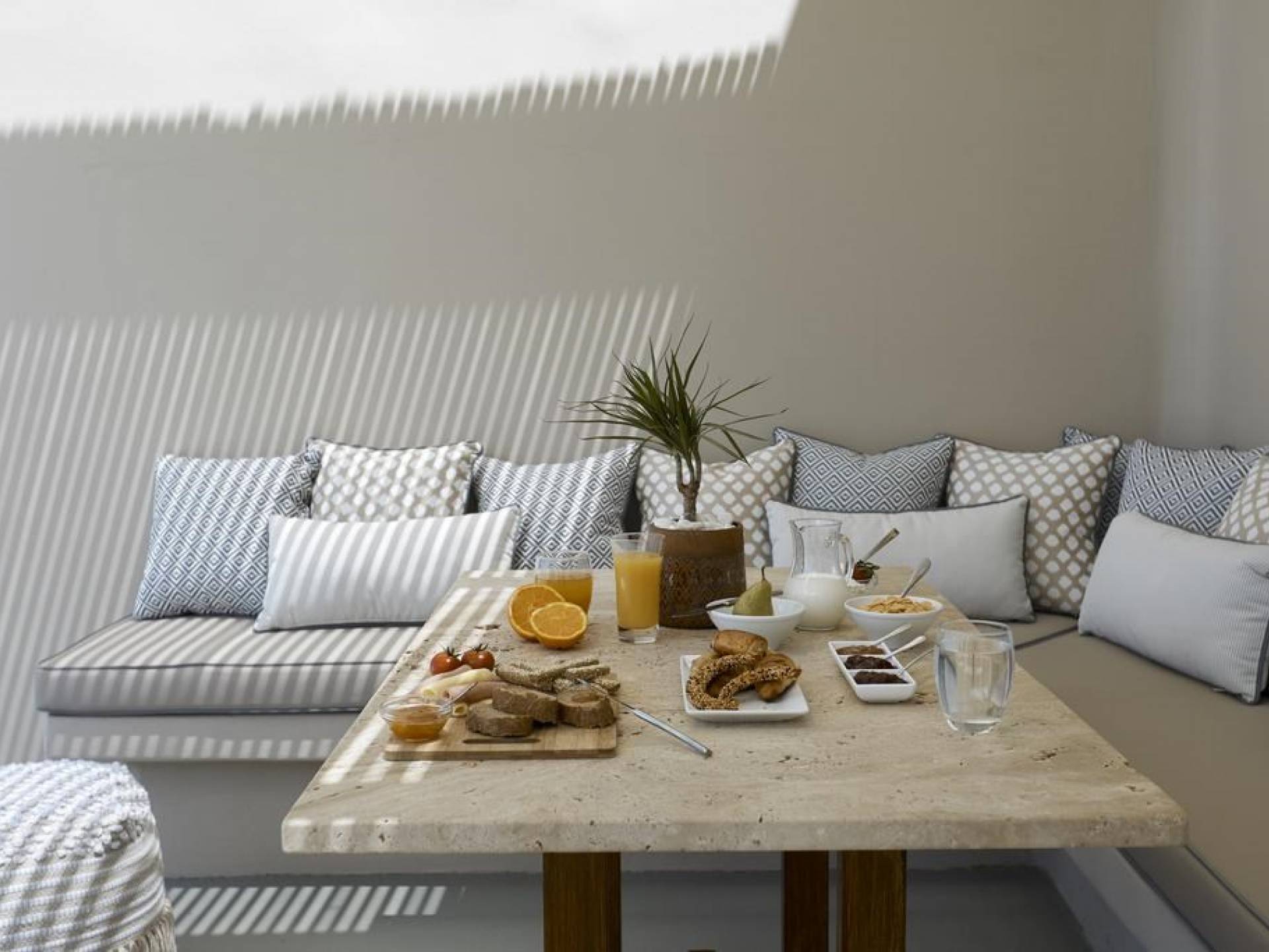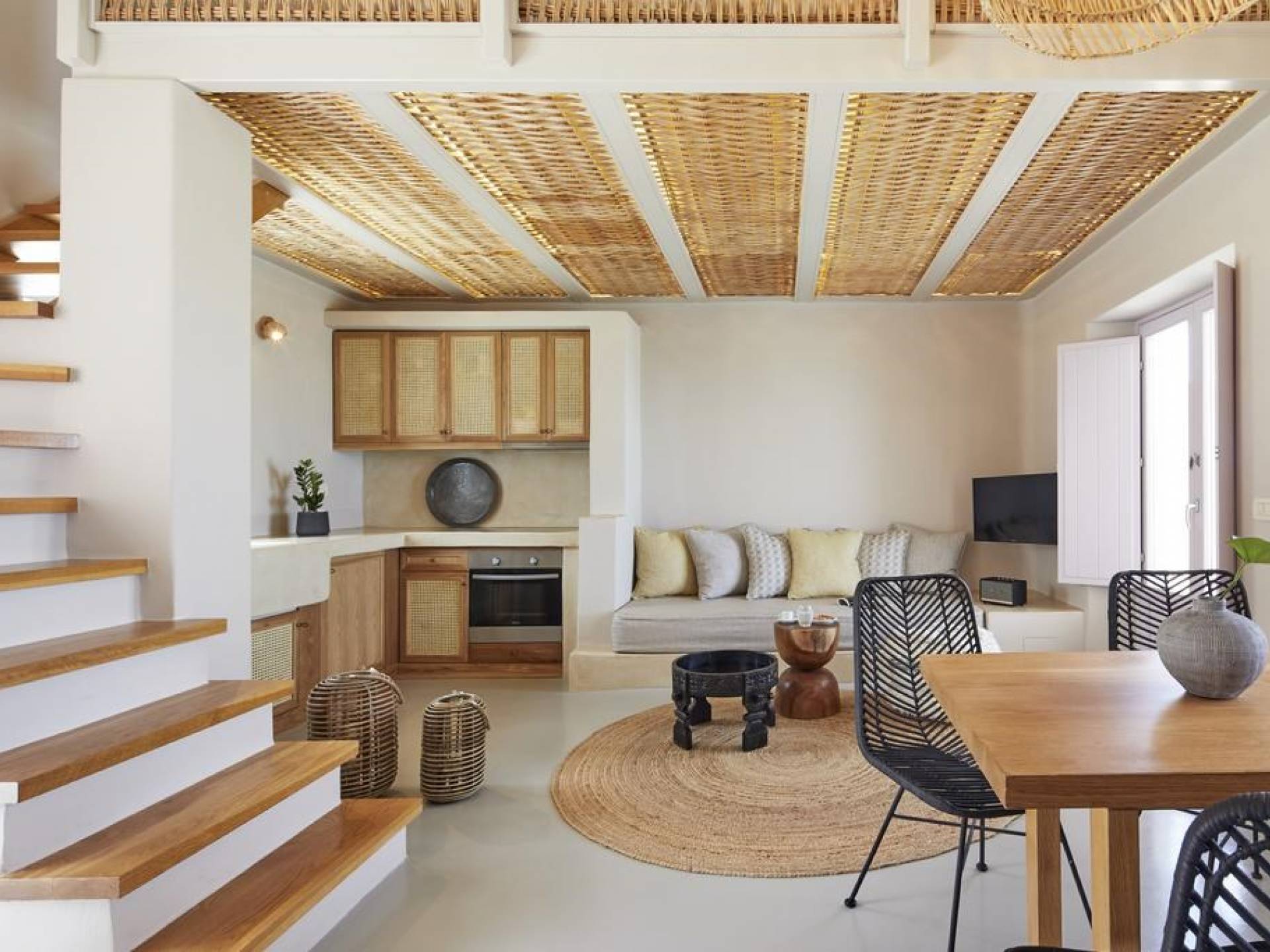 Северные виллы спроектированы почти одинаково, с той же неотразимой атмосферой, но каждая со своим неповторимым характером; разные цветовые палитры, разные концепции и, конечно же, уникальные шедевры местных и зарубежных художников, каждый со своим особенным вкусом, интегрированный в декор и повседневные функции вилл. Это истинное воплощение санторинианского жилья, возвышенное новое предложение жизни в элегантной простоте, погруженное в сенсационное путешествие движения, формы и цвета; погружен в искусство.