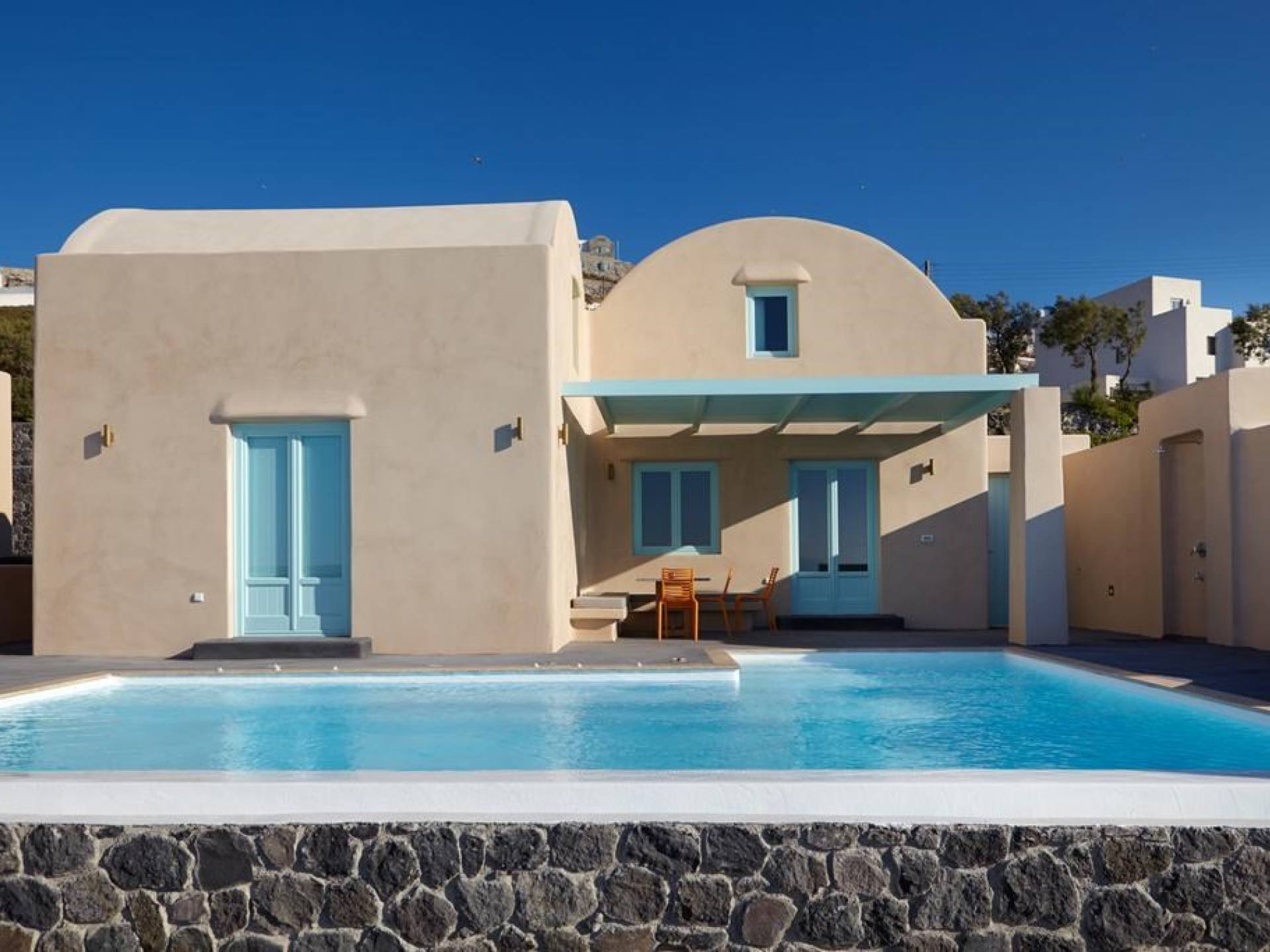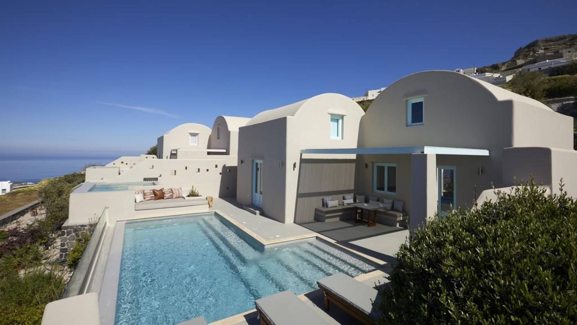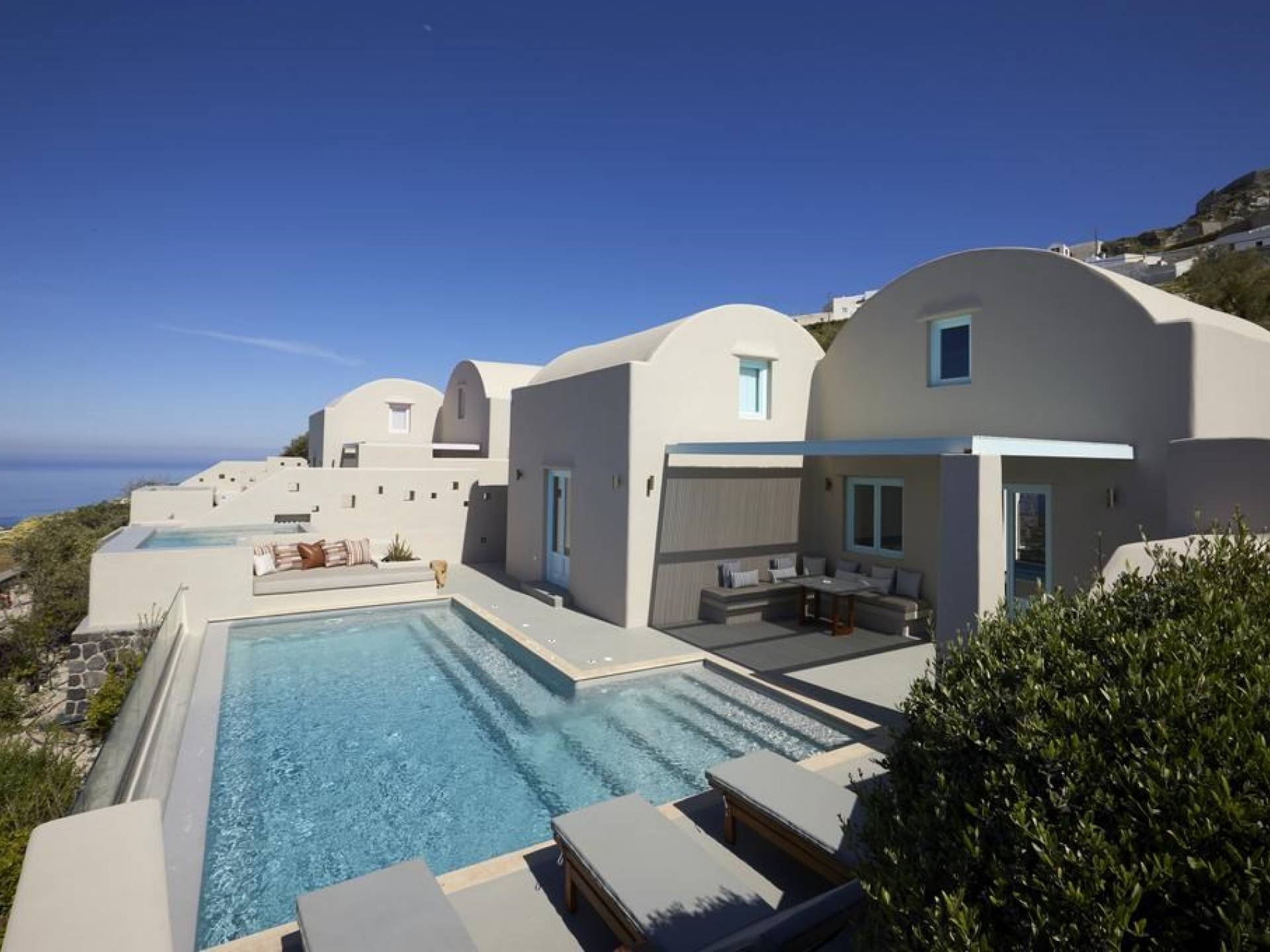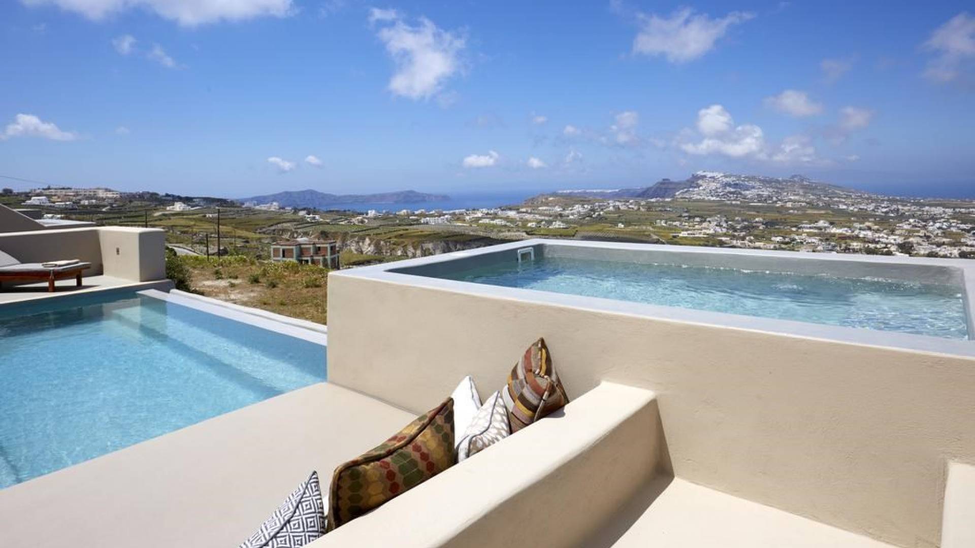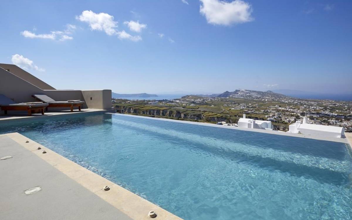 Мягкие цвета, такие как лазурный, светло-фиолетовый и изумрудный, виллы, обеспечивающие комфортное пребывание для 6 человек, с собственными верандами с бассейнами и художественными элементами, сделают ваше пребывание на виллах представительского класса незабываемым! Почувствуйте отголоски веков, исследуйте художественную сцену Санторини и погрузитесь в освежающее спокойствие эксклюзивных вилл. В изысканном помещении и на очаровательной открытой территории вашей виллы вы проведете бесконечные часы отдыха и ценных моментов со своими близкими, создавая длительные и сильные воспоминания в одном из самых великолепных мест в мире, на захватывающем дух Санторини!