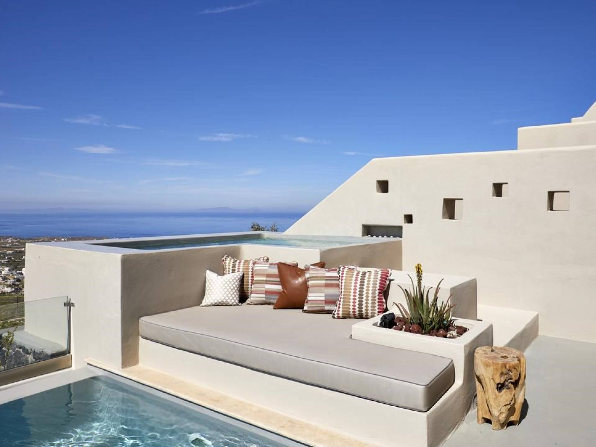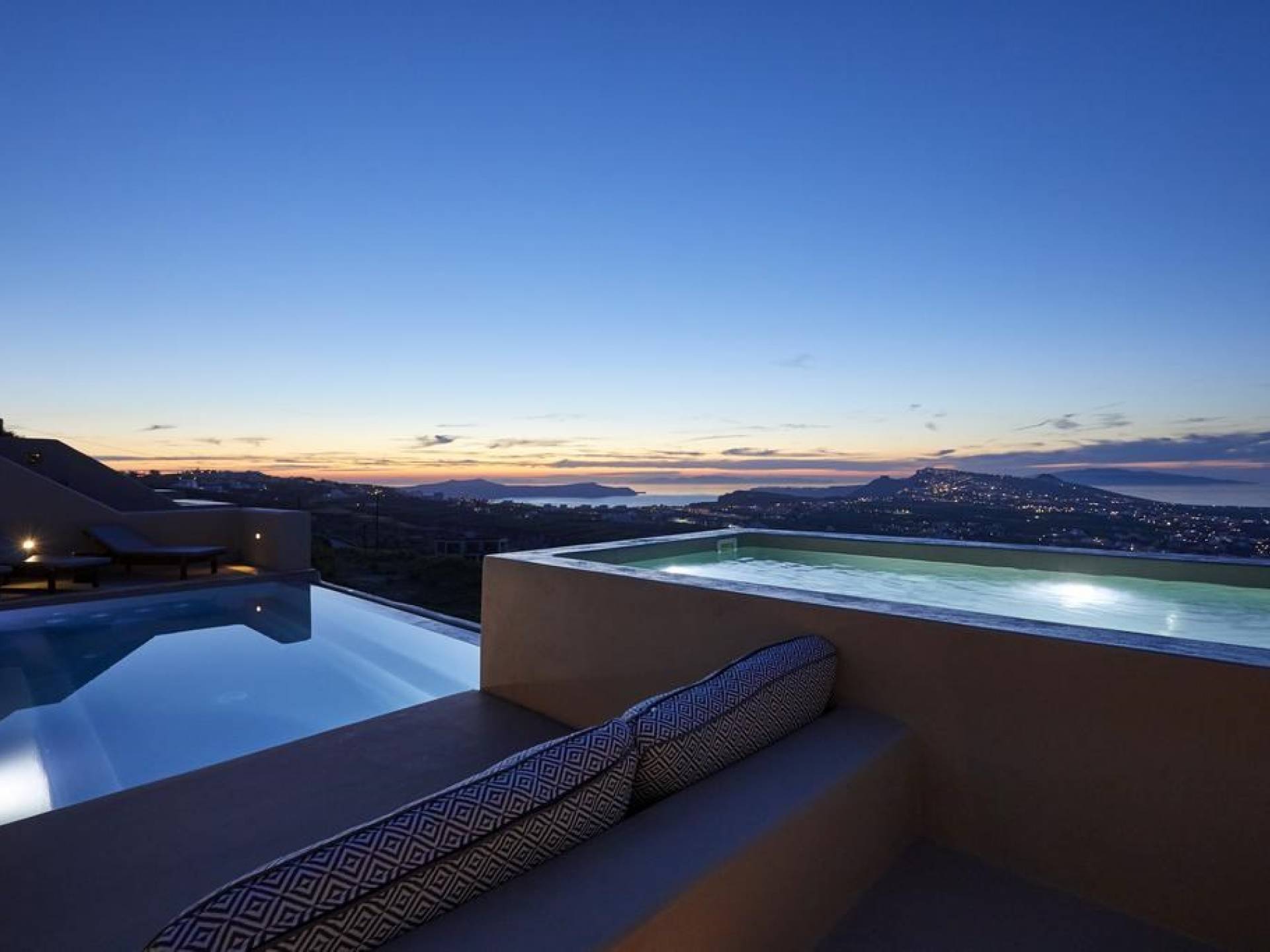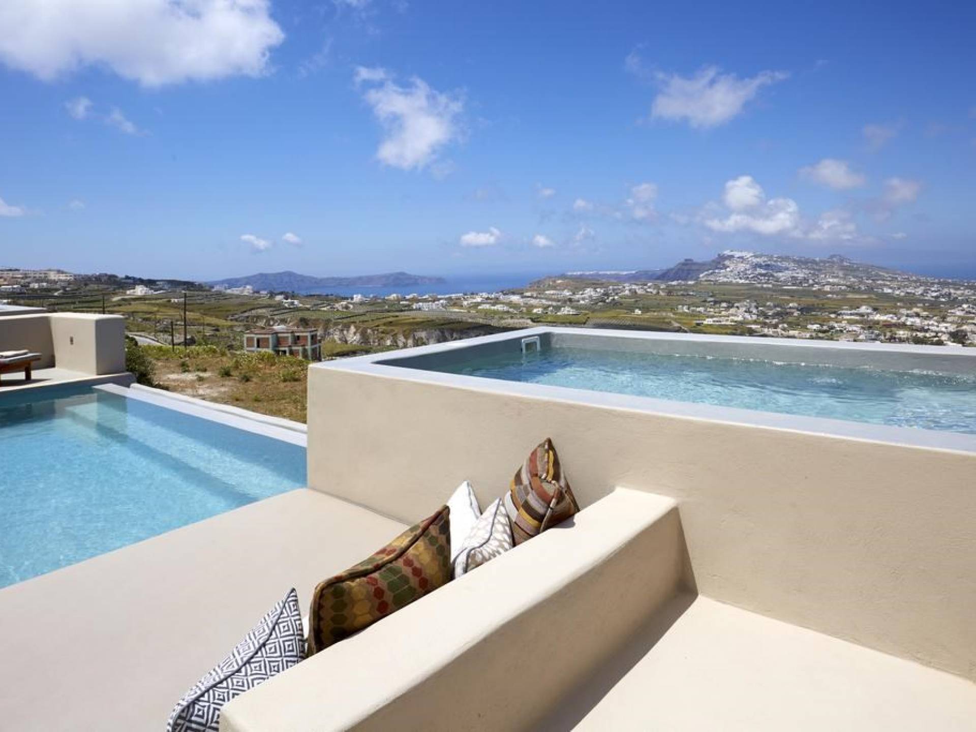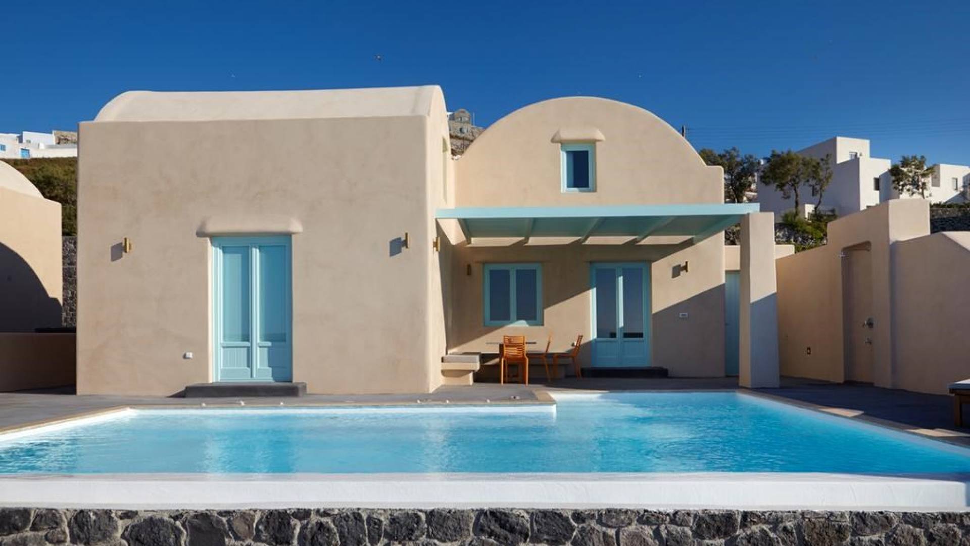 Мягкие цвета, такие как лазурный, светло-фиолетовый и изумрудный, виллы, обеспечивающие комфортное пребывание для 6 человек, с собственными верандами с бассейнами и художественными элементами, сделают ваше пребывание на виллах представительского класса незабываемым! Почувствуйте отголоски веков, исследуйте художественную сцену Санторини и погрузитесь в освежающее спокойствие эксклюзивных вилл. В изысканном помещении и на очаровательной открытой территории вашей виллы вы проведете бесконечные часы отдыха и ценных моментов со своими близкими, создавая длительные и сильные воспоминания в одном из самых великолепных мест в мире, на захватывающем дух Санторини!