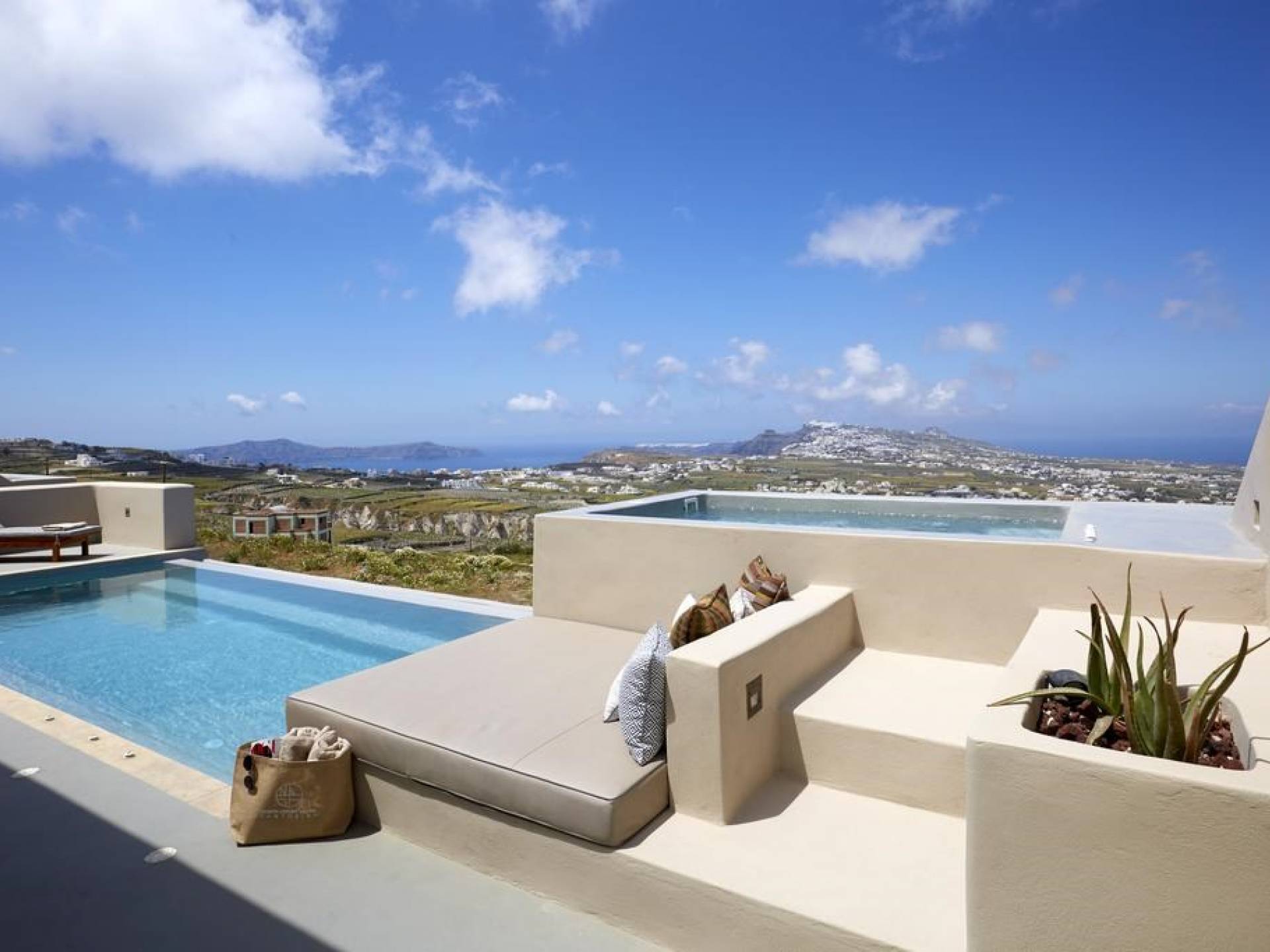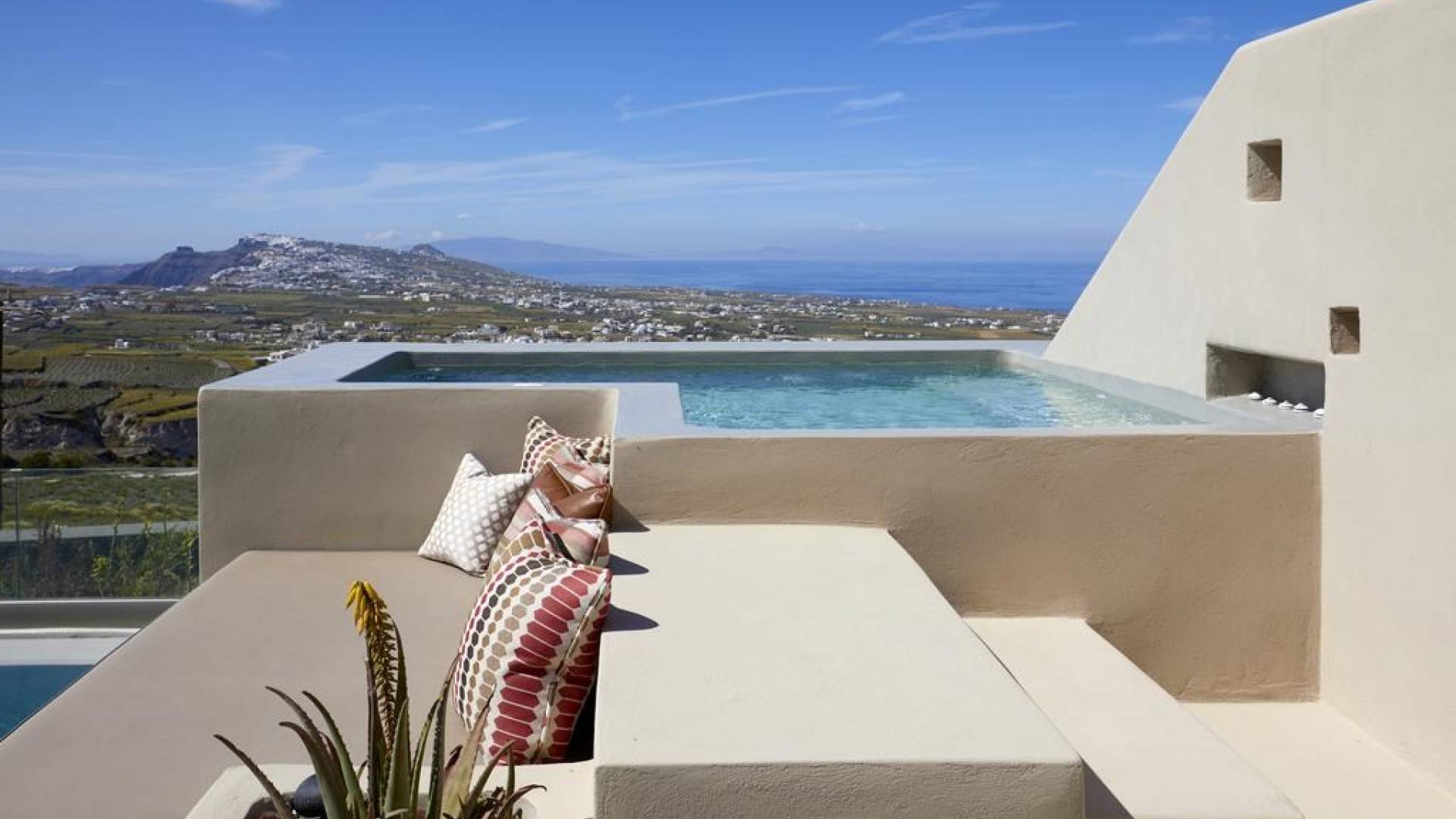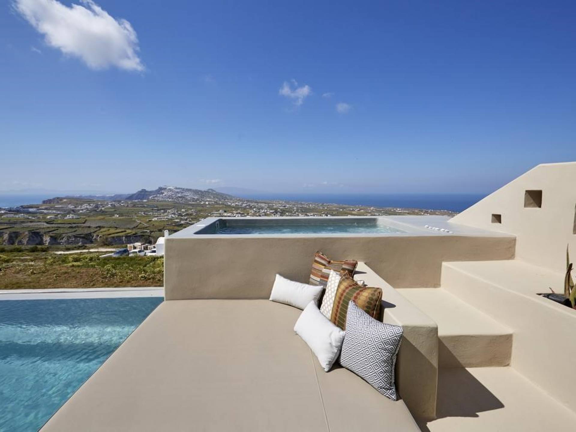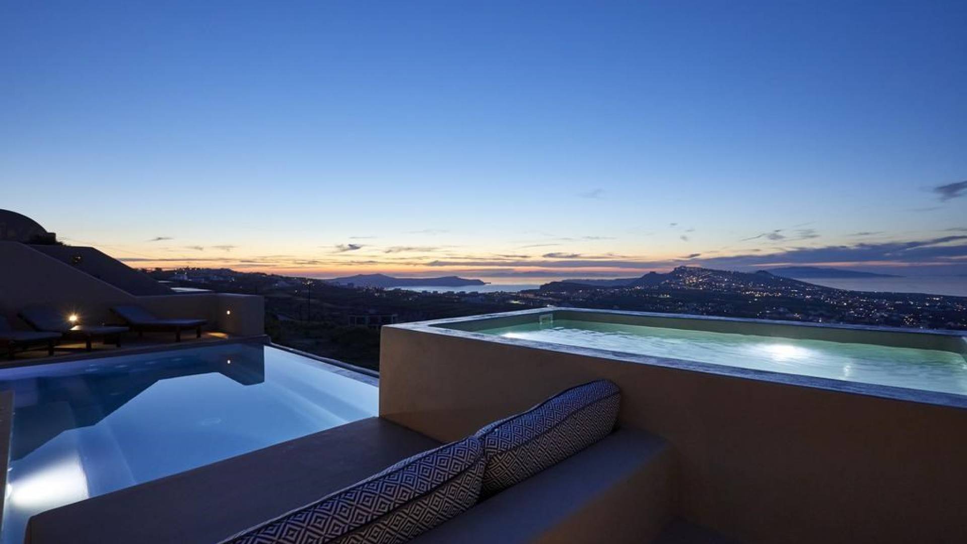 Мягкие цвета, такие как лазурный, светло-фиолетовый и изумрудный, виллы, обеспечивающие комфортное пребывание для 6 человек, с собственными верандами с бассейнами и художественными элементами, сделают ваше пребывание на виллах представительского класса незабываемым! Почувствуйте отголоски веков, исследуйте художественную сцену Санторини и погрузитесь в освежающее спокойствие эксклюзивных вилл. В изысканном помещении и на очаровательной открытой территории вашей виллы вы проведете бесконечные часы отдыха и ценных моментов со своими близкими, создавая длительные и сильные воспоминания в одном из самых великолепных мест в мире, на захватывающем дух Санторини!