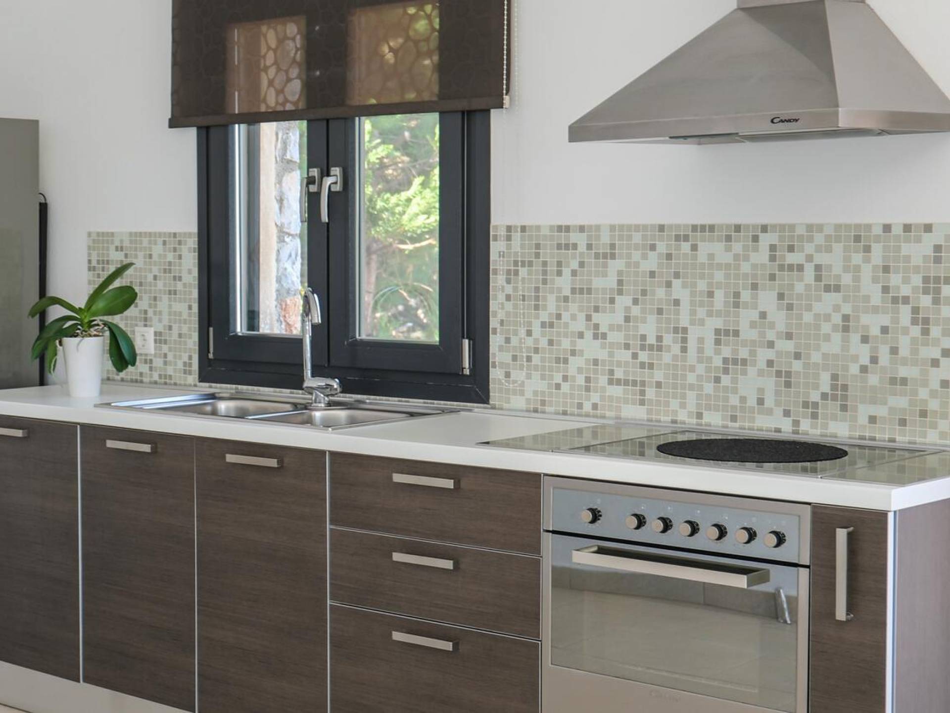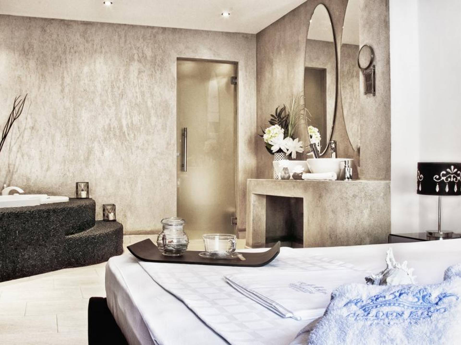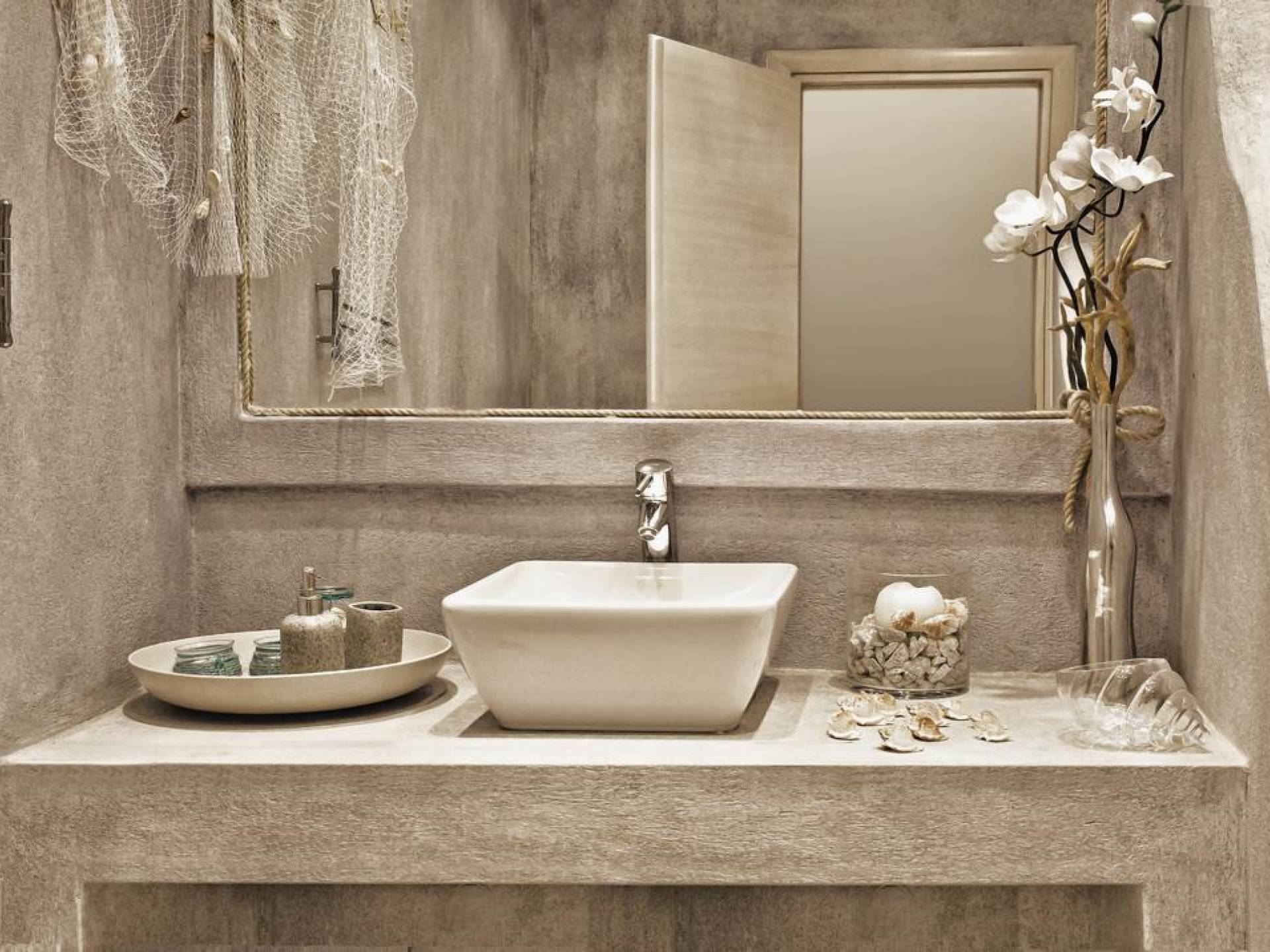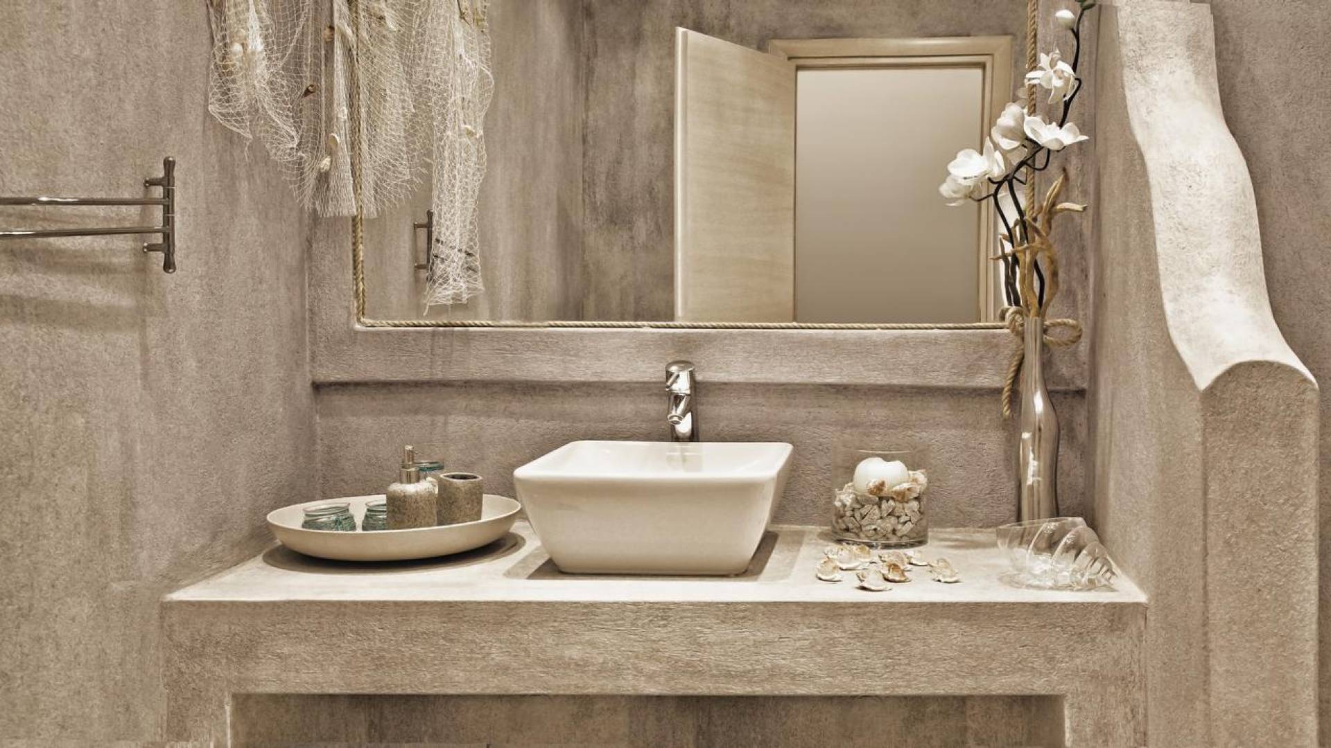 Ванная комната большая и просторная, стены выполнены в островном синем стиле, а пол выложен белой греческой галькой. Умывальник встроенный, над ним большое зеркало. Есть много пятен освещения, а душевая кабина двойная, со встроенным сиденьем, облицованным мозаичной плиткой, так что при желании 2 человека могут принимать душ одновременно.