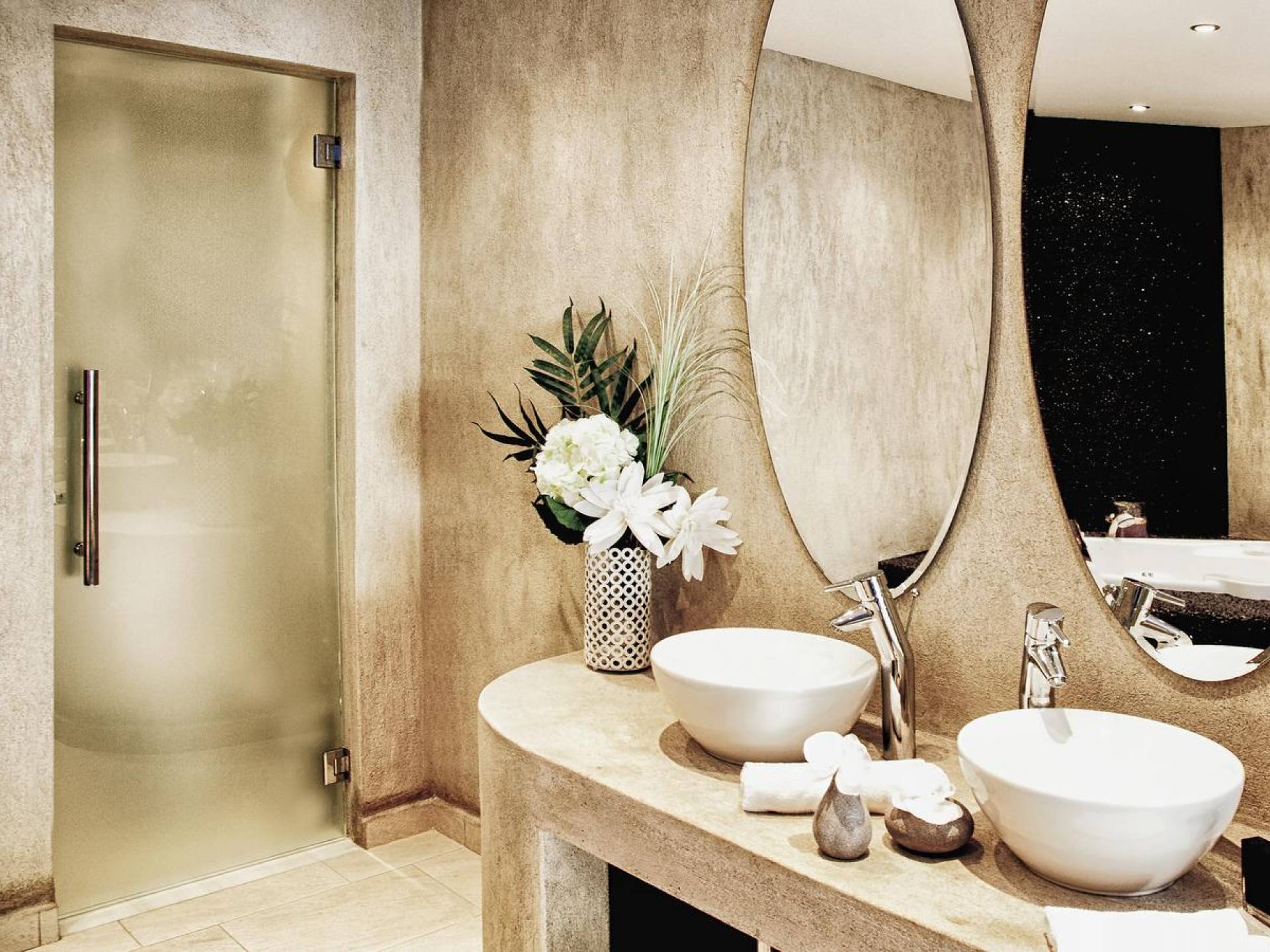 Главная спальня площадью 25 кв. м. включает в себя джакузи, обшитую черной итальянской галькой, двойной умывальник и туалет внутри спальни, разделенный только стеклянной дверью, обработанной пескоструйным аппаратом. Две другие спальни площадью 15 кв.м одинаково красивы, созданы и оформлены в том же стиле. В обоих есть системы кондиционирования воздуха, и одна из них имеет выход в сад.