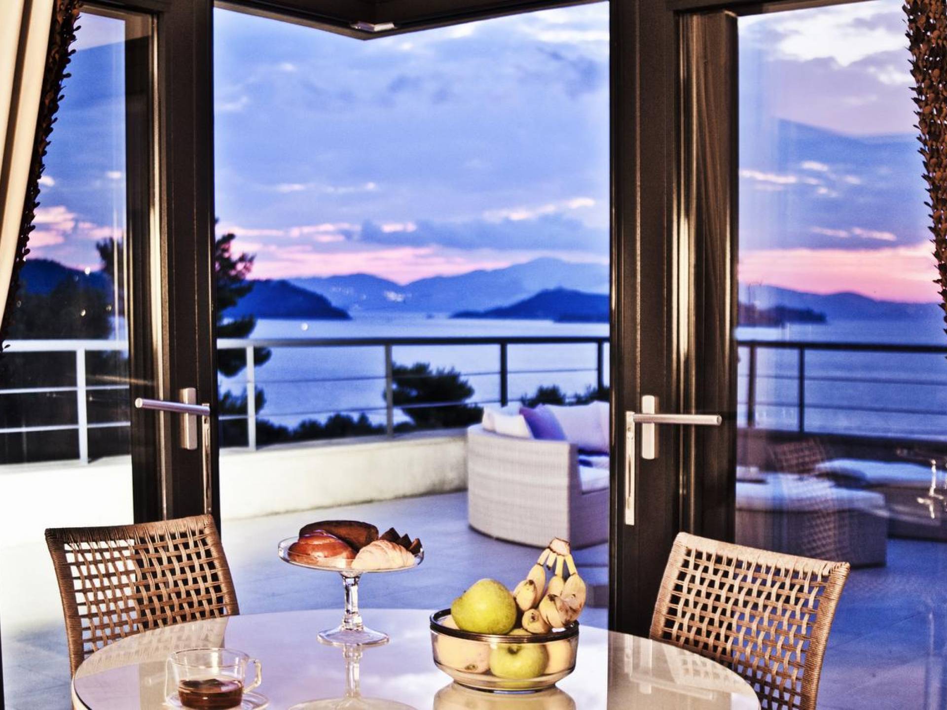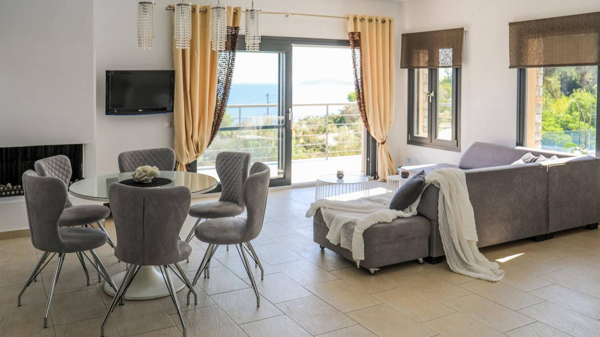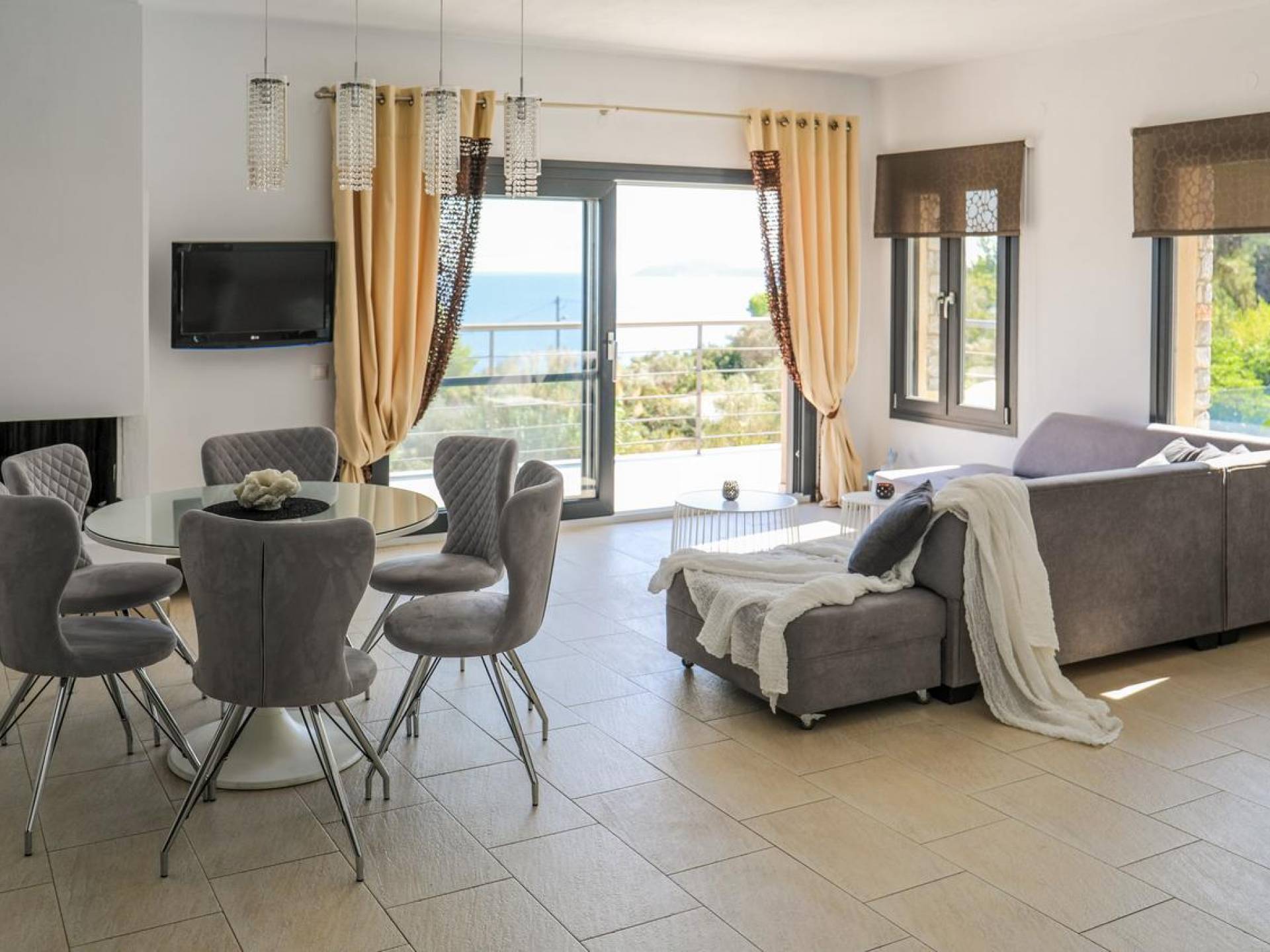 Открытая гостиная площадью 50 кв.м делит одну комнату с кухней и столовой и имеет современный встроенный камин, изнутри покрытый чугуном. Балконные двери и окна с жалюзи и рулонными шторами в высоком стиле скрывают захватывающий вид на море и частный бассейн виллы и ведут на балкон площадью 70 кв.м с мебелью в том же стиле, что и остальная часть дома. сложный. В гостиной есть система кондиционирования (охлаждение-обогрев), 33-дюймовый плазменный телевизор, CD, DVD, Mp3-плеер.