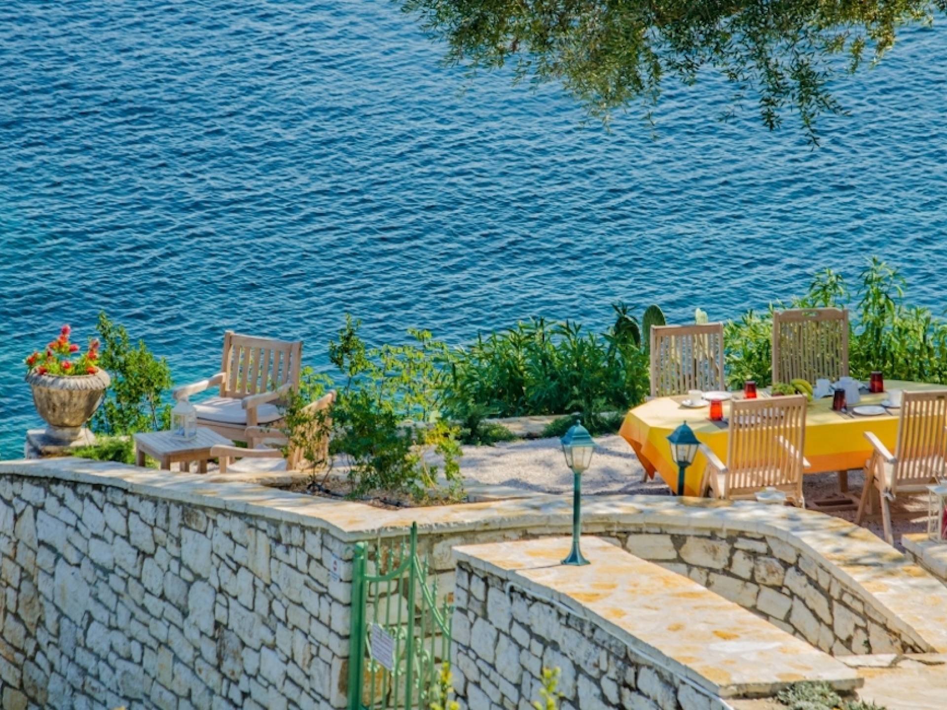 Большой 18-метровый овальный бассейн с римскими ступенями отделен от дома воротами, что делает его идеальным для семей с маленькими детьми. Удобные шезлонги и обеденная мебель окружают бассейн, а короткая дорожка ведет вниз к следующей обеденной зоне прямо у моря вместе с небольшой галечной бухтой и скалистой зоной. Несколько крытых террас и зонтиков обеспечивают достаточную тень для тех, кто ищет тени в полуденную жару.