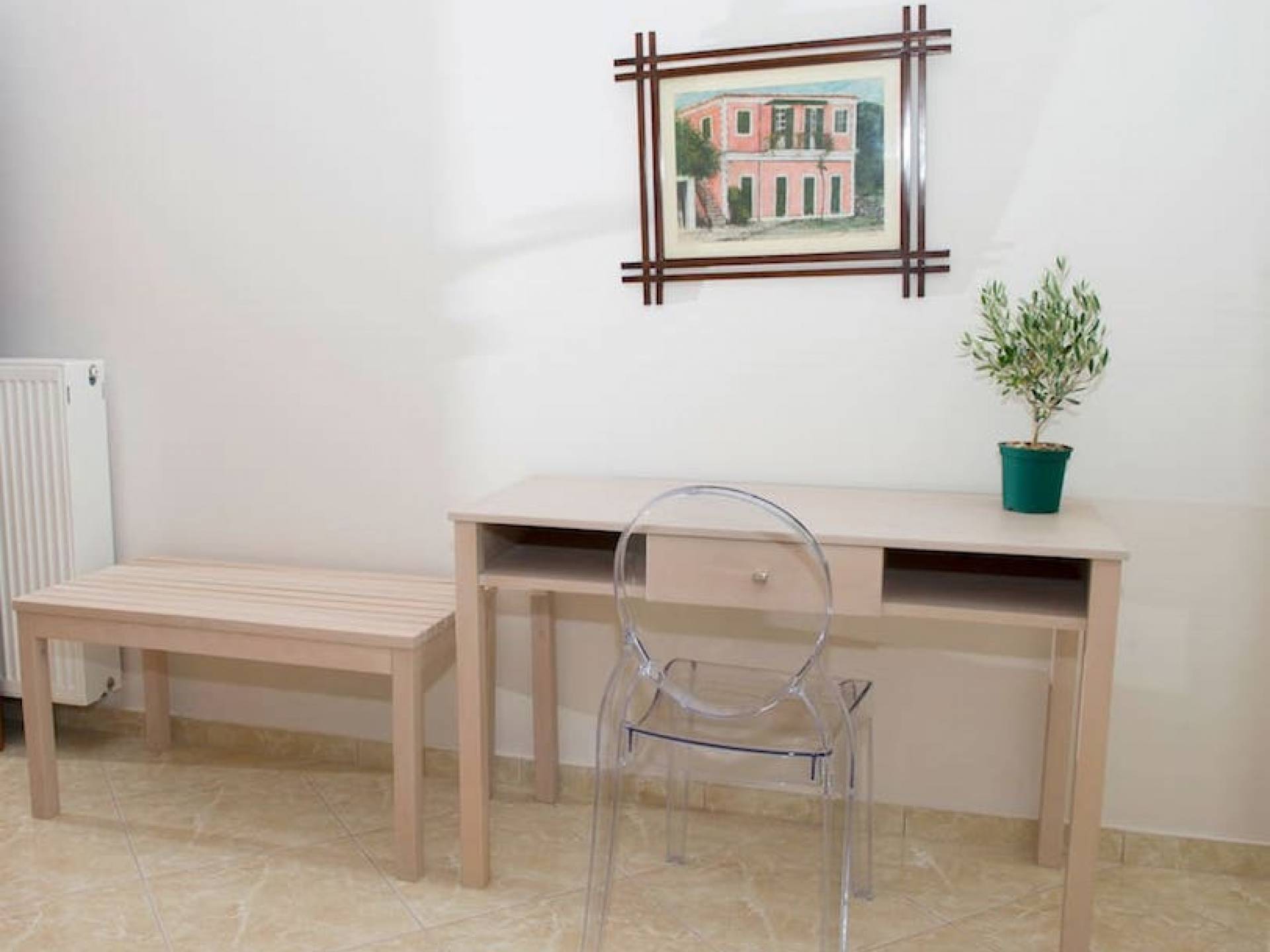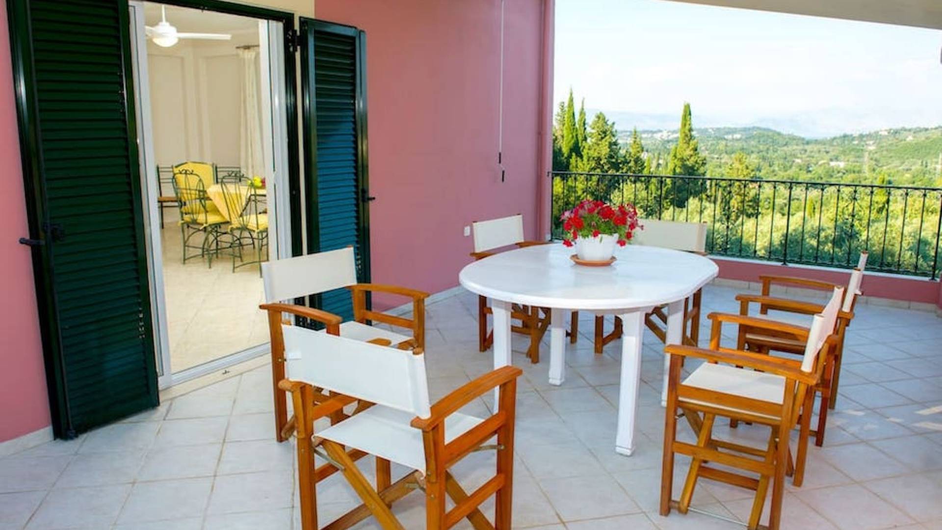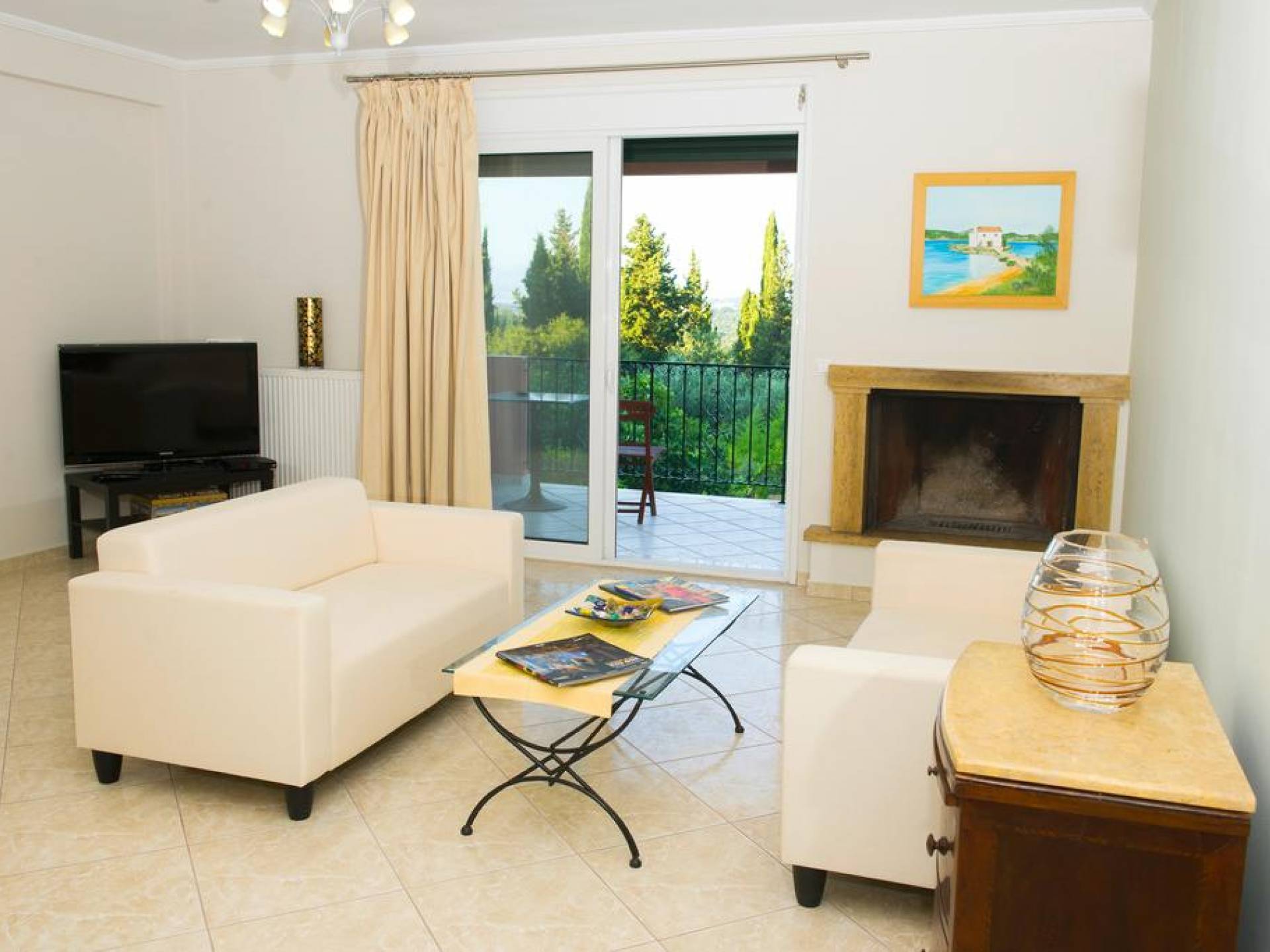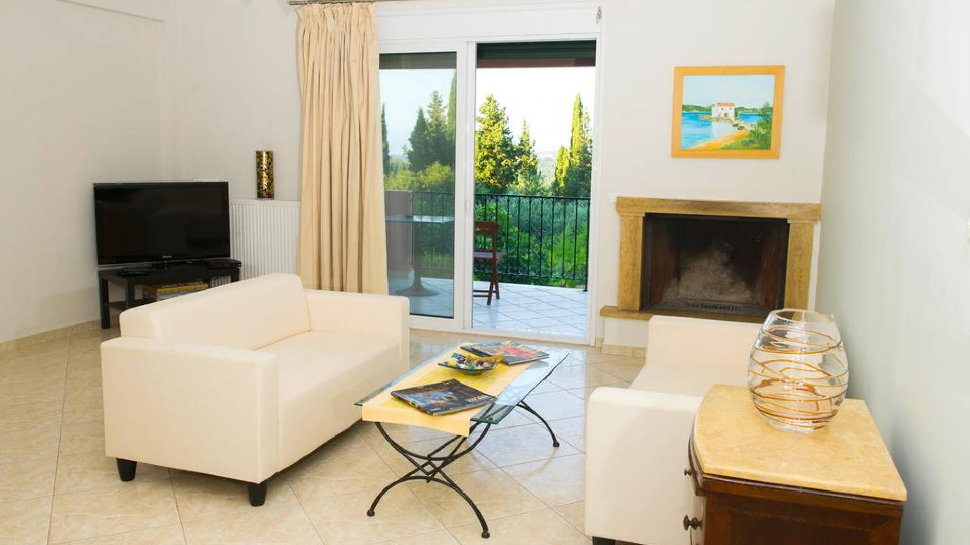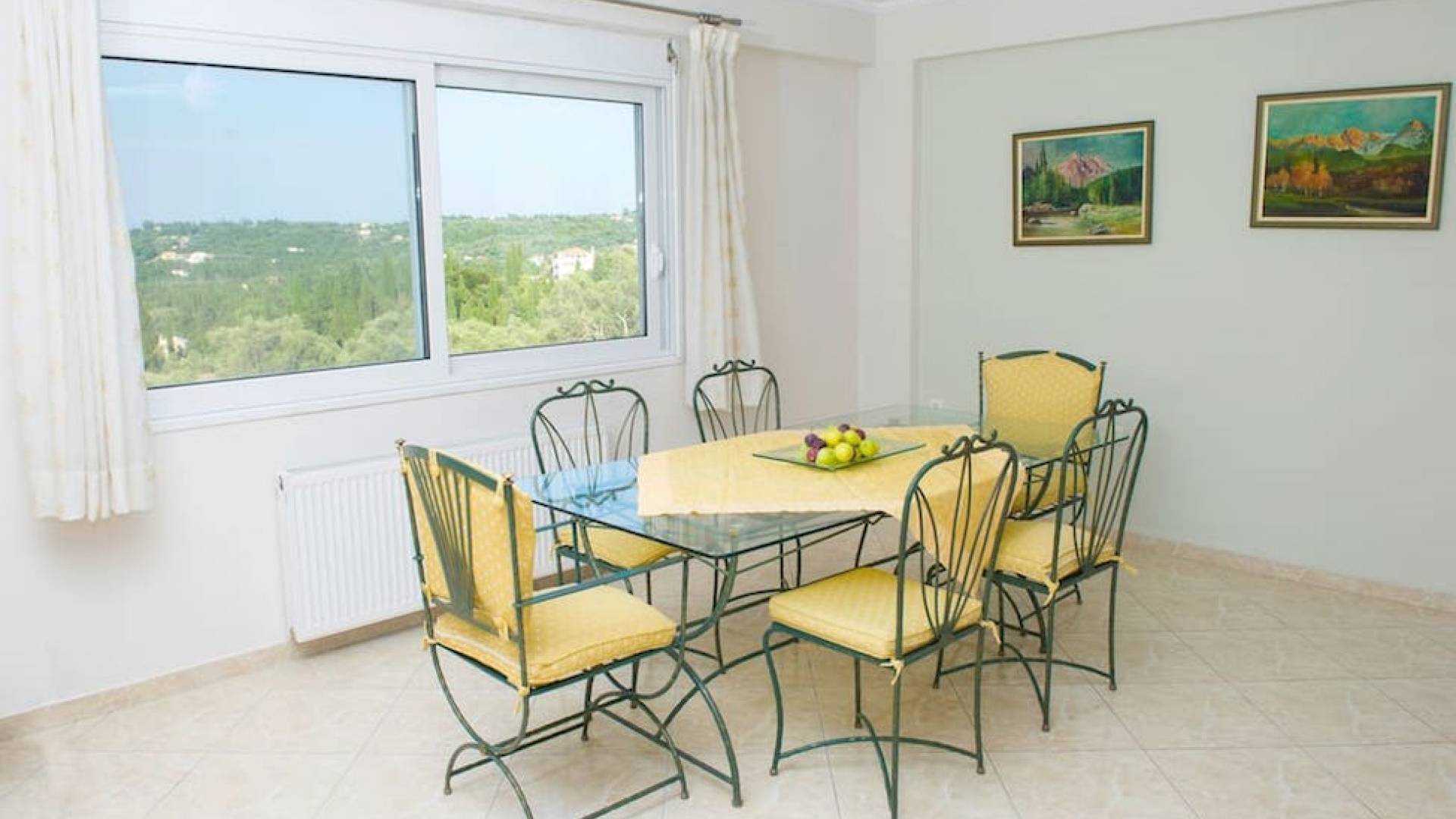 На 1 этаже (лестница) - гостиная с диваном-кроватью, открытым камином, двумя небольшими диванчиками, журнальным столиком, телевизором, балконом. Также есть санузел с кабиной (душевой кабиной), феном, стиральной машиной. Двуспальная кровать с занавесками, выносной потолочный вентилятор с балконом и очень красивый вид на бассейн, сад и сельскую местность. На 2-м этаже (лестница) находится большая кухня со всем необходимым оборудованием, таким как духовка, холодильник и электрическая кухня с обеденным столом из железа и стекла, с которой открывается панорамный вид на дворец Ахиллион (который находится в 3 км от виллы). Старая крепость, море, бассейн и город Корфу.