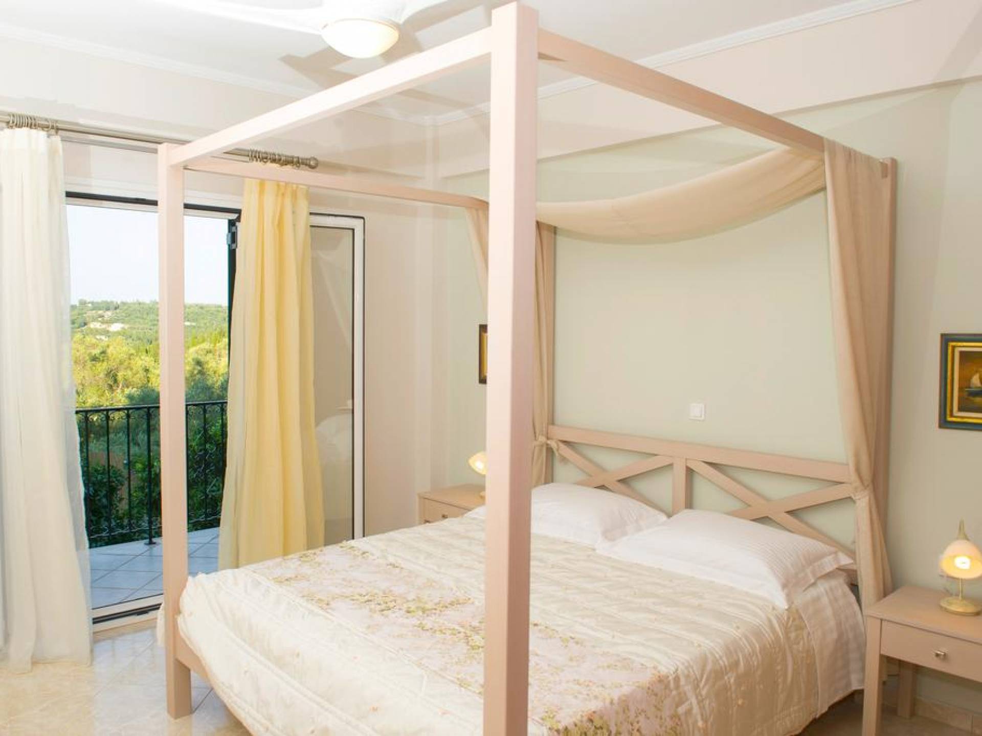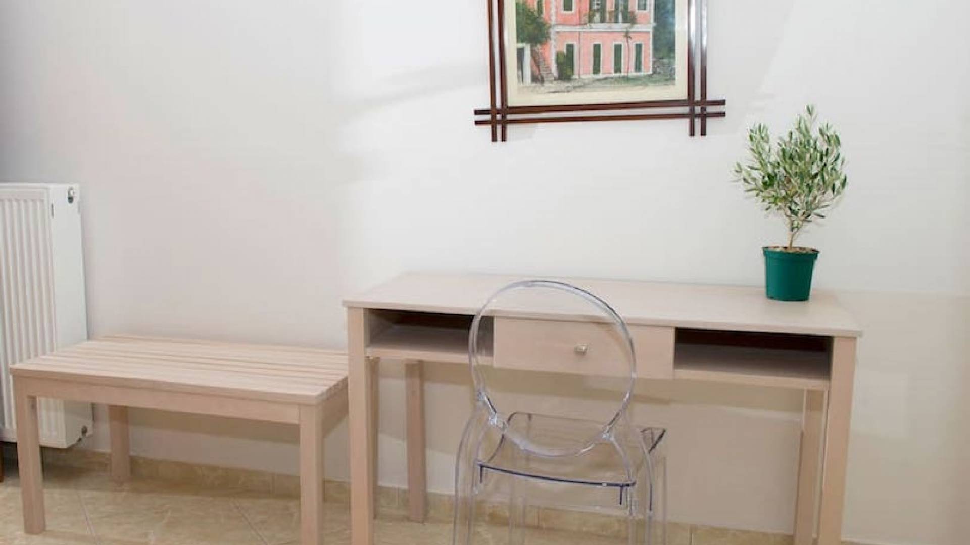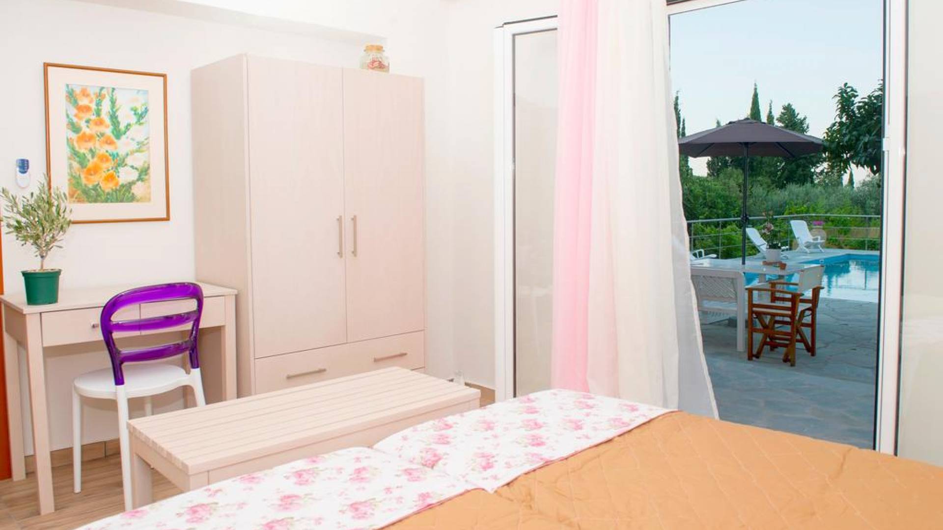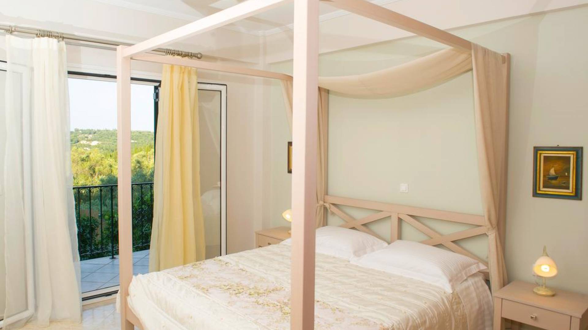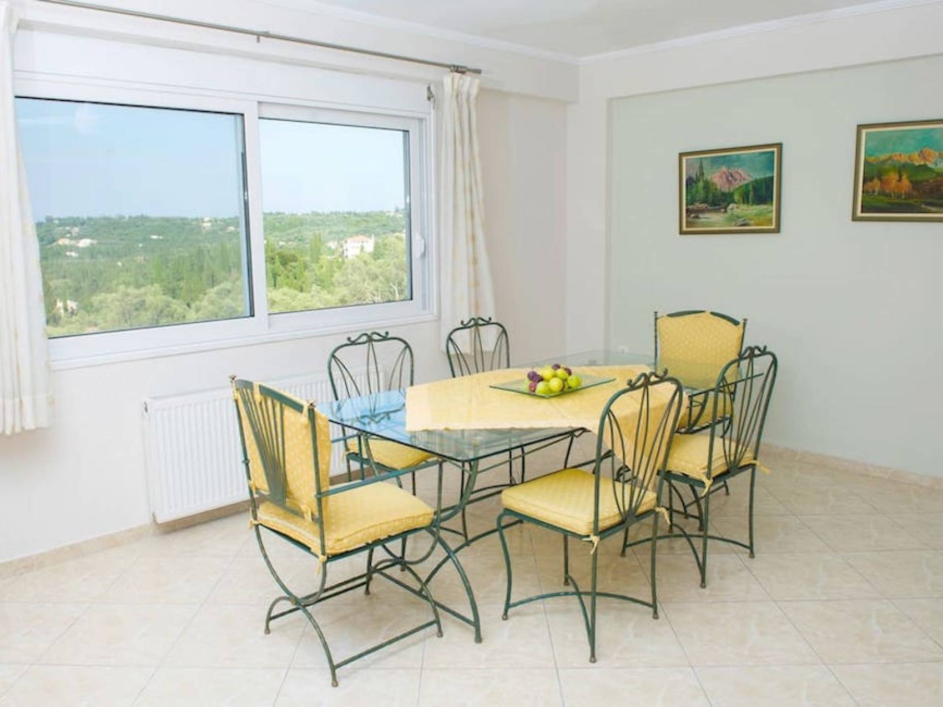 На 1 этаже (лестница) - гостиная с диваном-кроватью, открытым камином, двумя небольшими диванчиками, журнальным столиком, телевизором, балконом. Также есть санузел с кабиной (душевой кабиной), феном, стиральной машиной. Двуспальная кровать с занавесками, выносной потолочный вентилятор с балконом и очень красивый вид на бассейн, сад и сельскую местность. На 2-м этаже (лестница) находится большая кухня со всем необходимым оборудованием, таким как духовка, холодильник и электрическая кухня с обеденным столом из железа и стекла, с которой открывается панорамный вид на дворец Ахиллион (который находится в 3 км от виллы). Старая крепость, море, бассейн и город Корфу.