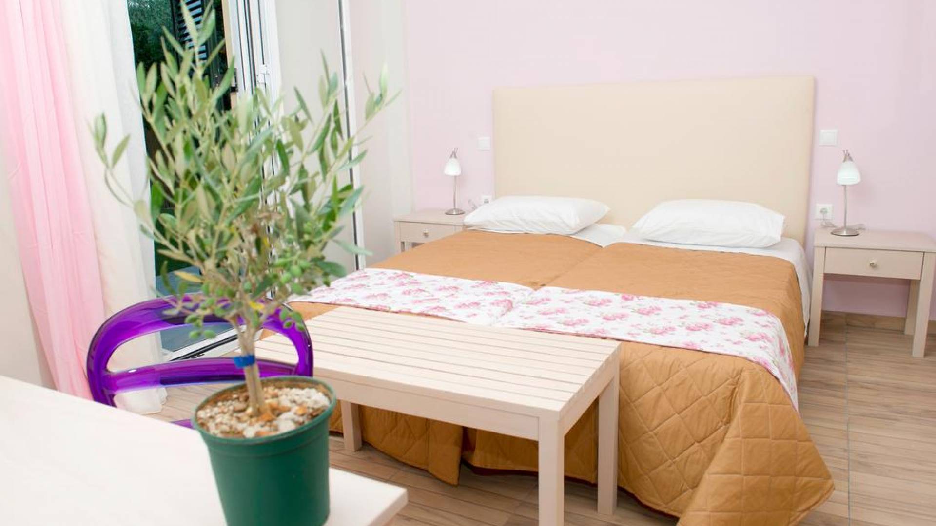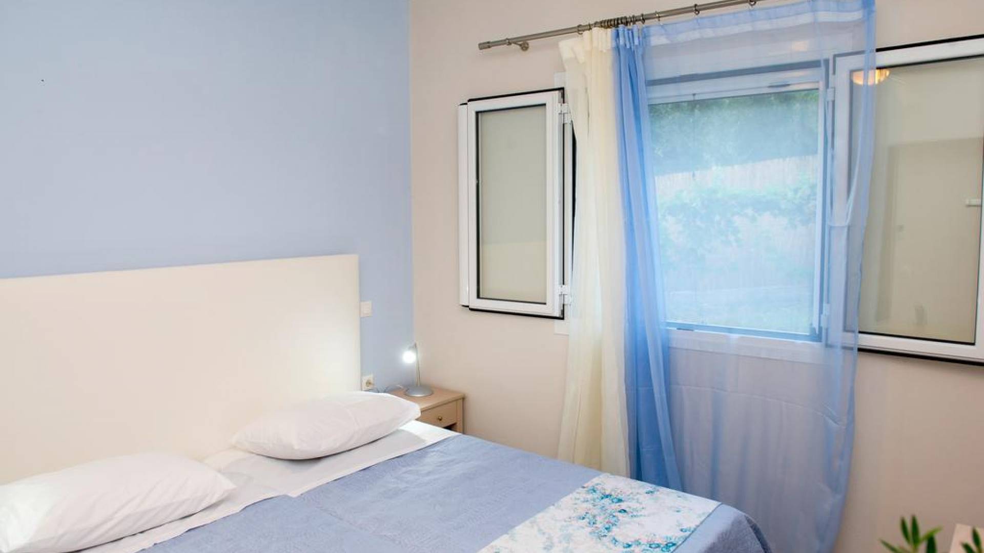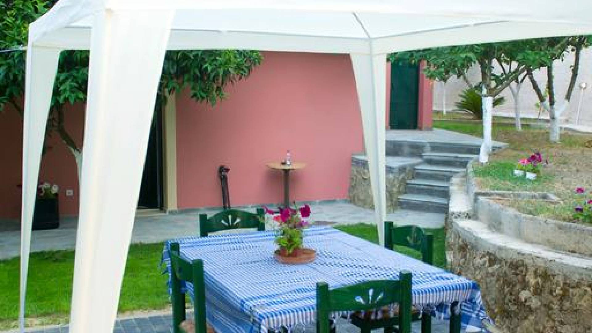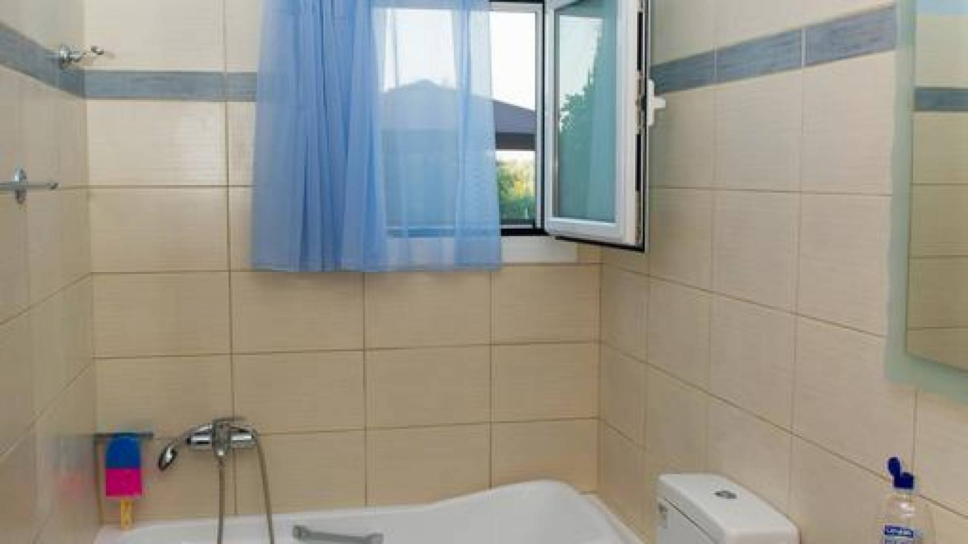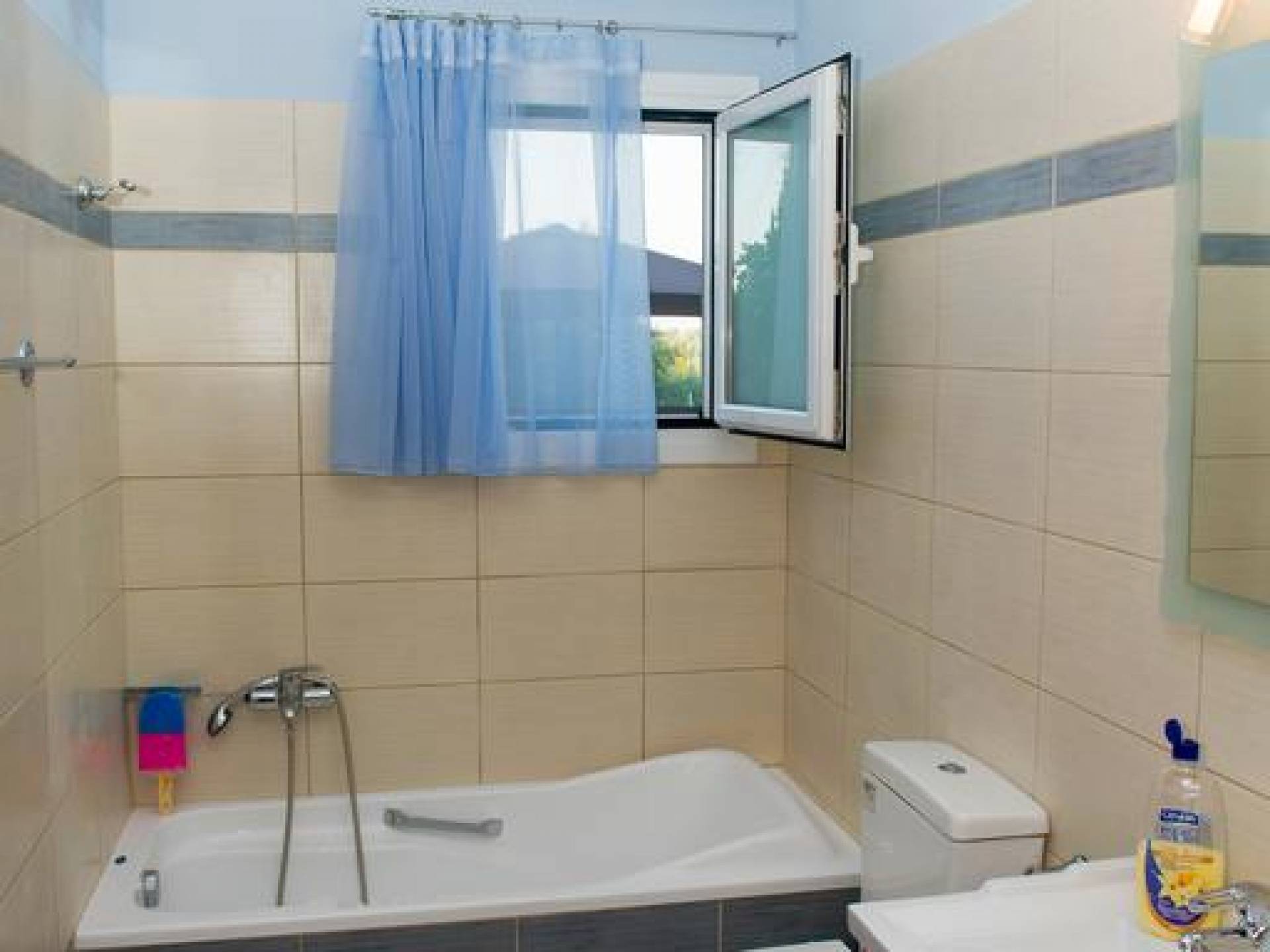 На 1 этаже (лестница) - гостиная с диваном-кроватью, открытым камином, двумя небольшими диванчиками, журнальным столиком, телевизором, балконом. Также есть санузел с кабиной (душевой кабиной), феном, стиральной машиной. Двуспальная кровать с занавесками, выносной потолочный вентилятор с балконом и очень красивый вид на бассейн, сад и сельскую местность. На 2-м этаже (лестница) находится большая кухня со всем необходимым оборудованием, таким как духовка, холодильник и электрическая кухня с обеденным столом из железа и стекла, с которой открывается панорамный вид на дворец Ахиллион (который находится в 3 км от виллы). Старая крепость, море, бассейн и город Корфу.
