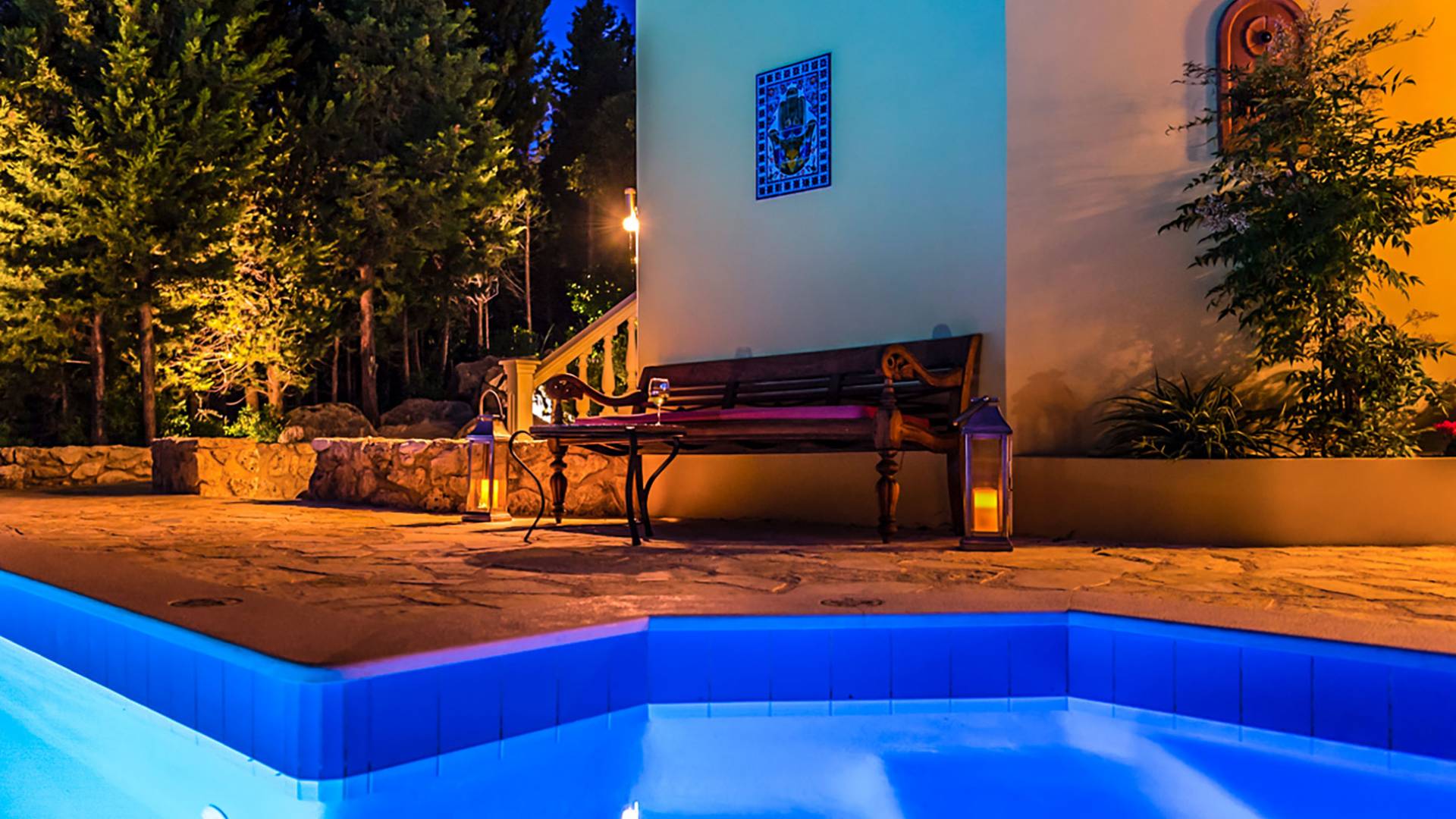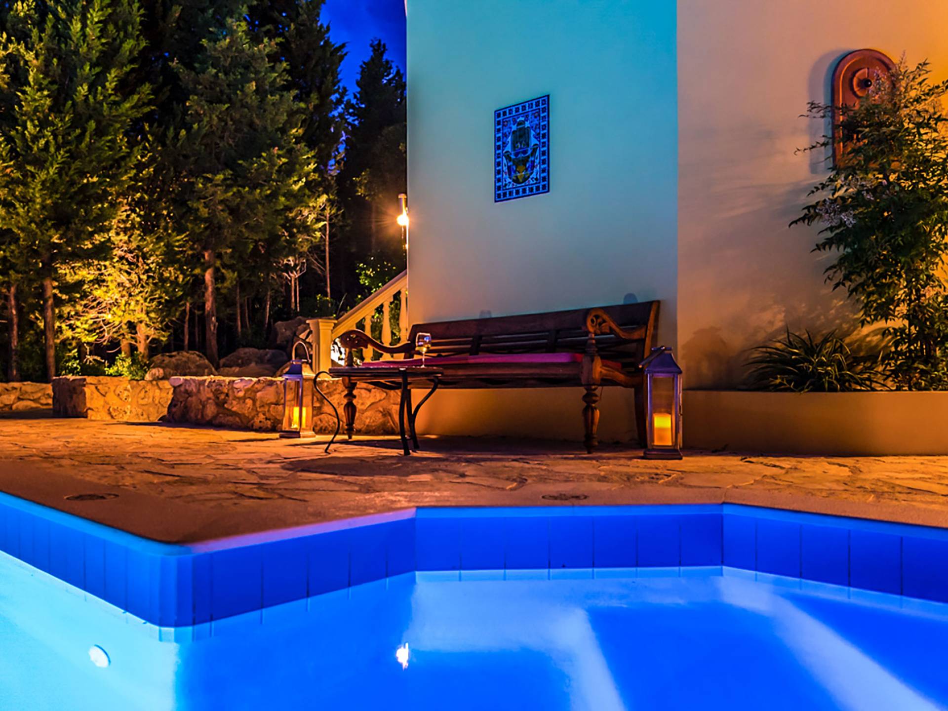Спрятанный в лесу над гаванью Нидри, это прекрасное роскошное уединенное место с потрясающими панорамными видами. Великолепное наблюдение за звездами возможно при почти полном отсутствии светового загрязнения. Бассейн с подогревом делает плавание комфортным в течение каждой недели сезона с температурой в бассейне 26-27 ° C, в то время как инвестиции в солнечную батарею с 22 панелями означают, что вилла вырабатывает всю собственную электроэнергию, что делает ваш бассейн с подогревом и кондиционером. роскошный и экологически чистый.
