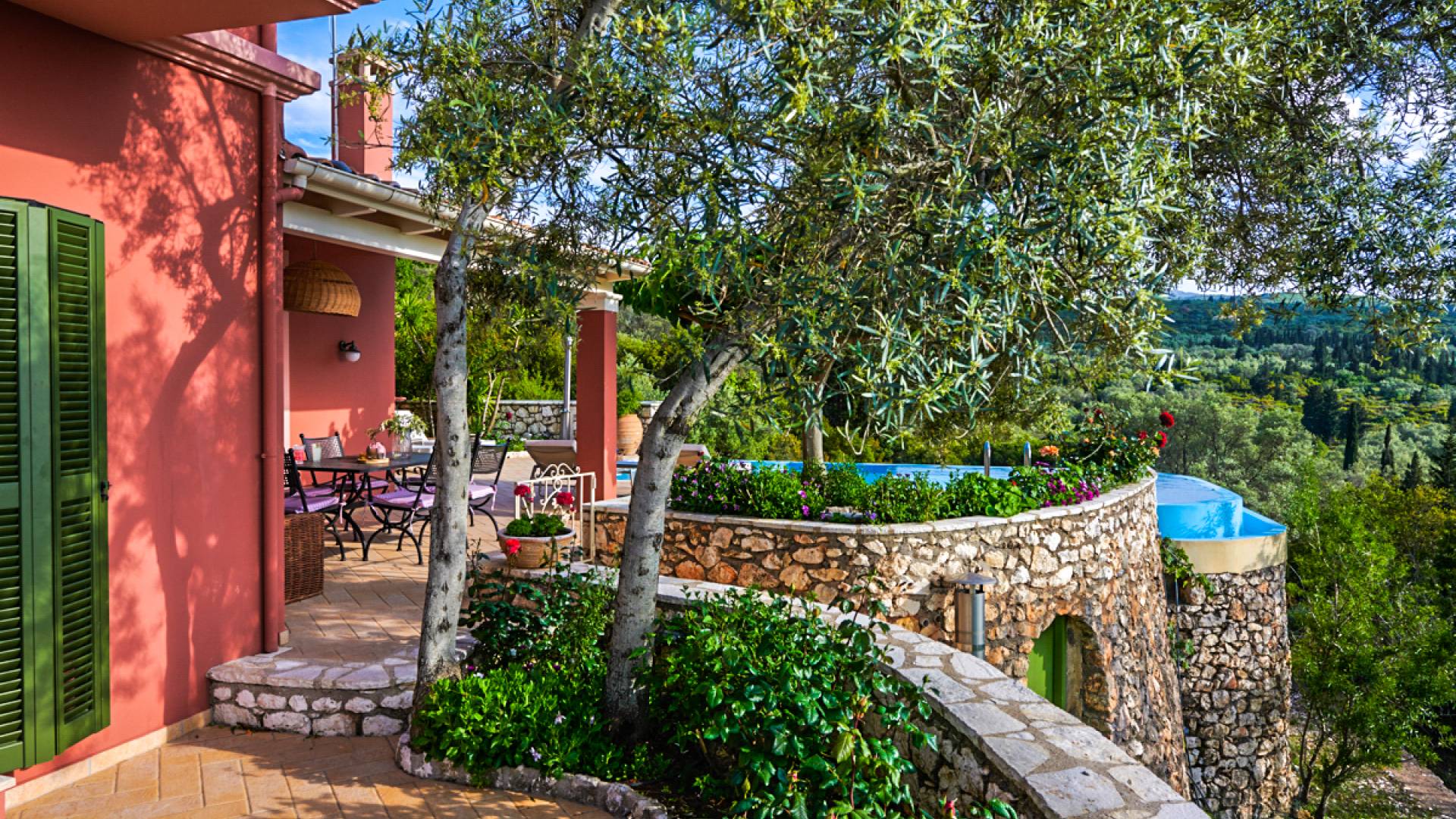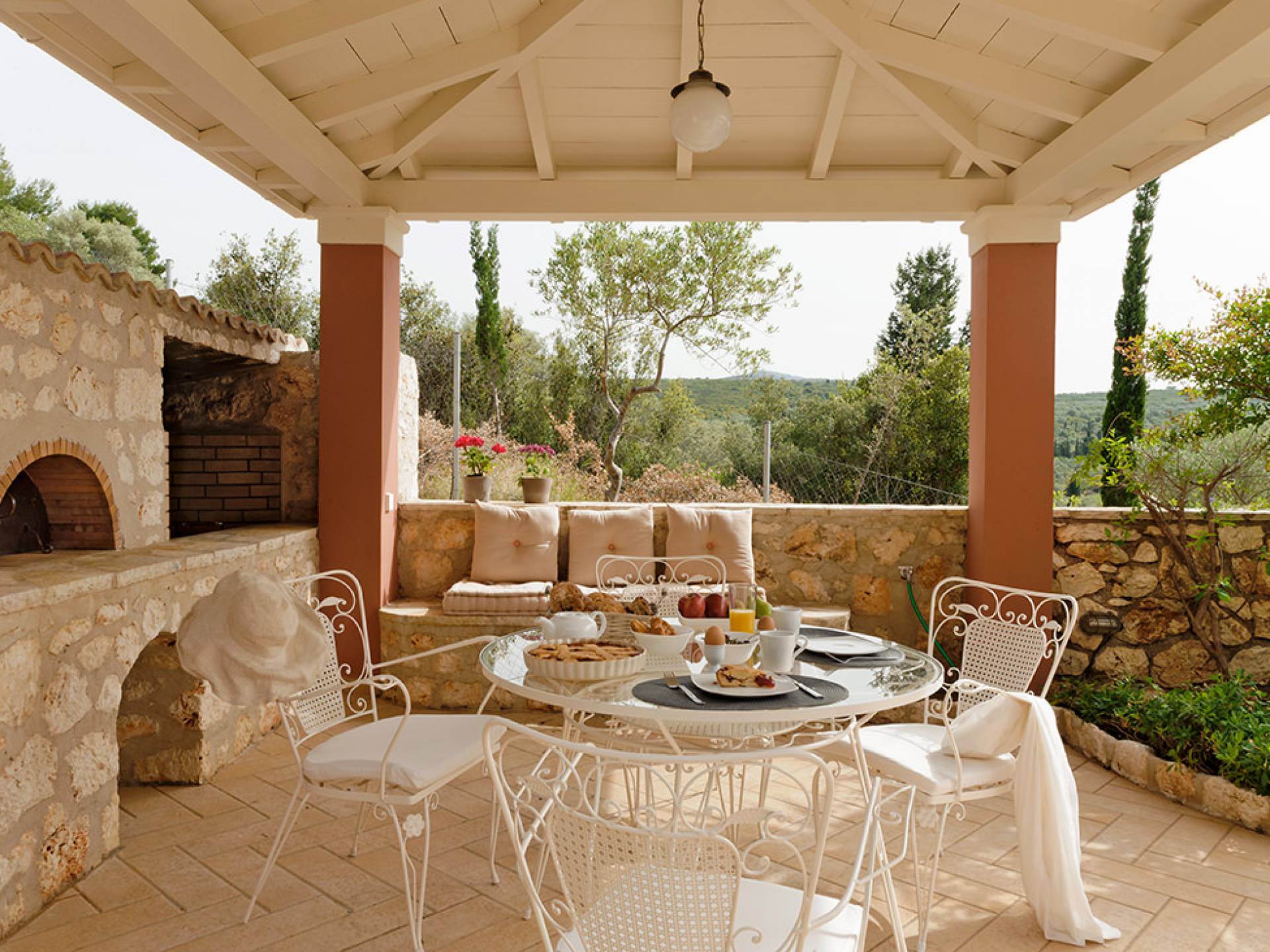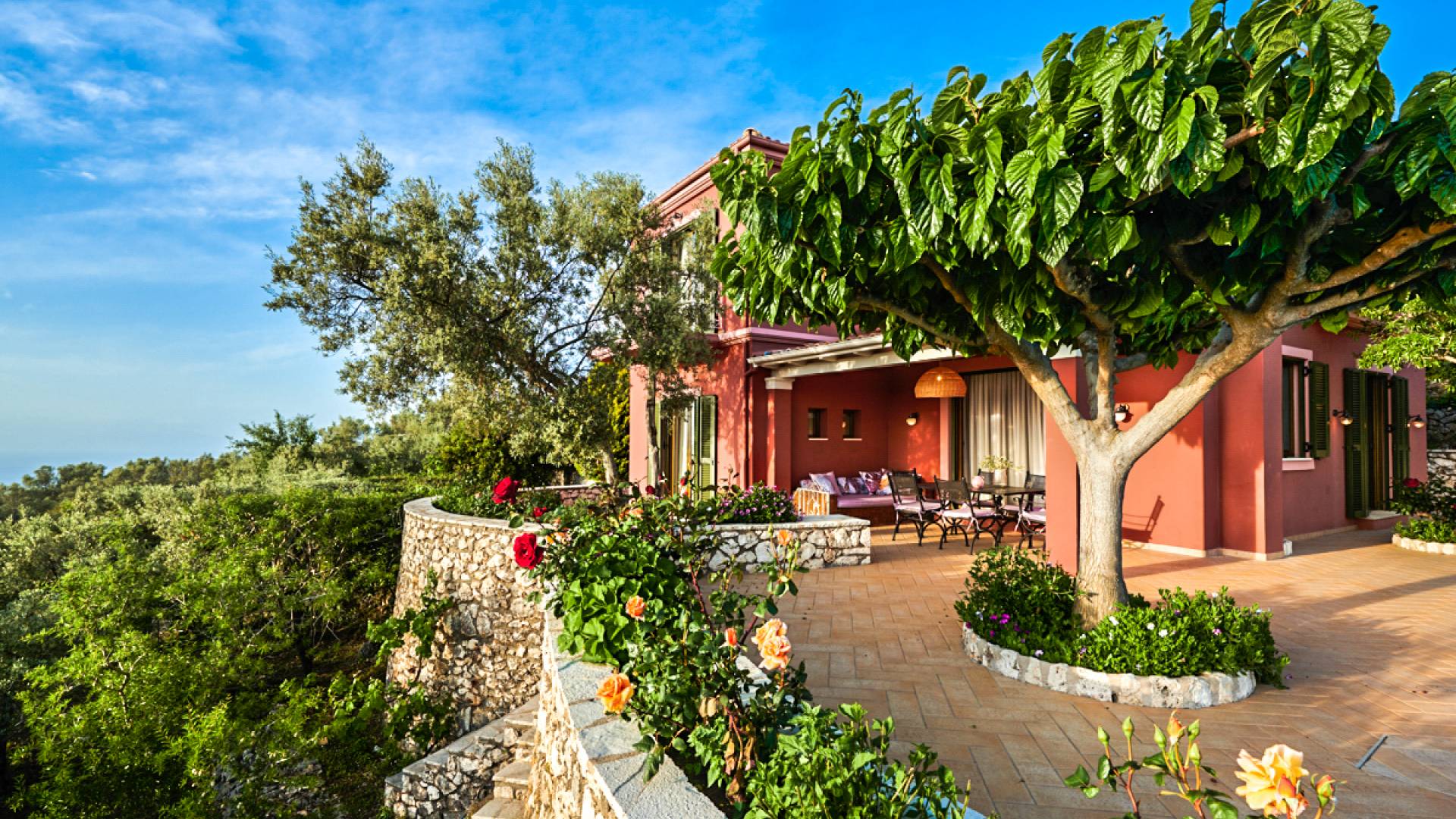 Открытые пространства обрамлены каменными стенами и могут похвастаться прекрасным двором с керамическим полом в естественных тонах, разнообразными цветочными клумбами и крытым балконом-столовой, где вы можете отведать домашние блюда, приготовленные самостоятельно из традиционного дерева. -гровая печь. Последний штрих - голубая вода большого бассейна, которая становится единым целым с горизонтом и бесконечной синевой водой Ионического моря.