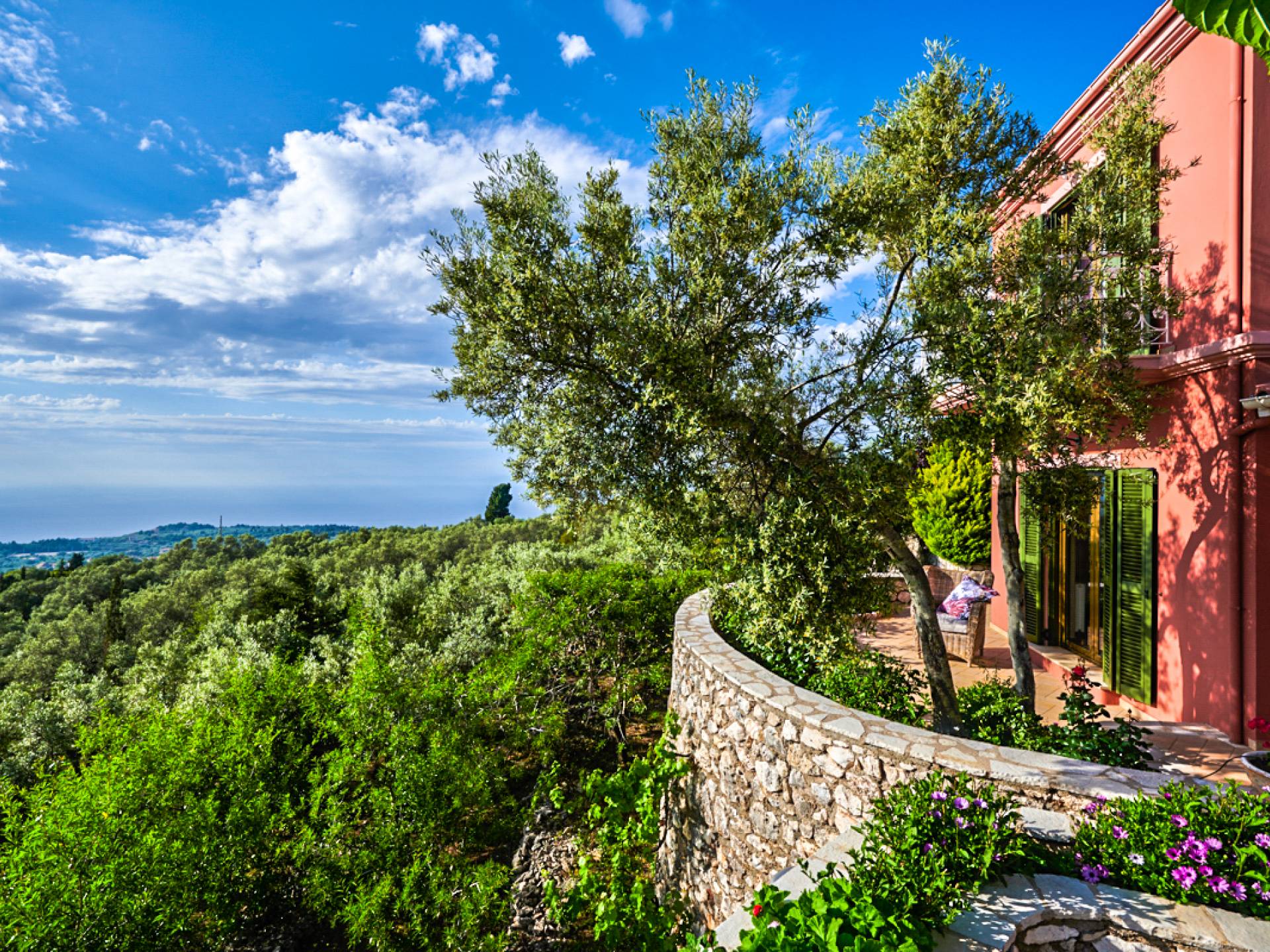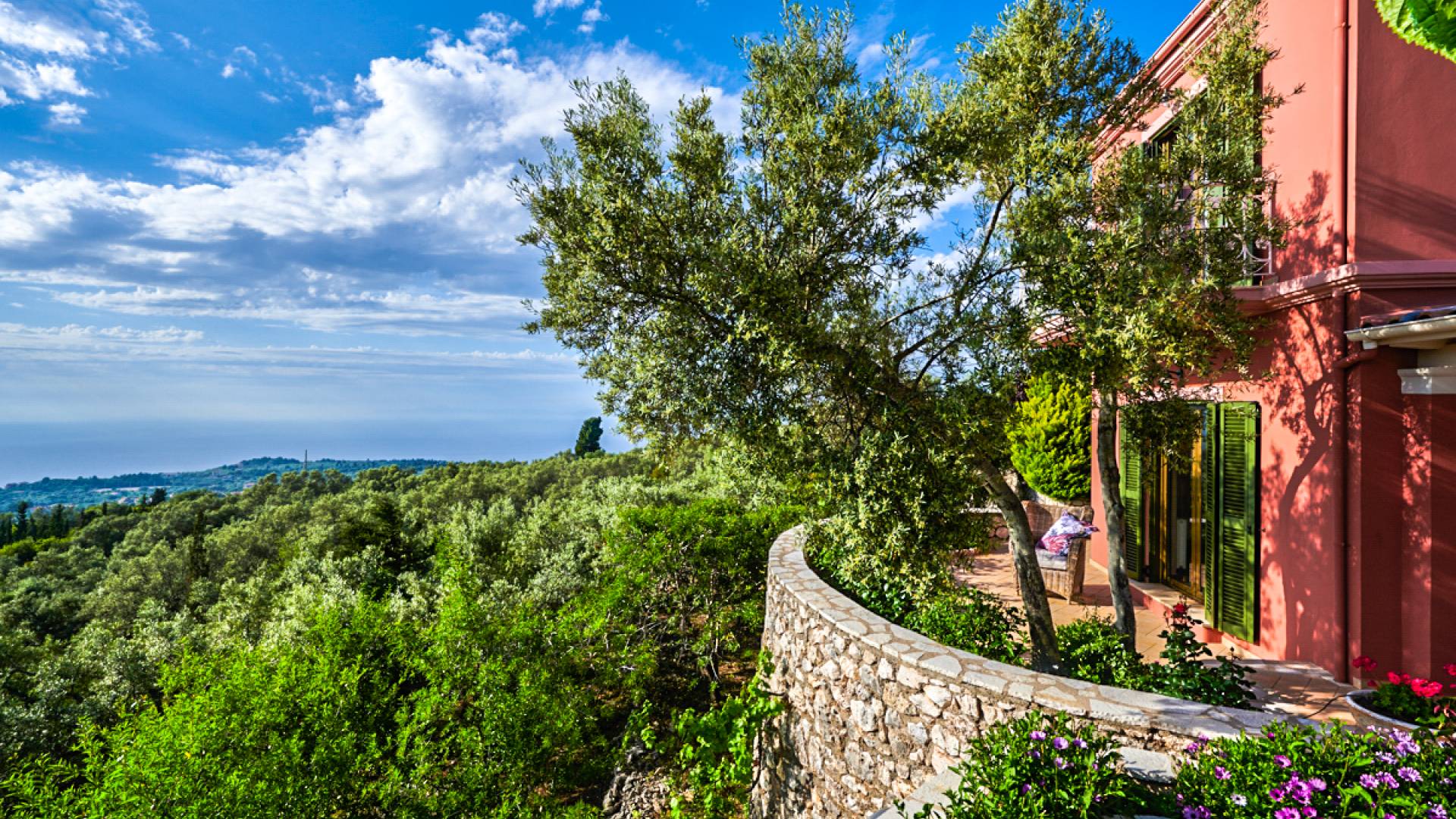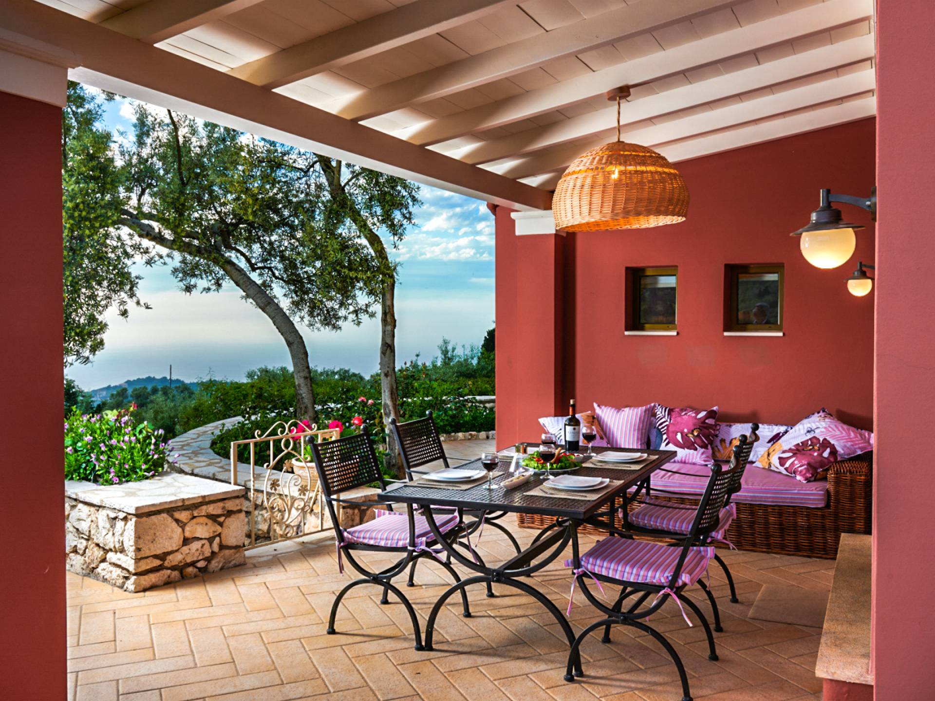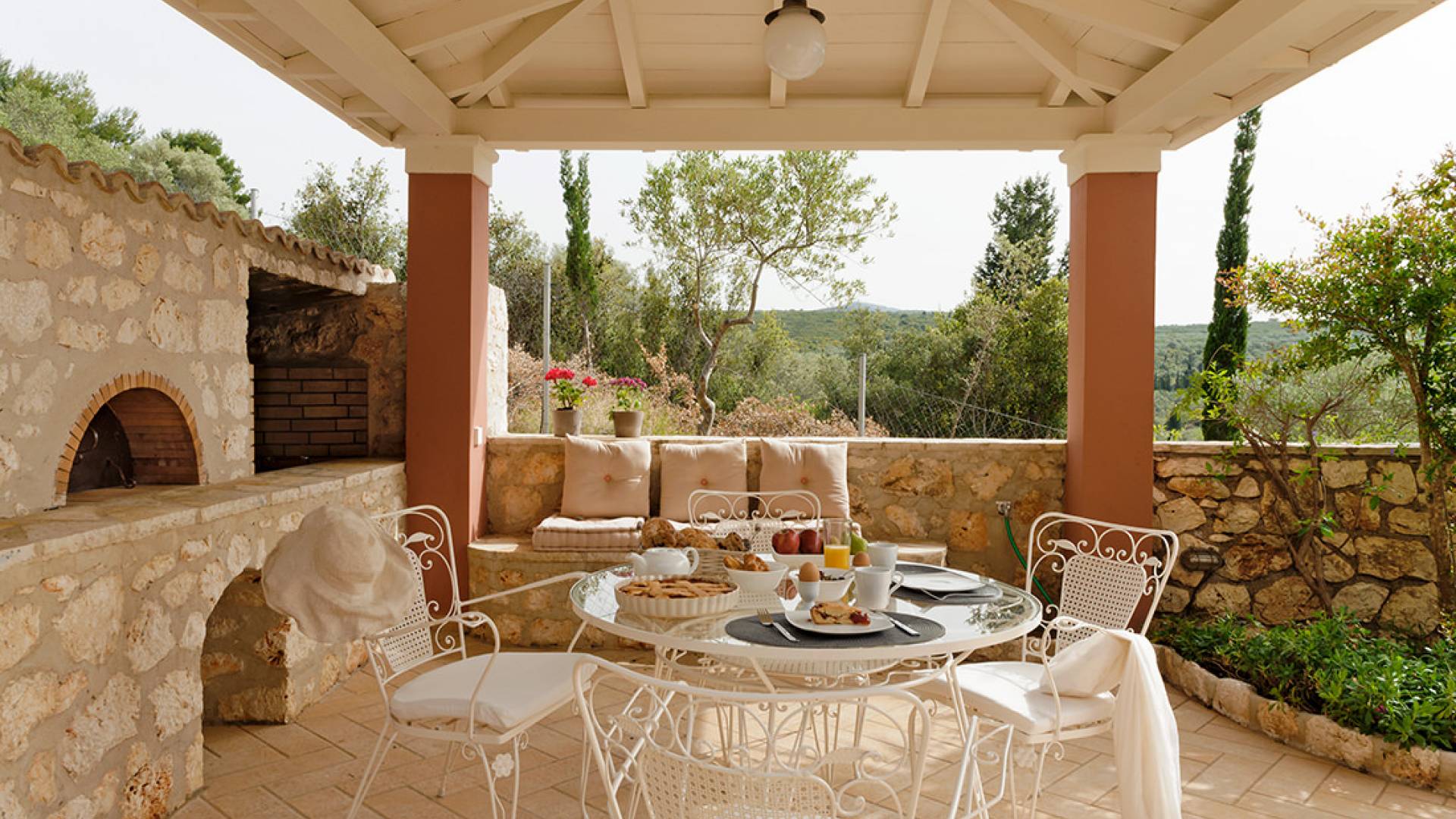 Открытые пространства обрамлены каменными стенами и могут похвастаться прекрасным двором с керамическим полом в естественных тонах, разнообразными цветочными клумбами и крытым балконом-столовой, где вы можете отведать домашние блюда, приготовленные самостоятельно из традиционного дерева. -гровая печь. Последний штрих - голубая вода большого бассейна, которая становится единым целым с горизонтом и бесконечной синевой водой Ионического моря.