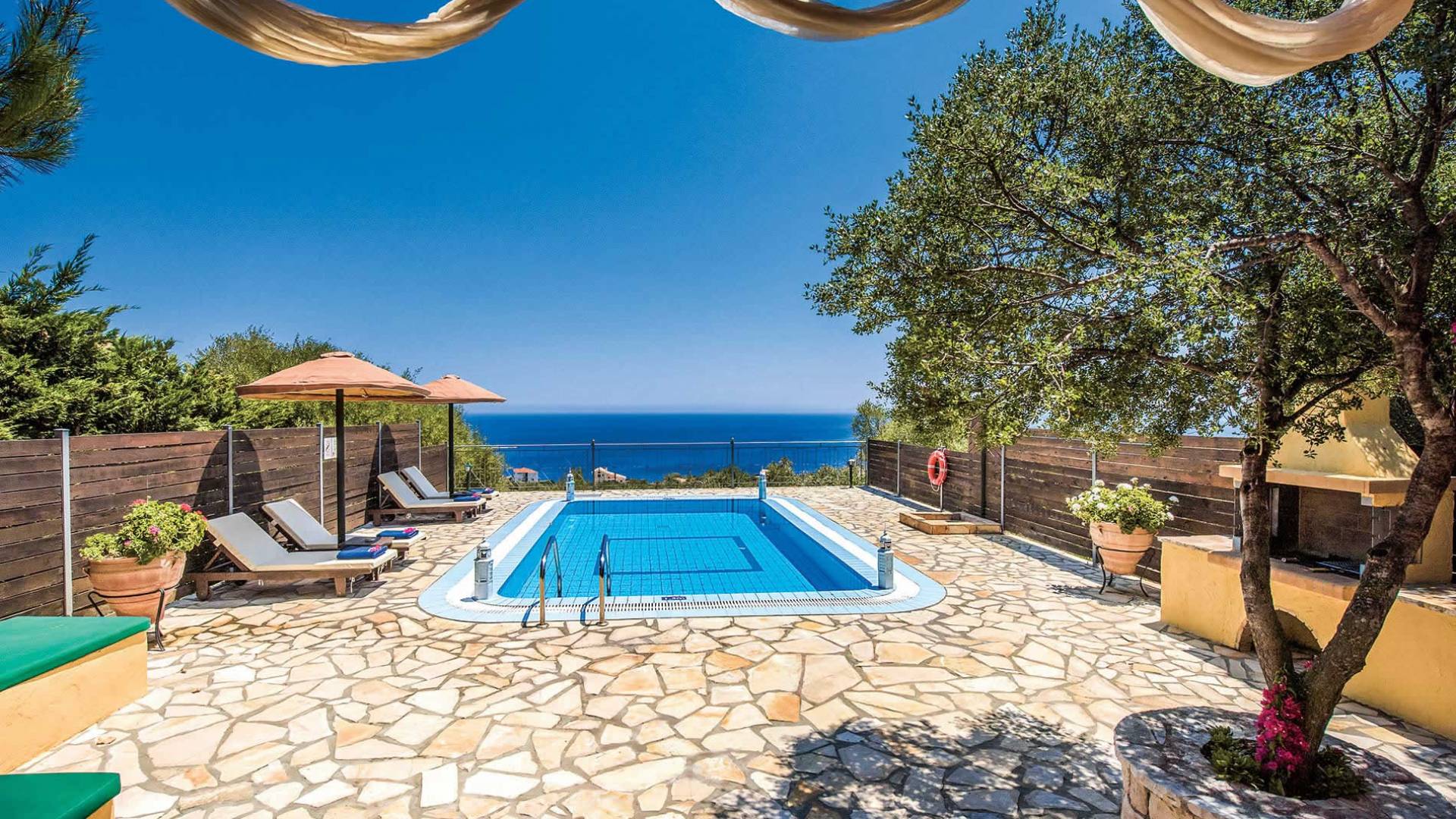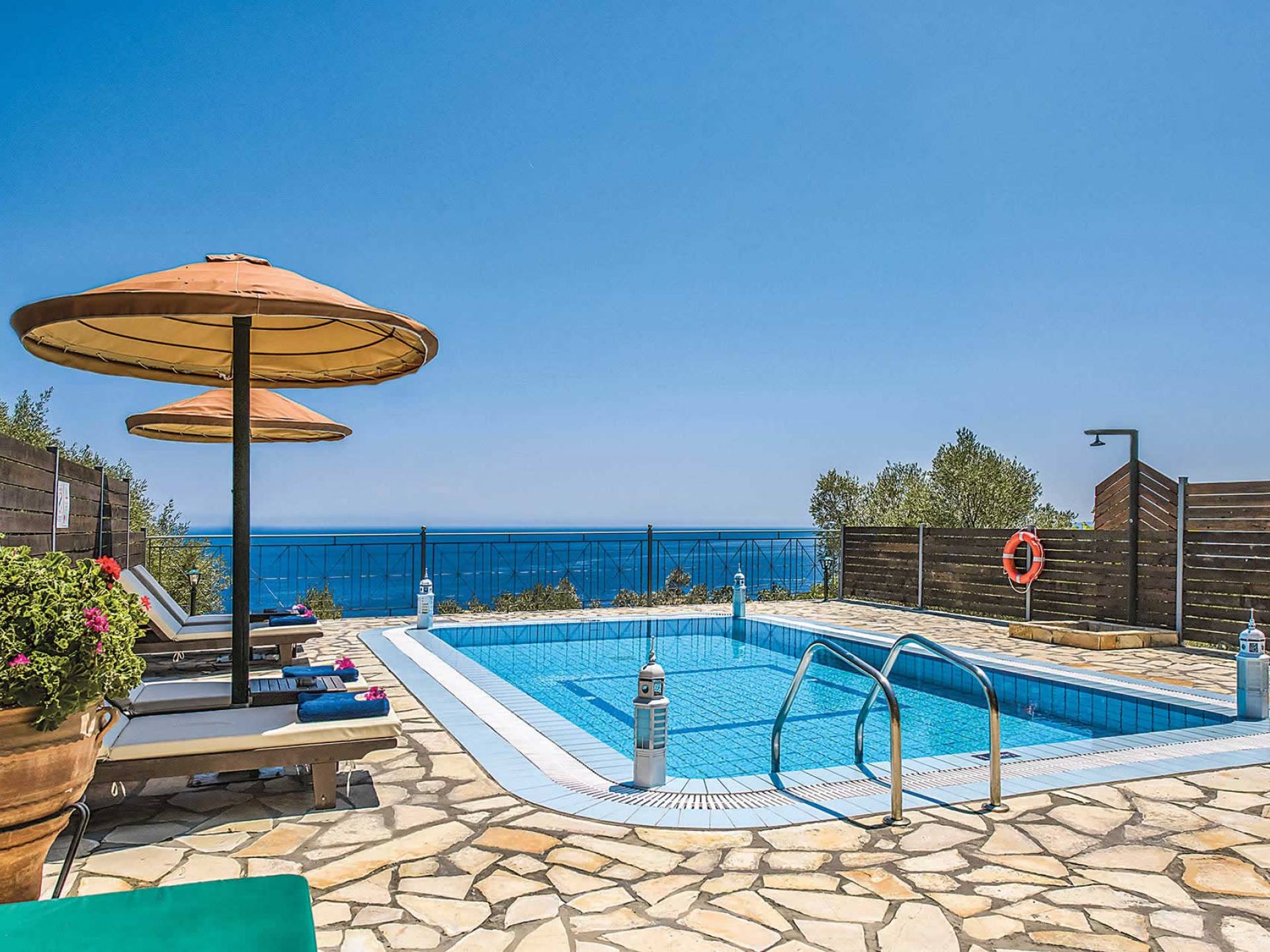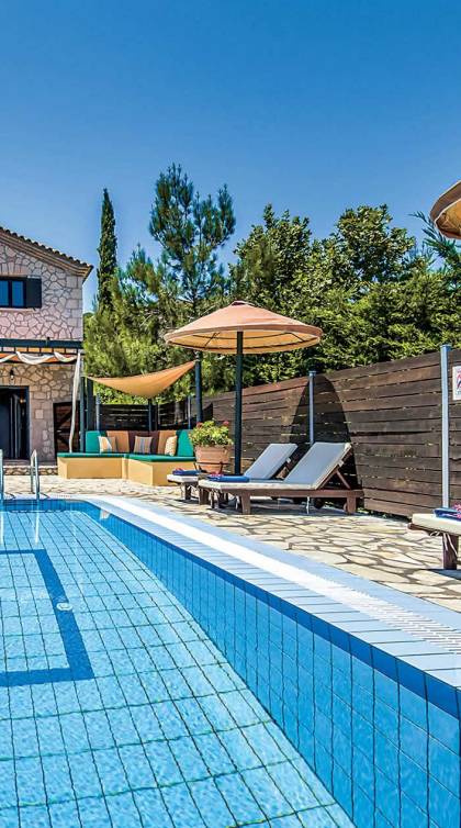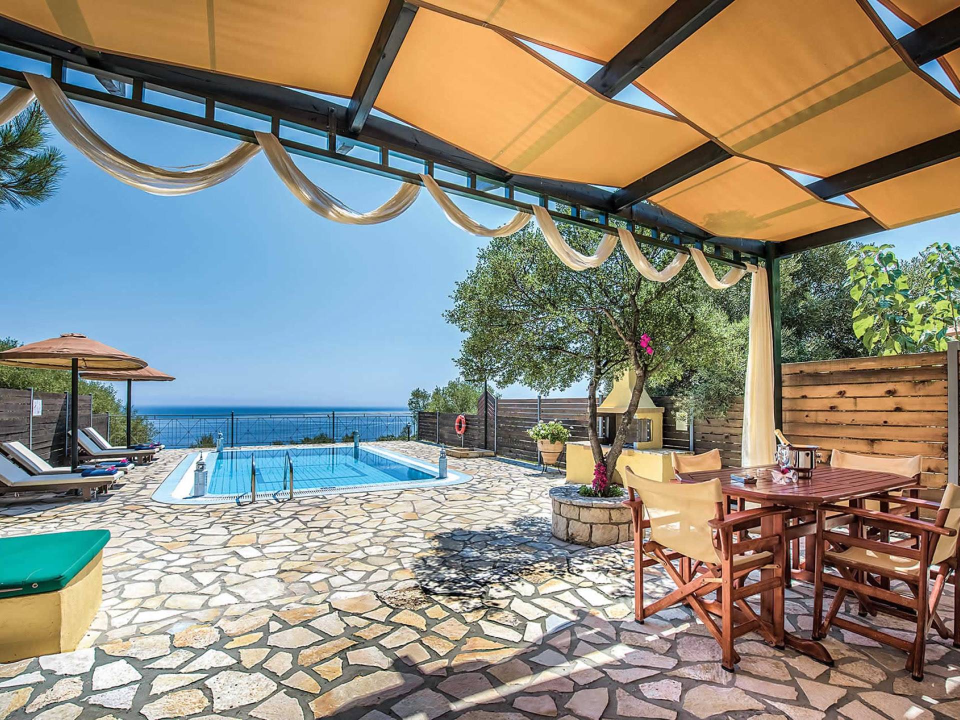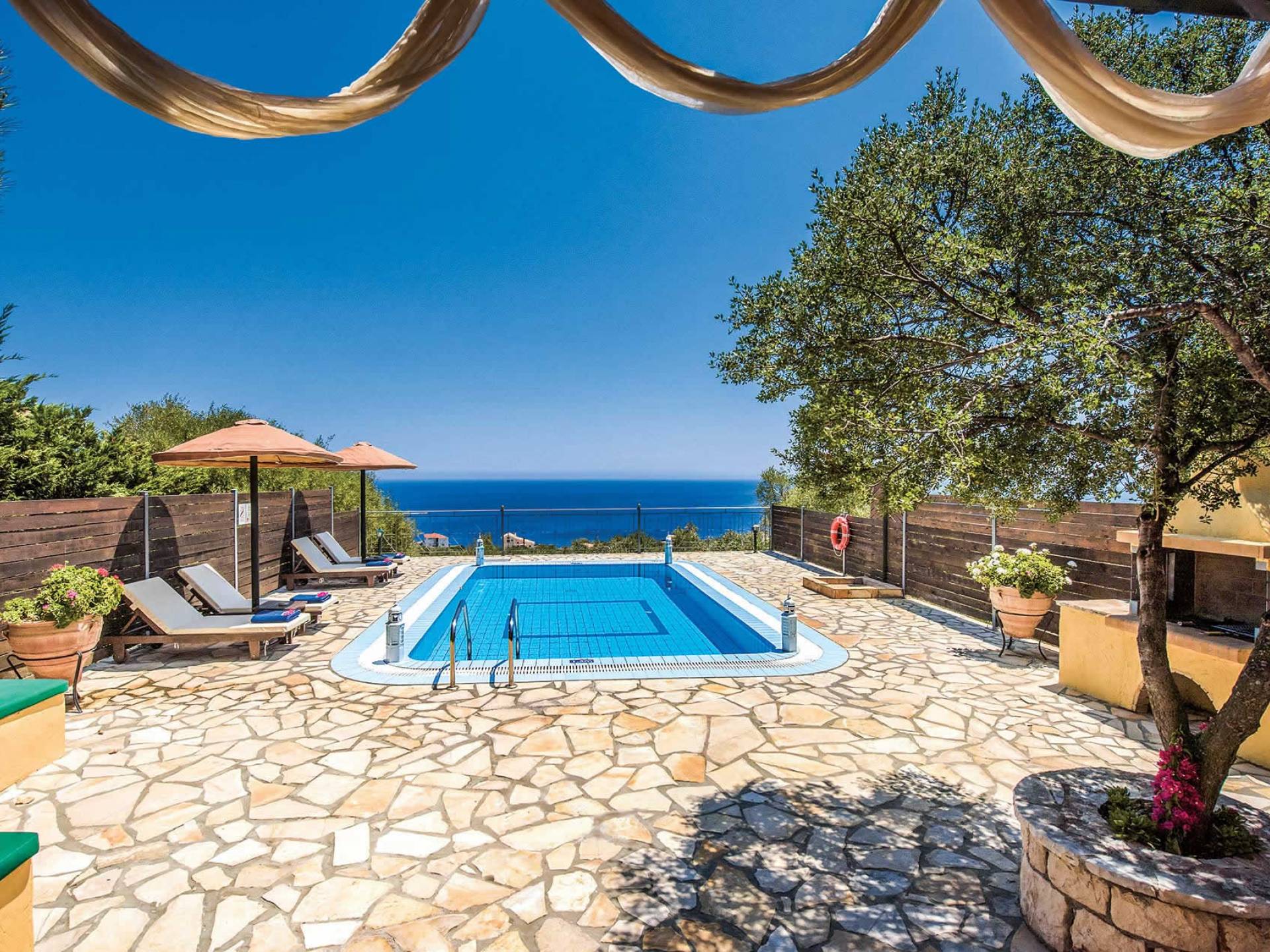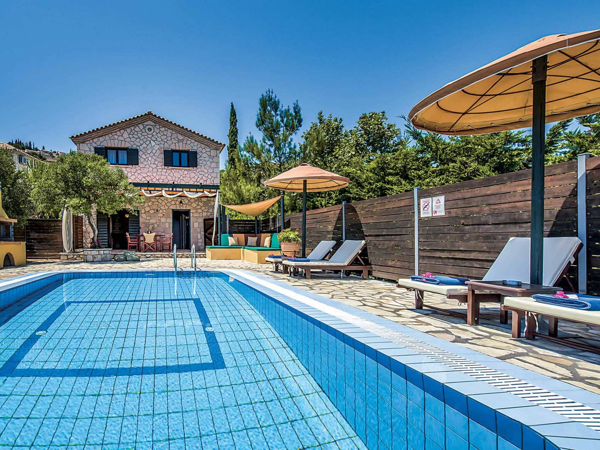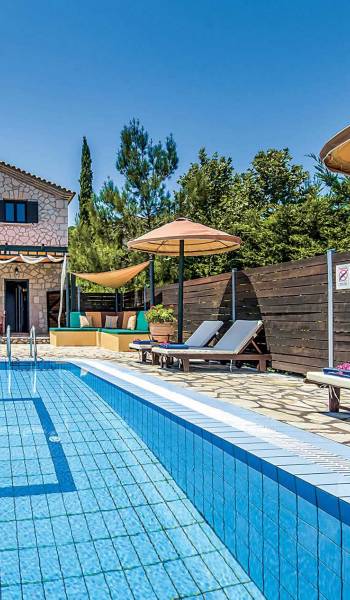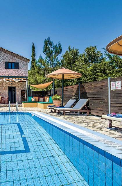 Деревянная лестница ведет в две спальни и ванную комнату наверху. В ванной комнате есть джакузи, фен и туалетные принадлежности. Снаружи вилла спроектирована так, чтобы обеспечить вам максимальную конфиденциальность и досуг во время отпуска. Огороженная территория площадью 185 кв.м с частным бассейном, шезлонгами и зонтиками, зоной отдыха, барбекю, обеденной зоной и великолепным видом на Ионическое море.