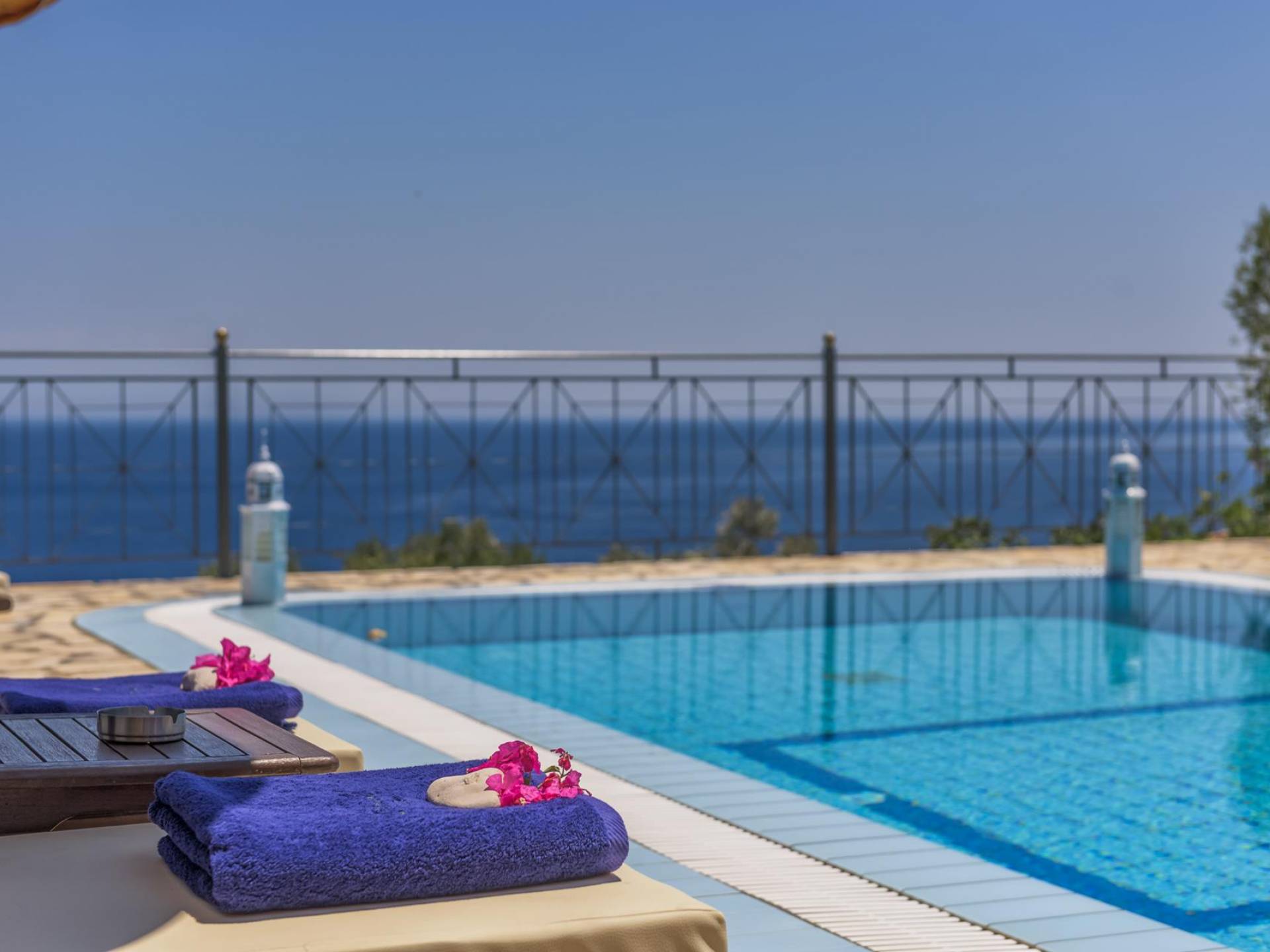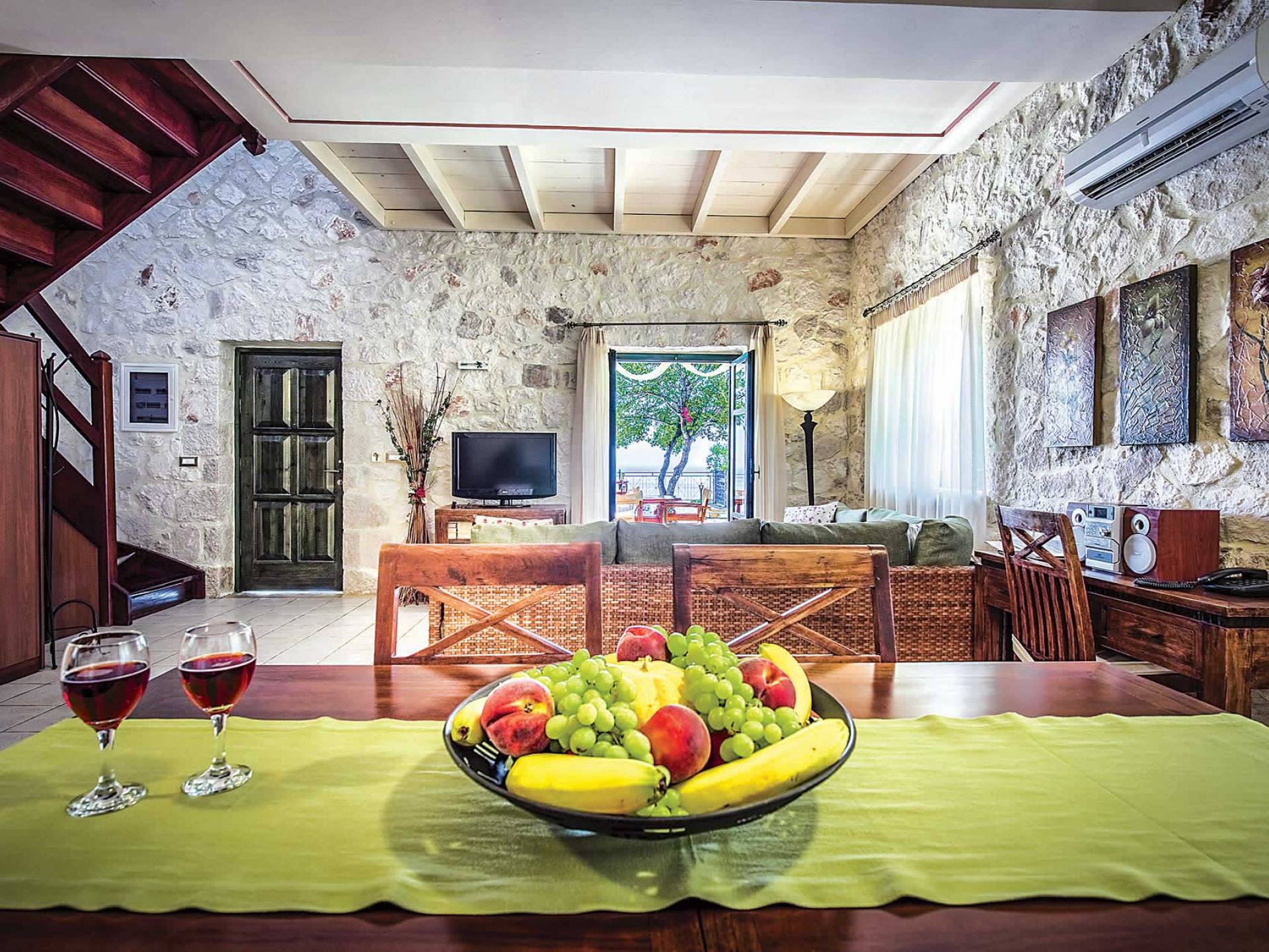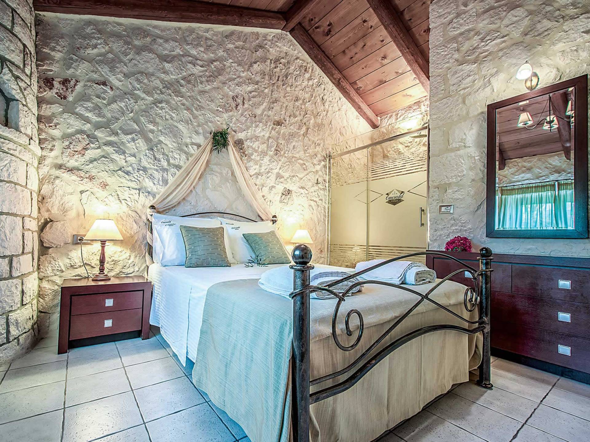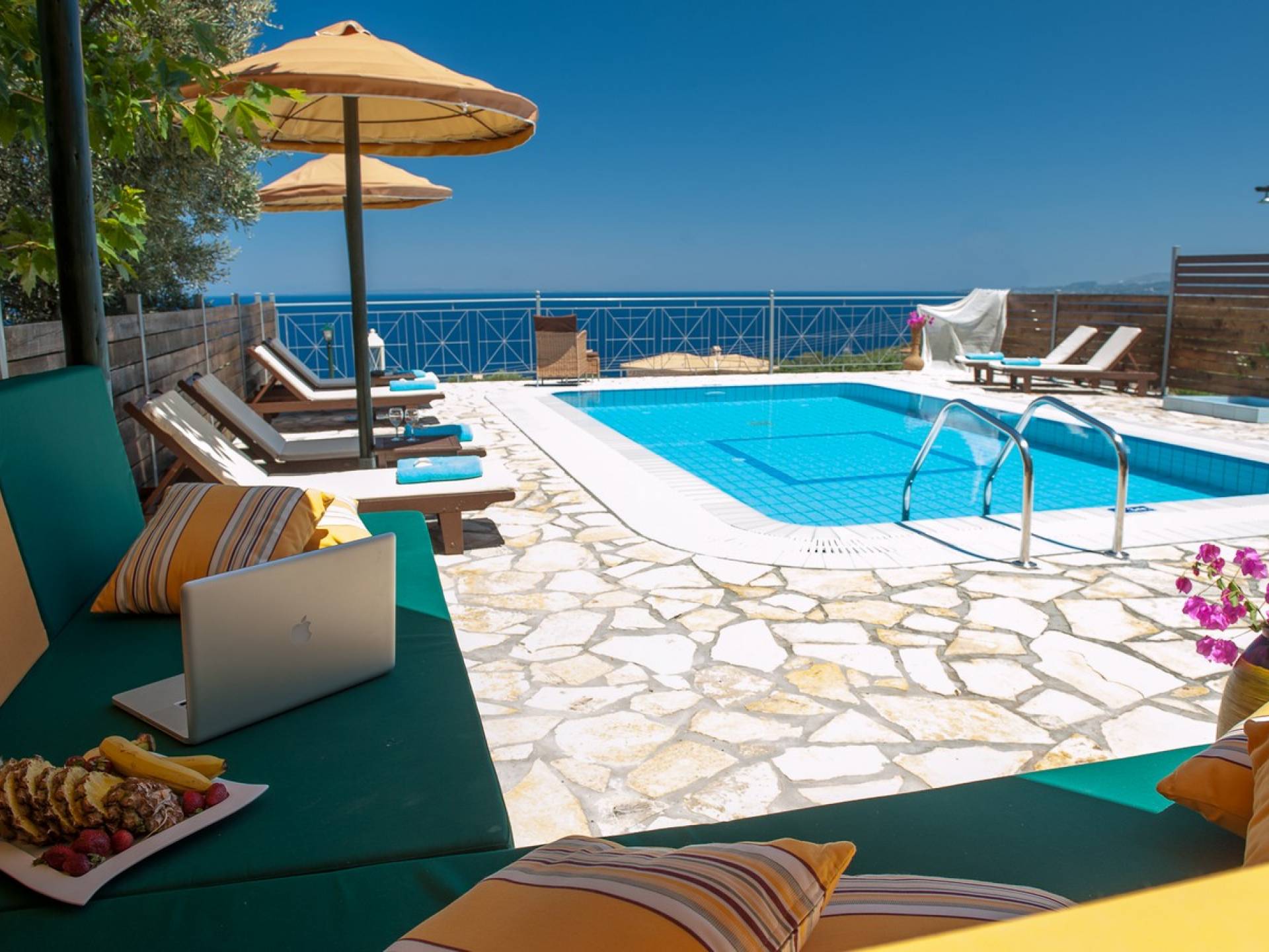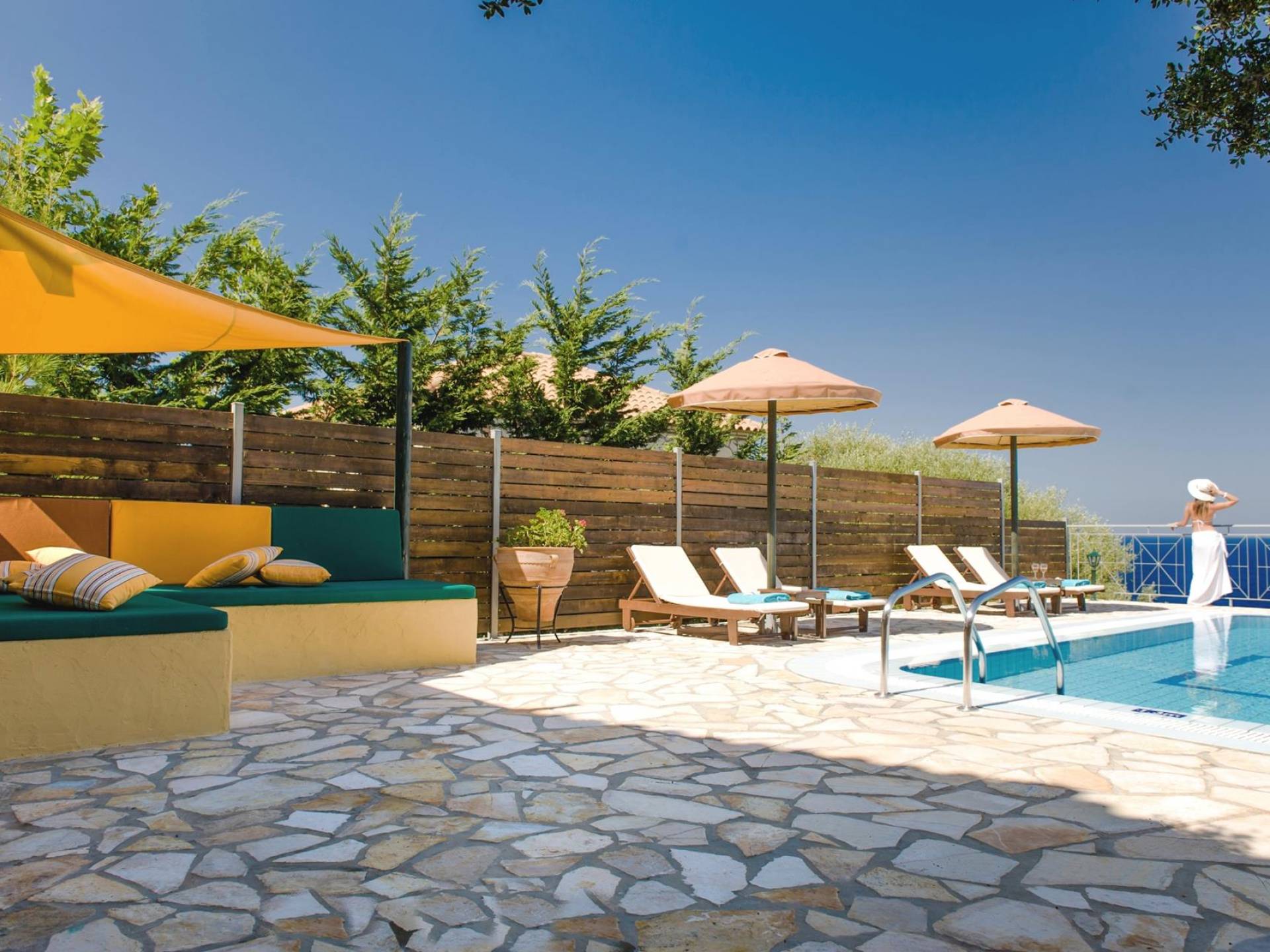 Деревянная лестница ведет в две спальни и ванную комнату наверху. В ванной комнате есть джакузи, фен и туалетные принадлежности. Снаружи вилла спроектирована так, чтобы обеспечить вам максимальную конфиденциальность и досуг во время отпуска. Огороженная территория площадью 185 кв.м с частным бассейном, шезлонгами и зонтиками, зоной отдыха, барбекю, обеденной зоной и великолепным видом на Ионическое море.