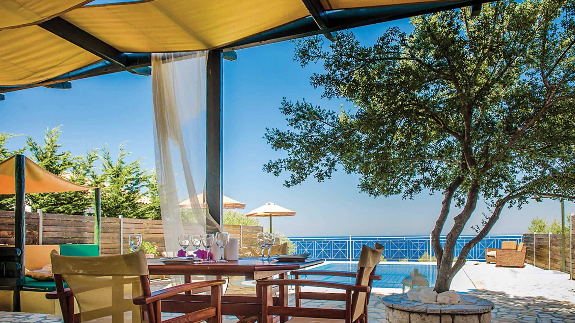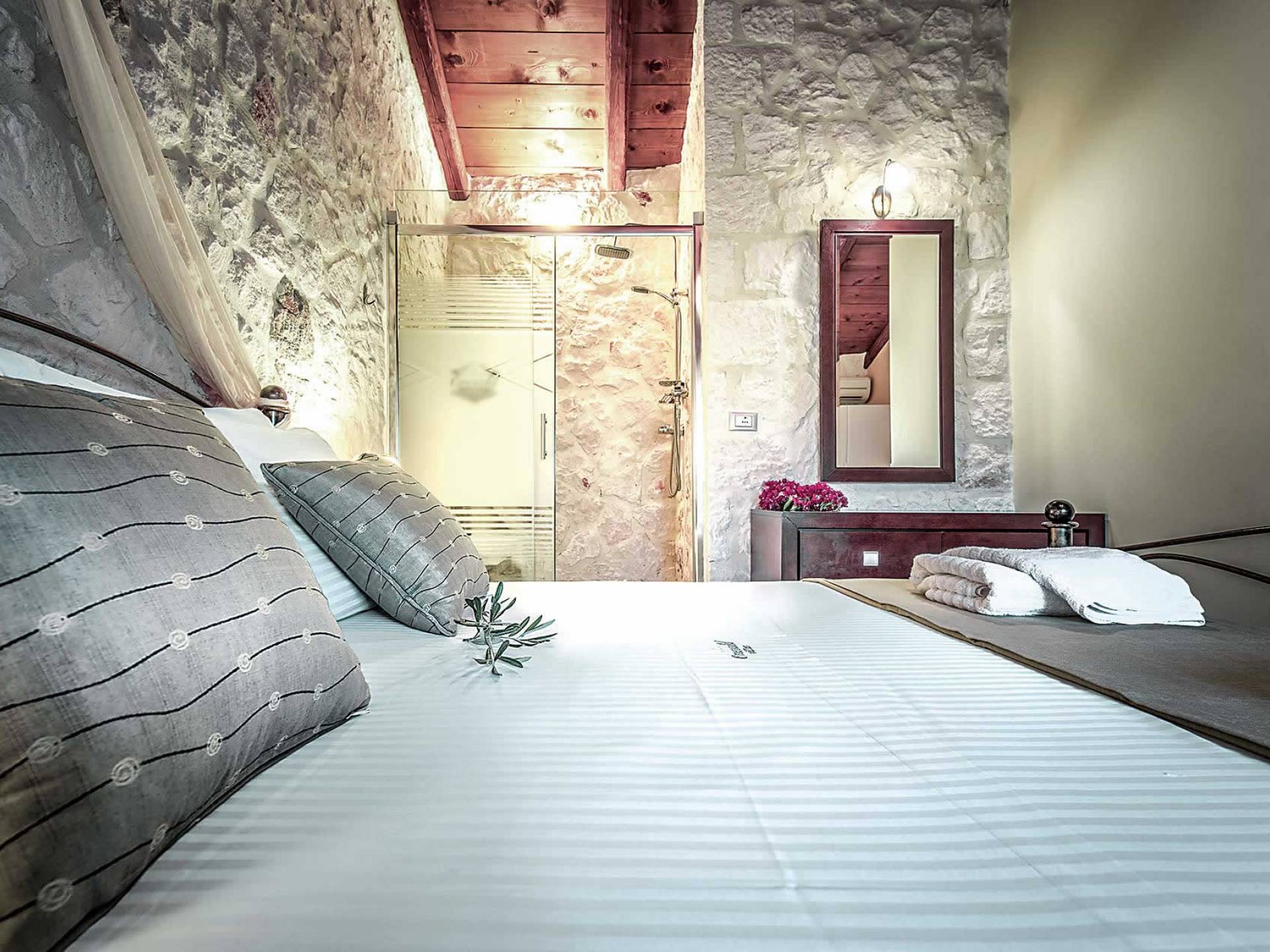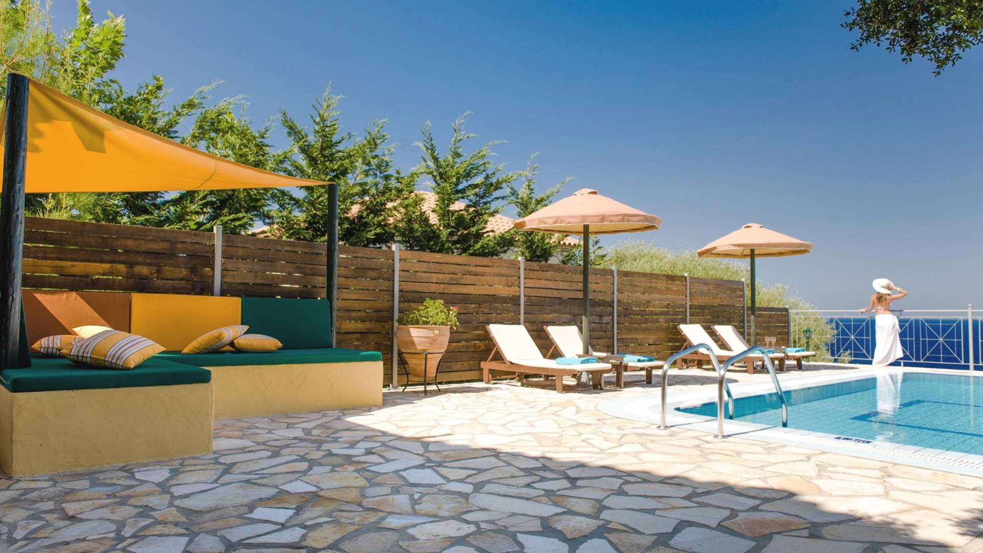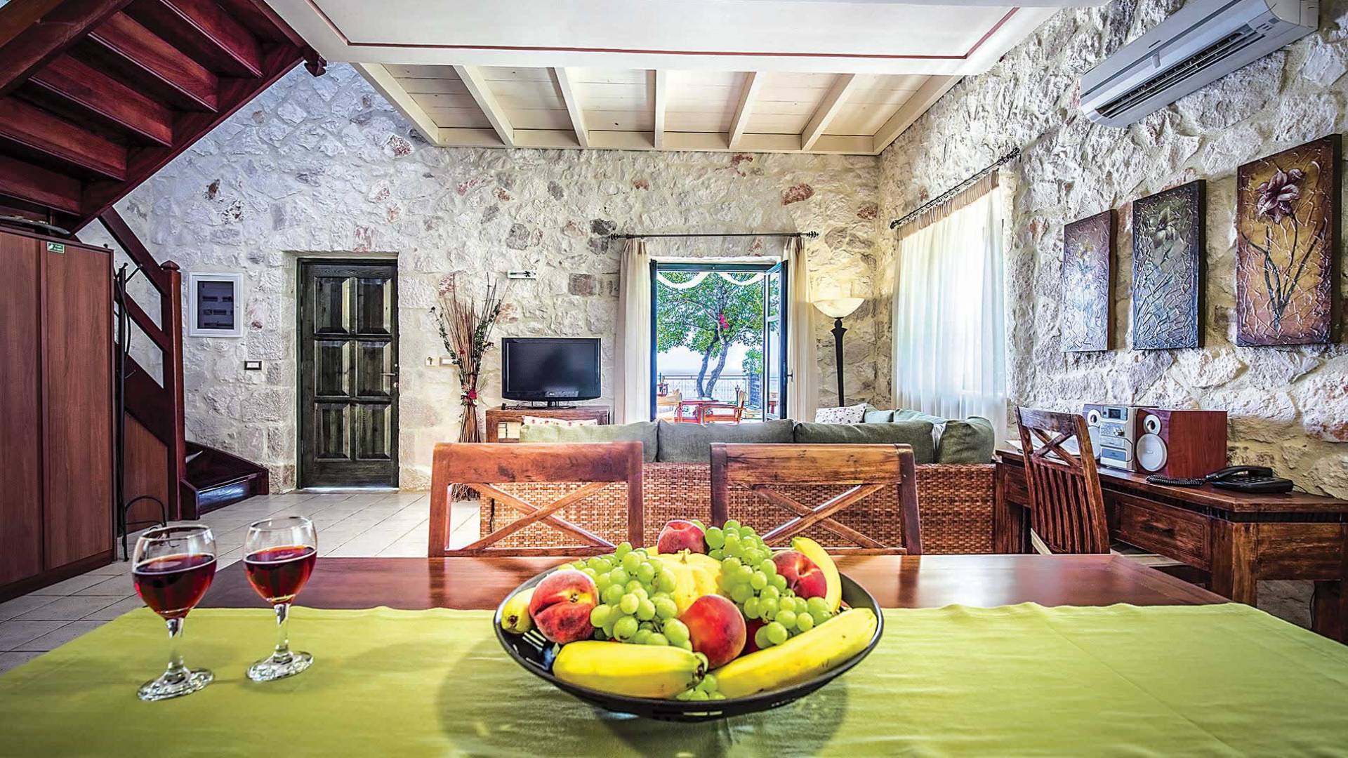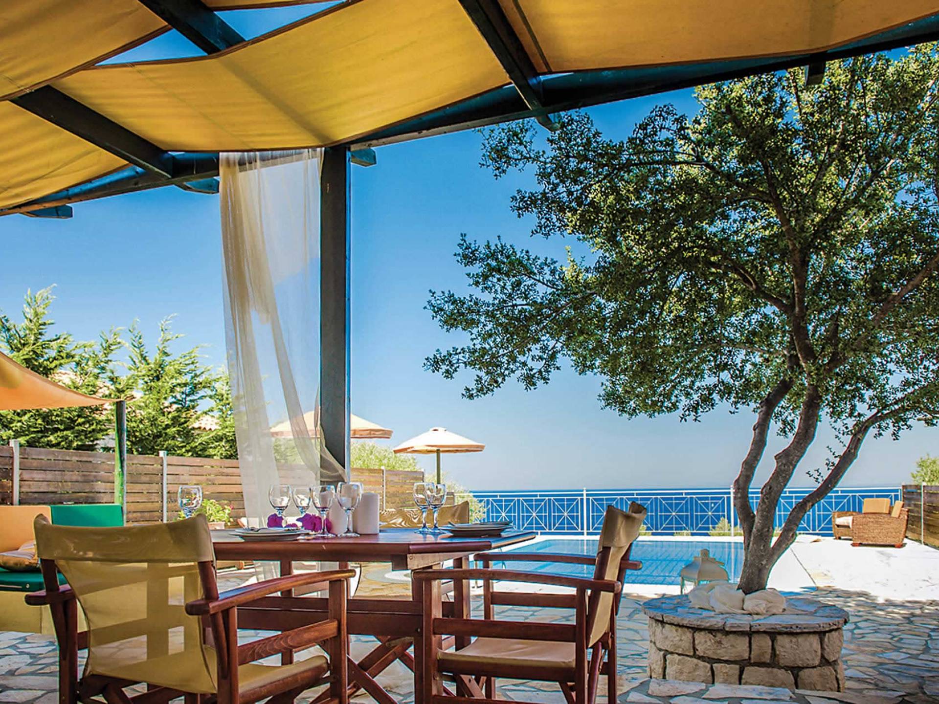 Деревянная лестница ведет в две спальни и ванную комнату наверху. В ванной комнате есть джакузи, фен и туалетные принадлежности. Снаружи вилла спроектирована так, чтобы обеспечить вам максимальную конфиденциальность и досуг во время отпуска. Огороженная территория площадью 185 кв.м с частным бассейном, шезлонгами и зонтиками, зоной отдыха, барбекю, обеденной зоной и великолепным видом на Ионическое море.