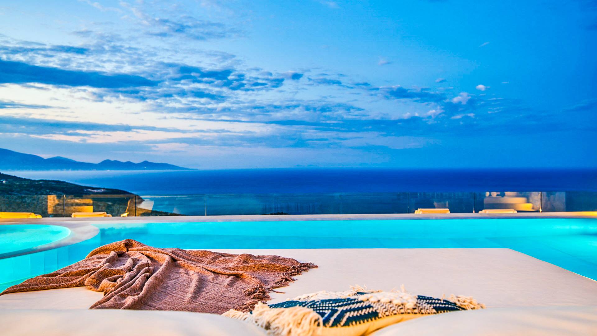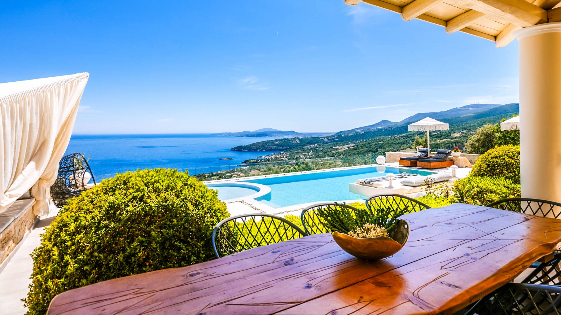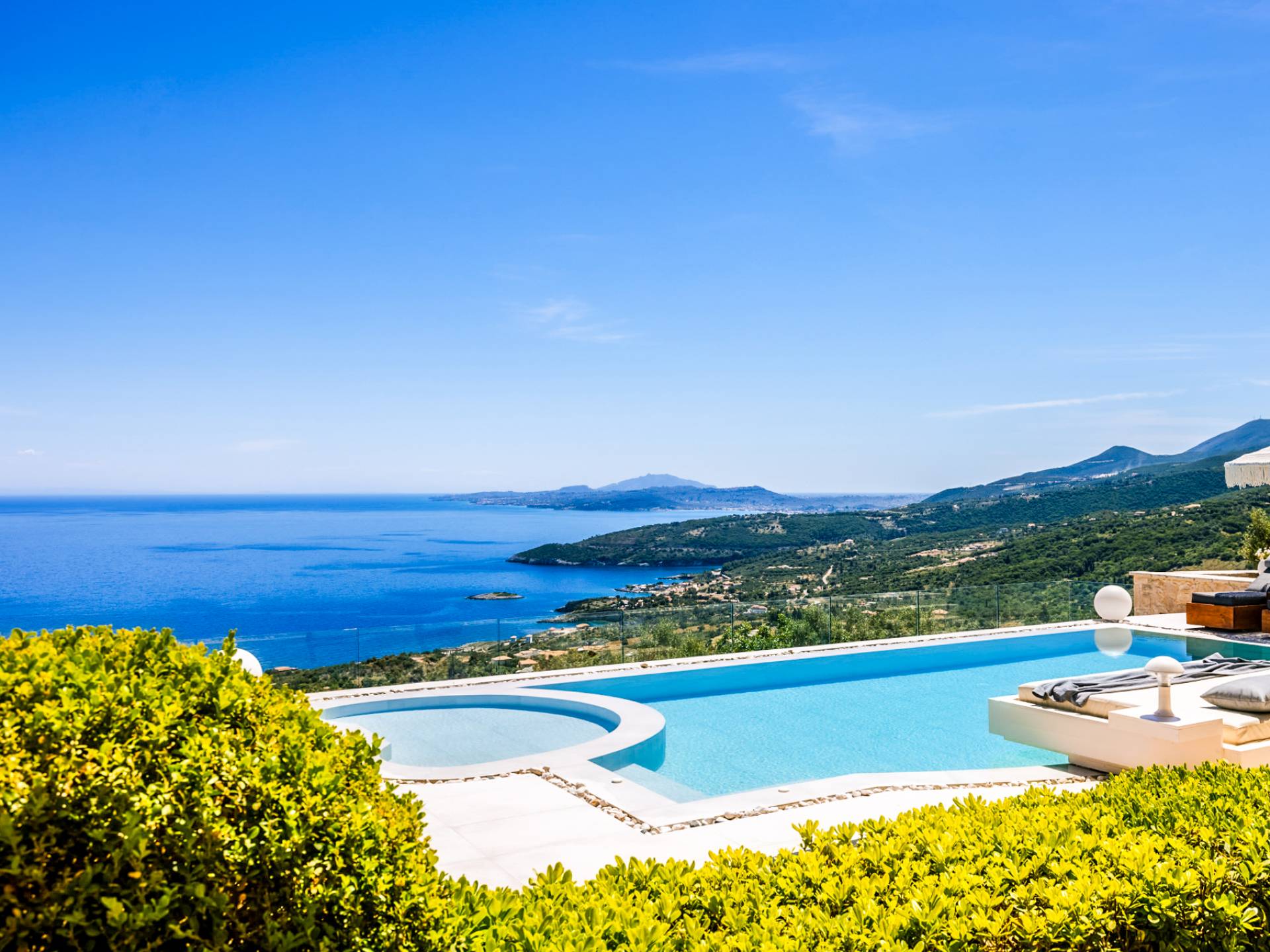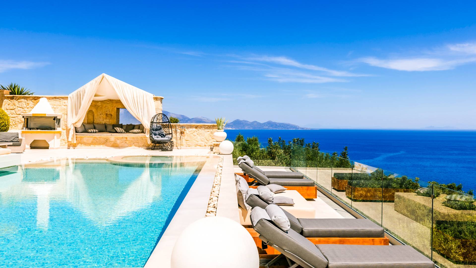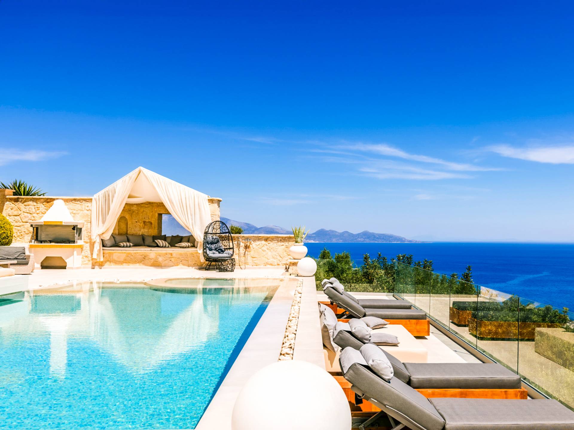 The outside of Neos Deluxe Villa Zakynthos is designed to offer you maximum privacy and unobstructed views over the Ionian Sea There is a swimming pool with hydro massage for up to four people, children’s pool, playground, lounge area, dining area, built BBQ, shower with cold/hot water, sunbeds and parasols.