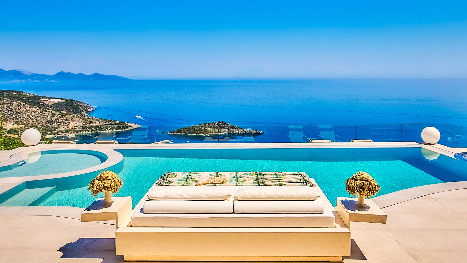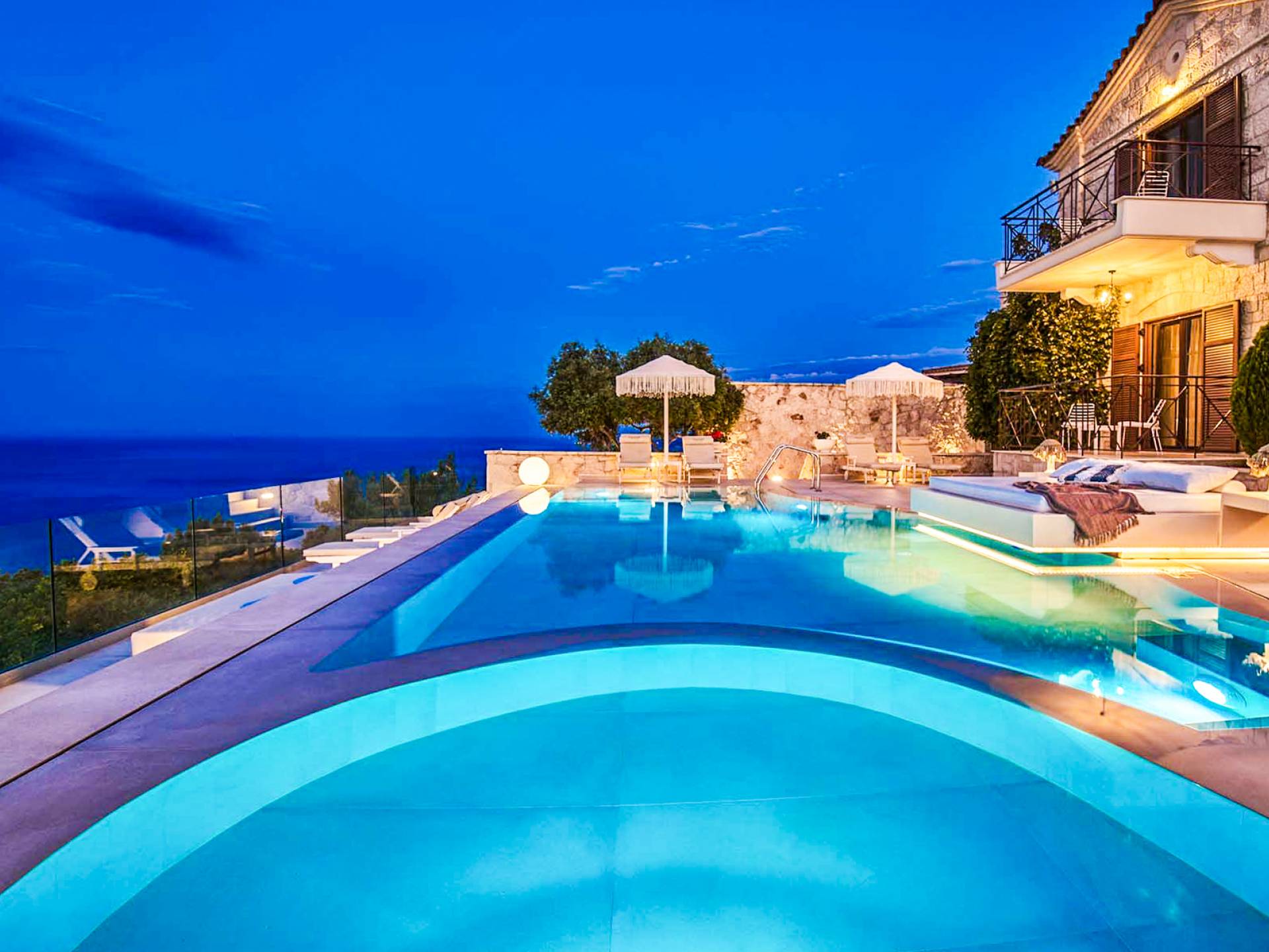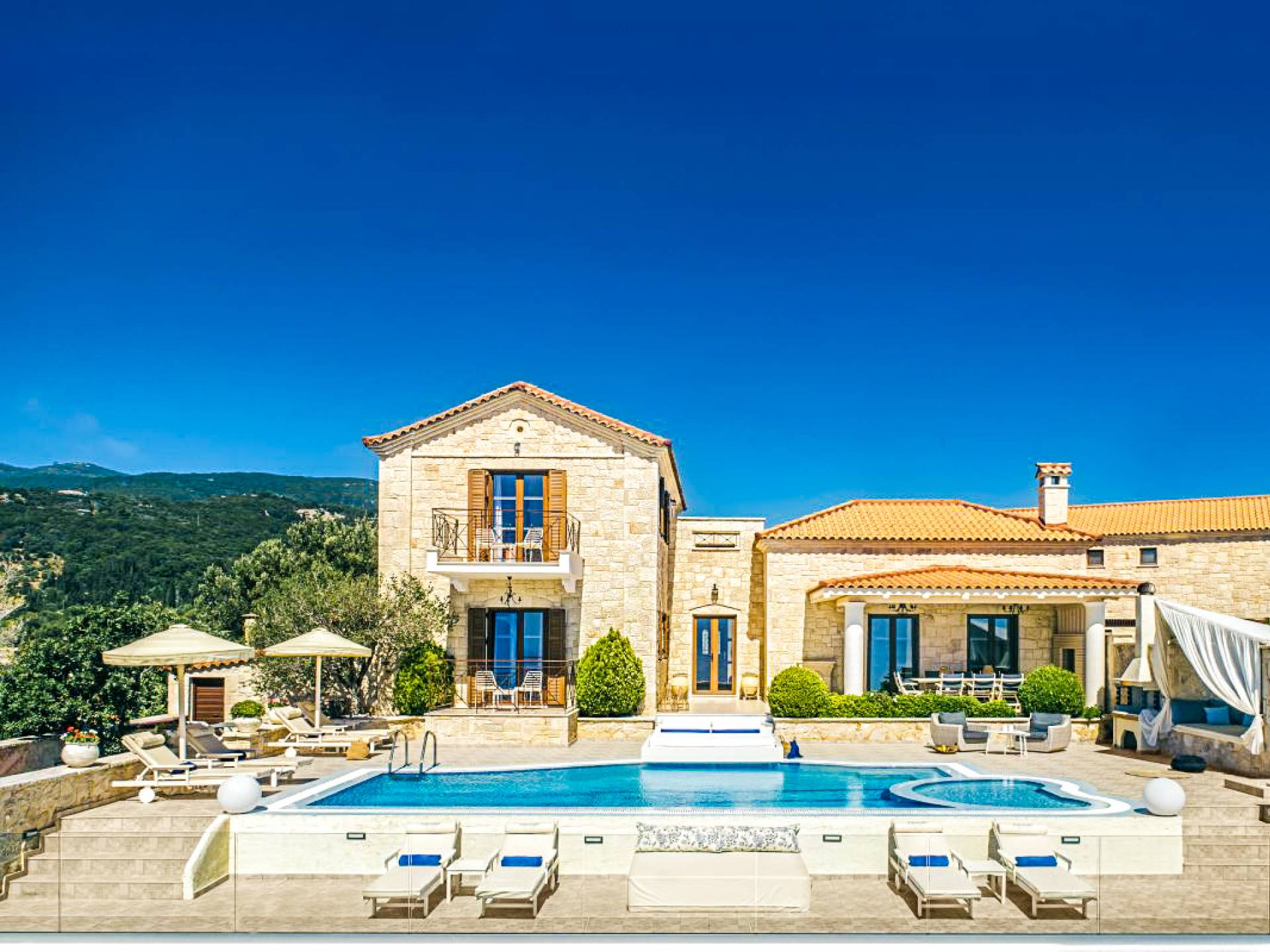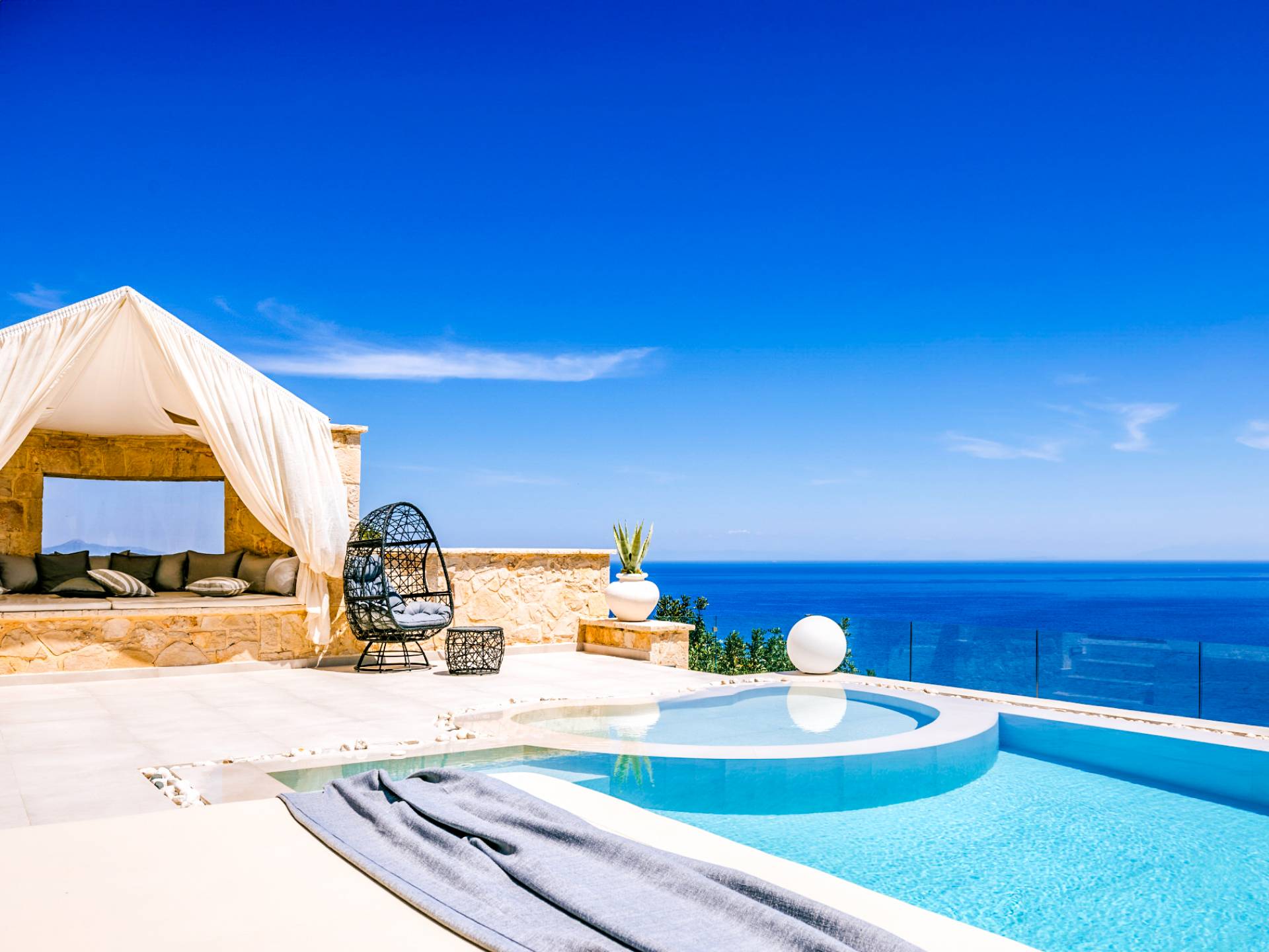 The outside of Neos Deluxe Villa Zakynthos is designed to offer you maximum privacy and unobstructed views over the Ionian Sea There is a swimming pool with hydro massage for up to four people, children’s pool, playground, lounge area, dining area, built BBQ, shower with cold/hot water, sunbeds and parasols.