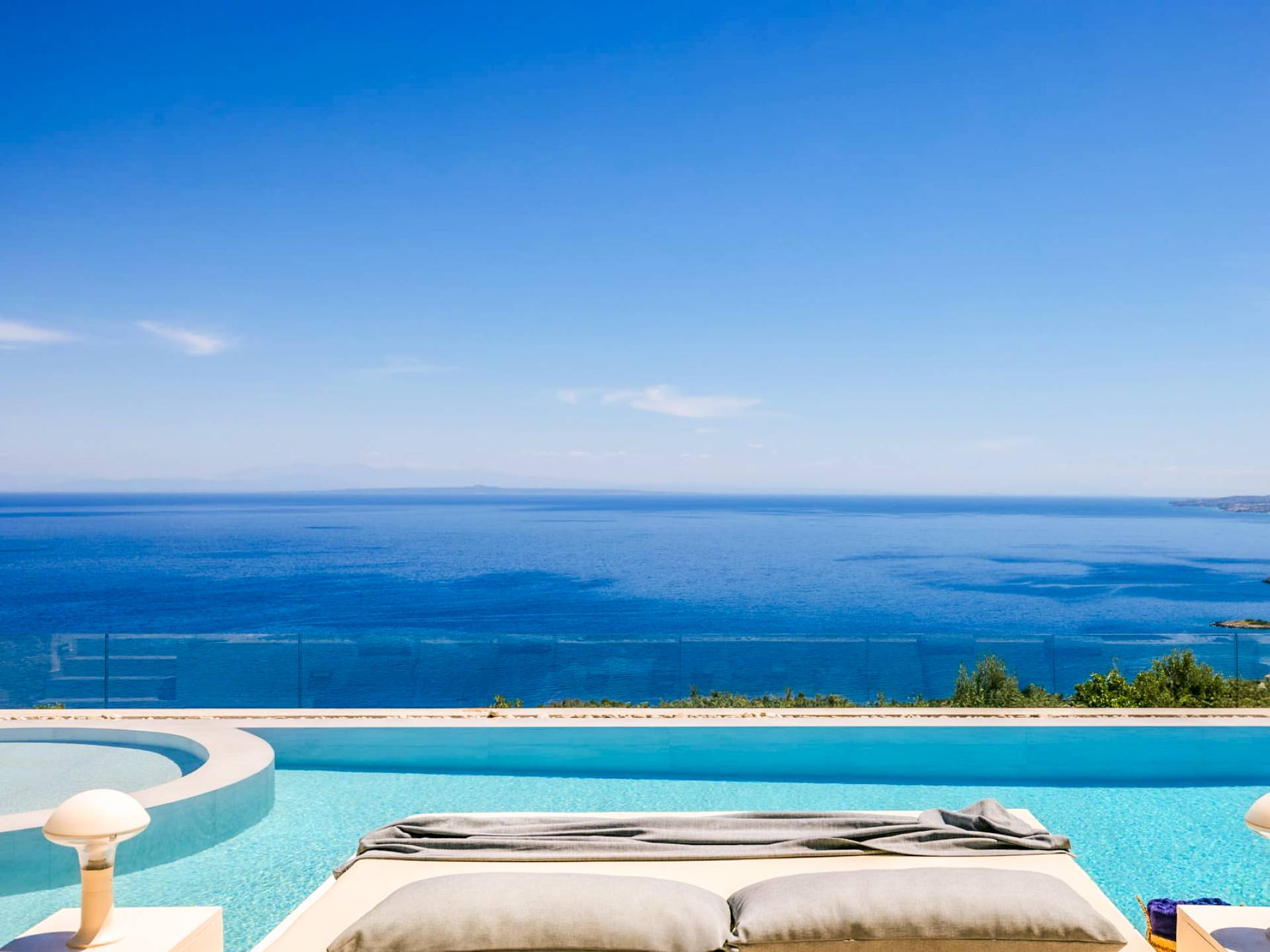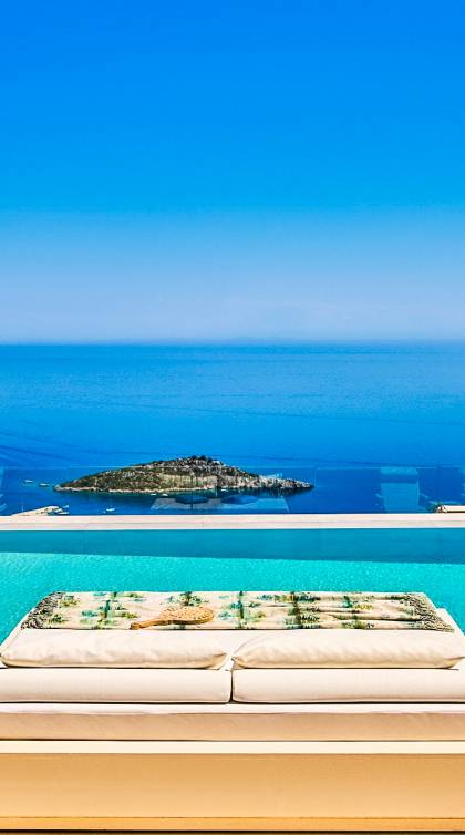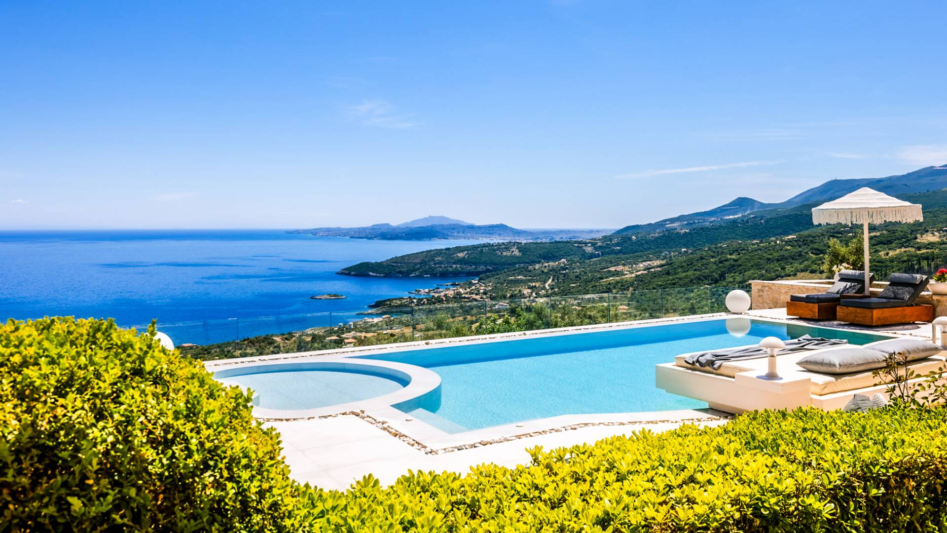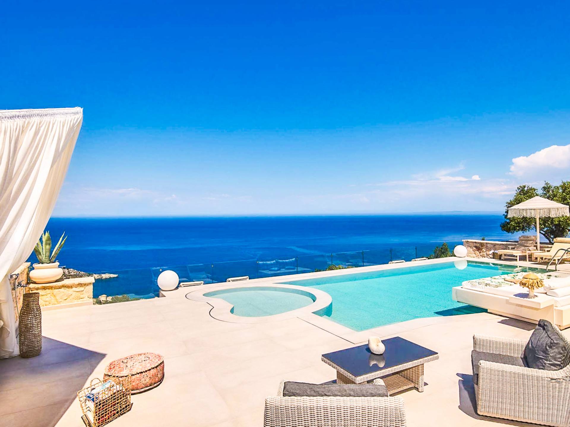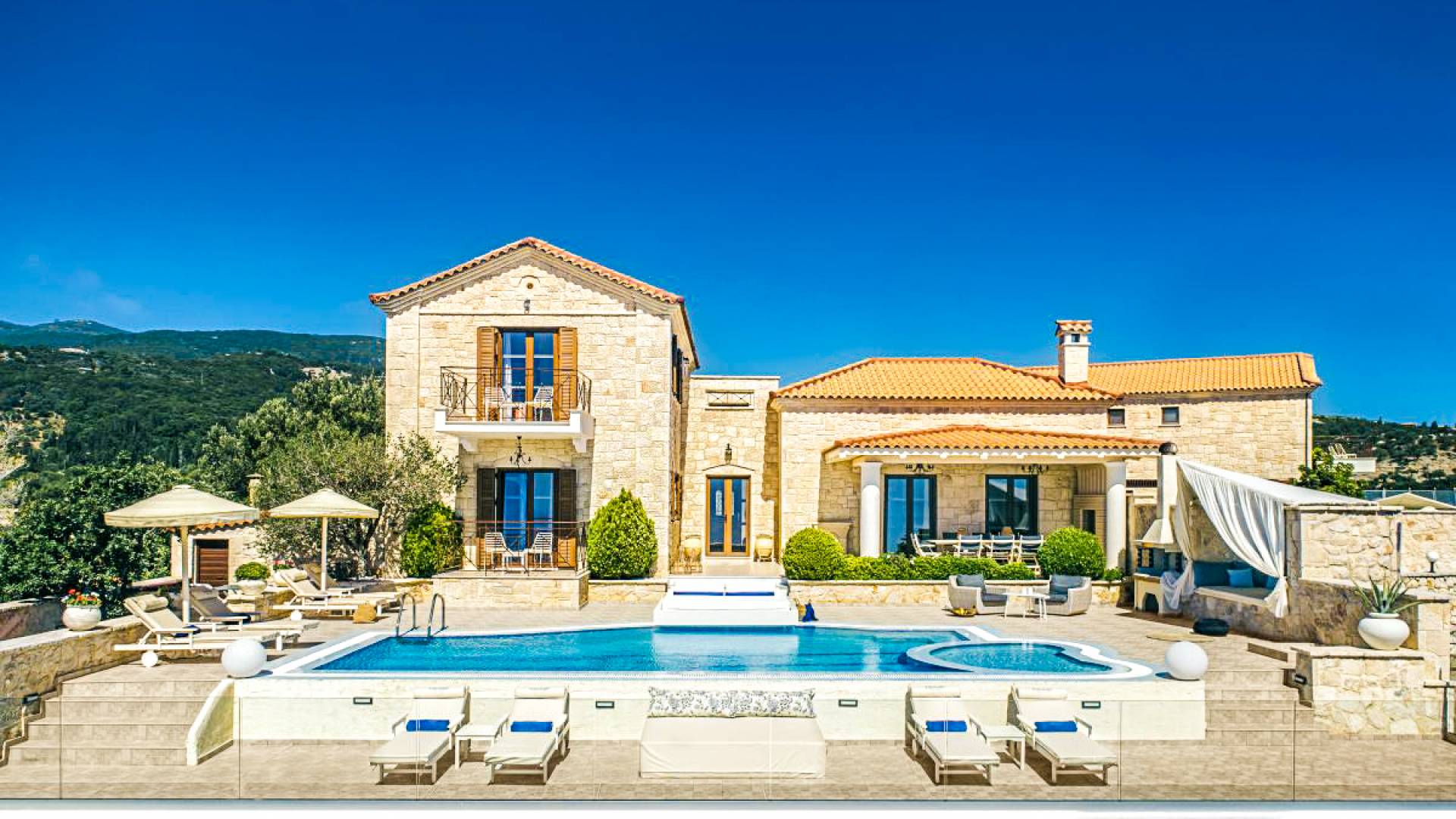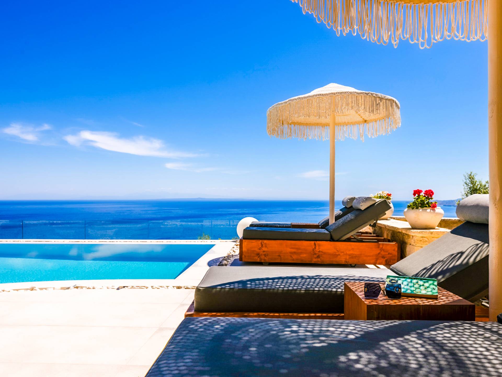 The outside of Neos Deluxe Villa Zakynthos is designed to offer you maximum privacy and unobstructed views over the Ionian Sea There is a swimming pool with hydro massage for up to four people, children’s pool, playground, lounge area, dining area, built BBQ, shower with cold/hot water, sunbeds and parasols.