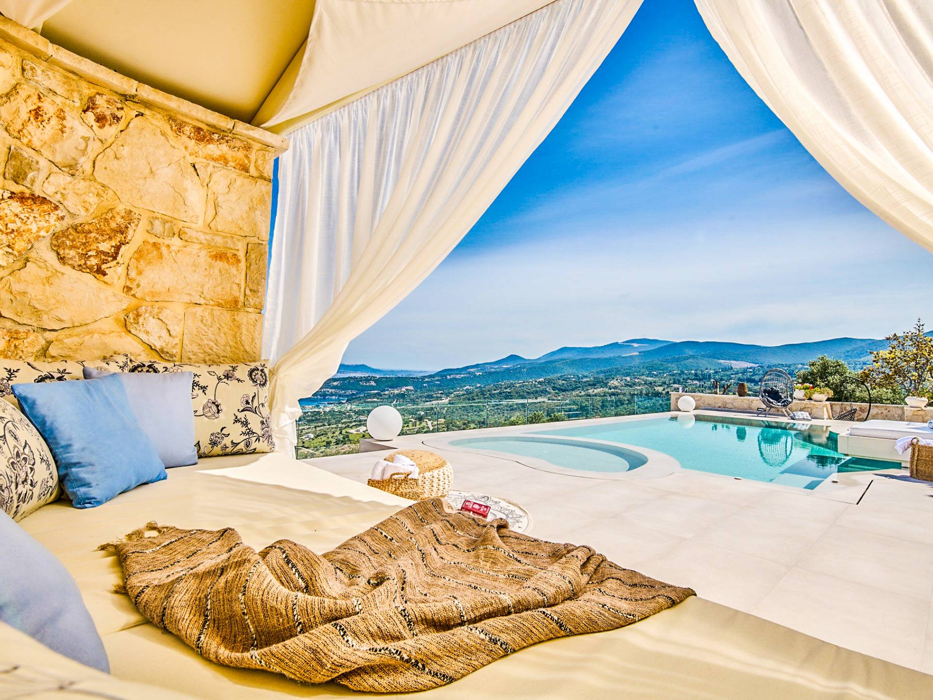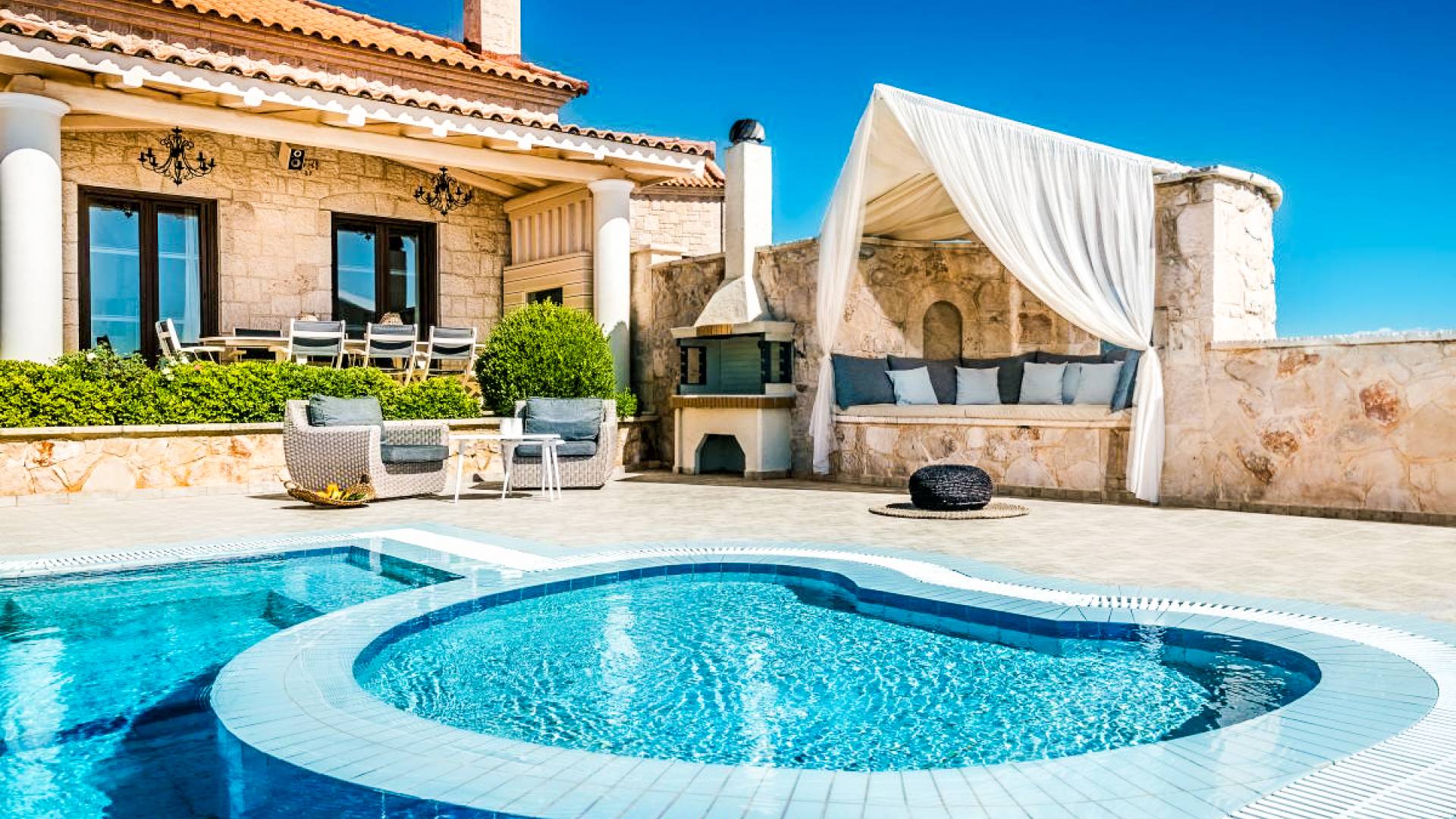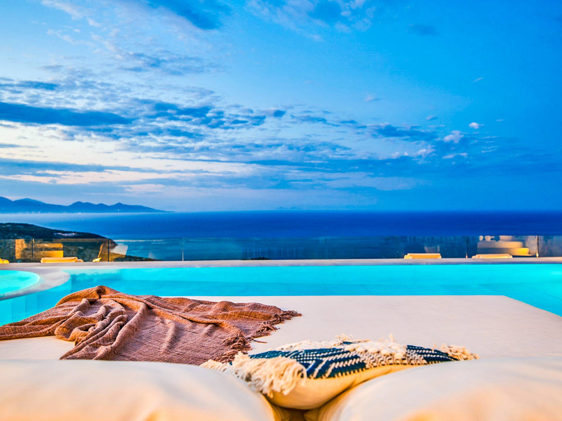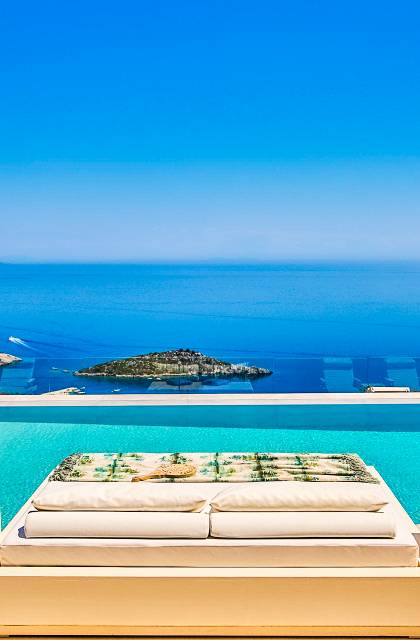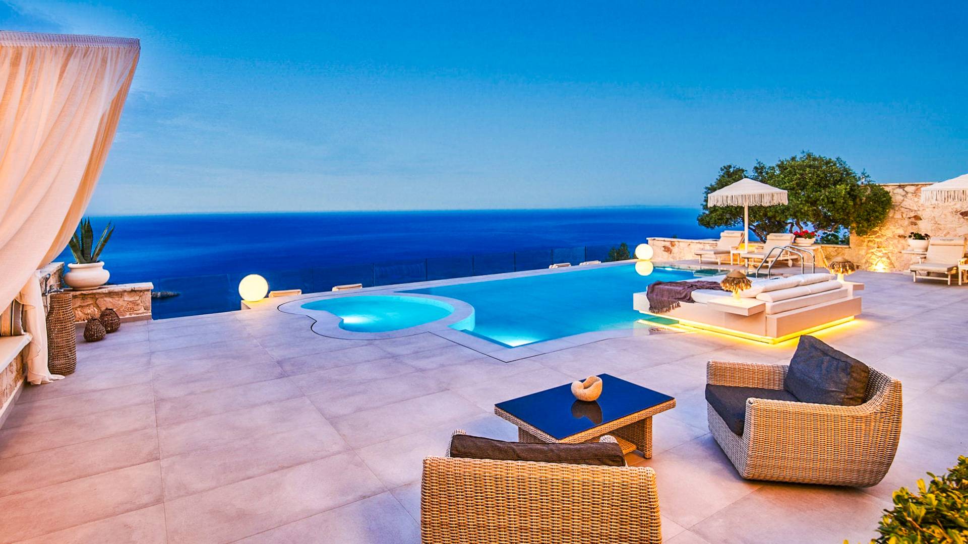 The outside of Neos Deluxe Villa Zakynthos is designed to offer you maximum privacy and unobstructed views over the Ionian Sea There is a swimming pool with hydro massage for up to four people, children’s pool, playground, lounge area, dining area, built BBQ, shower with cold/hot water, sunbeds and parasols.