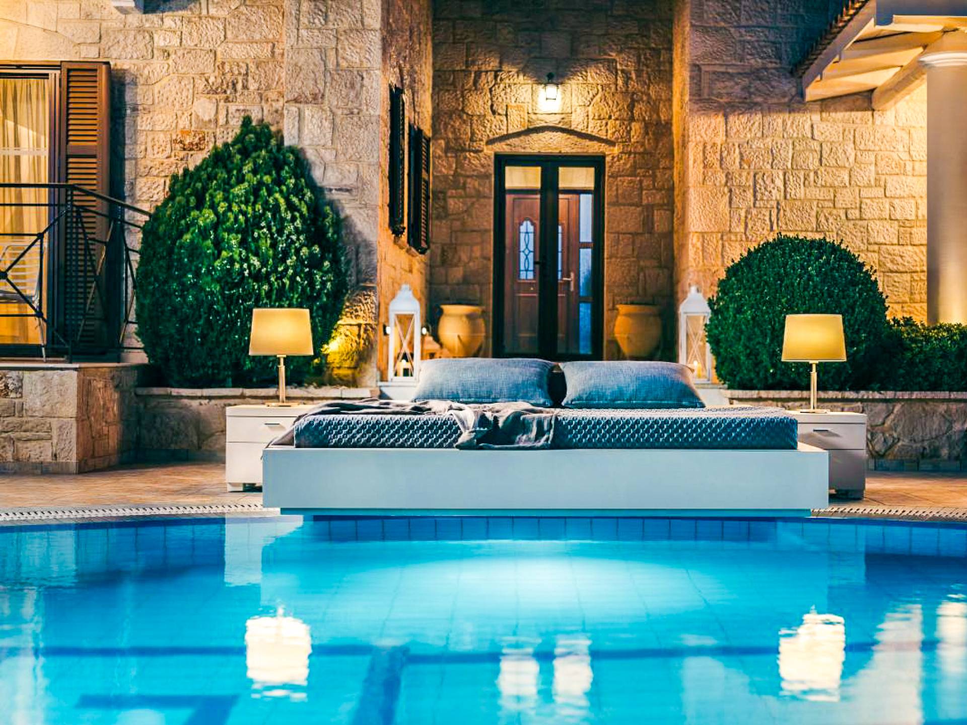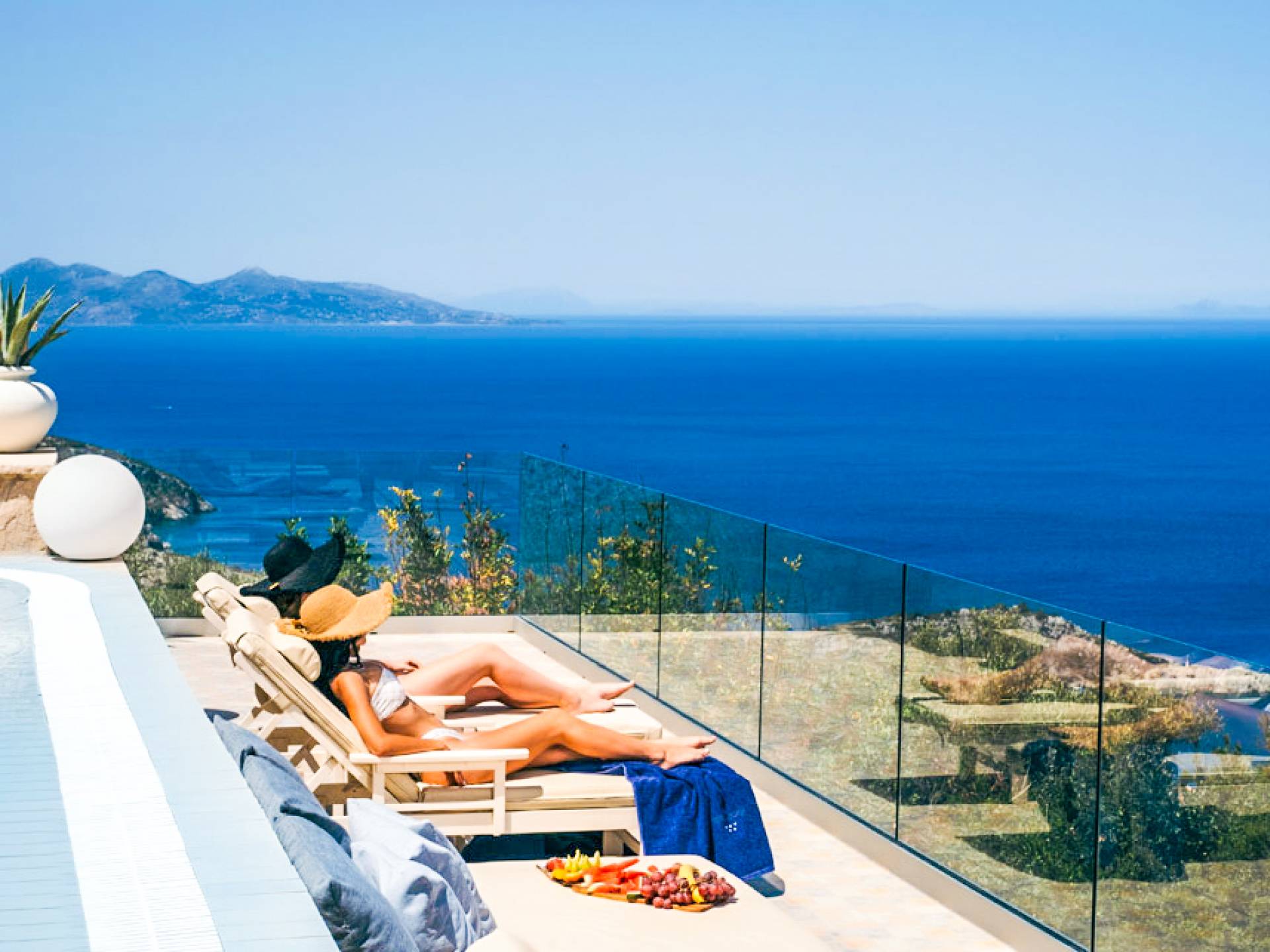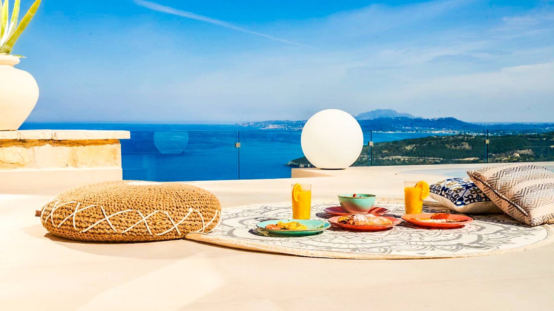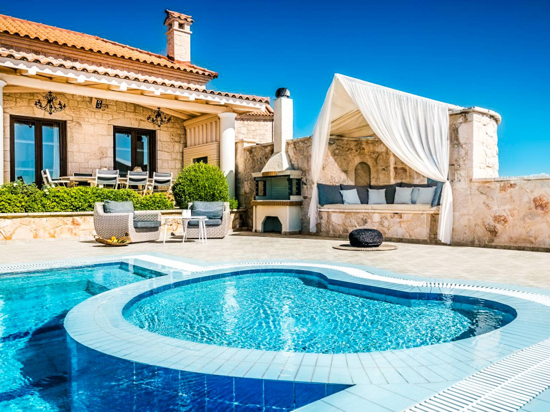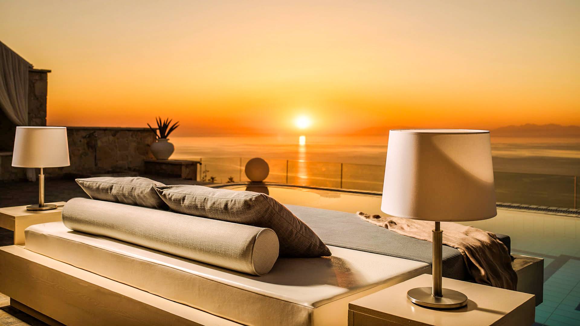 The outside of Neos Deluxe Villa Zakynthos is designed to offer you maximum privacy and unobstructed views over the Ionian Sea There is a swimming pool with hydro massage for up to four people, children’s pool, playground, lounge area, dining area, built BBQ, shower with cold/hot water, sunbeds and parasols.