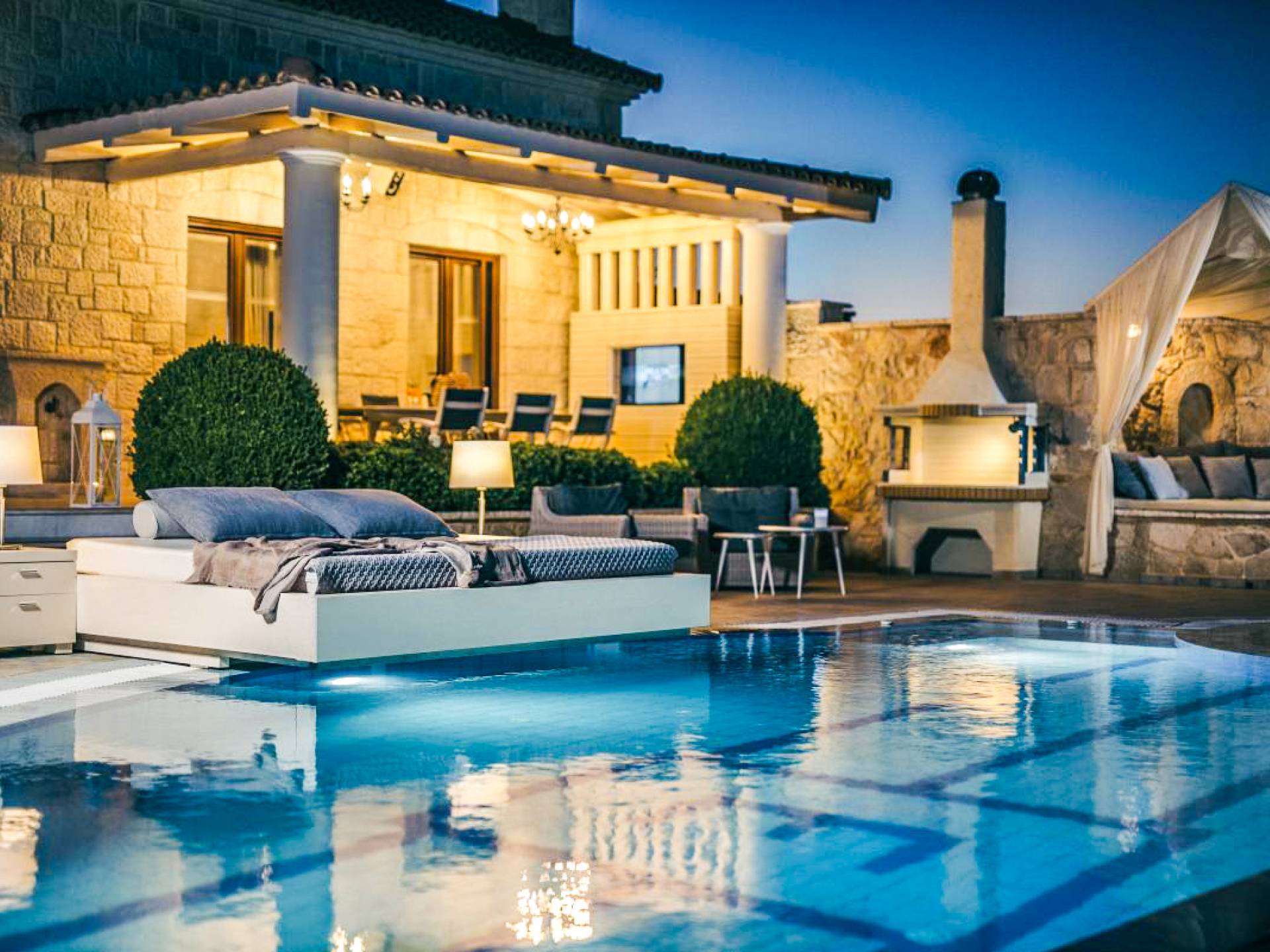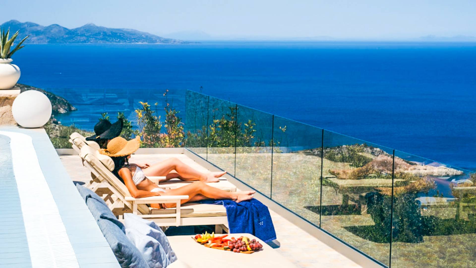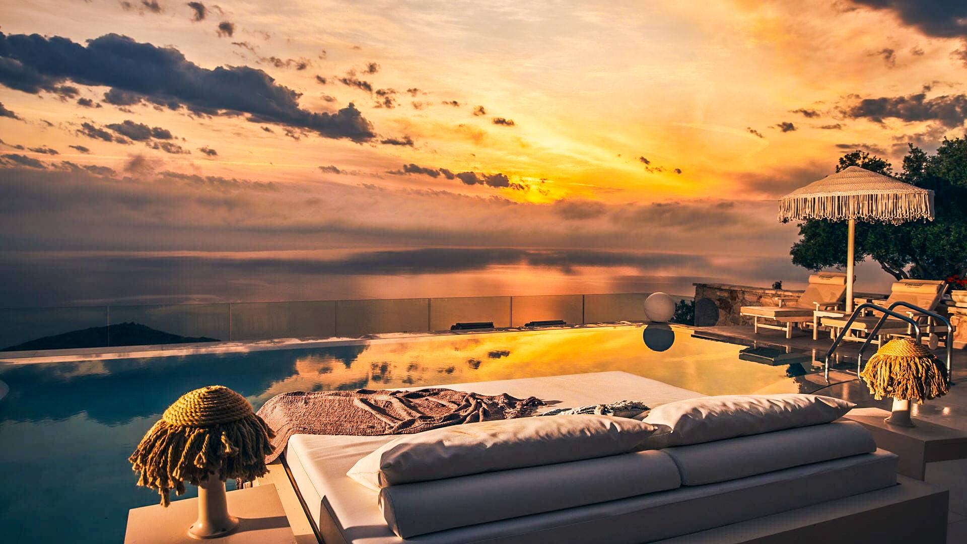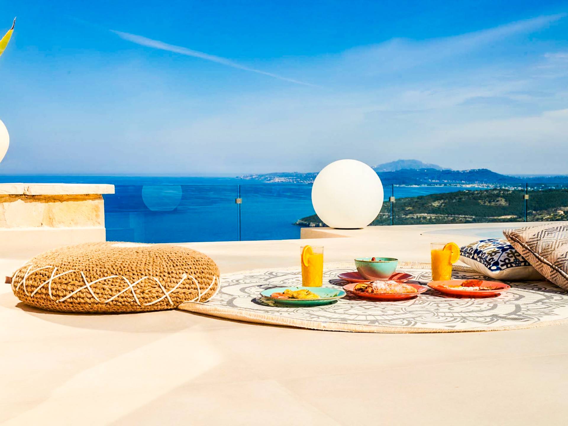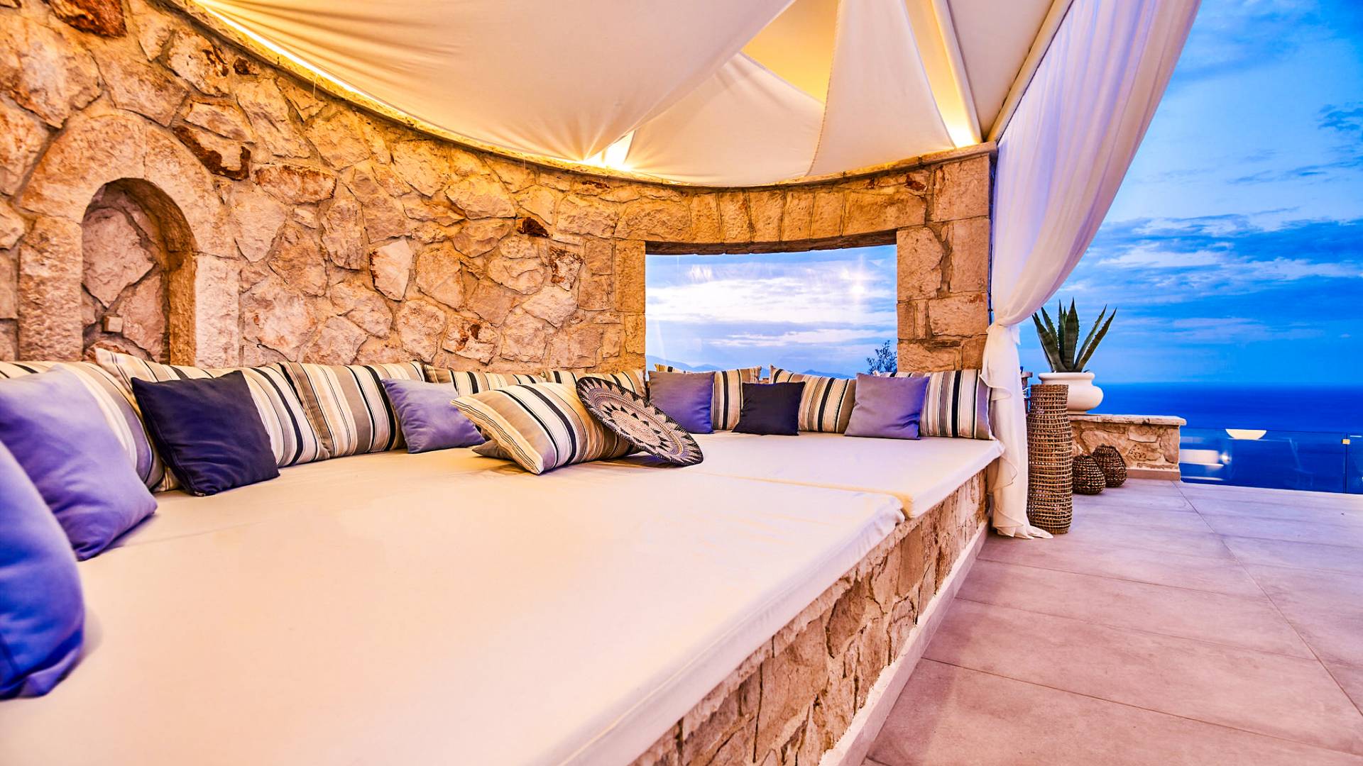 The outside of Neos Deluxe Villa Zakynthos is designed to offer you maximum privacy and unobstructed views over the Ionian Sea There is a swimming pool with hydro massage for up to four people, children’s pool, playground, lounge area, dining area, built BBQ, shower with cold/hot water, sunbeds and parasols.