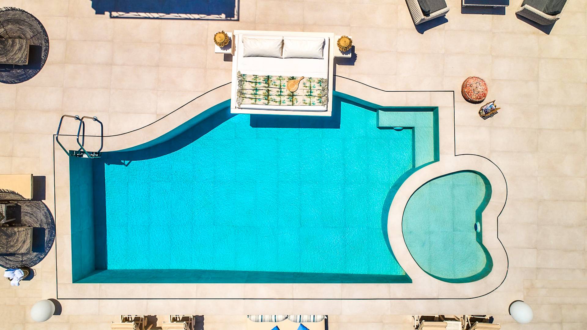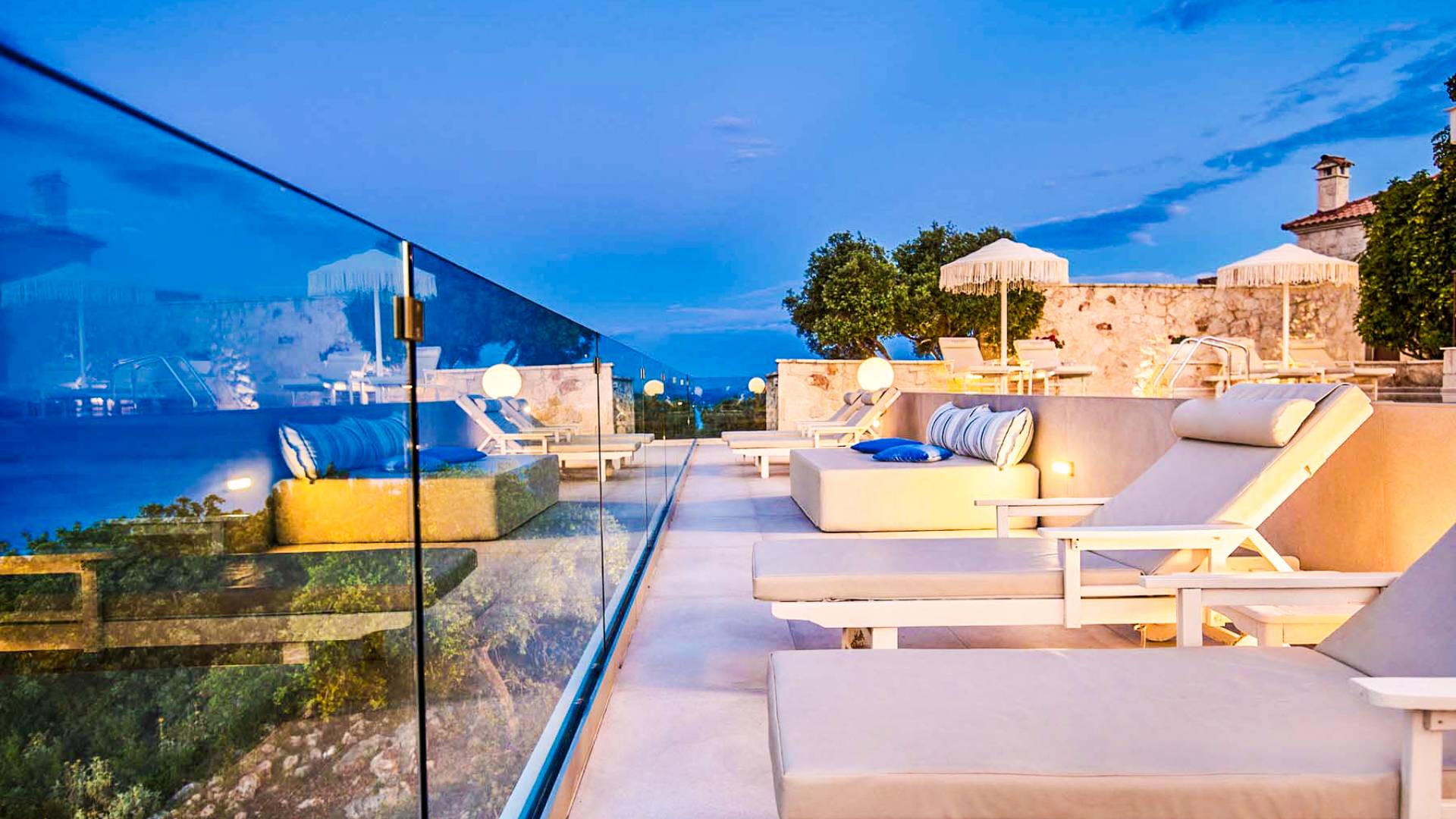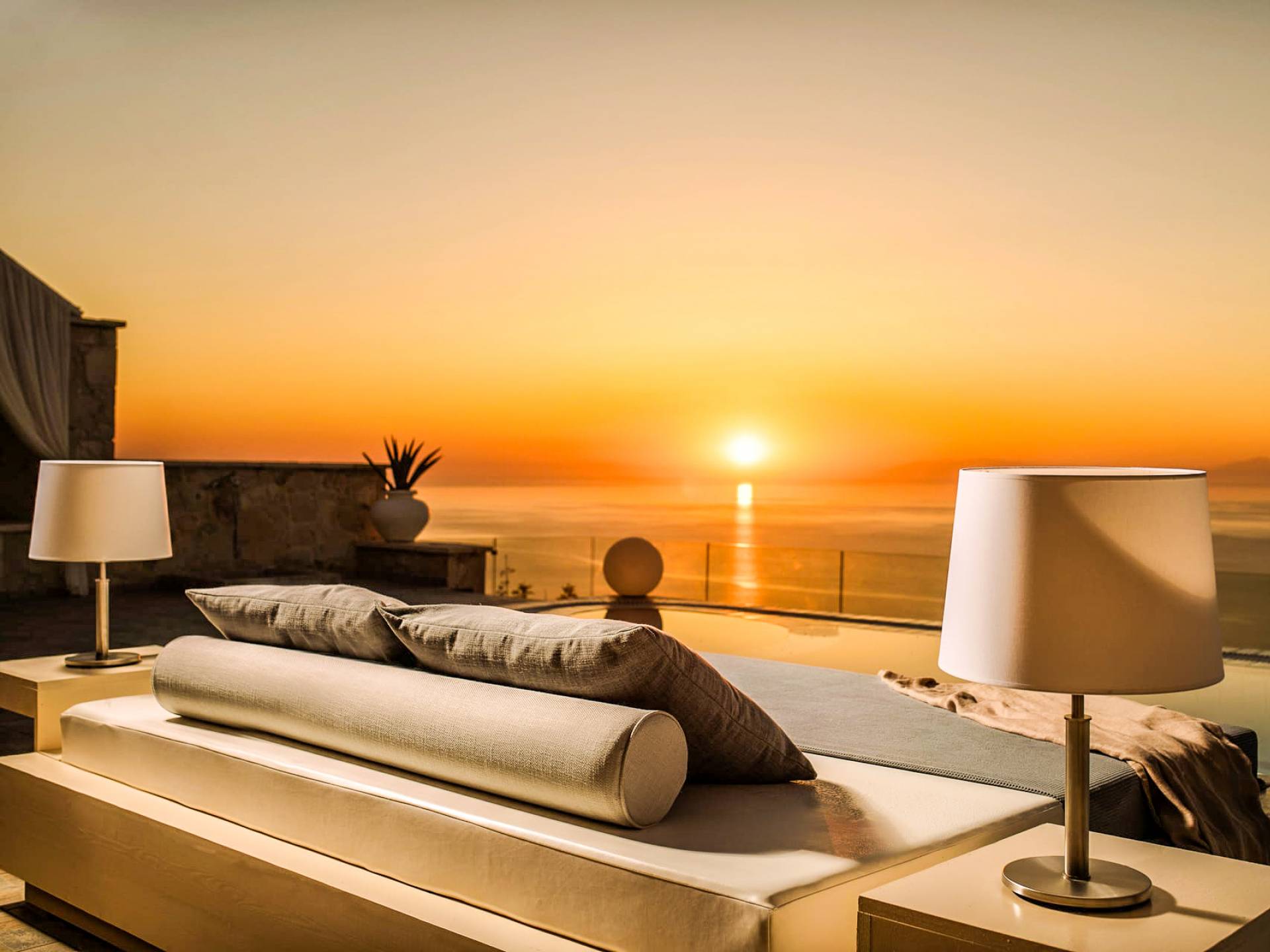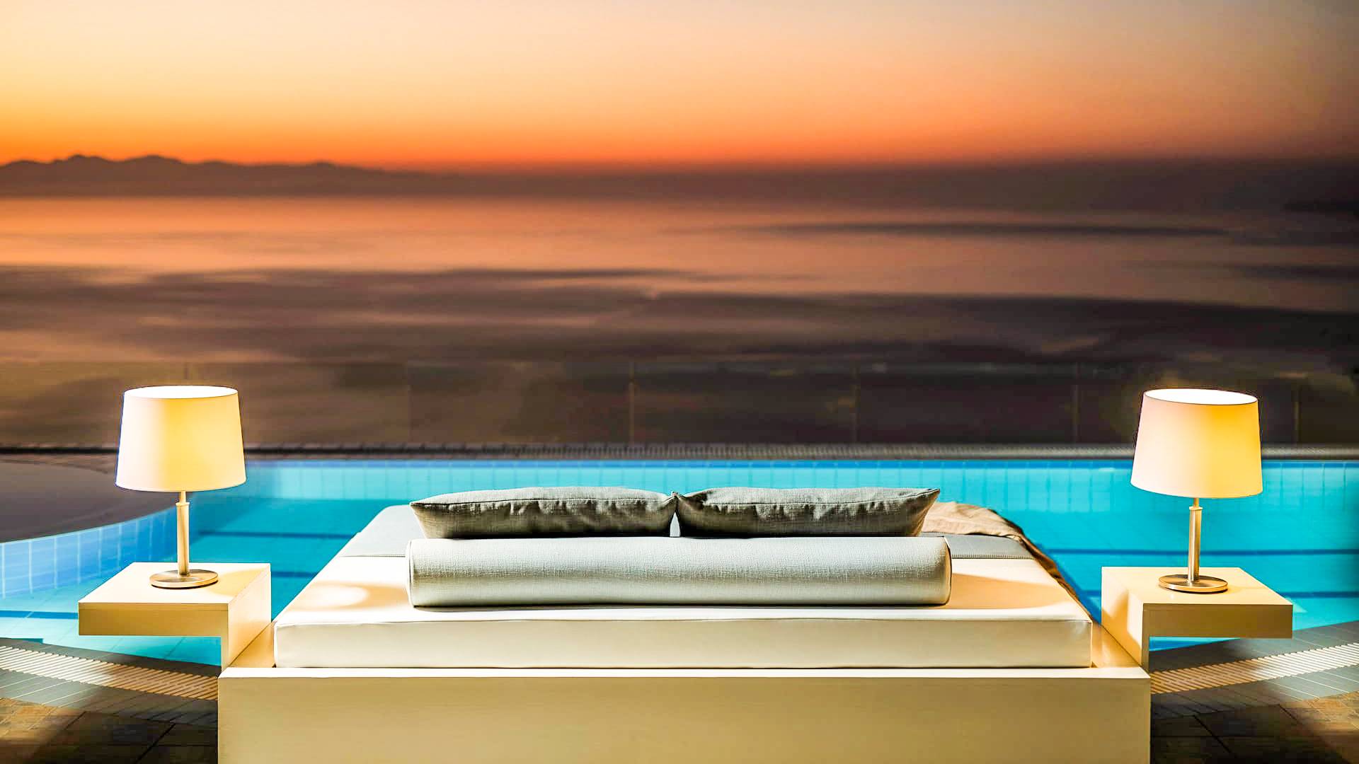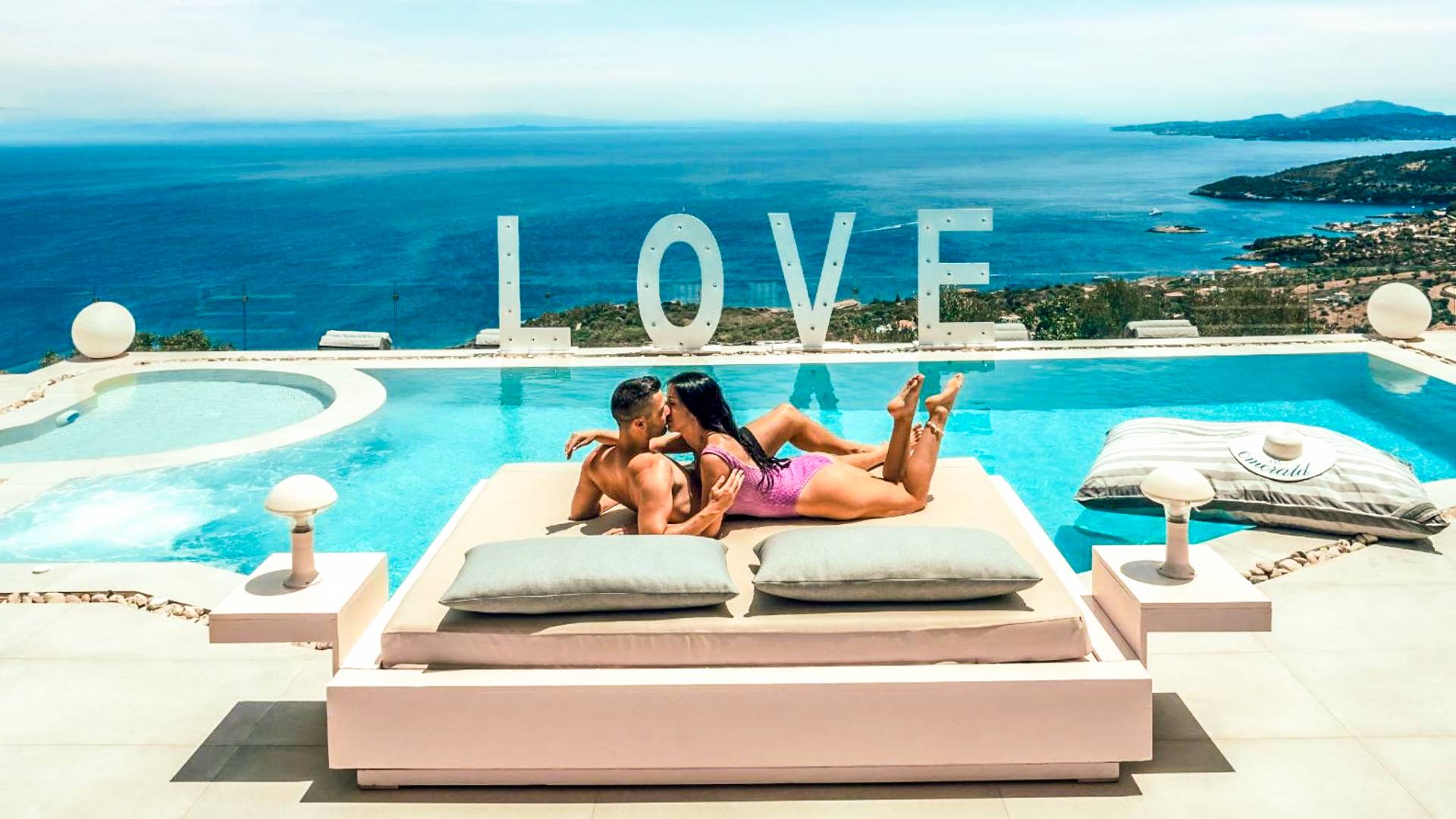 The outside of Neos Deluxe Villa Zakynthos is designed to offer you maximum privacy and unobstructed views over the Ionian Sea There is a swimming pool with hydro massage for up to four people, children’s pool, playground, lounge area, dining area, built BBQ, shower with cold/hot water, sunbeds and parasols.