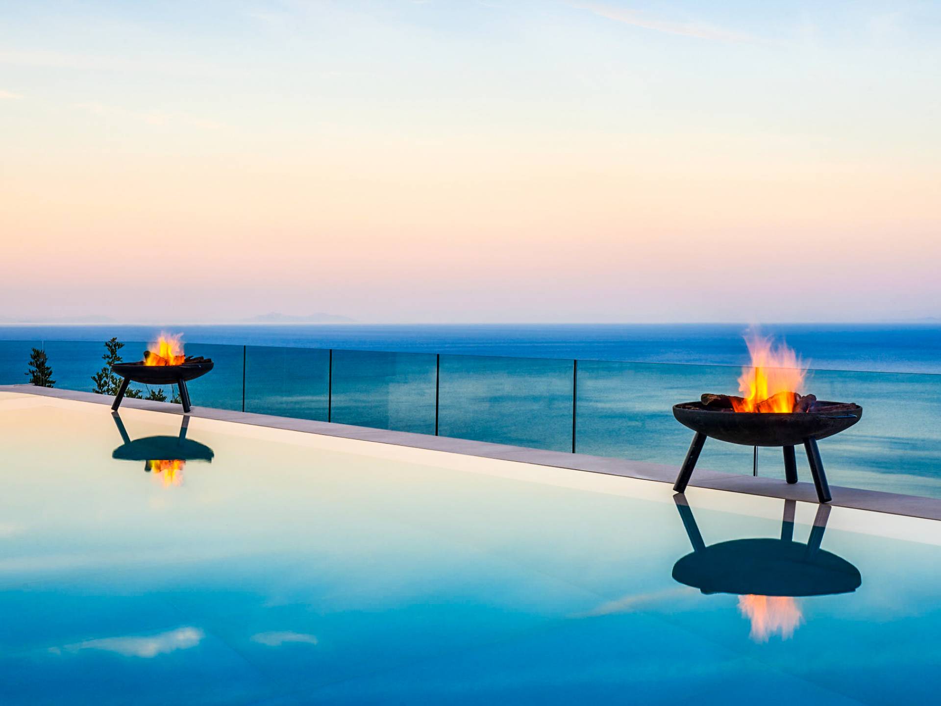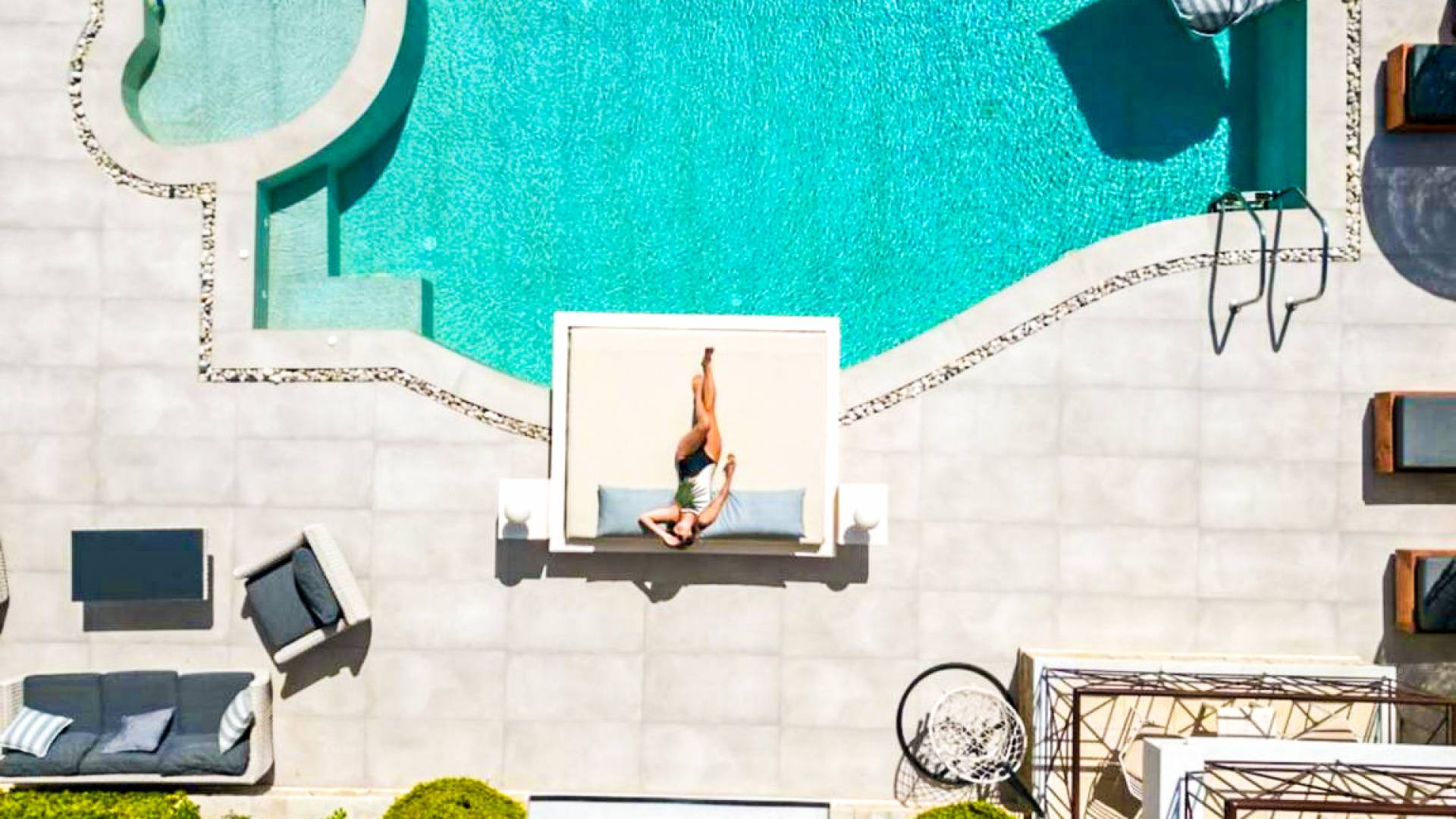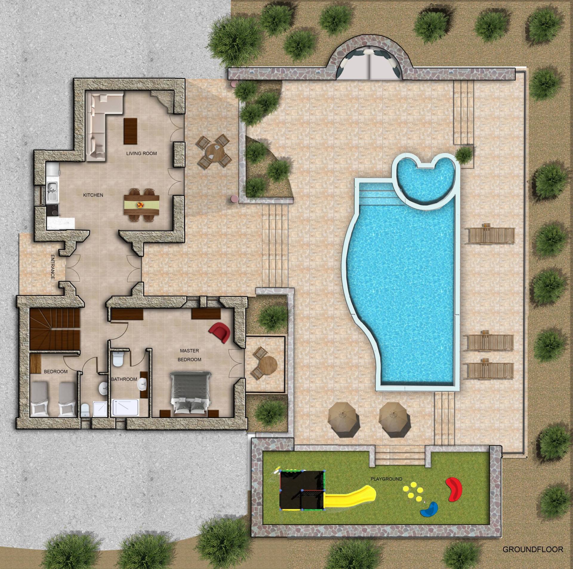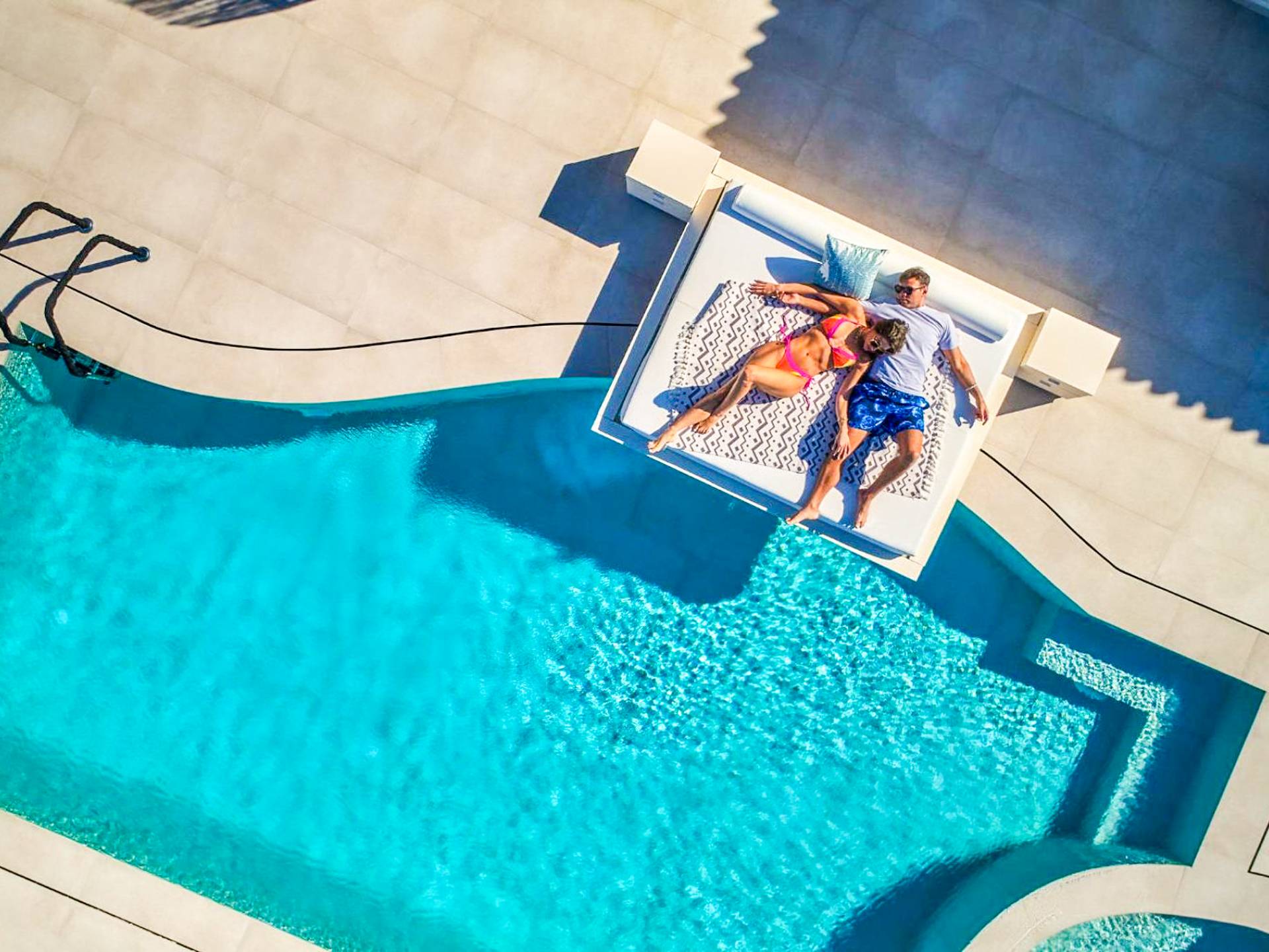 The outside of Neos Deluxe Villa Zakynthos is designed to offer you maximum privacy and unobstructed views over the Ionian Sea There is a swimming pool with hydro massage for up to four people, children’s pool, playground, lounge area, dining area, built BBQ, shower with cold/hot water, sunbeds and parasols.