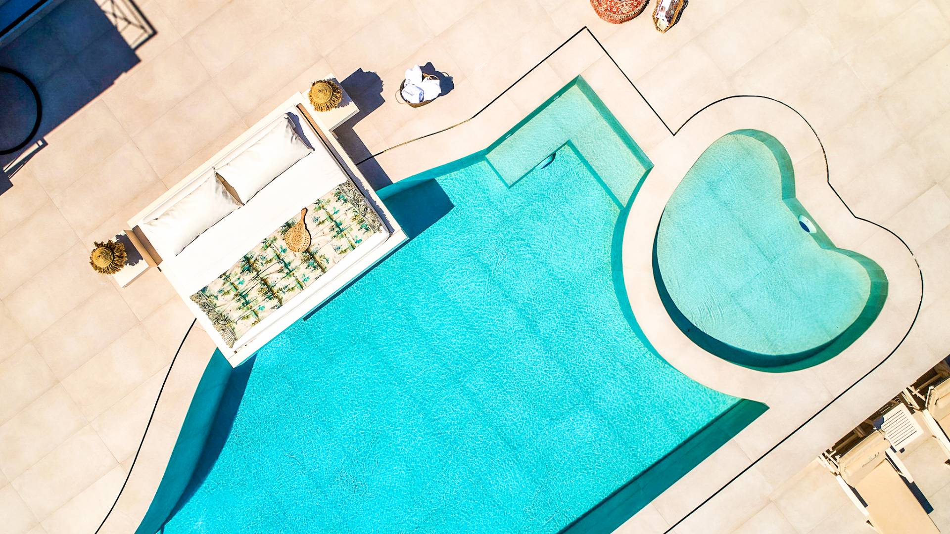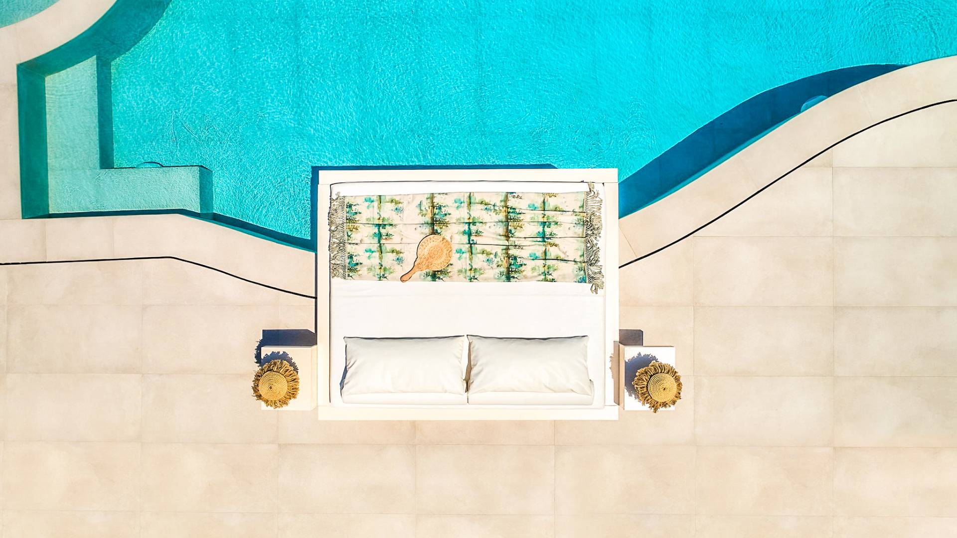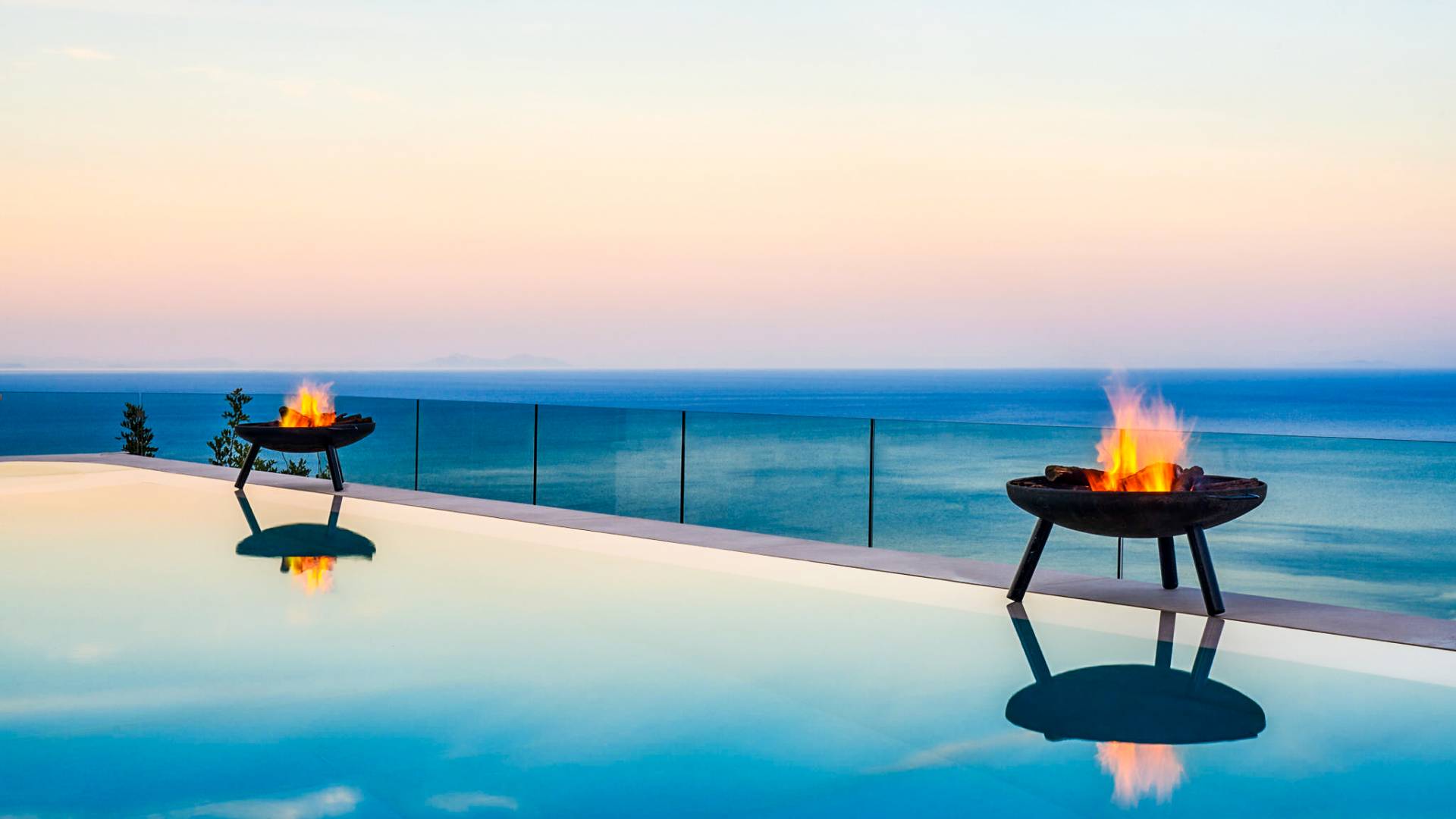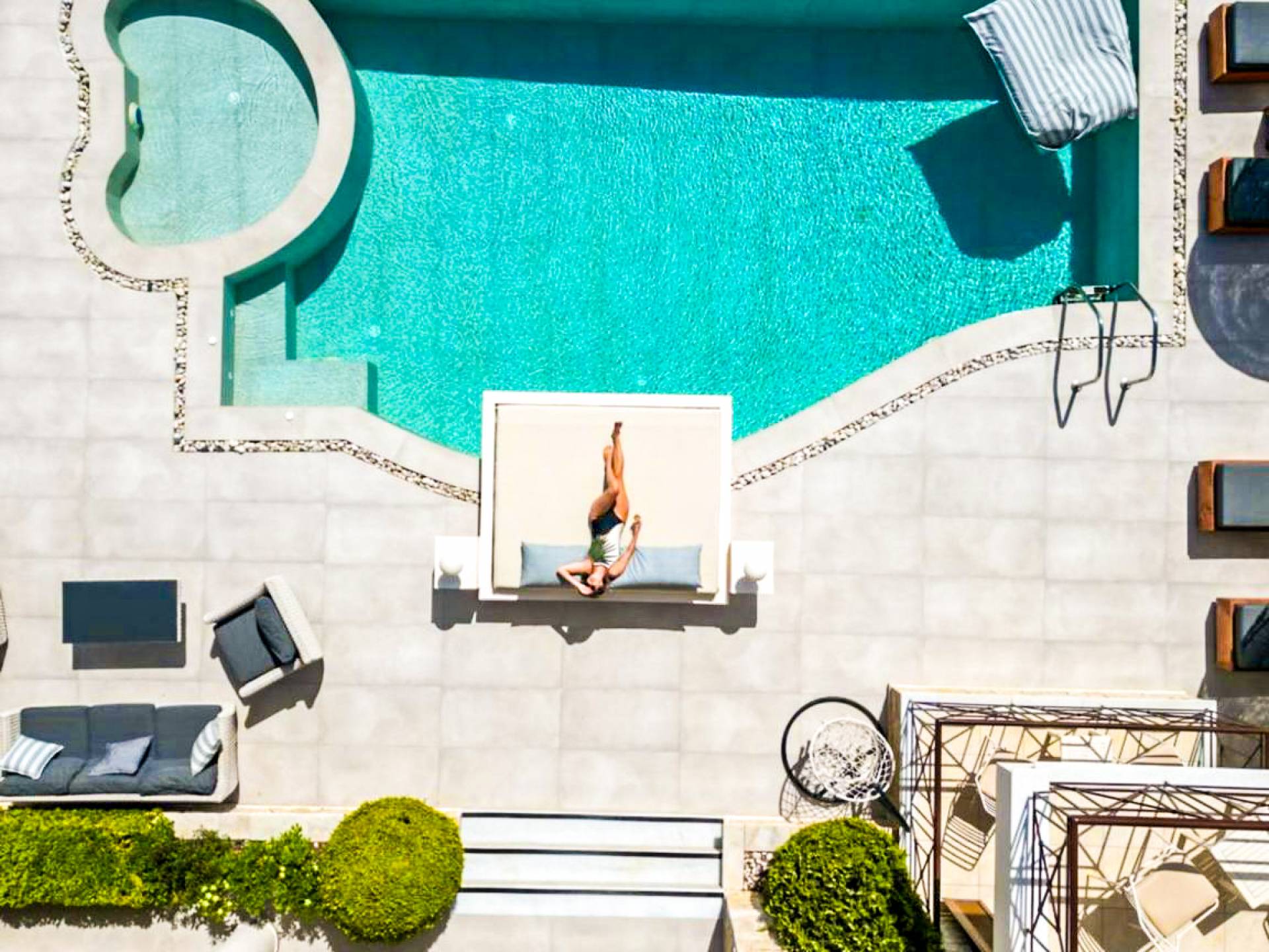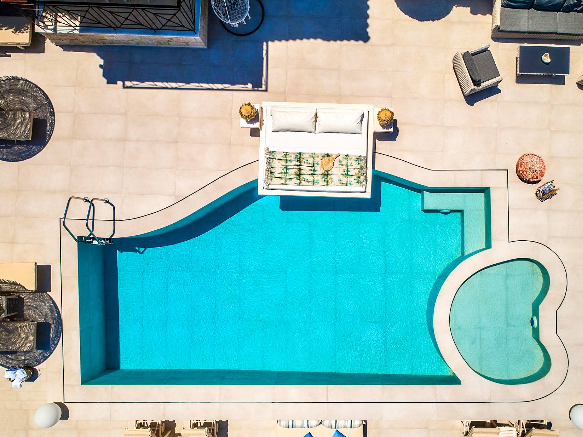 The outside of Neos Deluxe Villa Zakynthos is designed to offer you maximum privacy and unobstructed views over the Ionian Sea There is a swimming pool with hydro massage for up to four people, children’s pool, playground, lounge area, dining area, built BBQ, shower with cold/hot water, sunbeds and parasols.