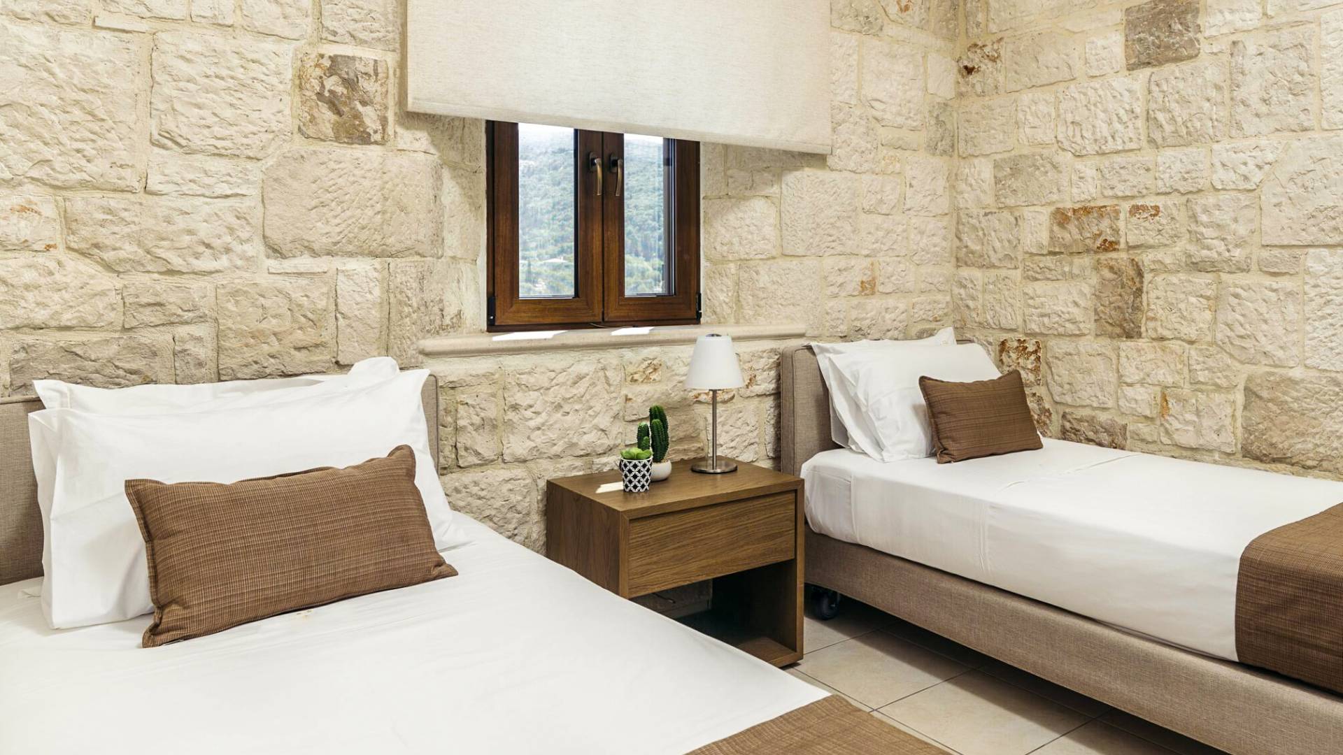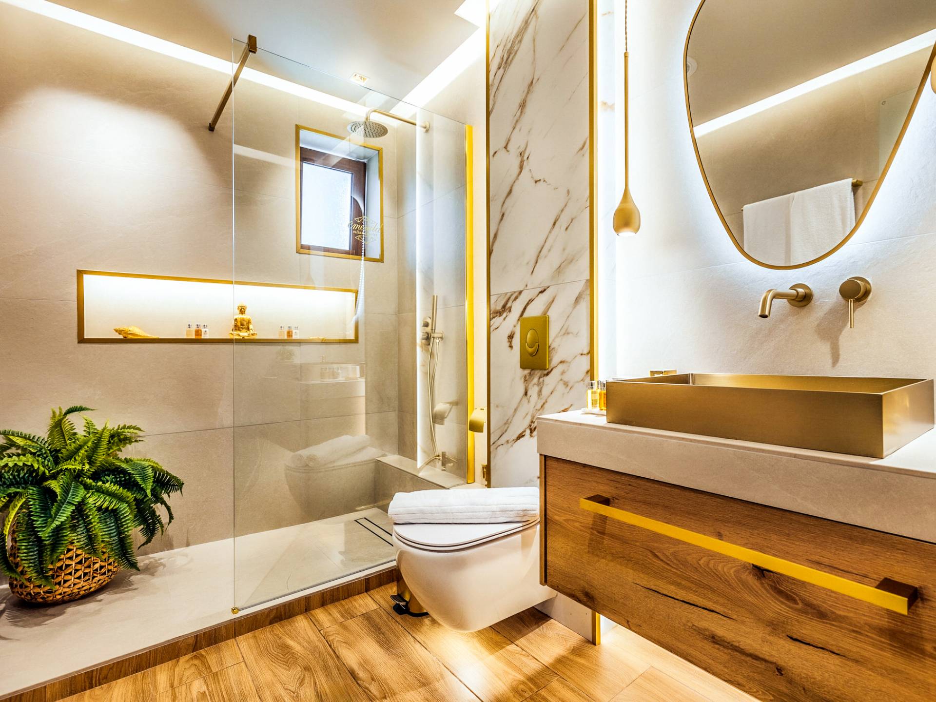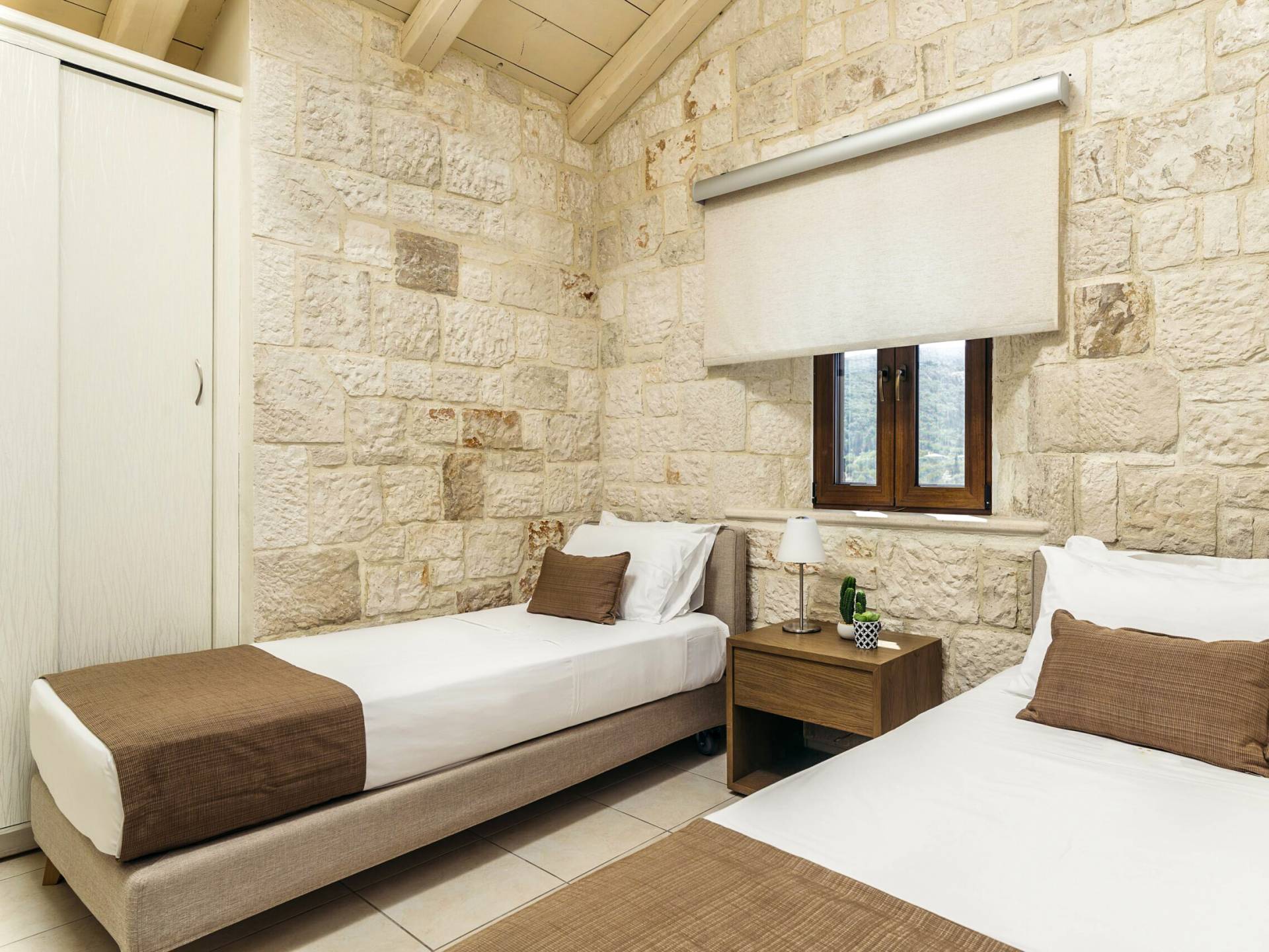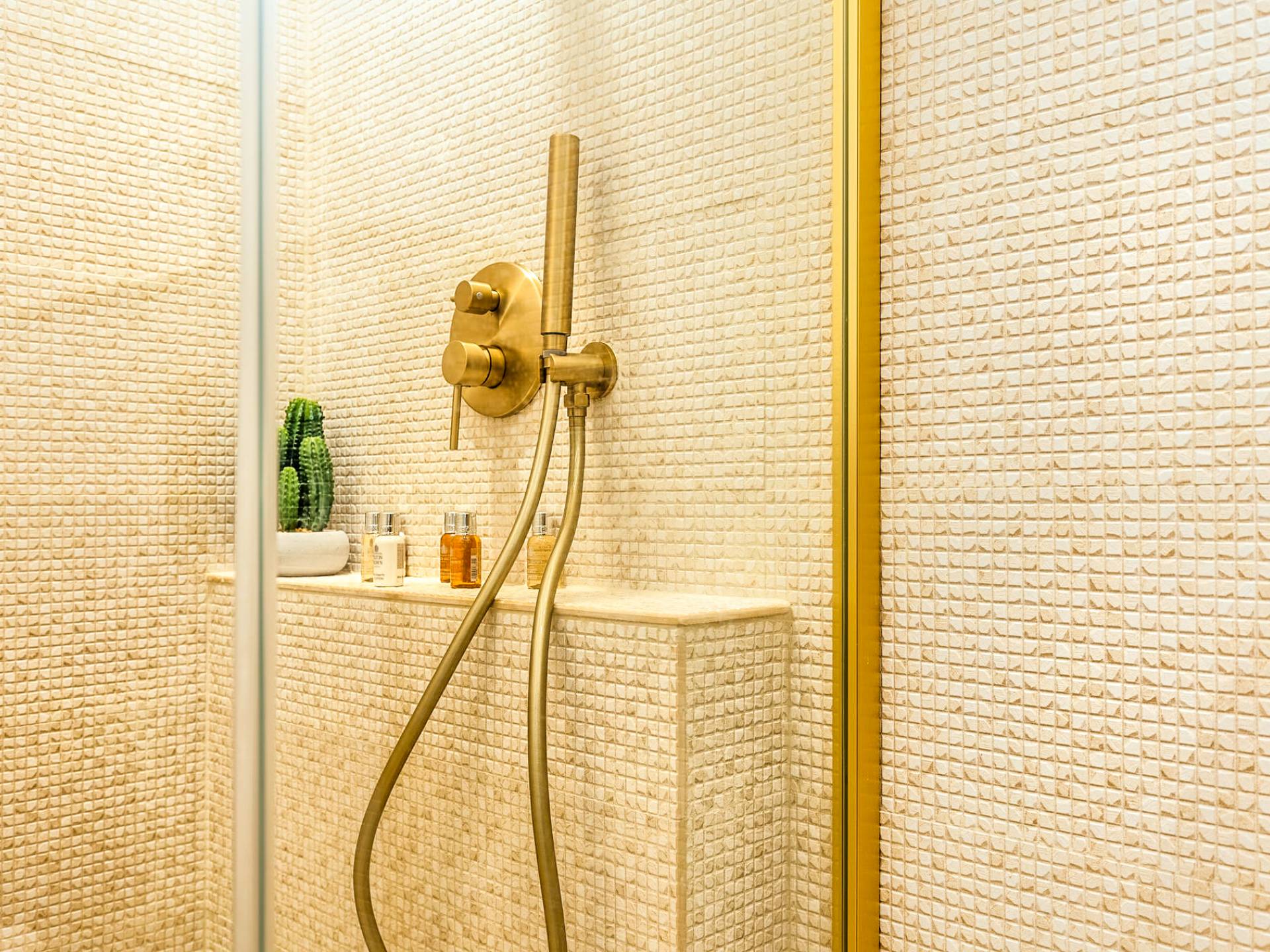 A marble staircase leads you to the first floor that consists of two more bedrooms: one master bedroom (double bed) with an en-suite full bathroom and one twin bedroom with an en-suite shower room.