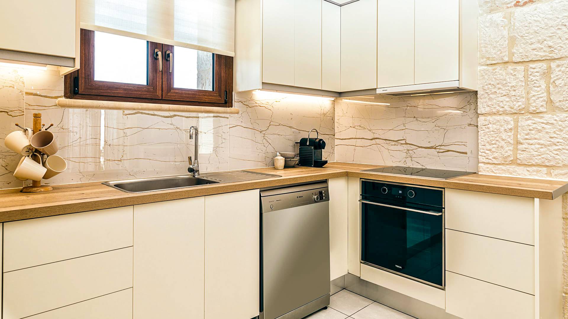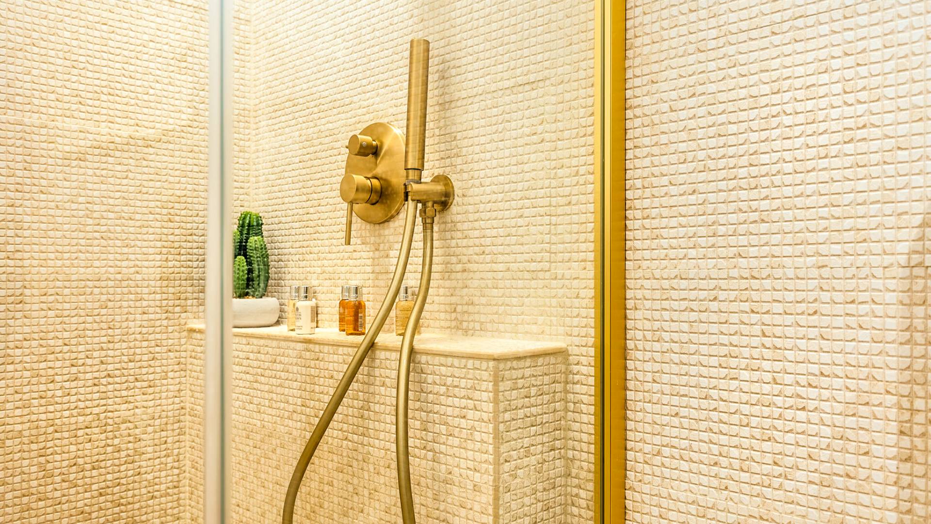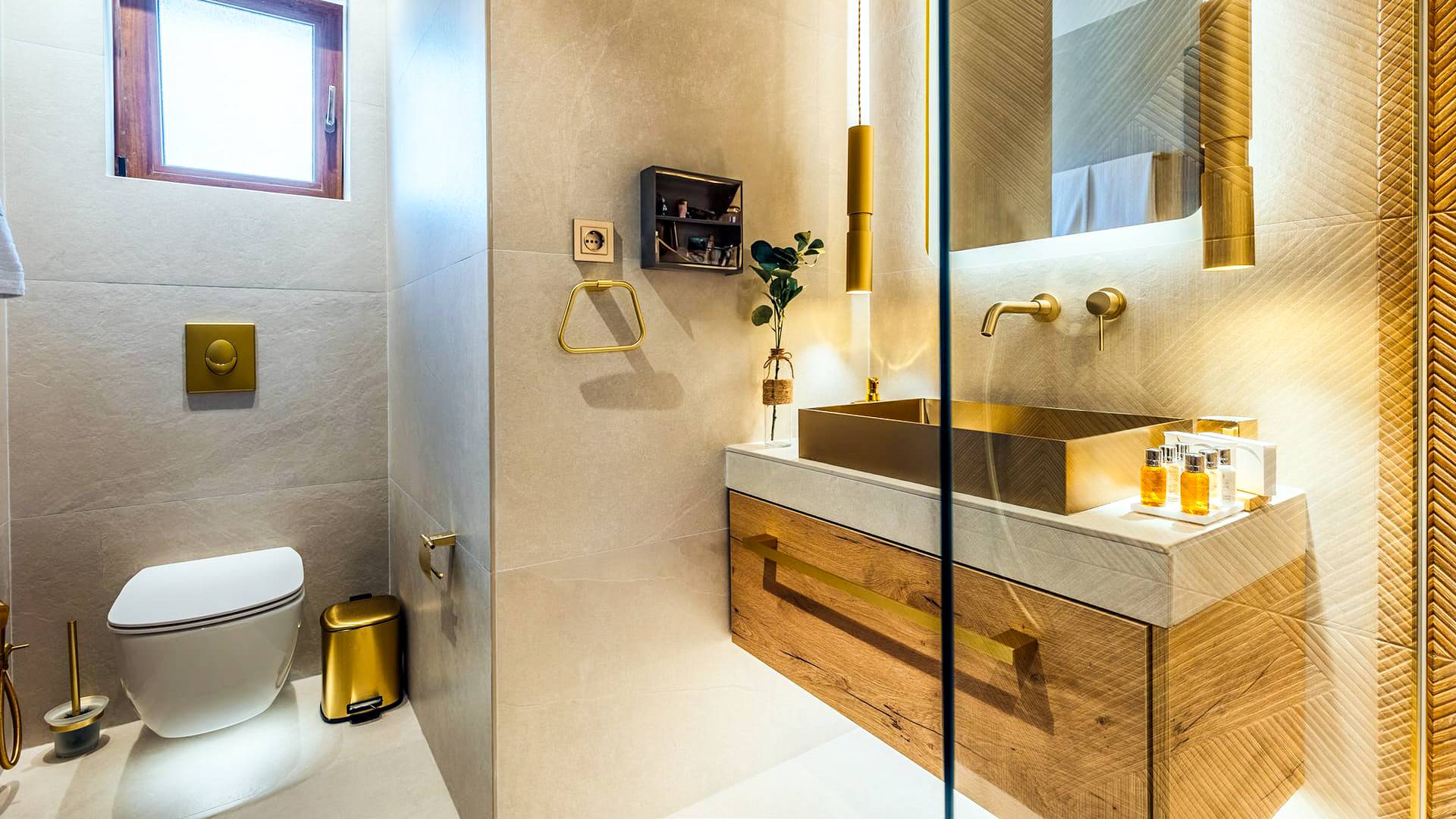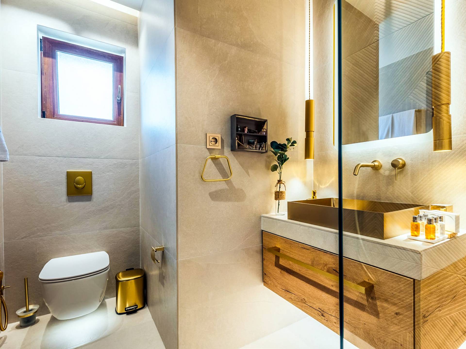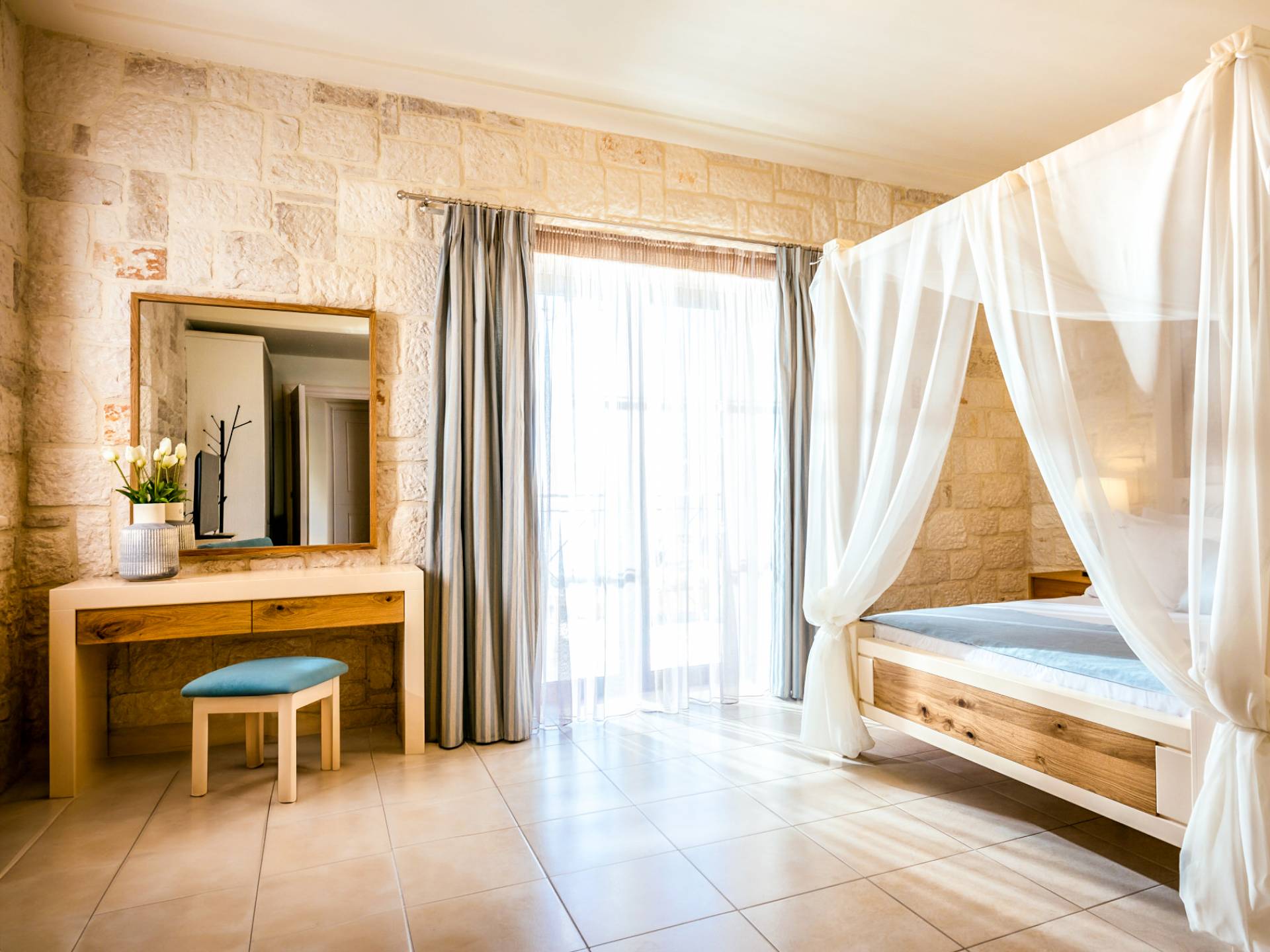 A marble staircase leads you to the first floor that consists of two more bedrooms: one master bedroom (double bed) with an en-suite full bathroom and one twin bedroom with an en-suite shower room.